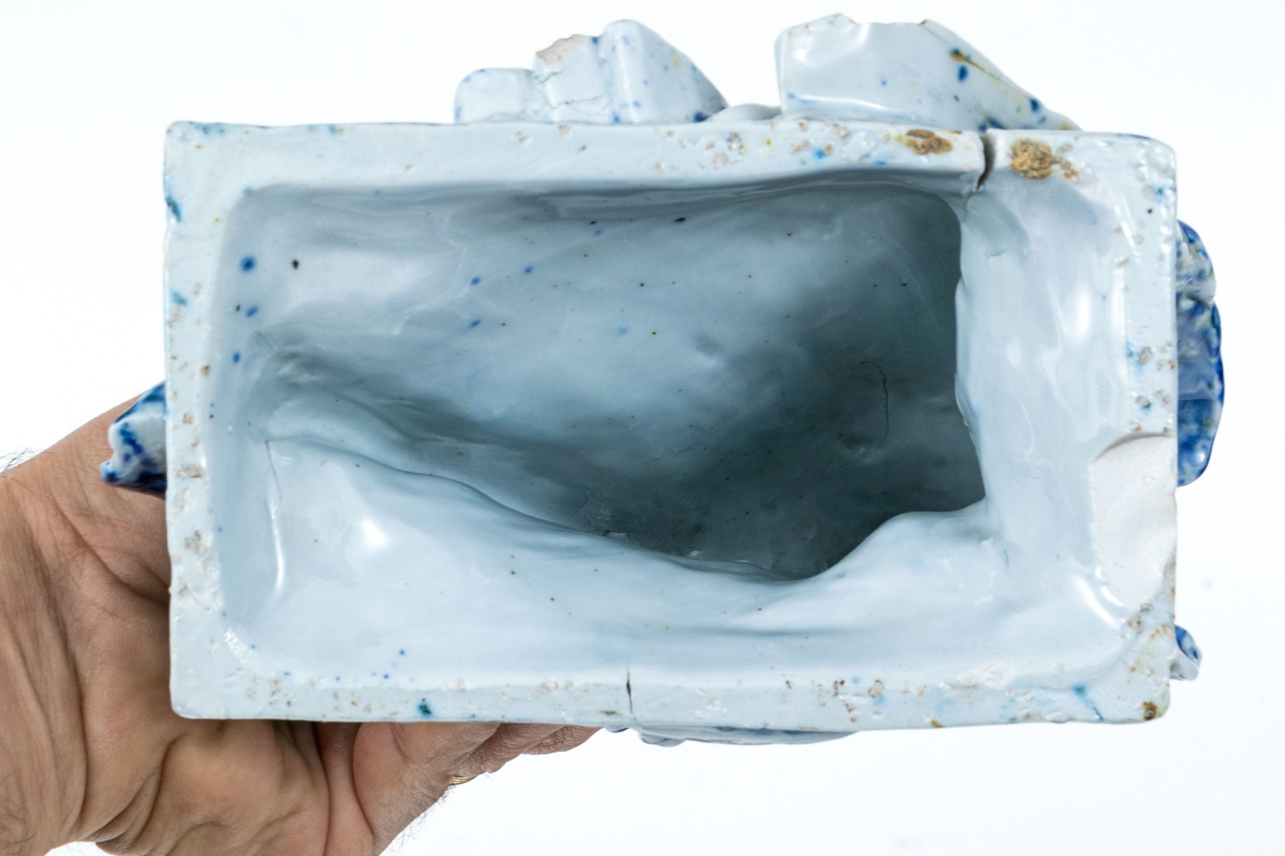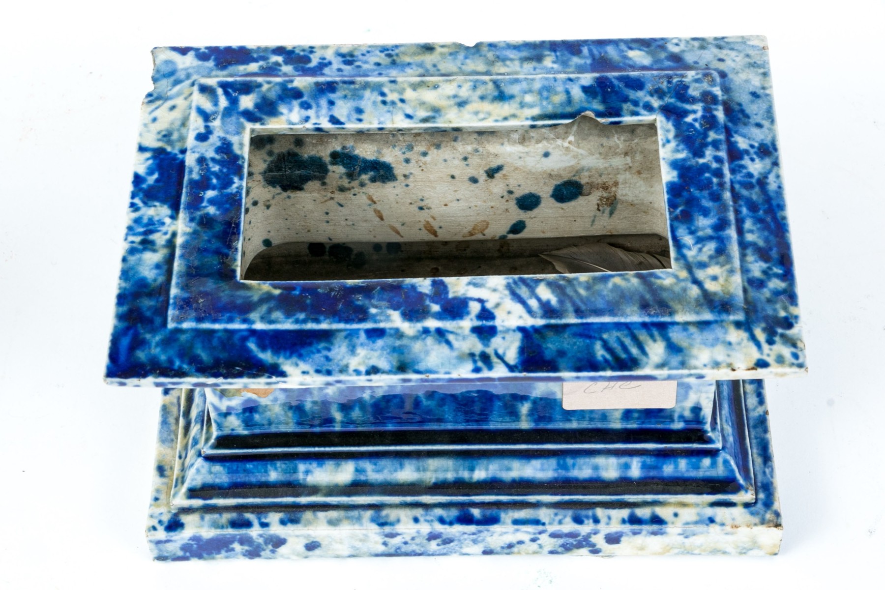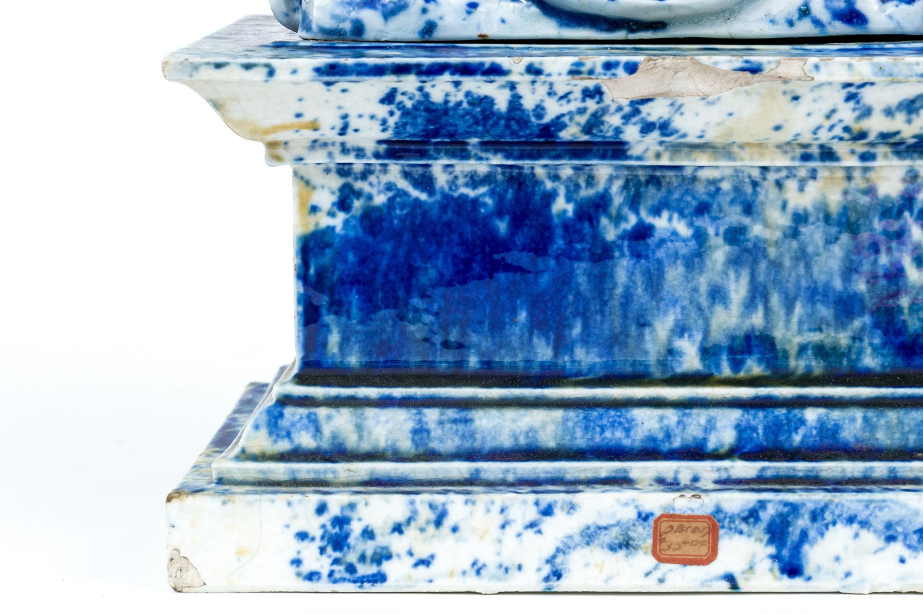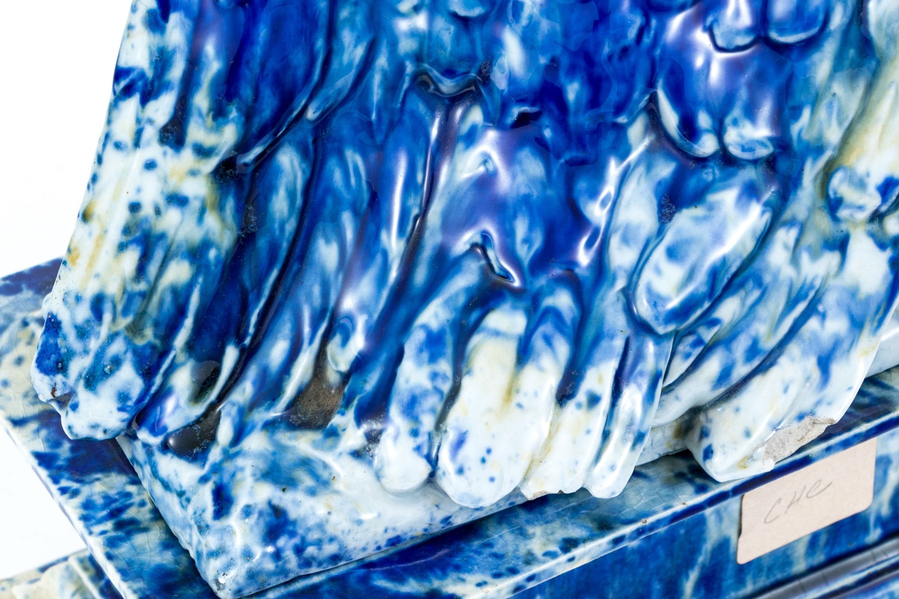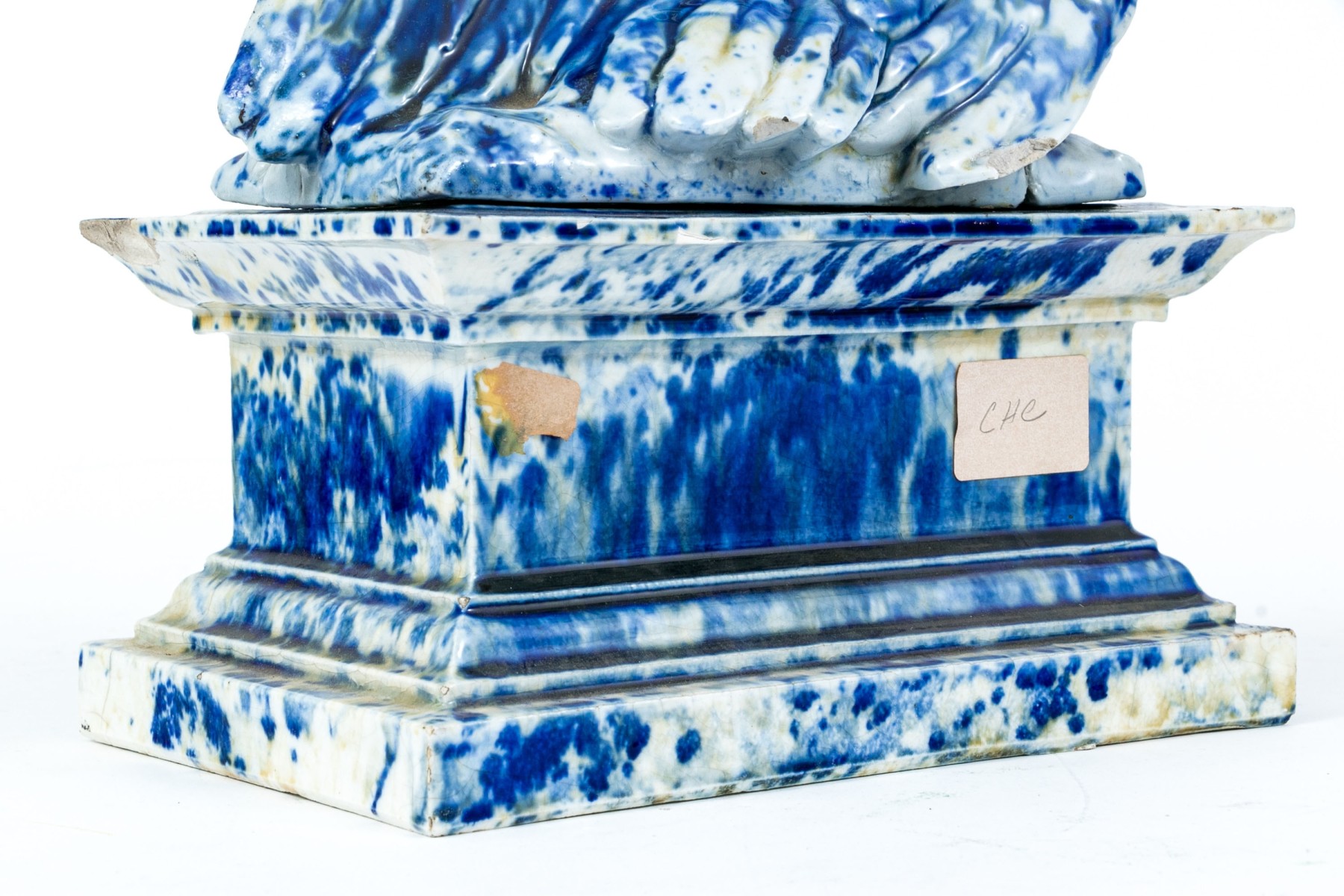 The Winkle Terra Cotta Co., St. Louis, Missouri ceramic figure of an eagle with a branded shield under its left wing, proudly perched on a rectangular pedestal. The eagle is removable, revealing a hollow interior perfect for storing trinkets or for use as a potpourri jar. Beautifully detailed in white with blue splatter glaze.