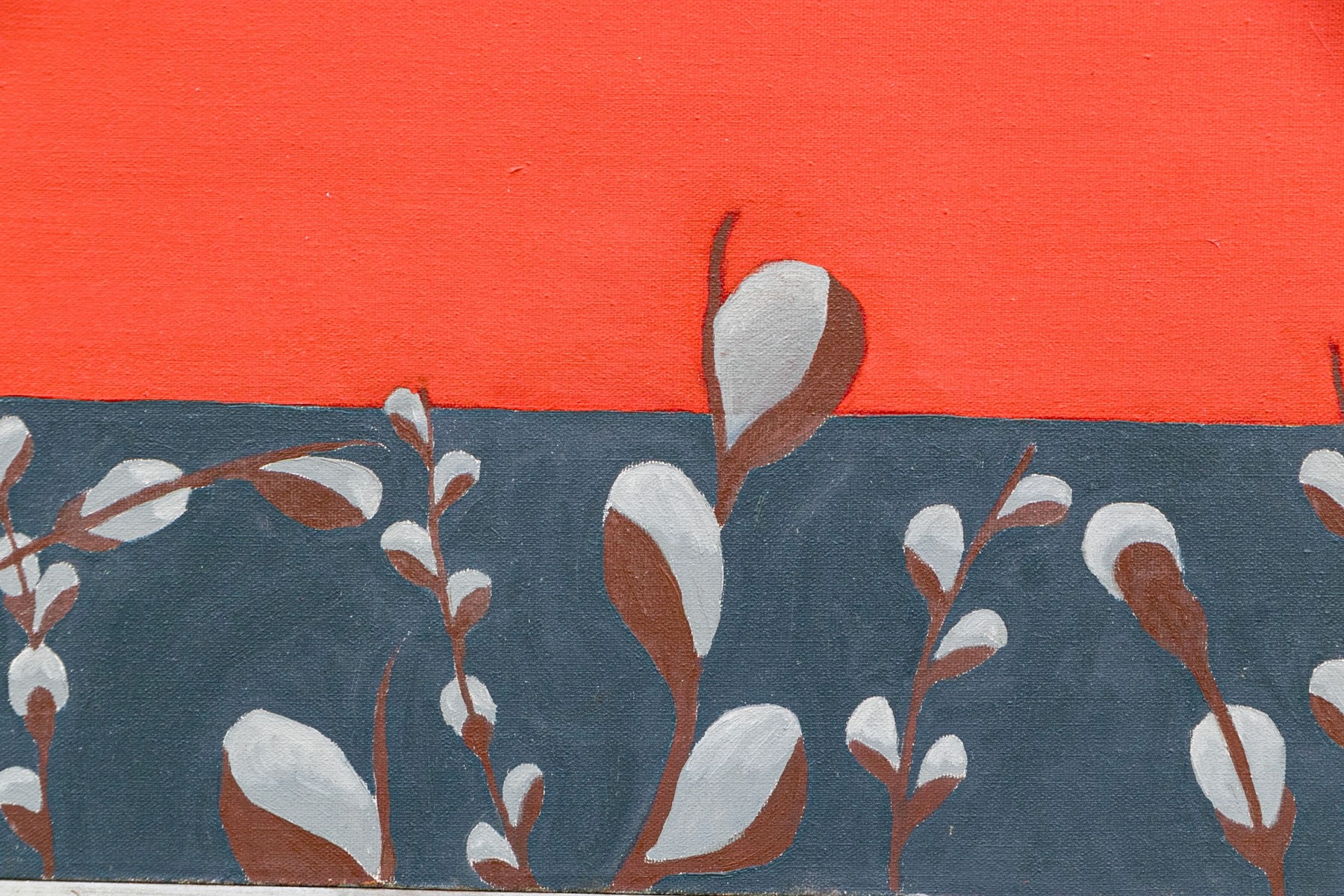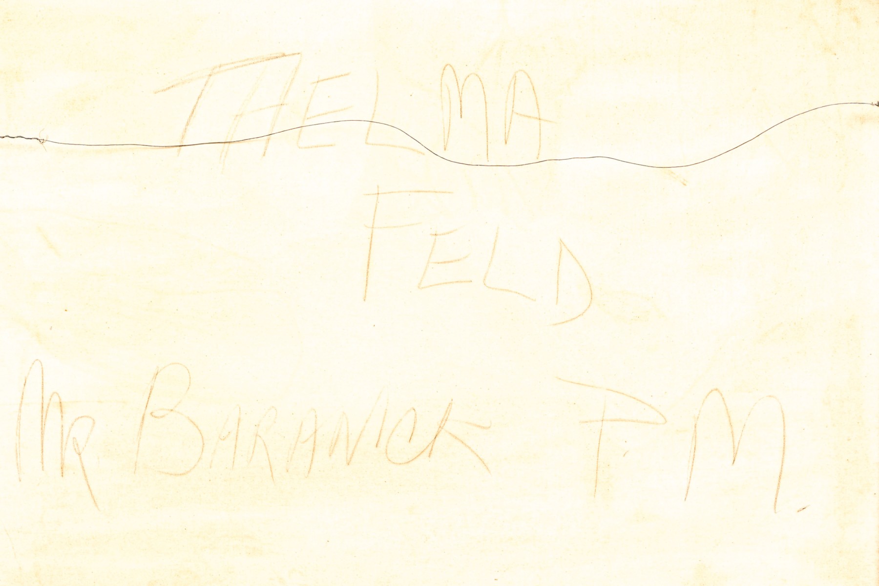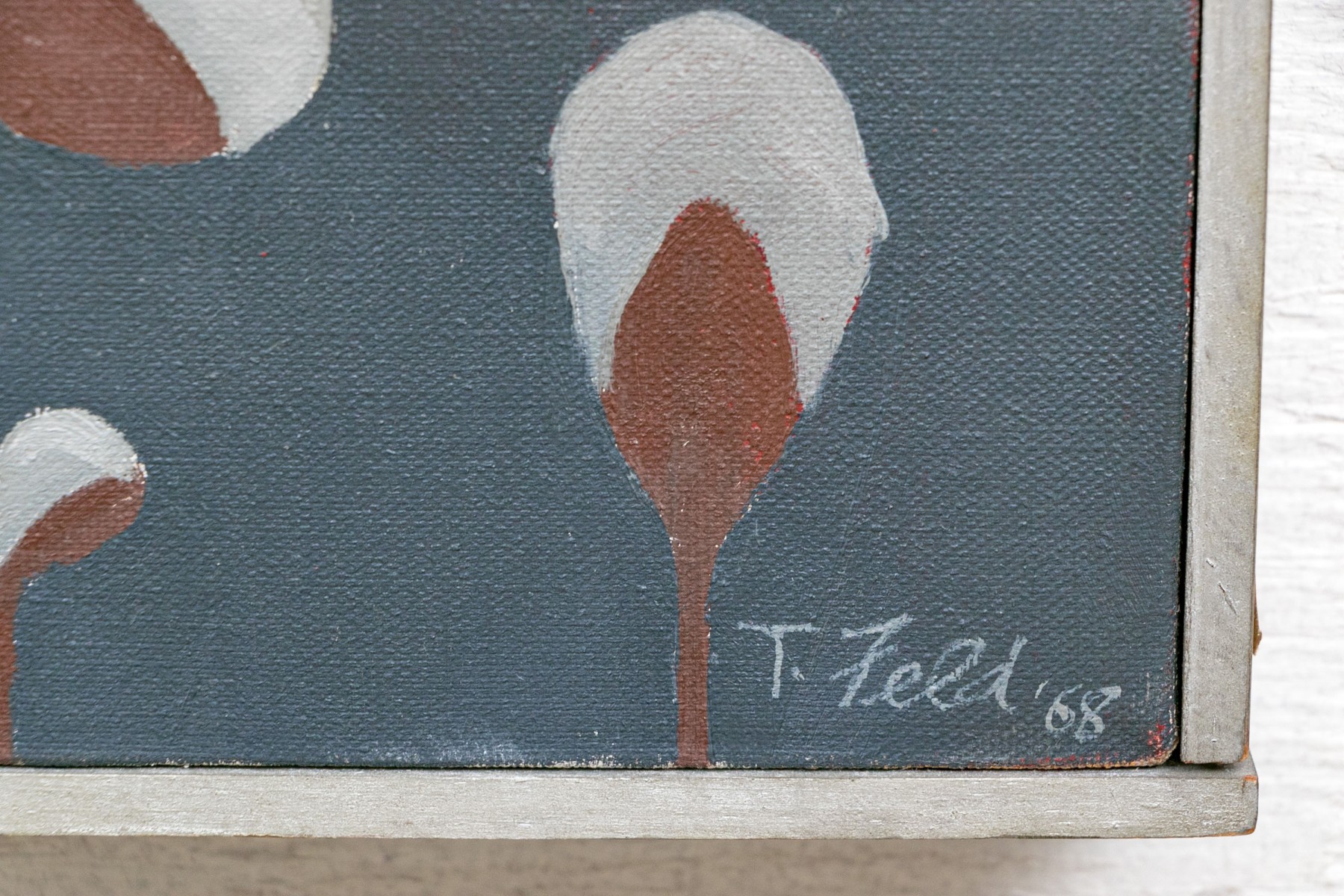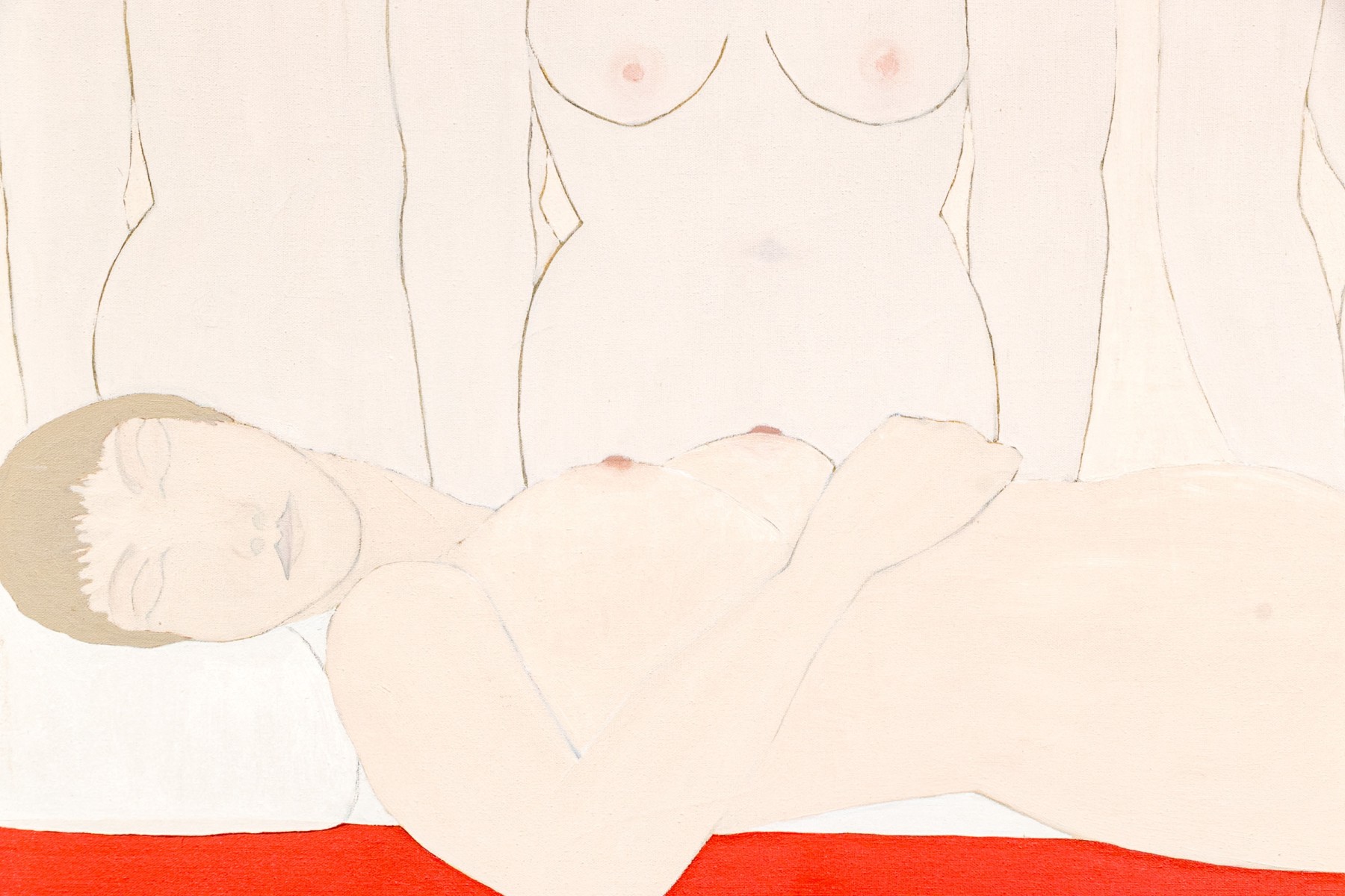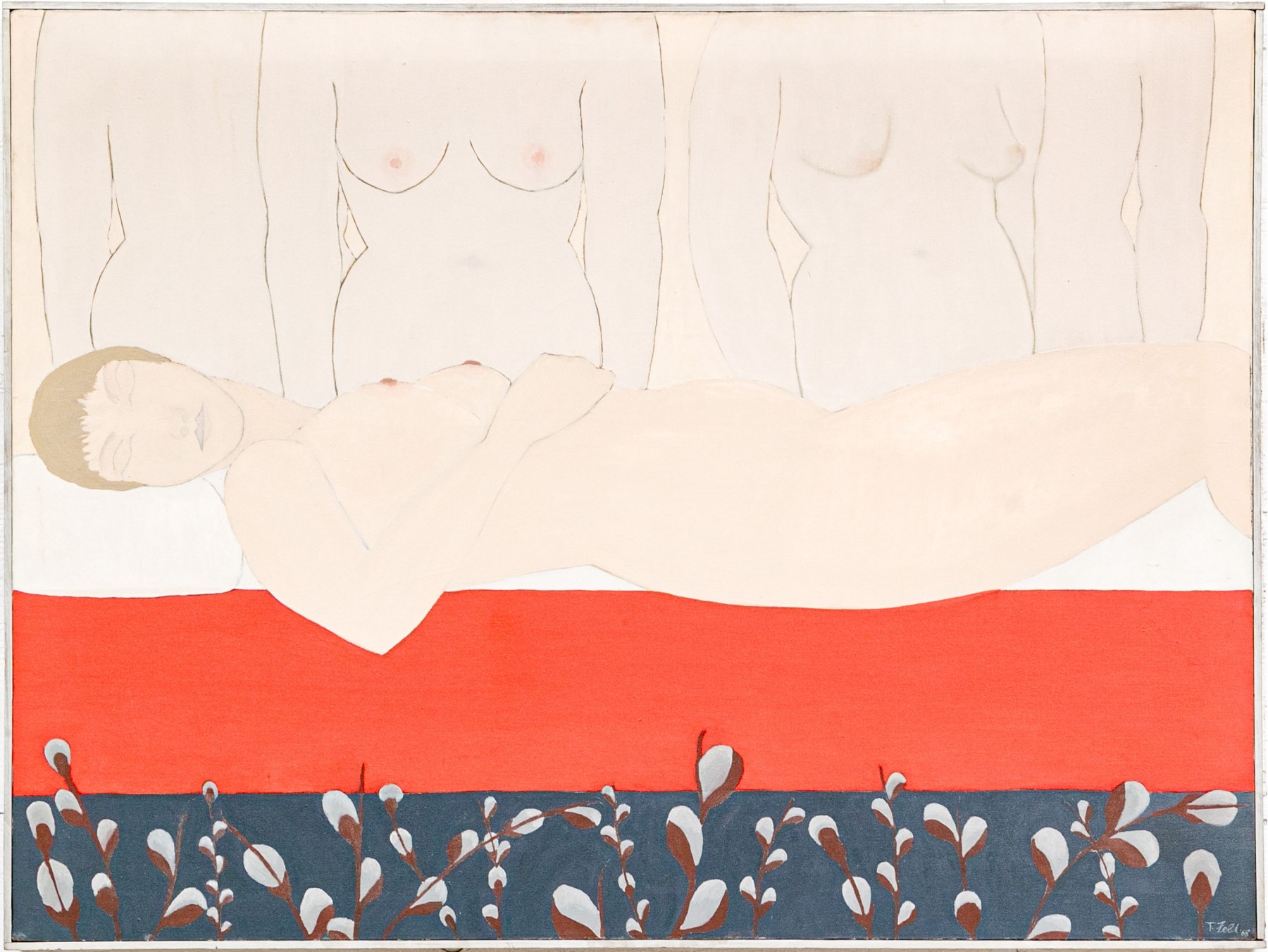 Signed and dated '68 lower right, signed on verso with inscription. A pale tone reclining female nude below several linear standing female nudes. Modernist orange and gray flower strewn bands below. Presented in a thin painted wood frame.