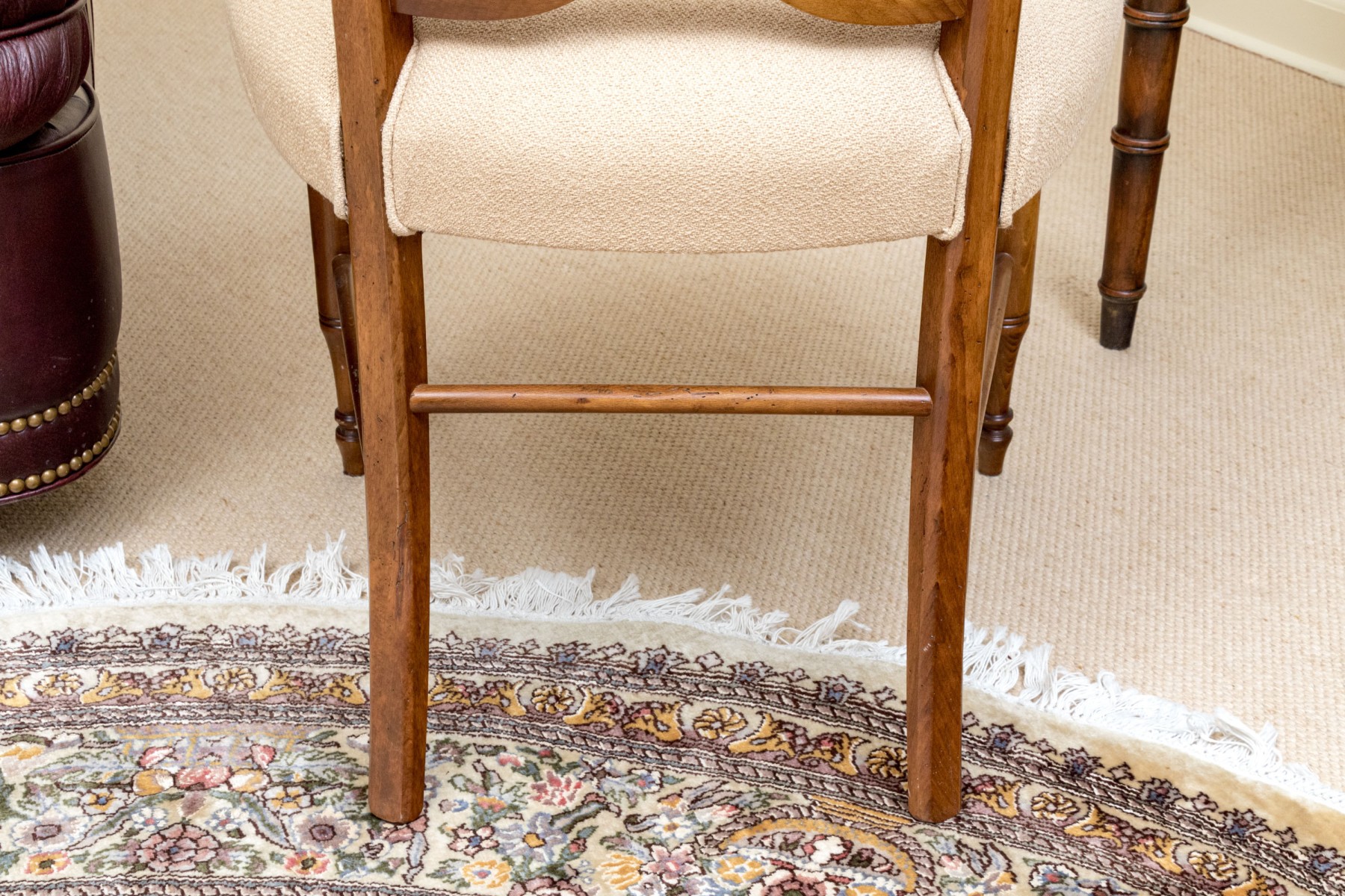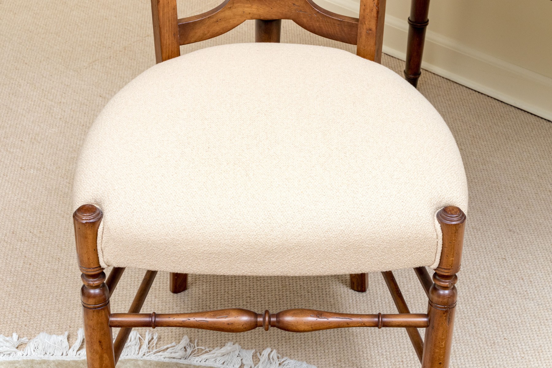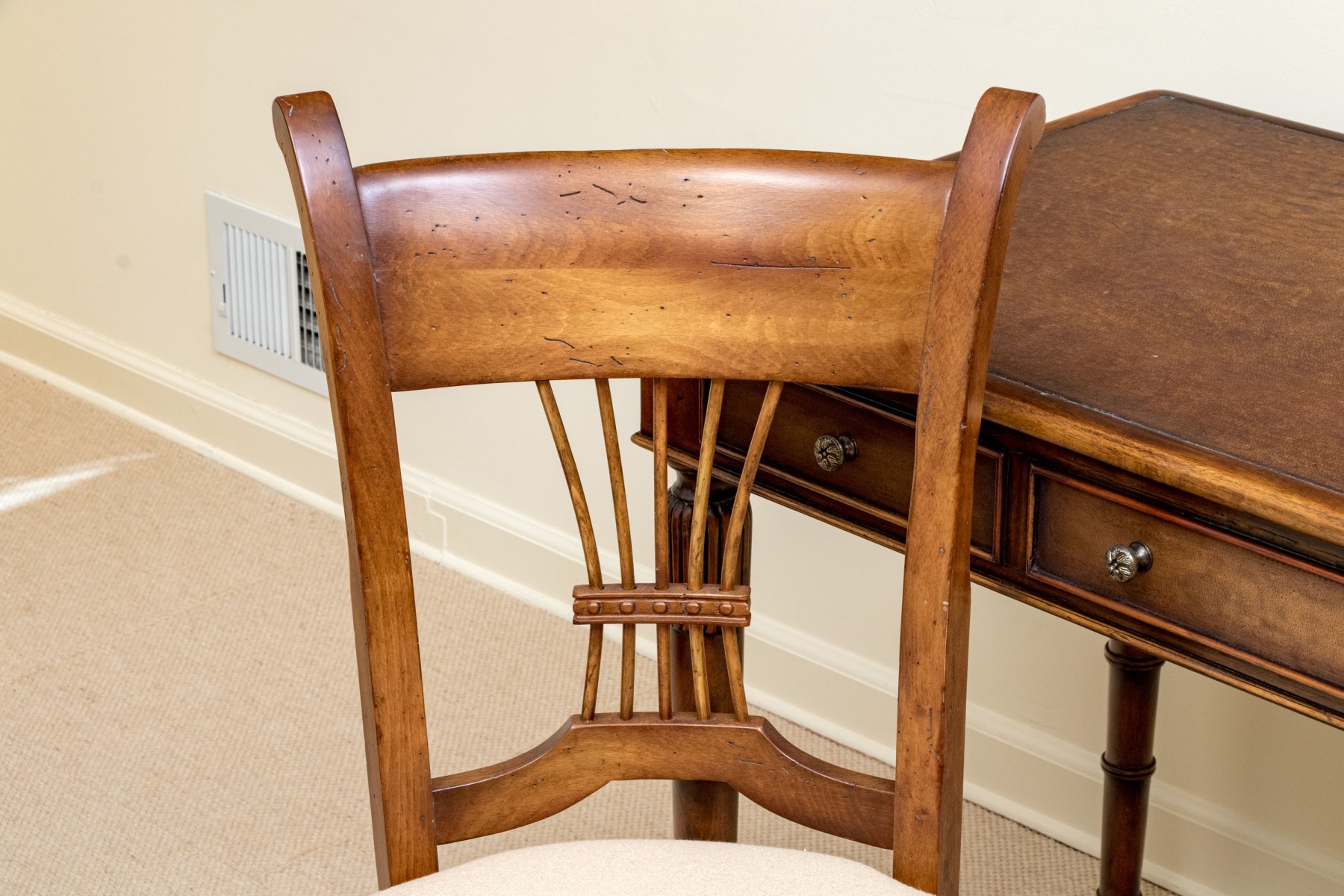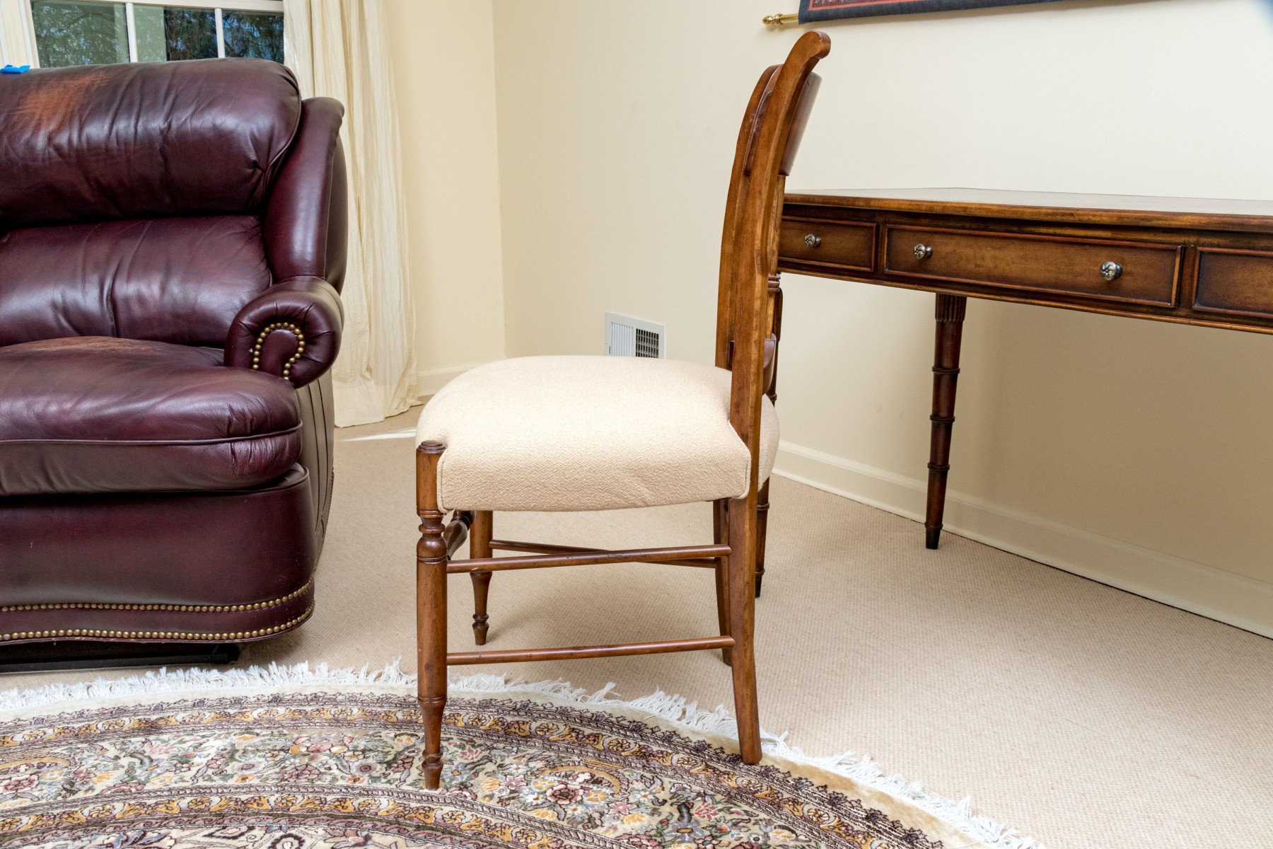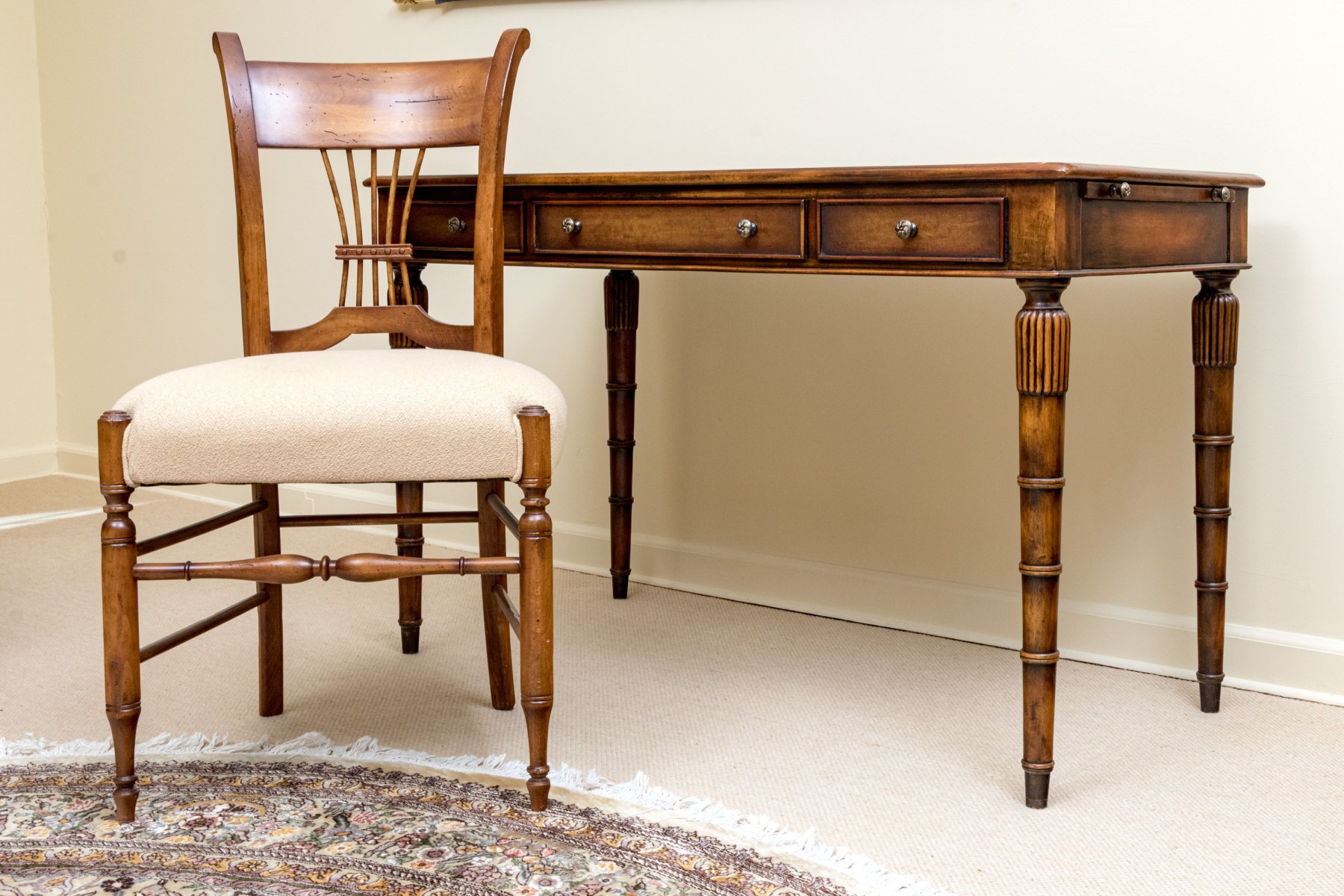 Accompanied by a Baker Milling Road side chair in a complimenting honeyed brown finish, sporting a wide top rail and flared ears over a harp splat, upholstered in cream-white fabric on the seat. Raised on elegantly turned legs with a box stretcher.