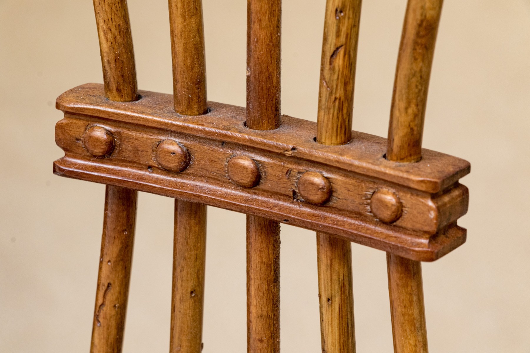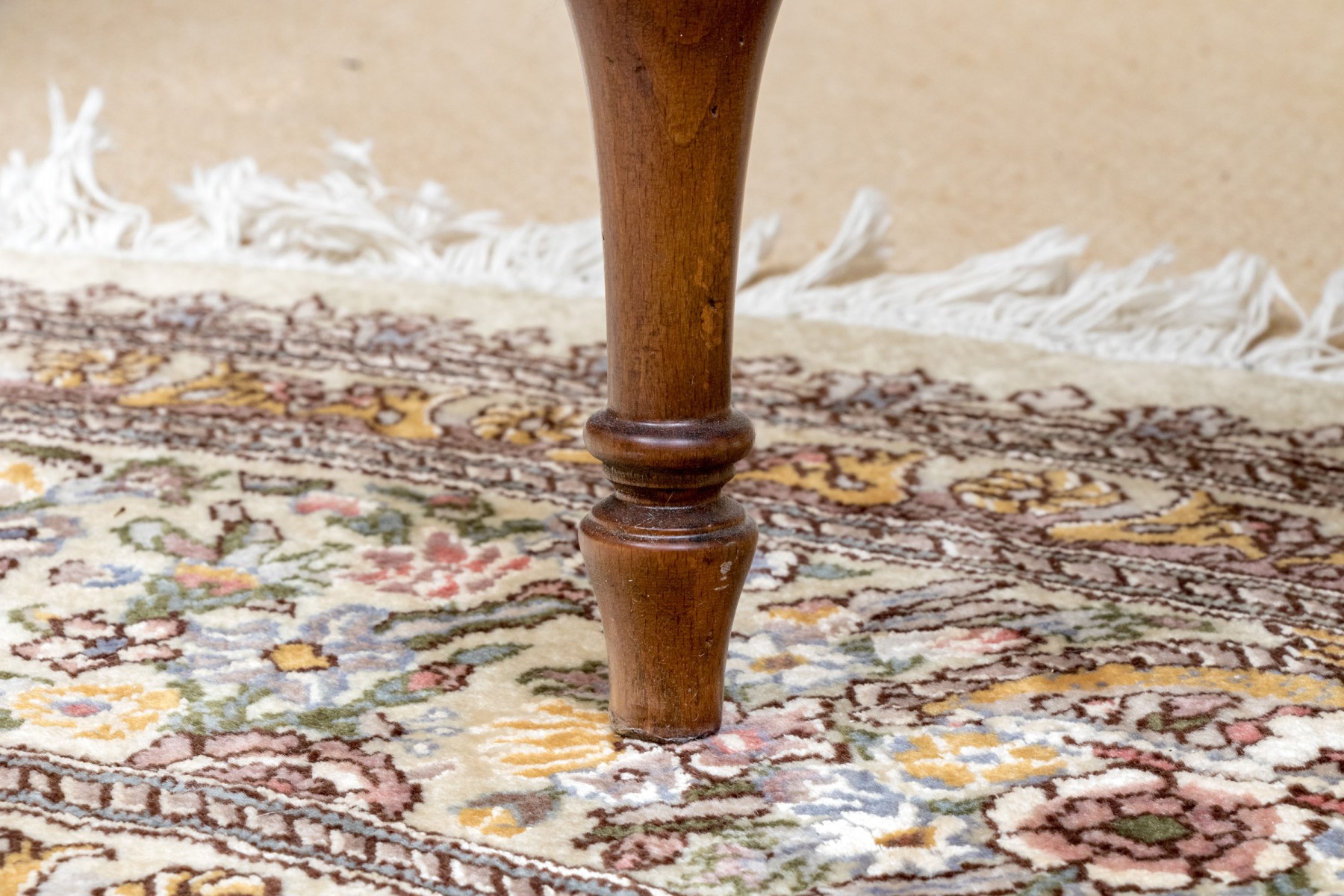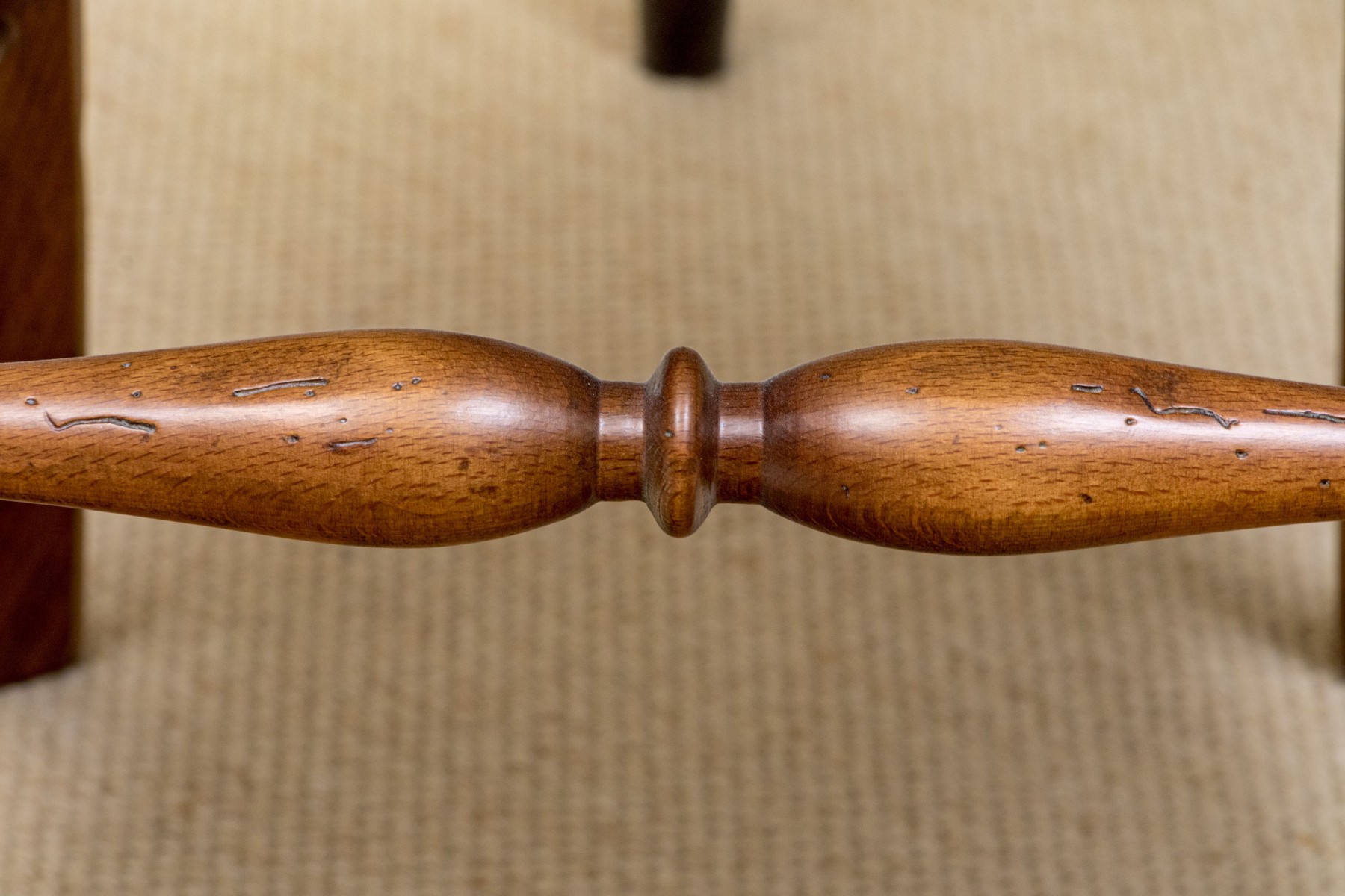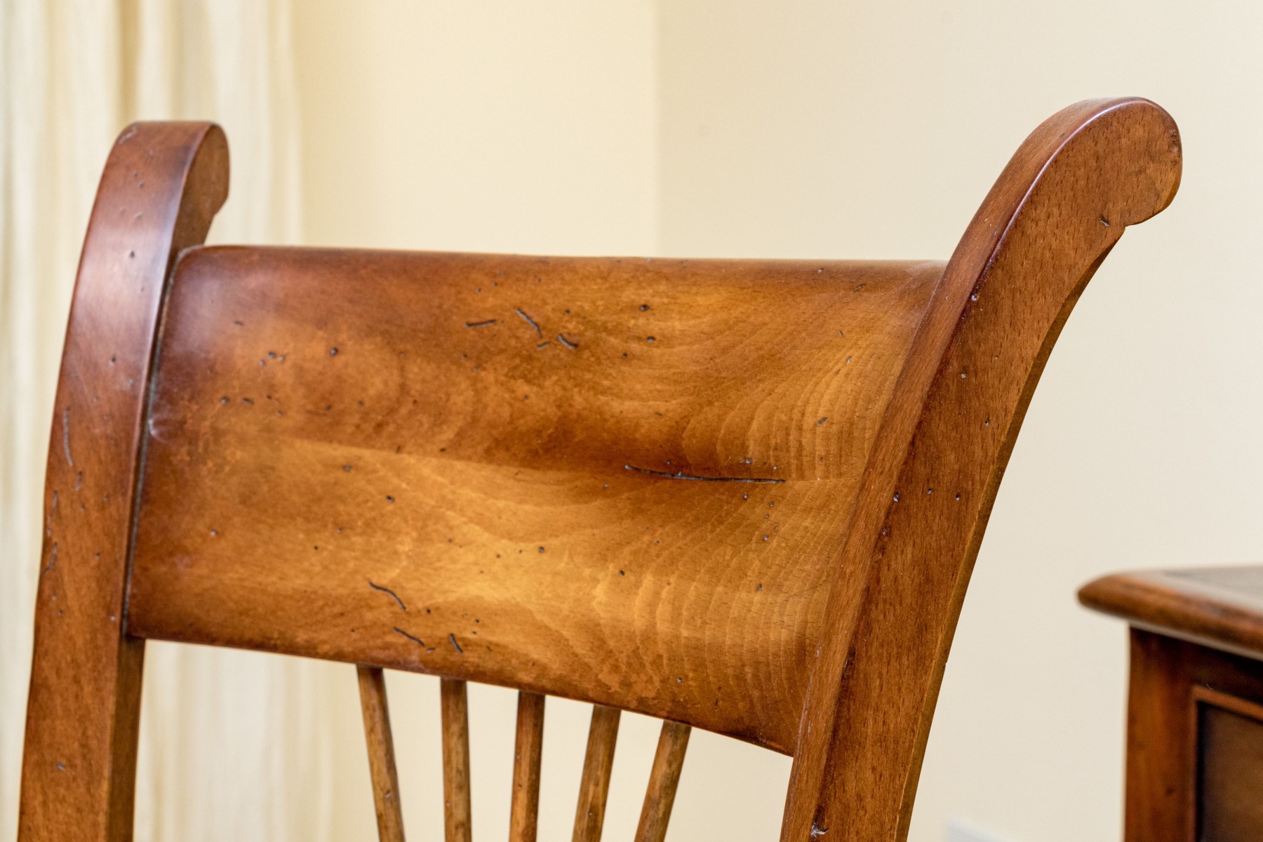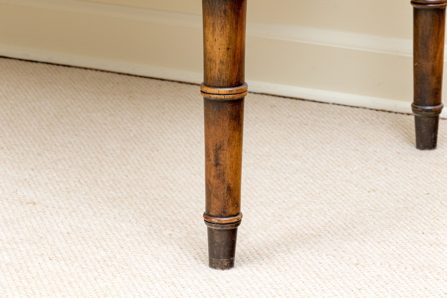 Accompanied by a Baker Milling Road side chair in a complimenting honeyed brown finish, sporting a wide top rail and flared ears over a harp splat, upholstered in cream-white fabric on the seat. Raised on elegantly turned legs with a box stretcher.