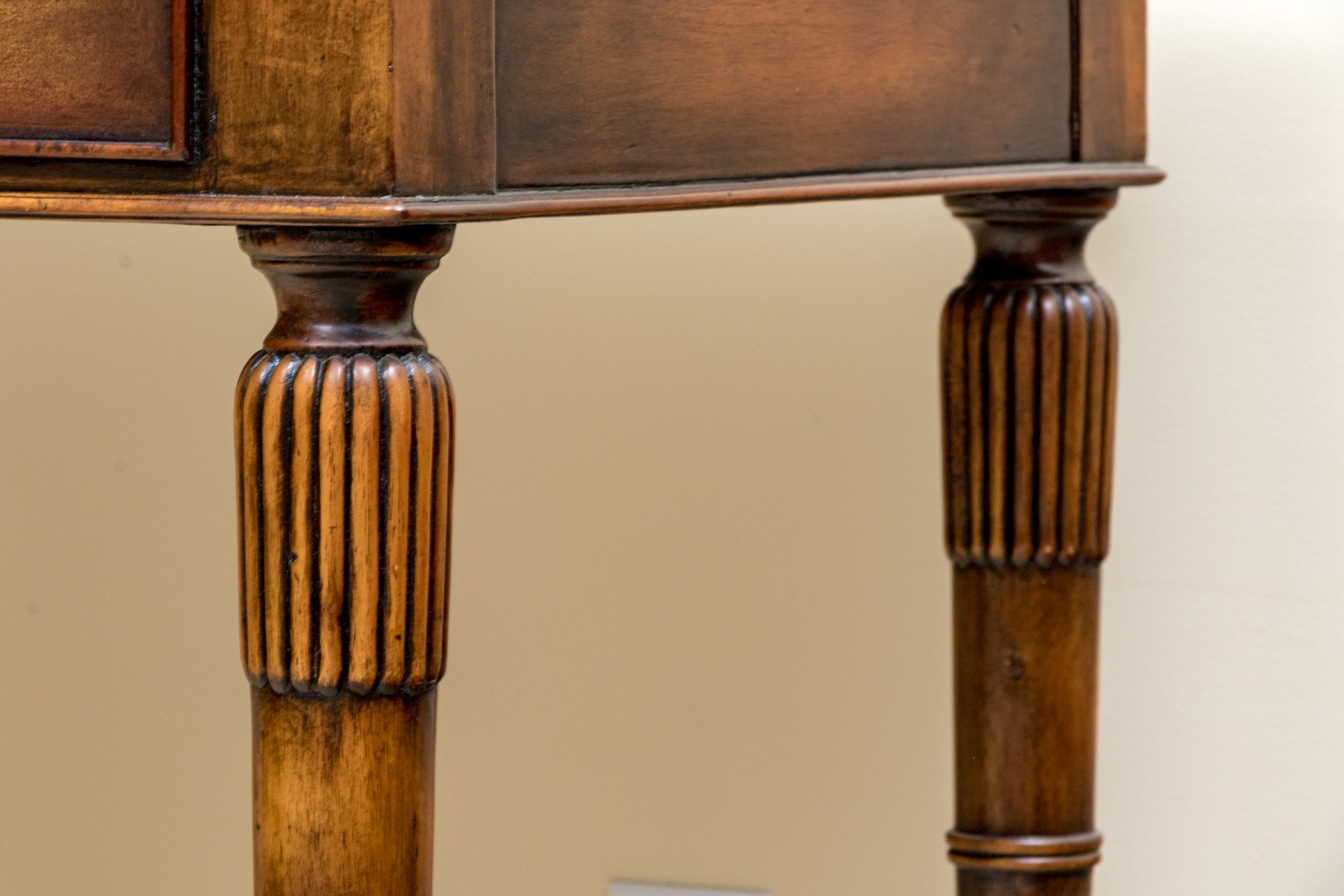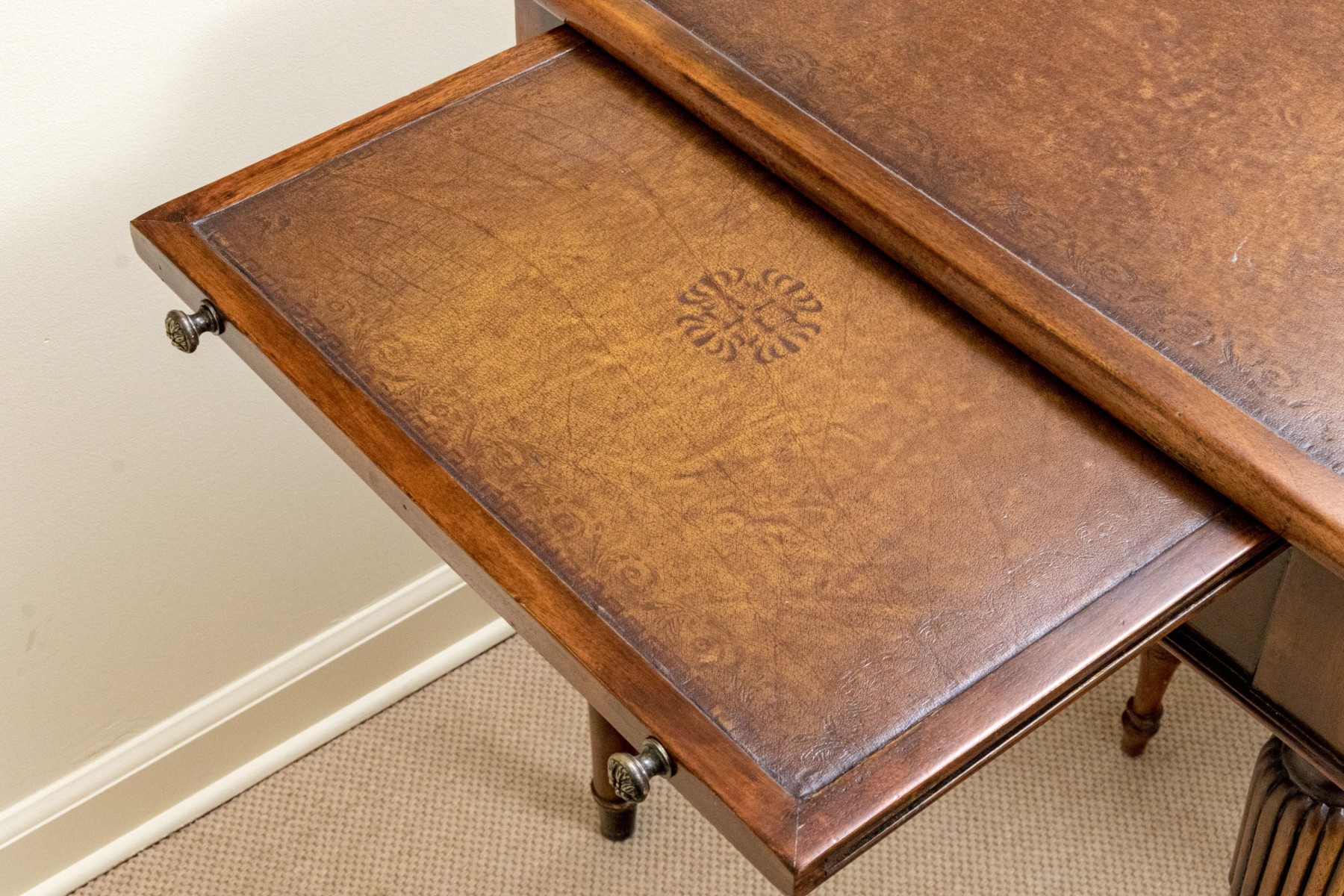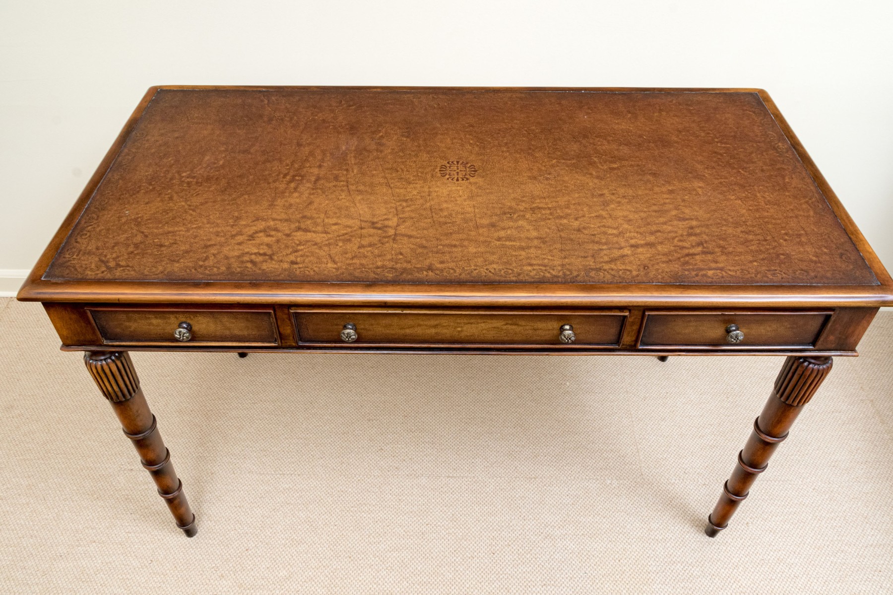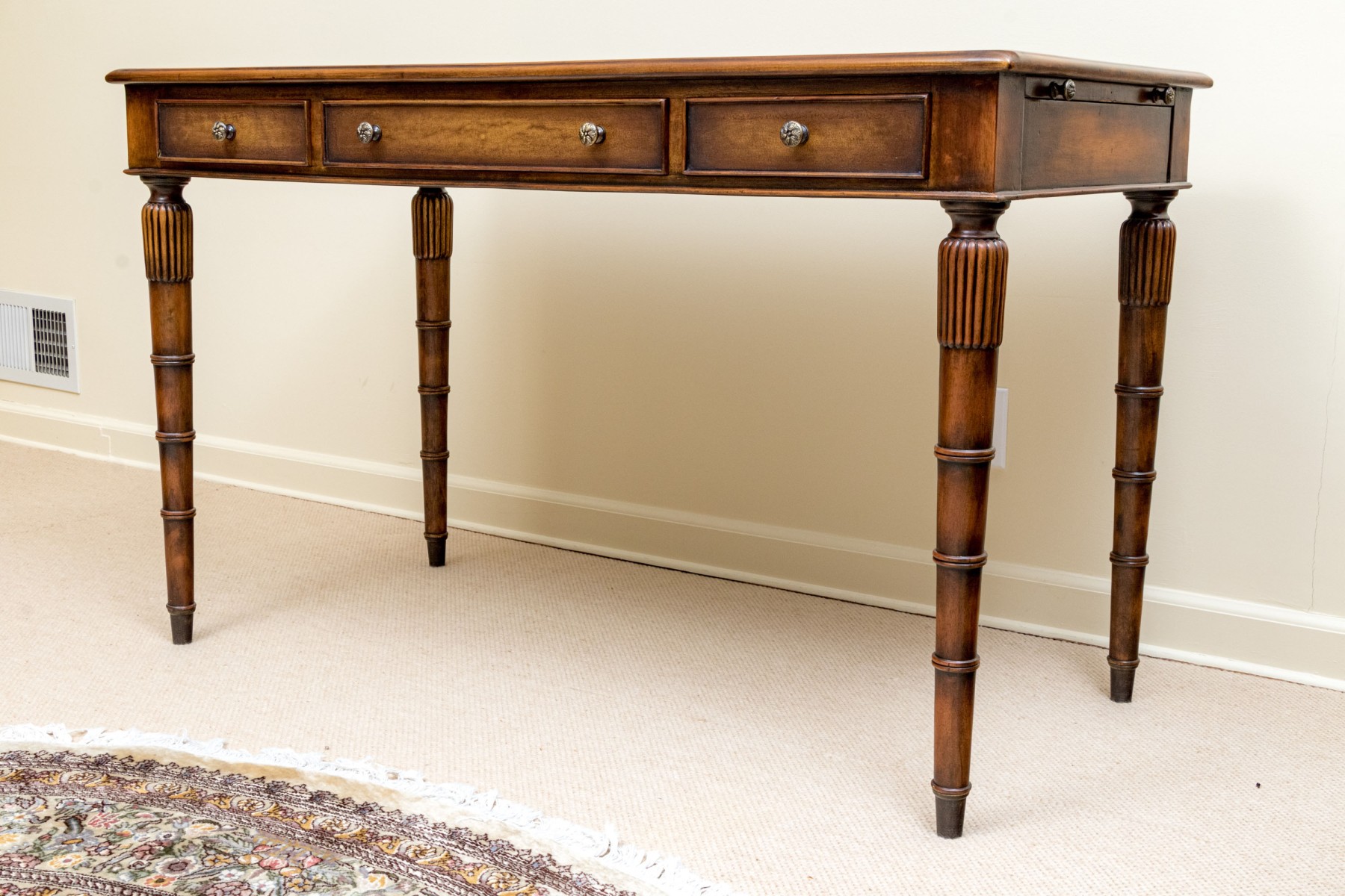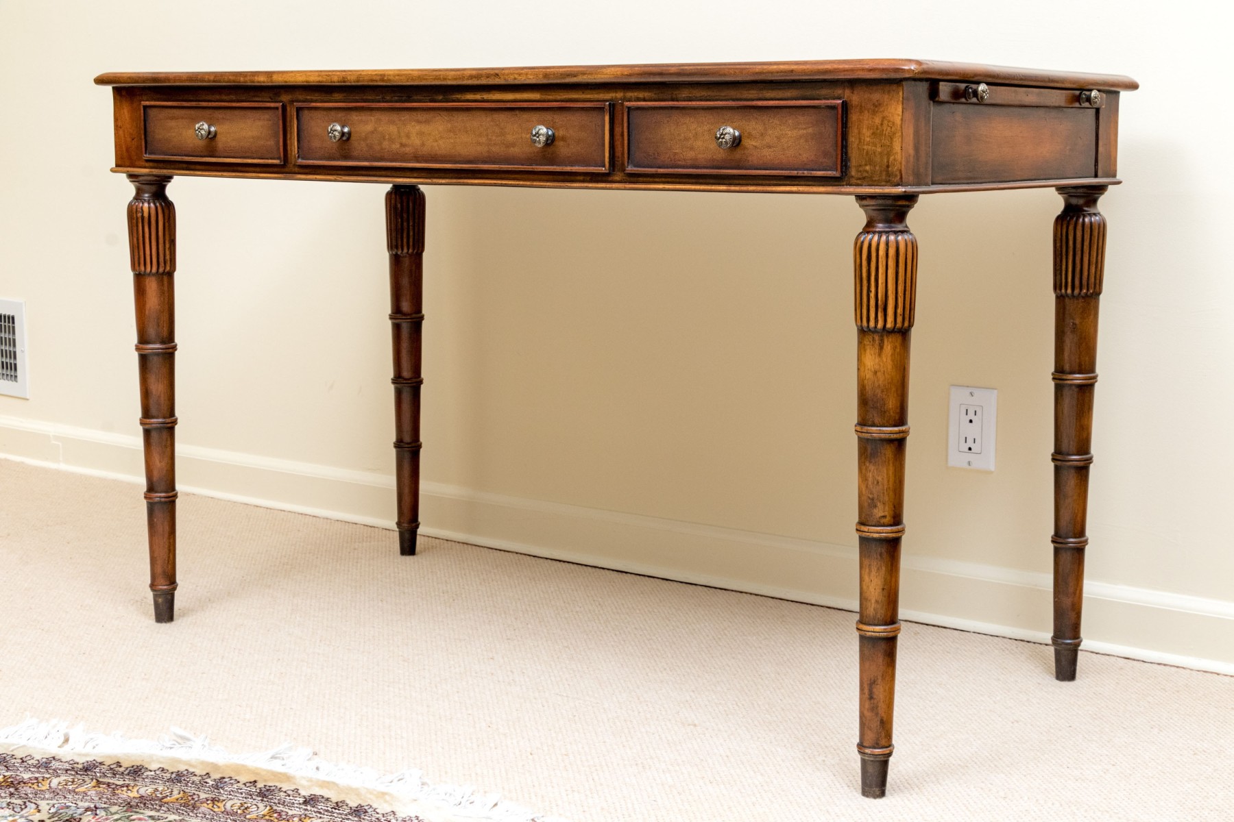 A gorgeous Theodore Alexander Chinoiserie writing desk in honeyed medium brown walnut, featuring a rectangular top with rounded corners over three drawers with knot motif gray metal knobs, pull-out trays on both sides, and fluted and banded tapered legs for a fabulous faux bamboo appearance.