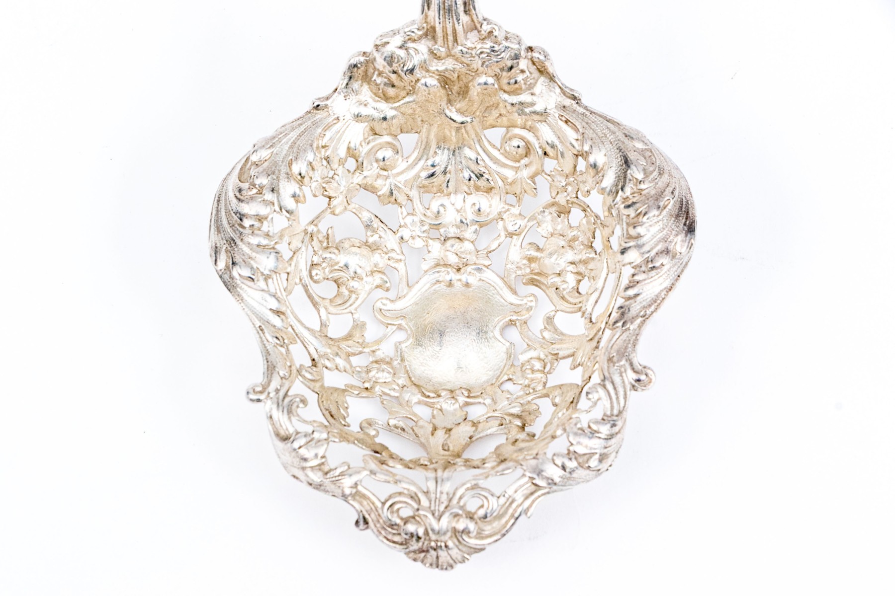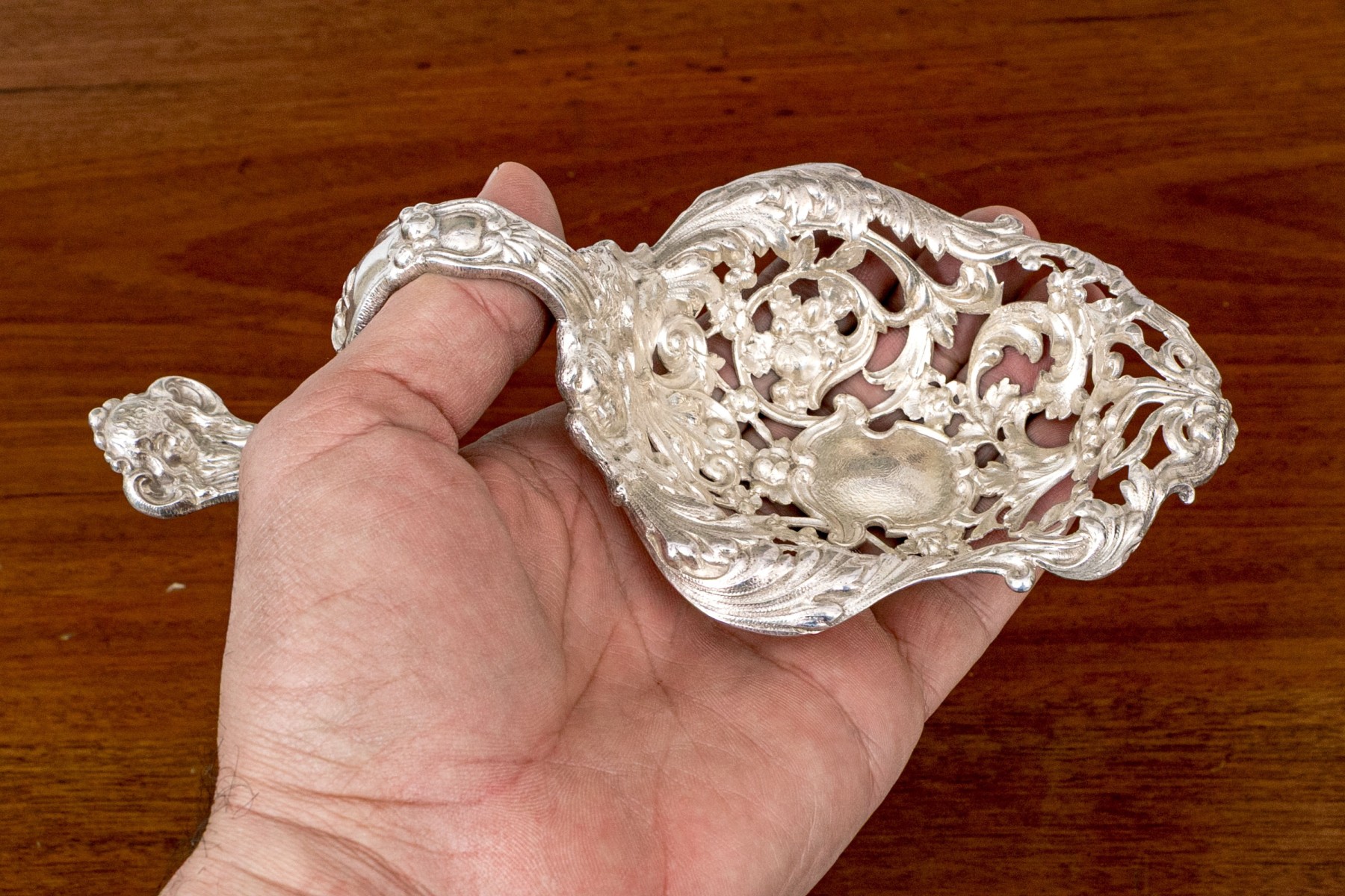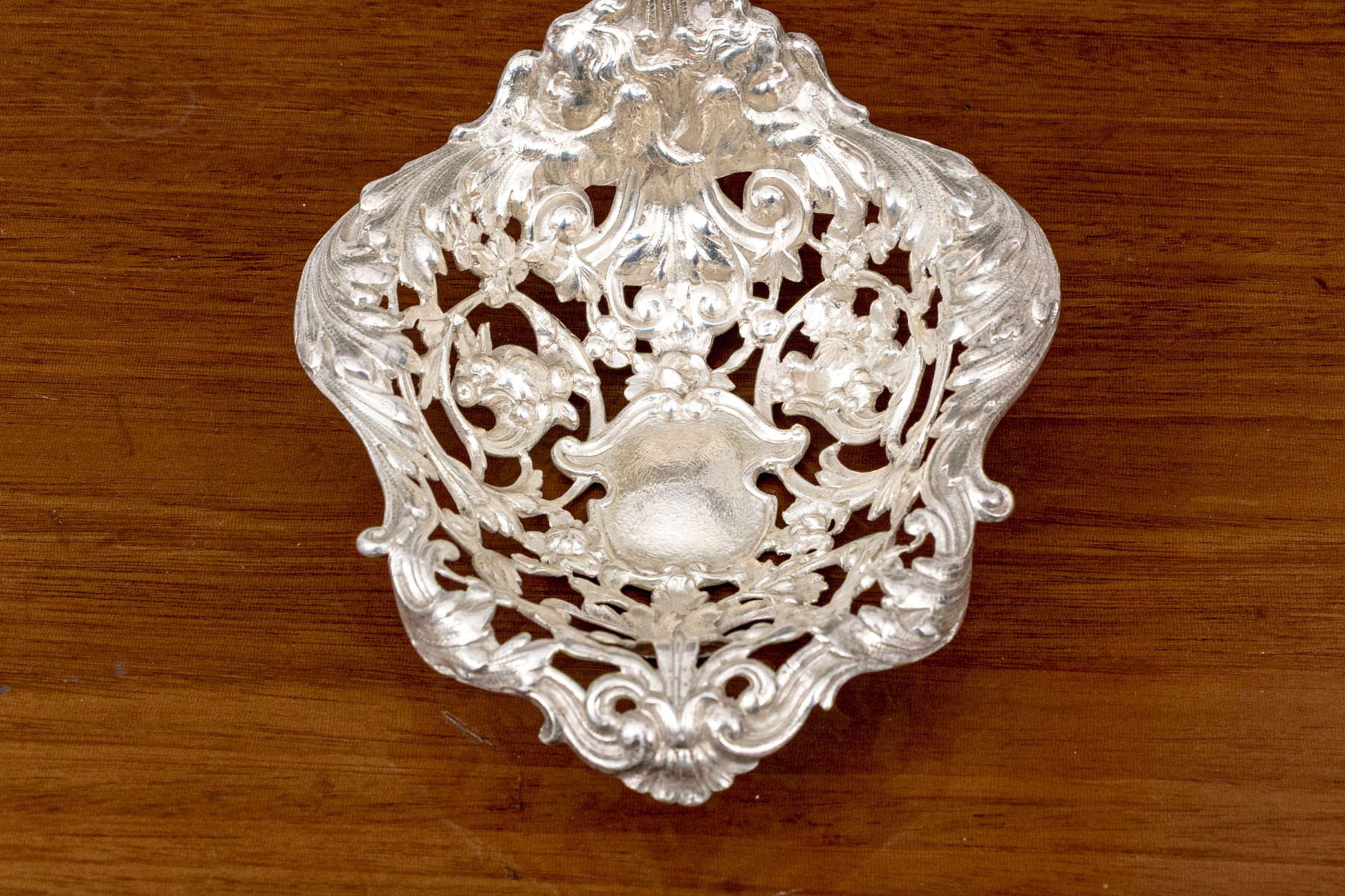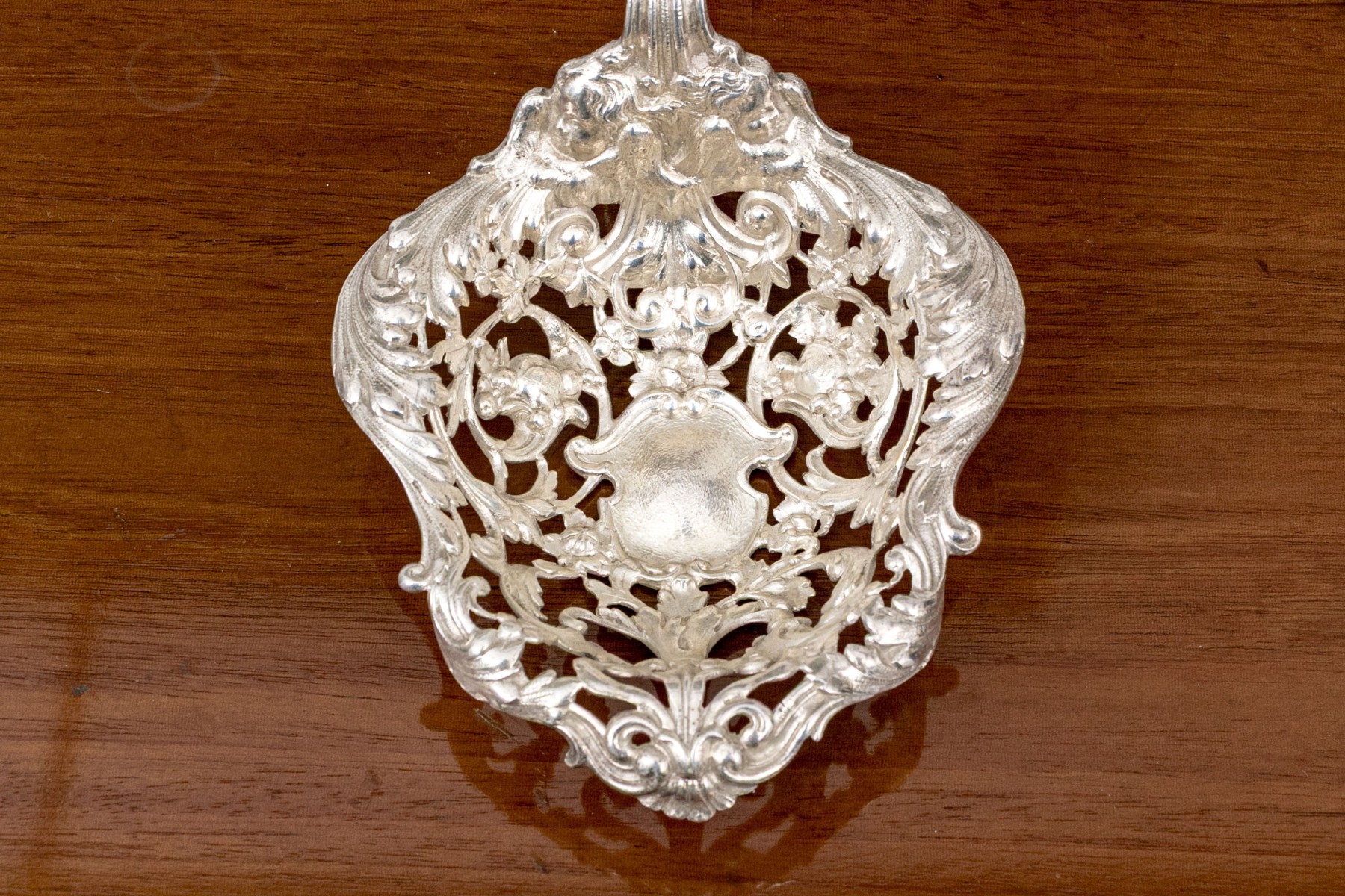 A lavish Theodore B. Starr antique bonbonnière sterling spoon showcasing an ornate flourished bowl with a scalloped foliate rim and shield medallion at the center of scrolling leaves, leading to a dramatically curved handle with rich relief throughout. Marked on the handle backside.