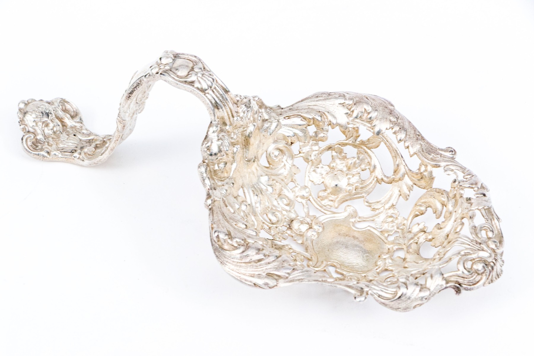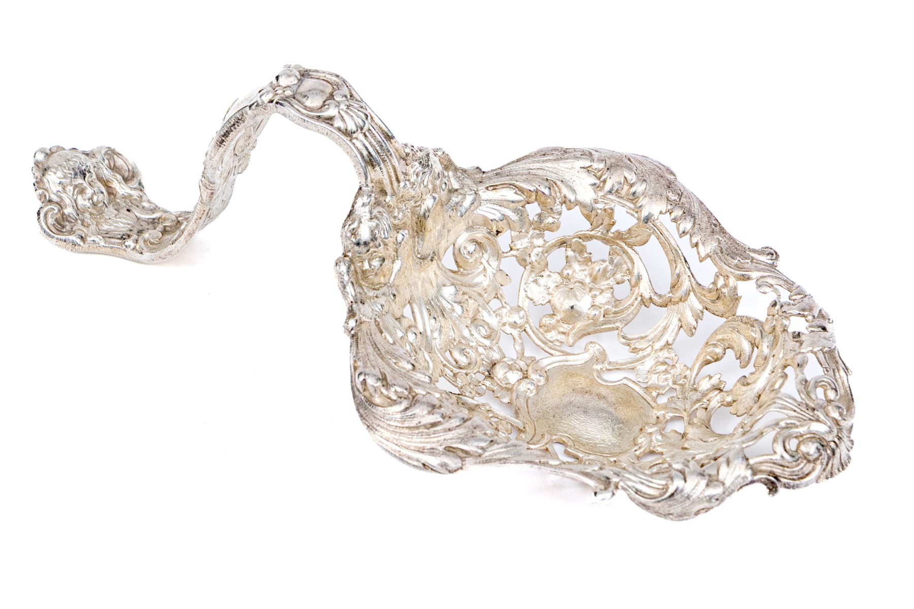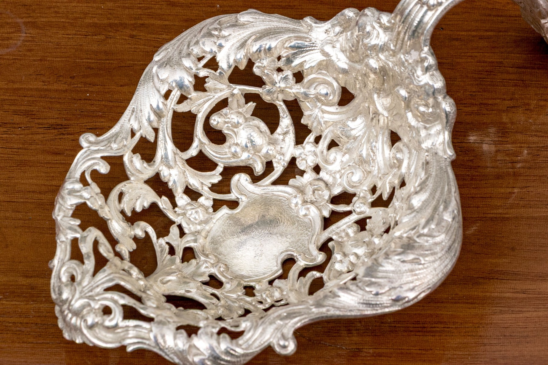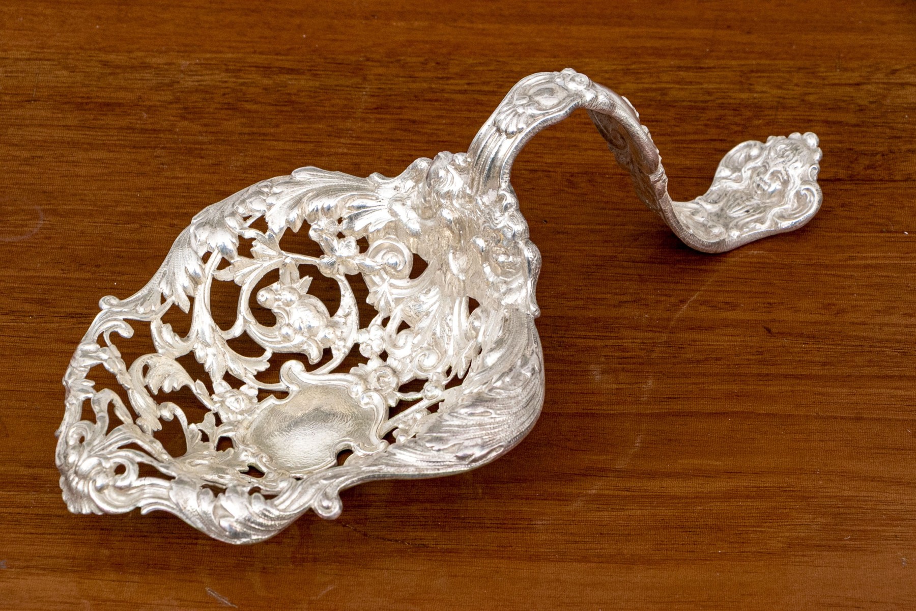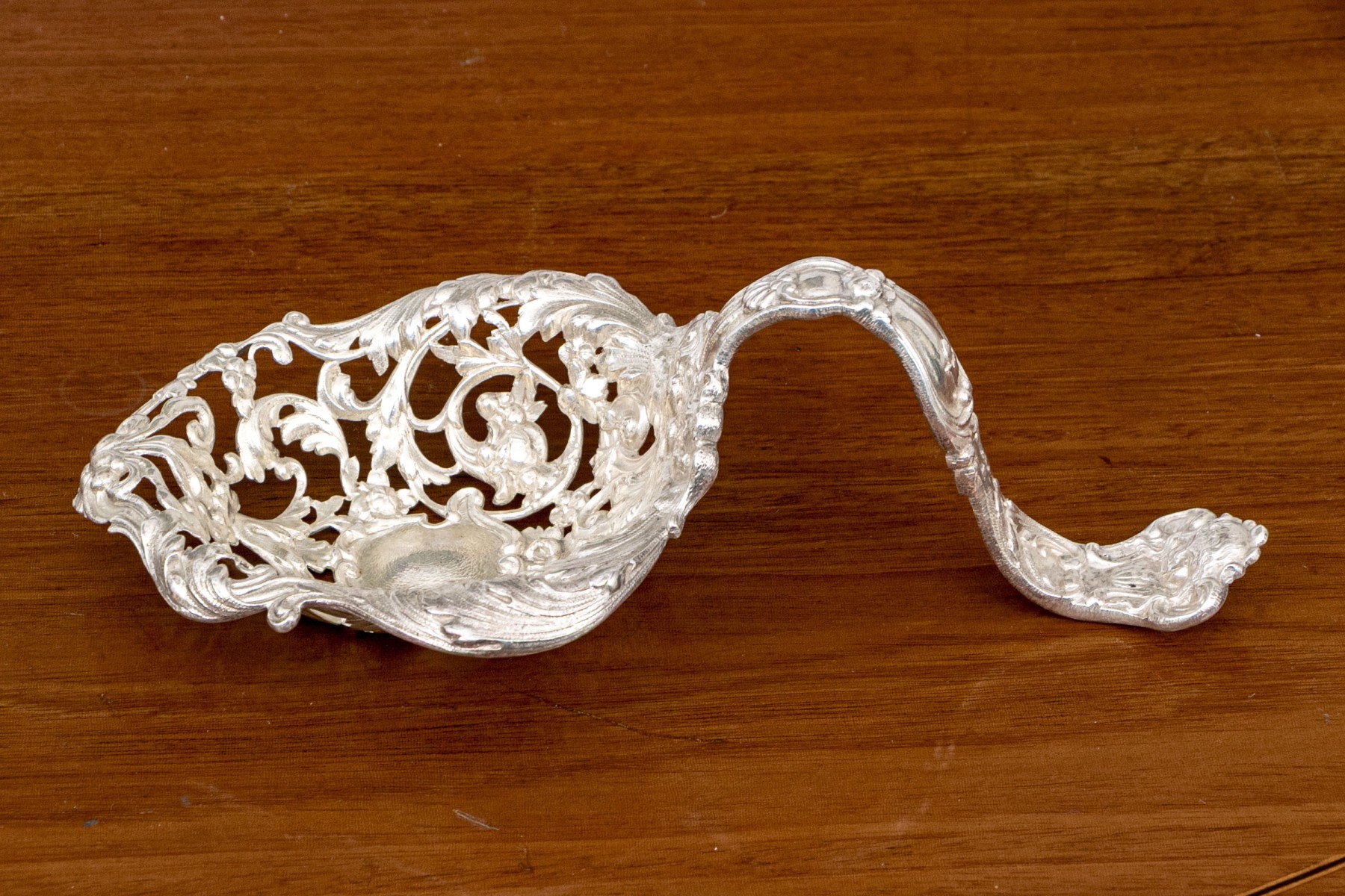 A lavish Theodore B. Starr antique bonbonnière sterling spoon showcasing an ornate flourished bowl with a scalloped foliate rim and shield medallion at the center of scrolling leaves, leading to a dramatically curved handle with rich relief throughout. Marked on the handle backside.