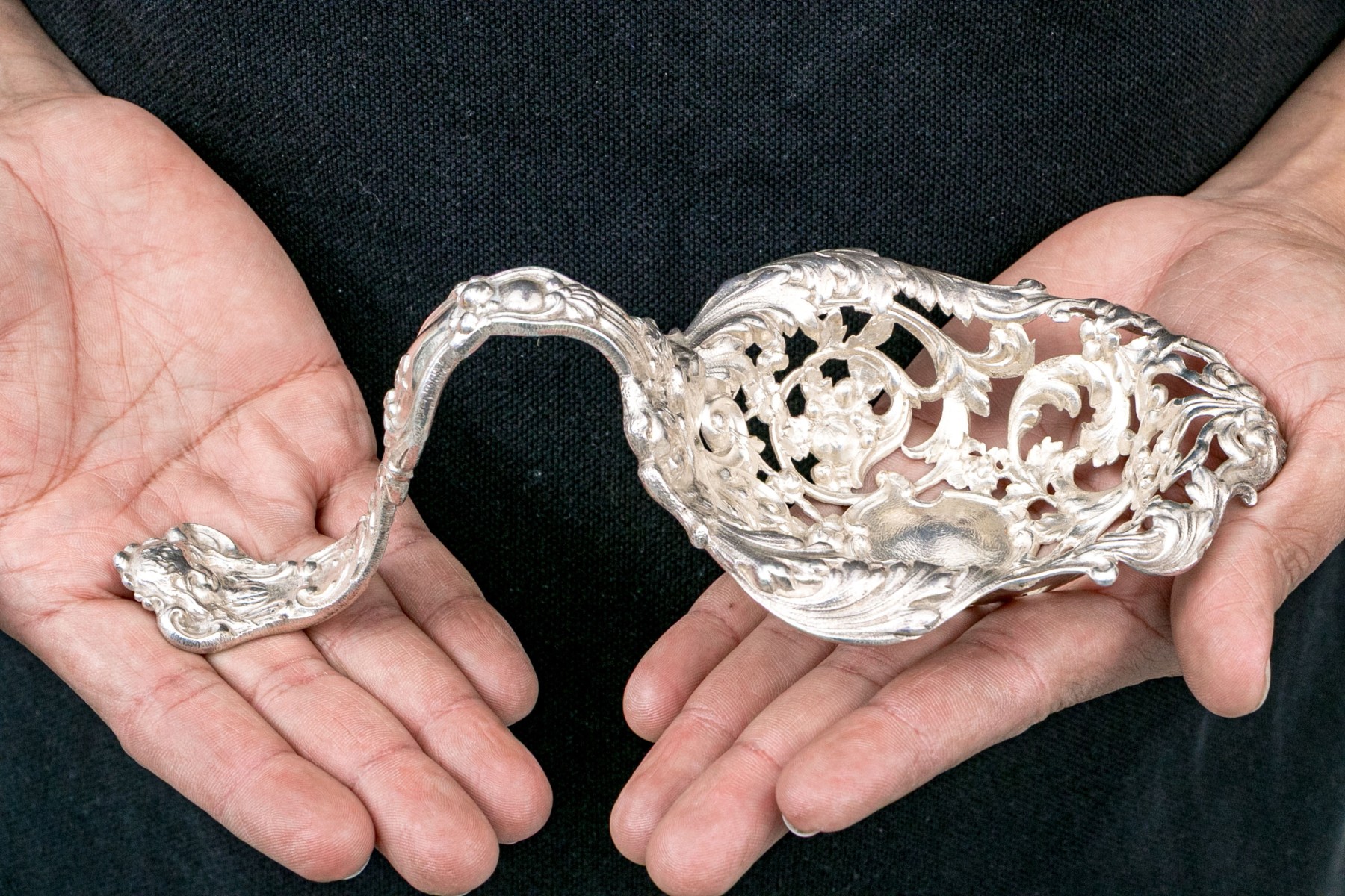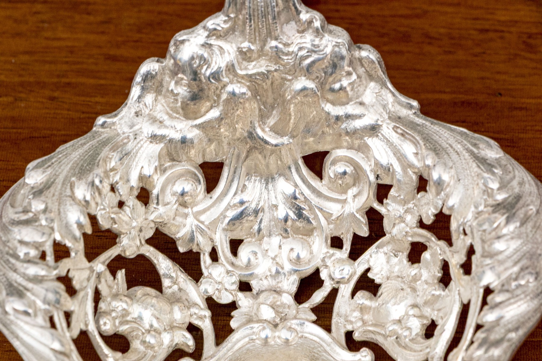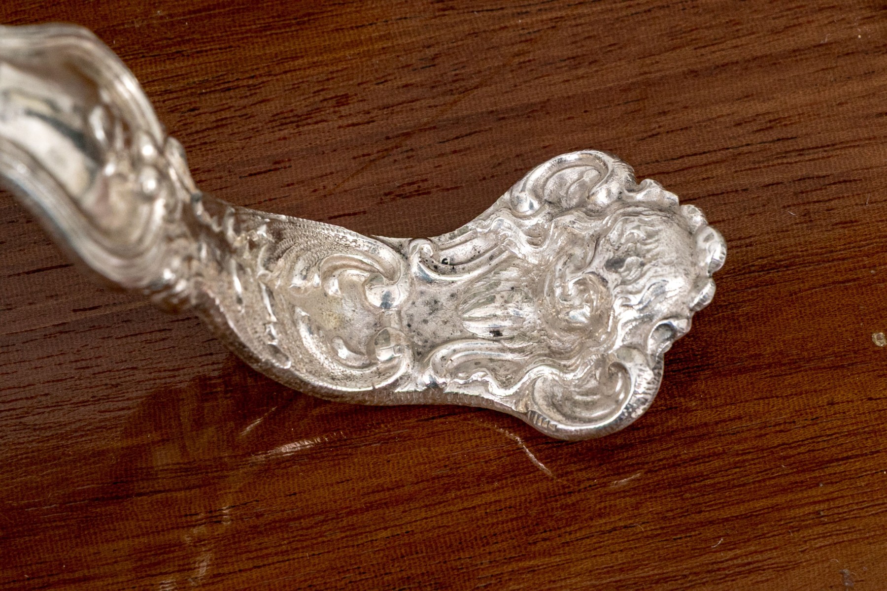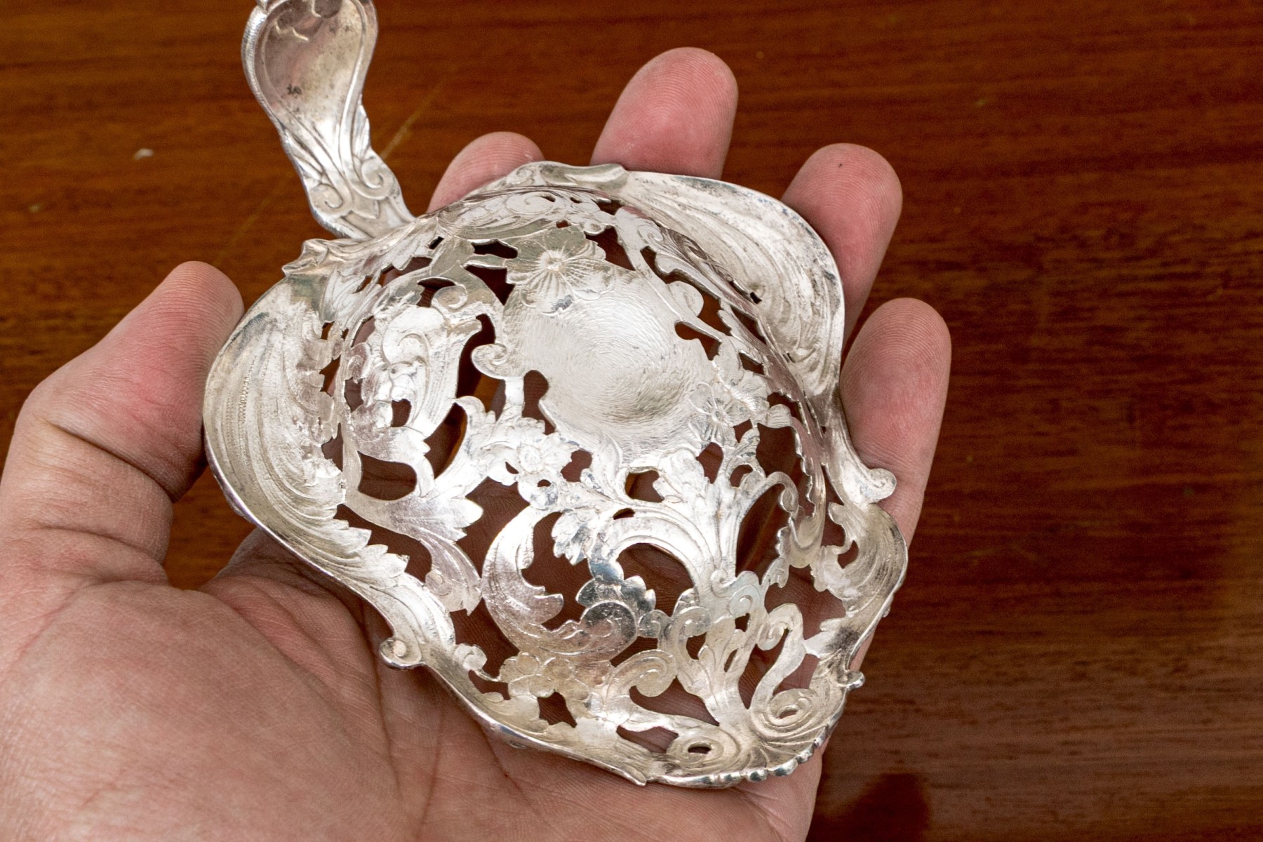 A lavish Theodore B. Starr antique bonbonnière sterling spoon showcasing an ornate flourished bowl with a scalloped foliate rim and shield medallion at the center of scrolling leaves, leading to a dramatically curved handle with rich relief throughout. Marked on the handle backside.