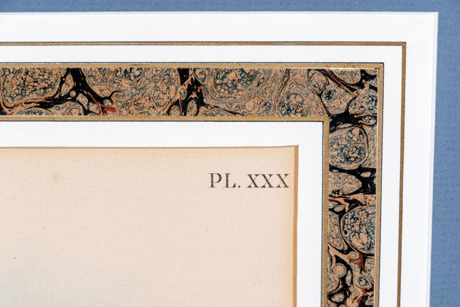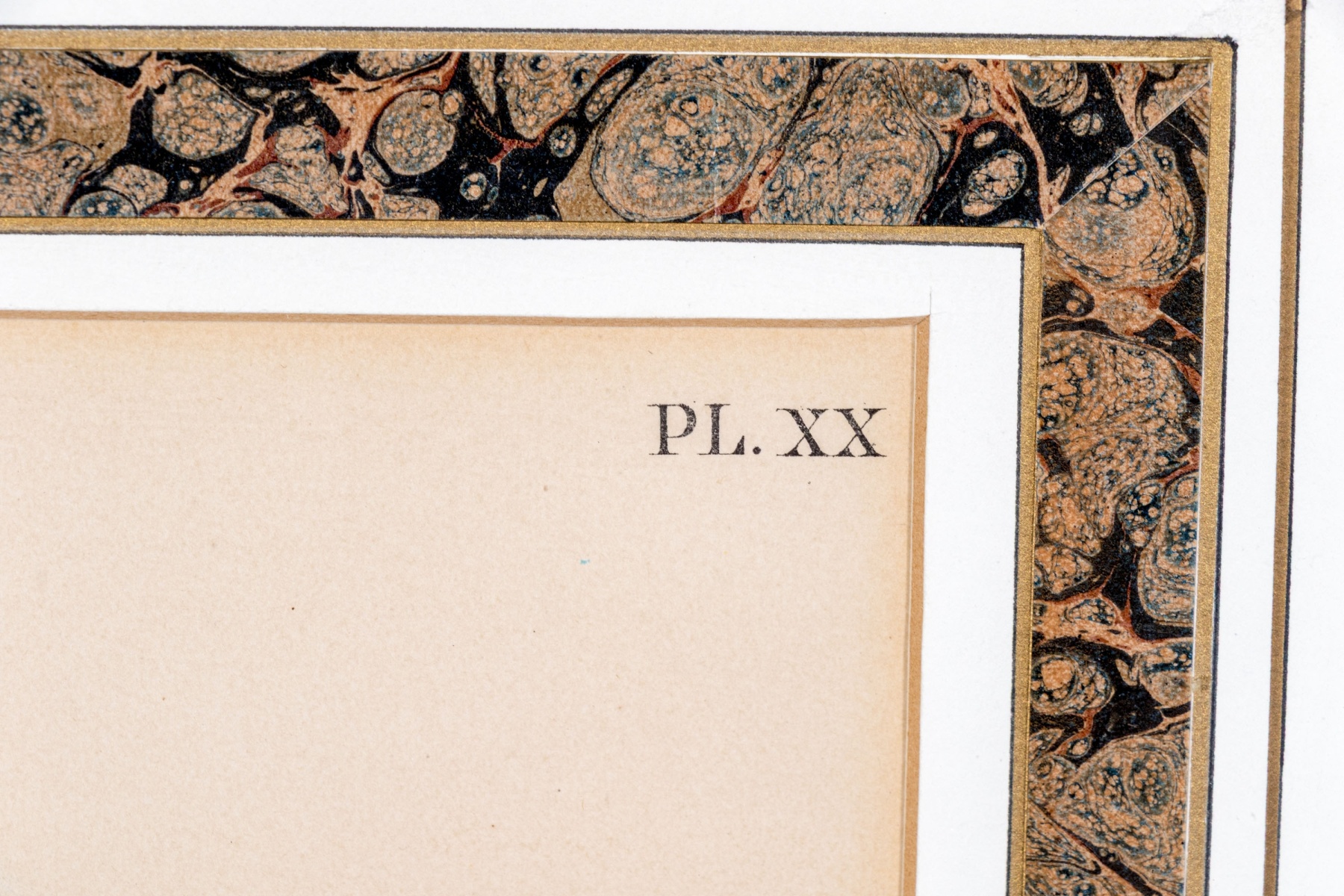 Presented custom matted with marbled trim and gilt line and blue mat with gilt frame and glazed.
