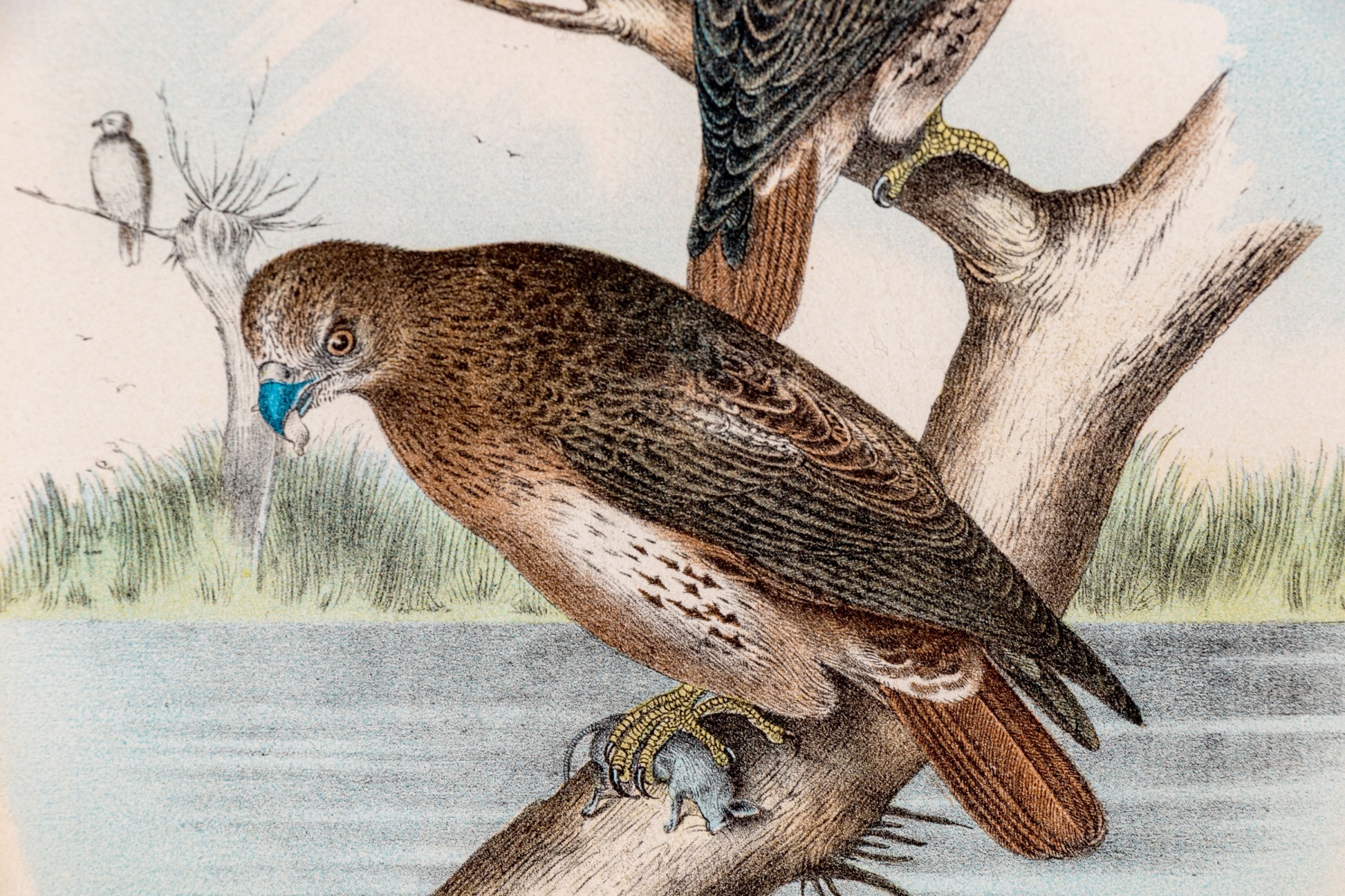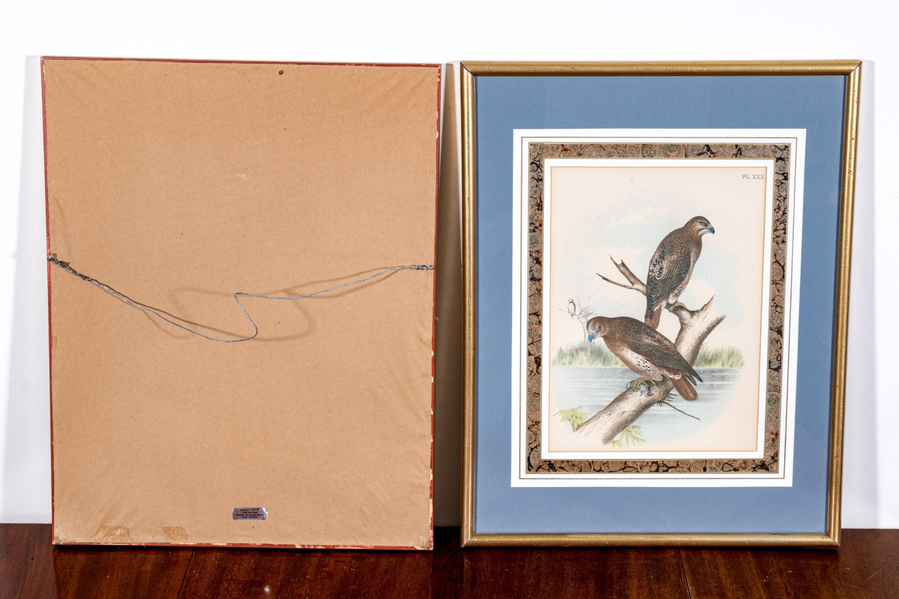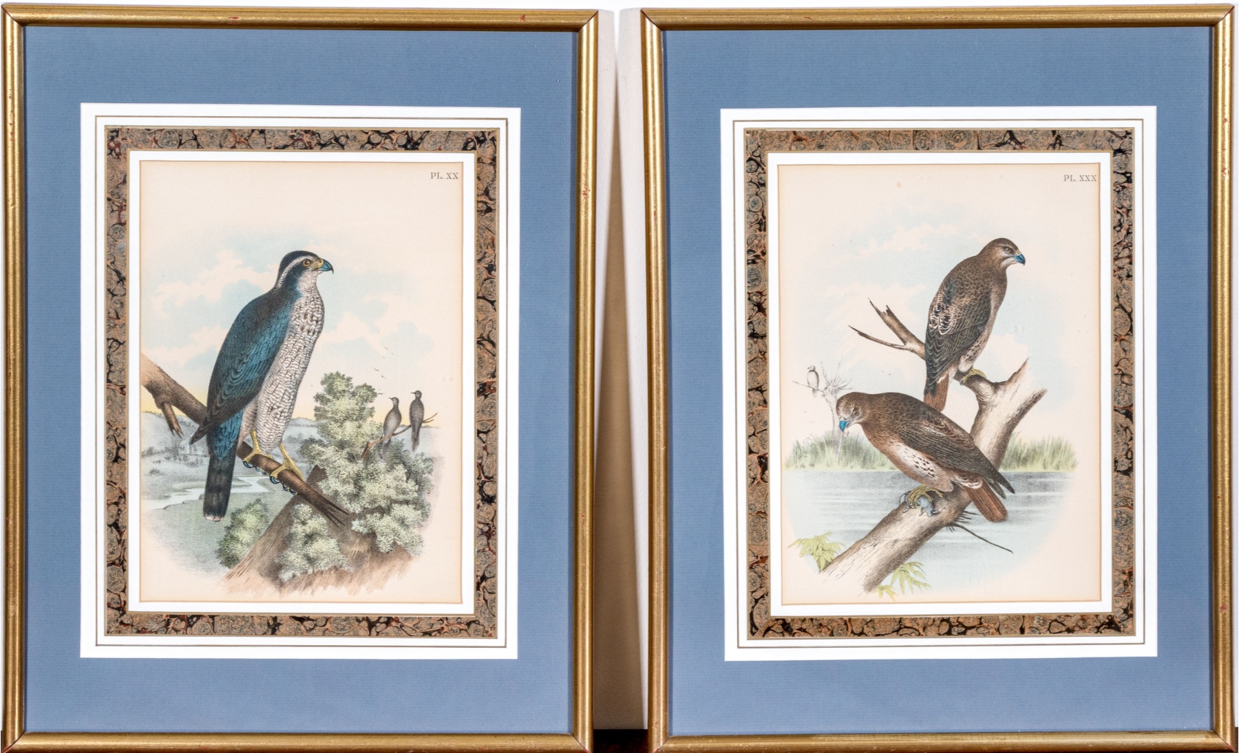 A wonderful pair of hand-colored prints after the original artworks by Theodore Jasper (American, 1814-1897) "Ash-Colored or Black-Cap Hawk" and "The Red-Tailed Hawk (Buteo Borealis)" as seen in Jacob Studer (American, 1840-1904) "Popular Ornithology of North America." One print marked PL XX. And second plate marked PL. XXX to upper right.