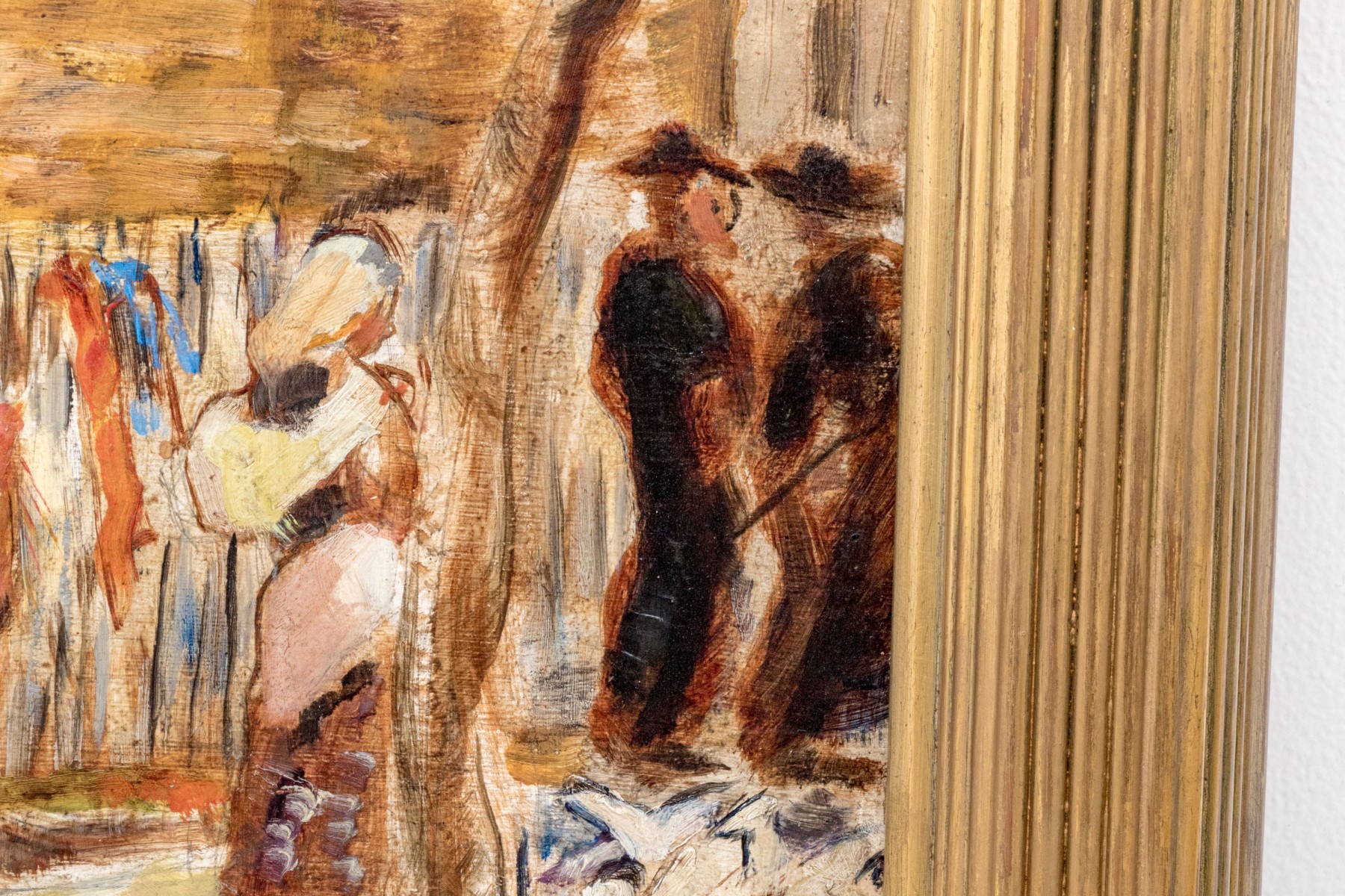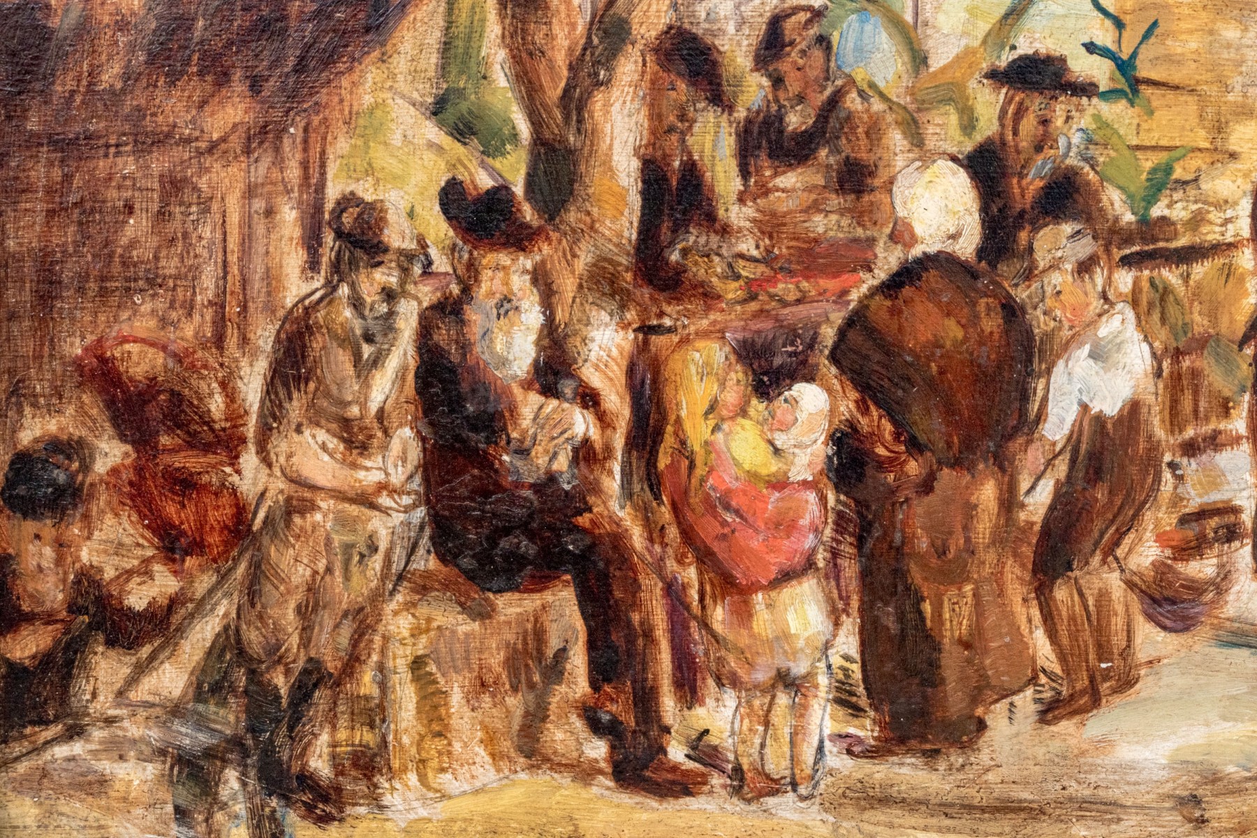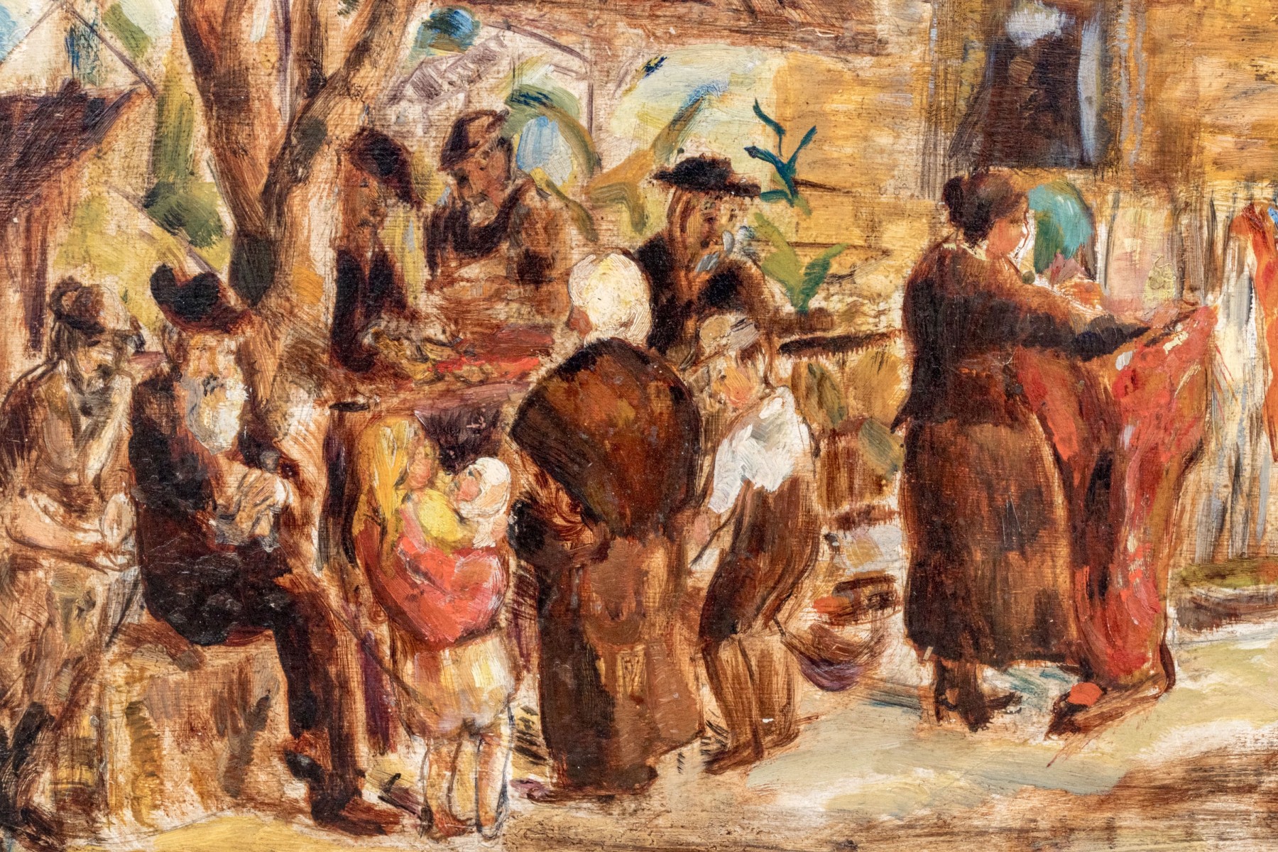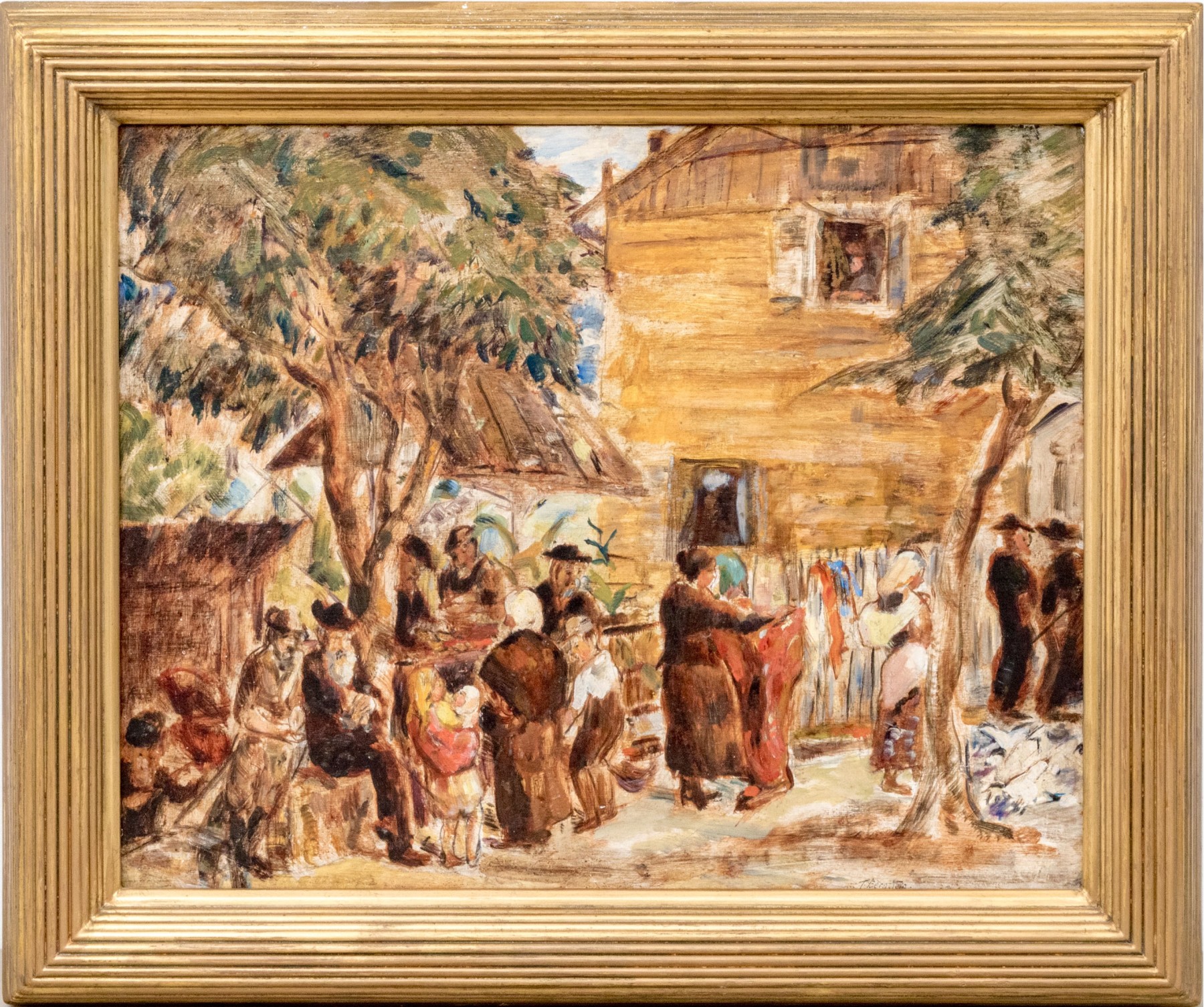 Theresa Bernstein (Polish-American, 1890-2002) oil painting on board depicting a rural market scene bustling with figures gathering around a stall near a tall building surrounded by trees. Signed lower right.