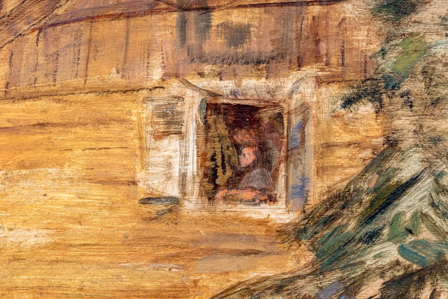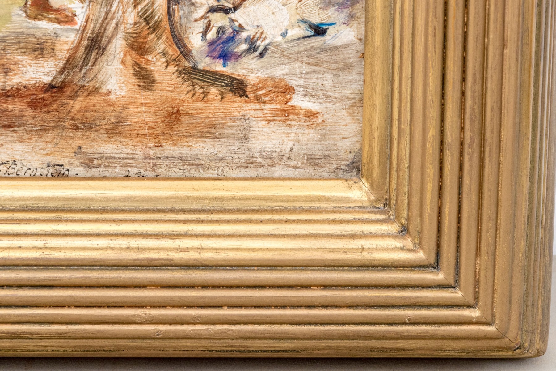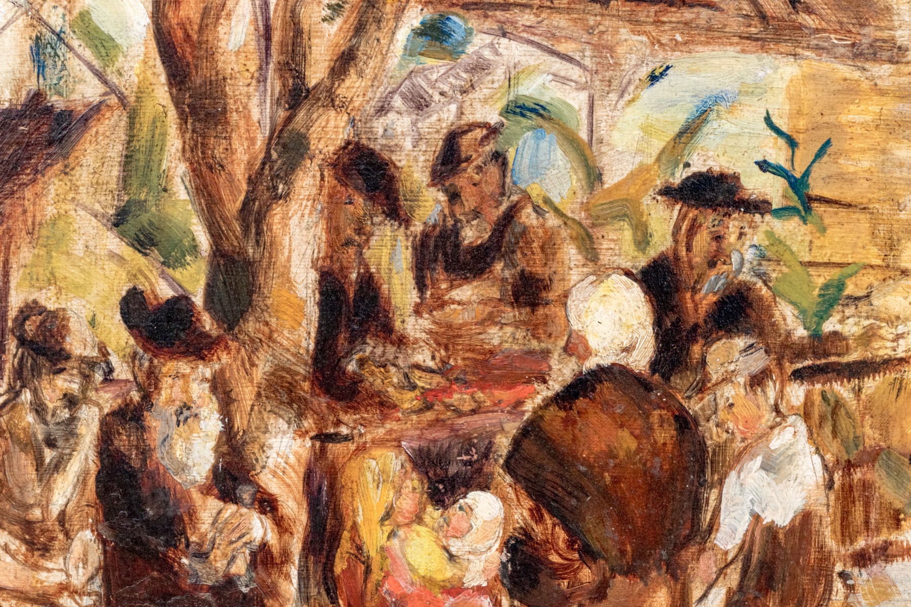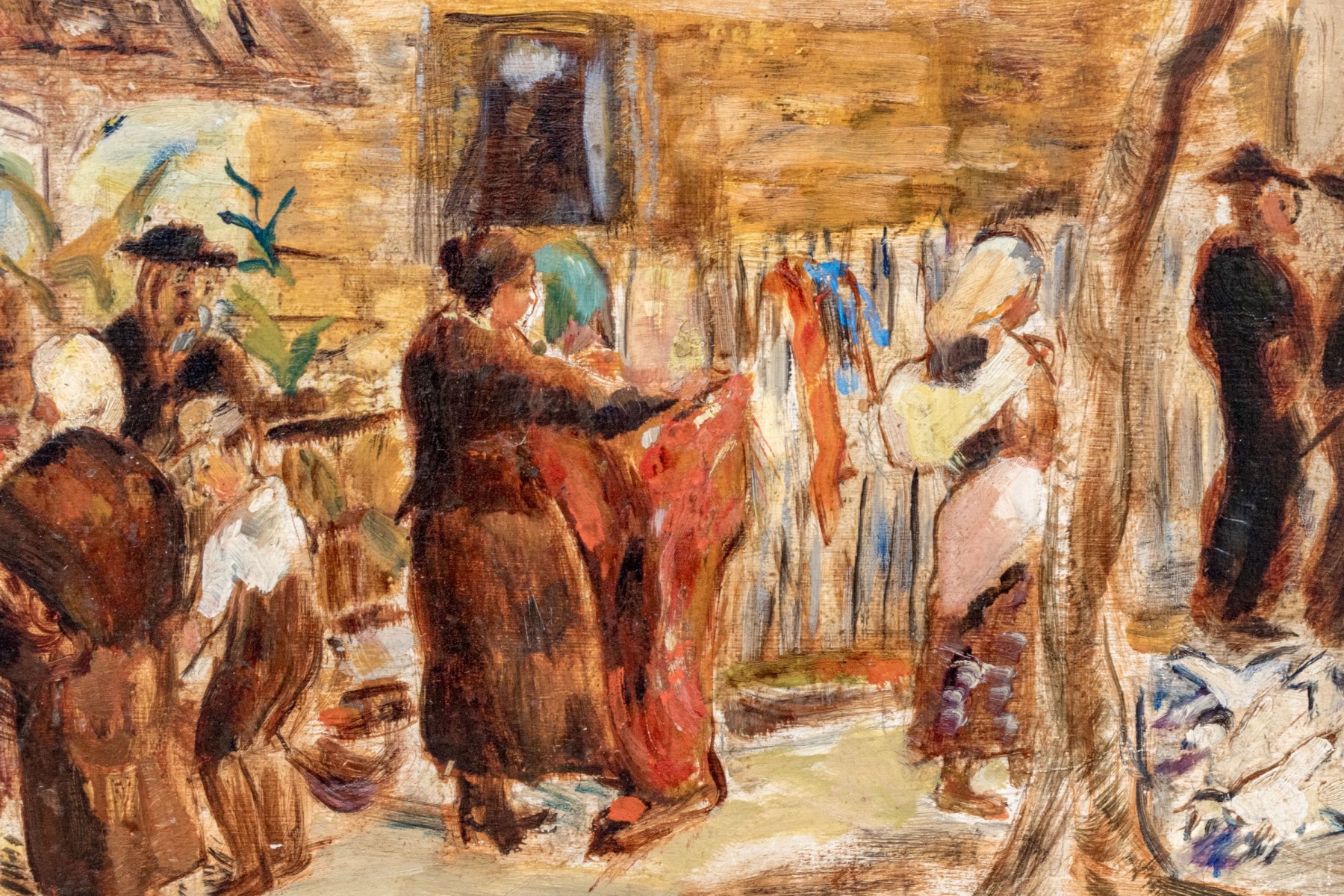Theresa Bernstein (Polish-American, 1890-2002) oil painting on board depicting a rural market scene bustling with figures gathering around a stall near a tall building surrounded by trees. Signed lower right.