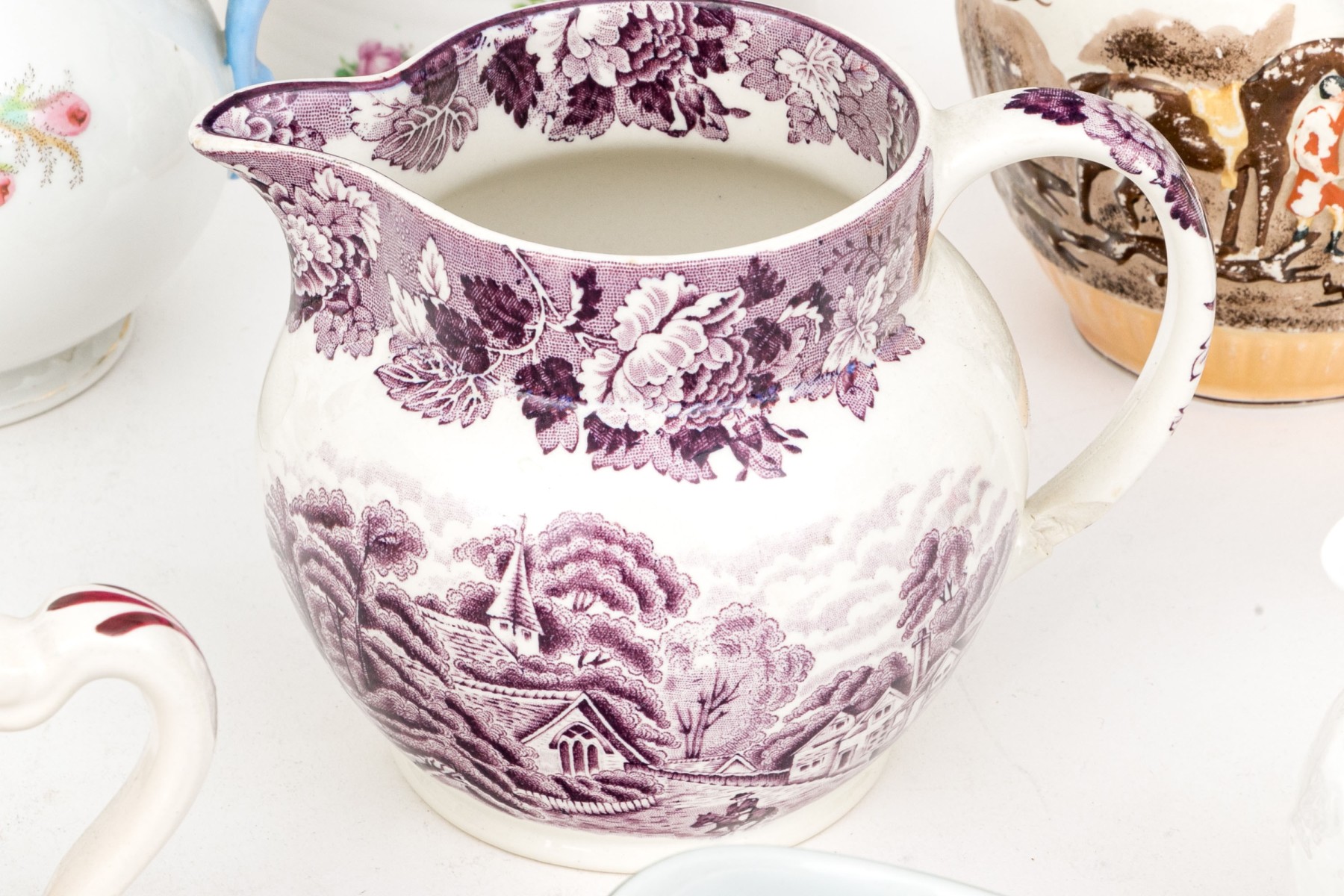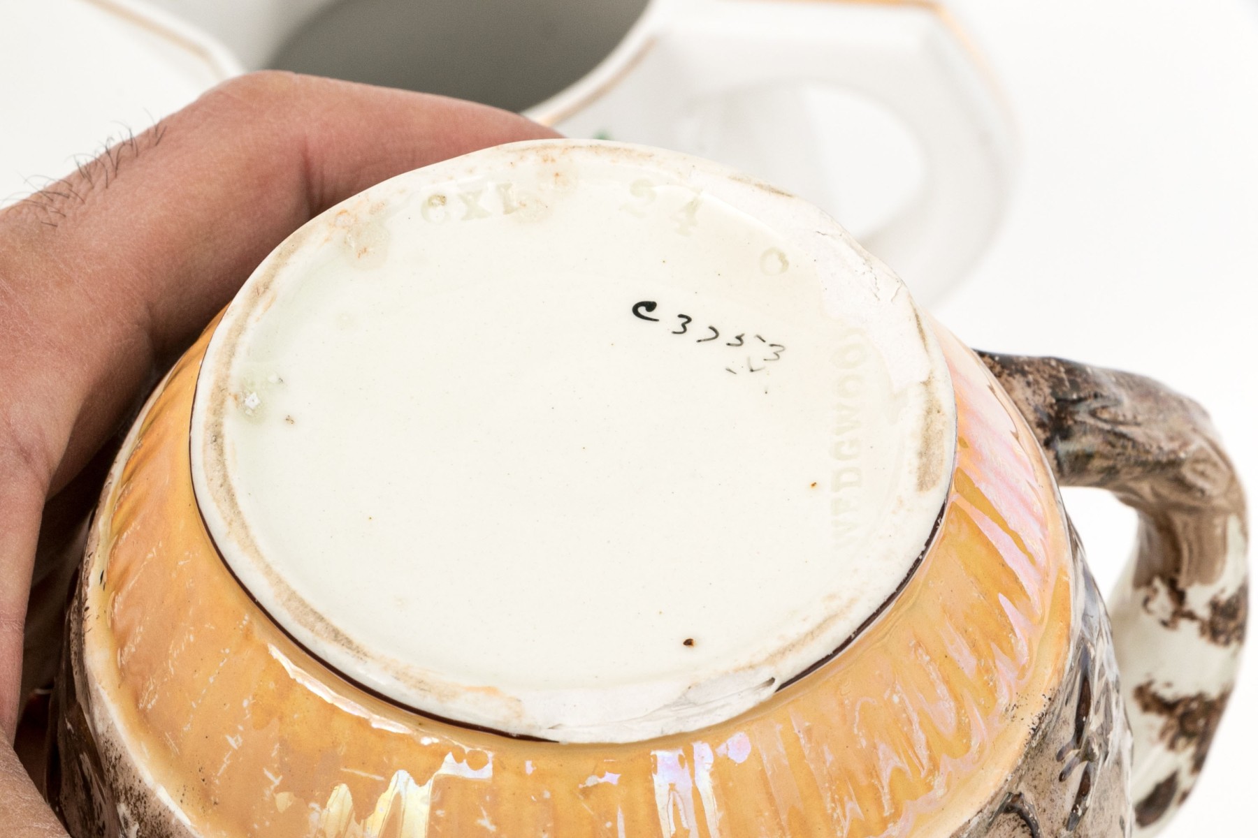 The Wedgwood hunt scene pitcher is chipped with losses to the paint. Overall good otherwise, gently used, clean