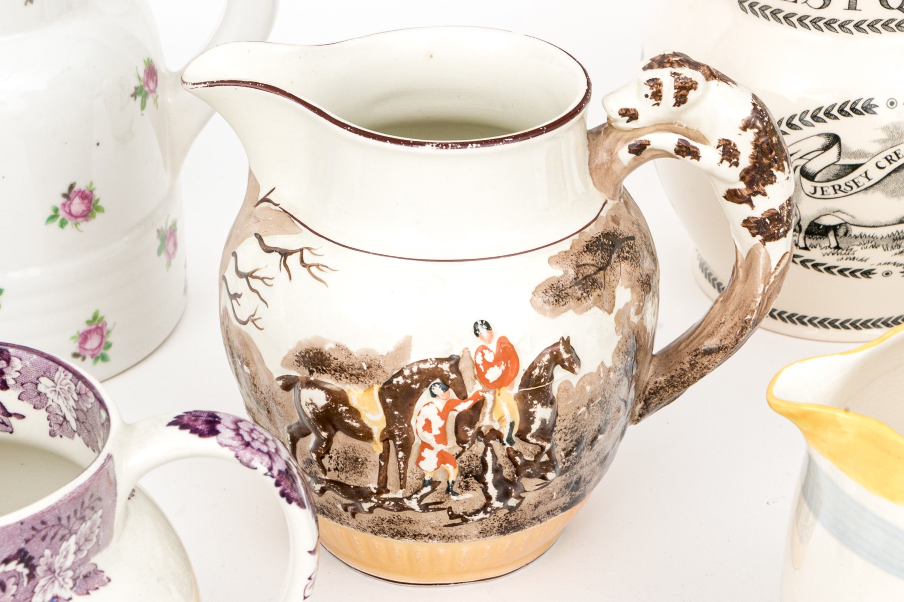 One charming Wedgwood pitcher with a painted hunt scene in relief with a dog form handle. 6" H