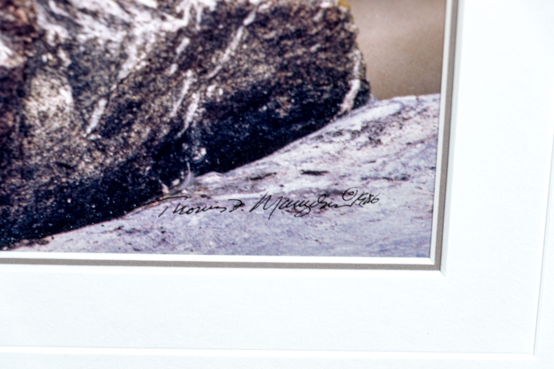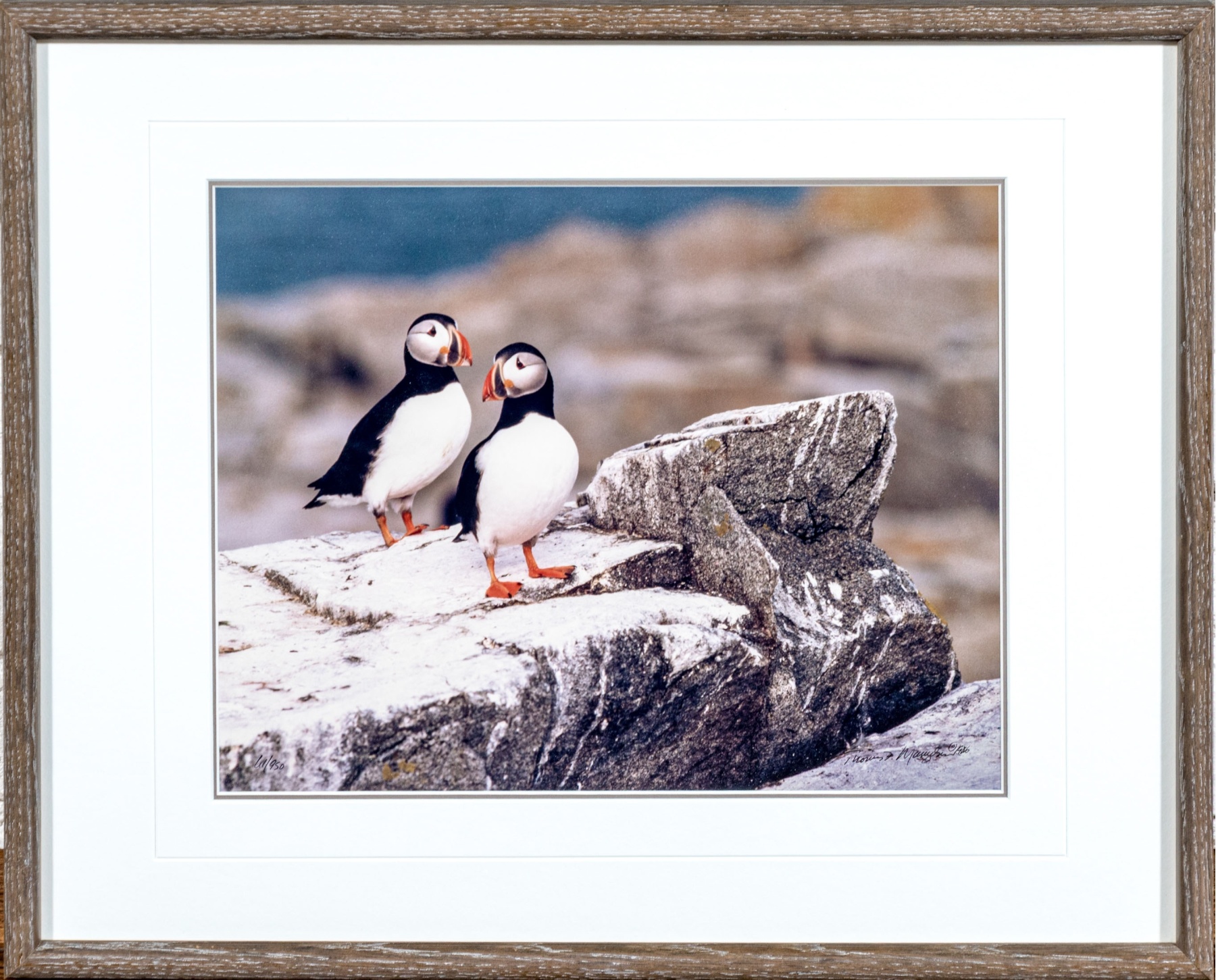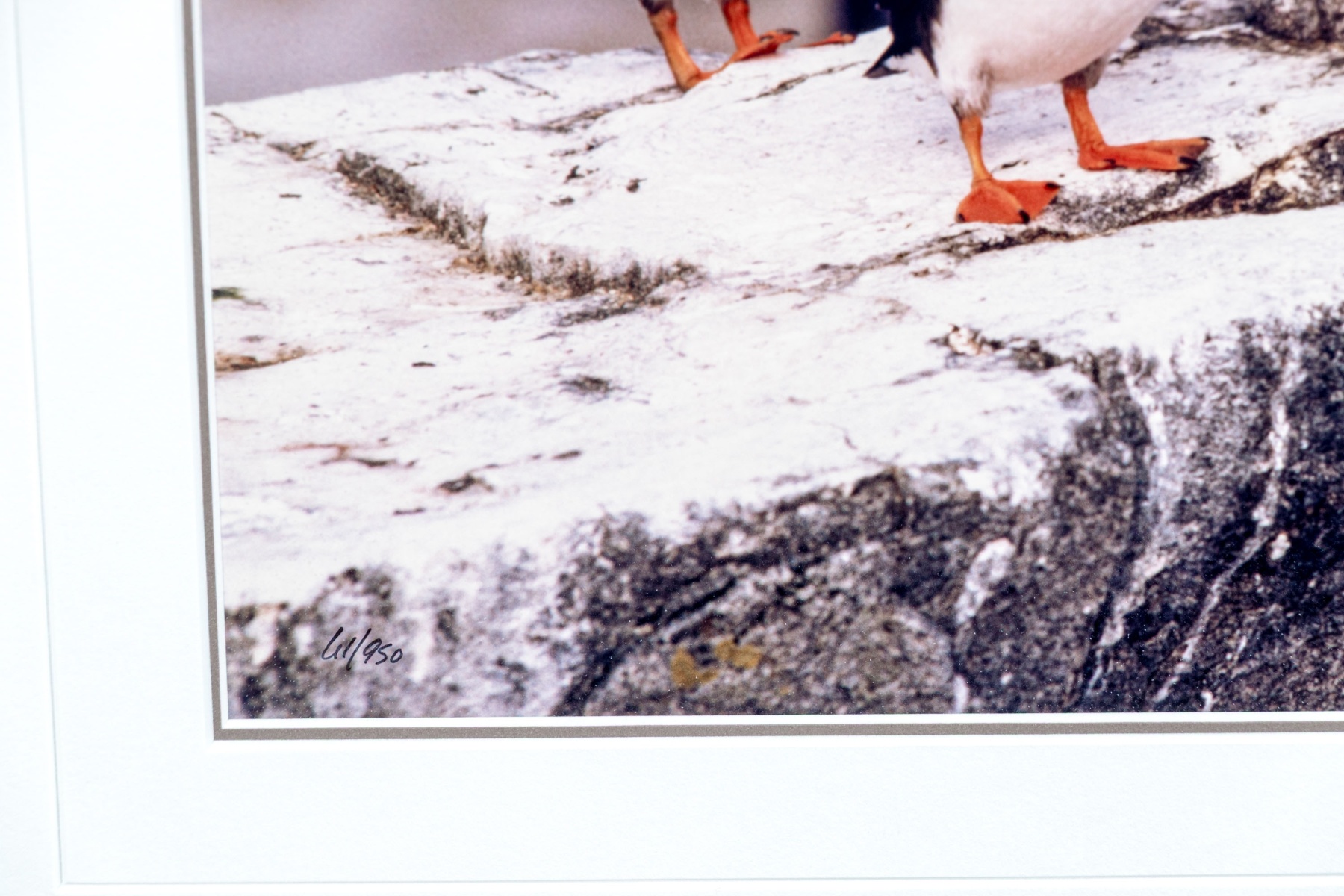 Thomas D. Mangelsen (American, B. 1946) "Puffin Pair" photographic print depicting two puffins in vibrant black, white, and orange tanding on a rocky outcrop against a bokeh background with rocks in warm orange and gray beautifully contrasting with a hint of deep cerulean blue water. Signed and dated 1986 lower right, numbered 61/950 lower left.