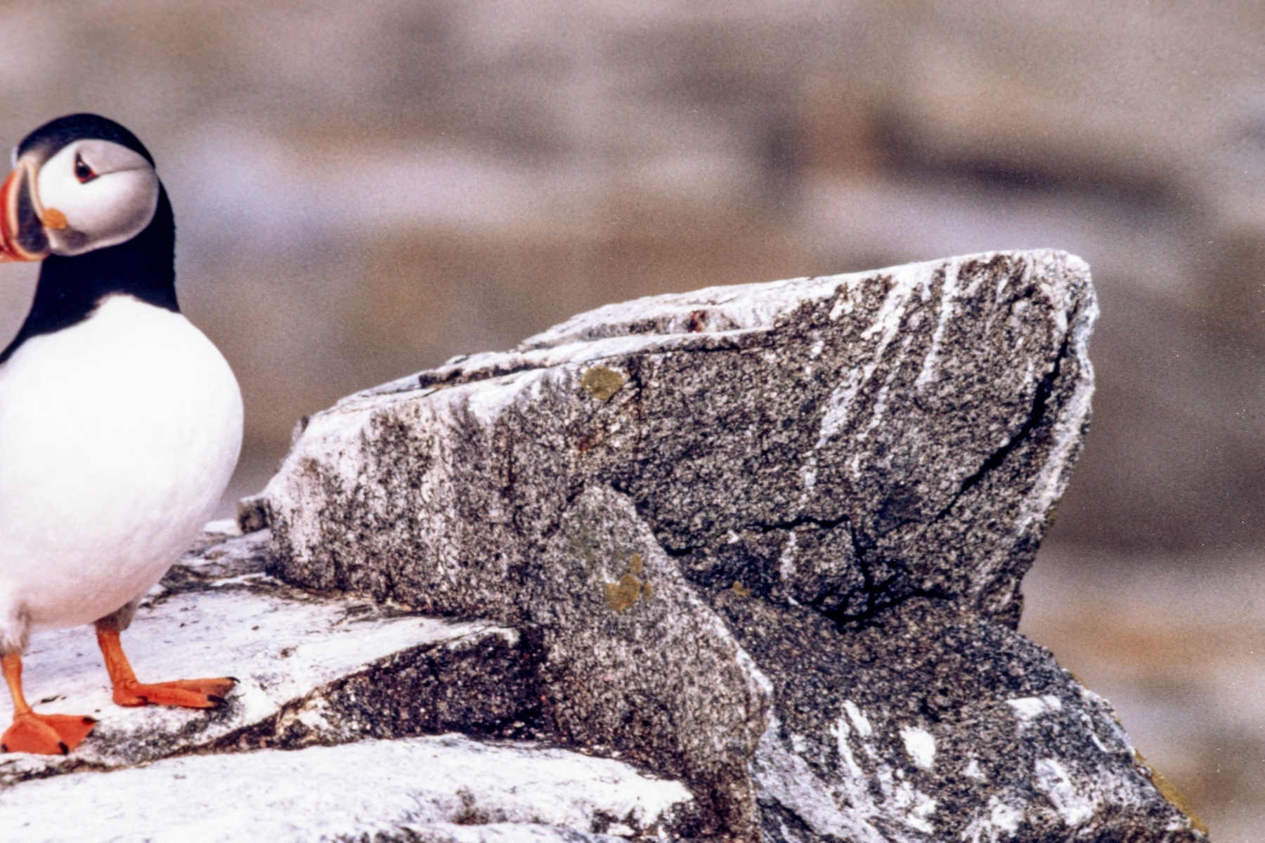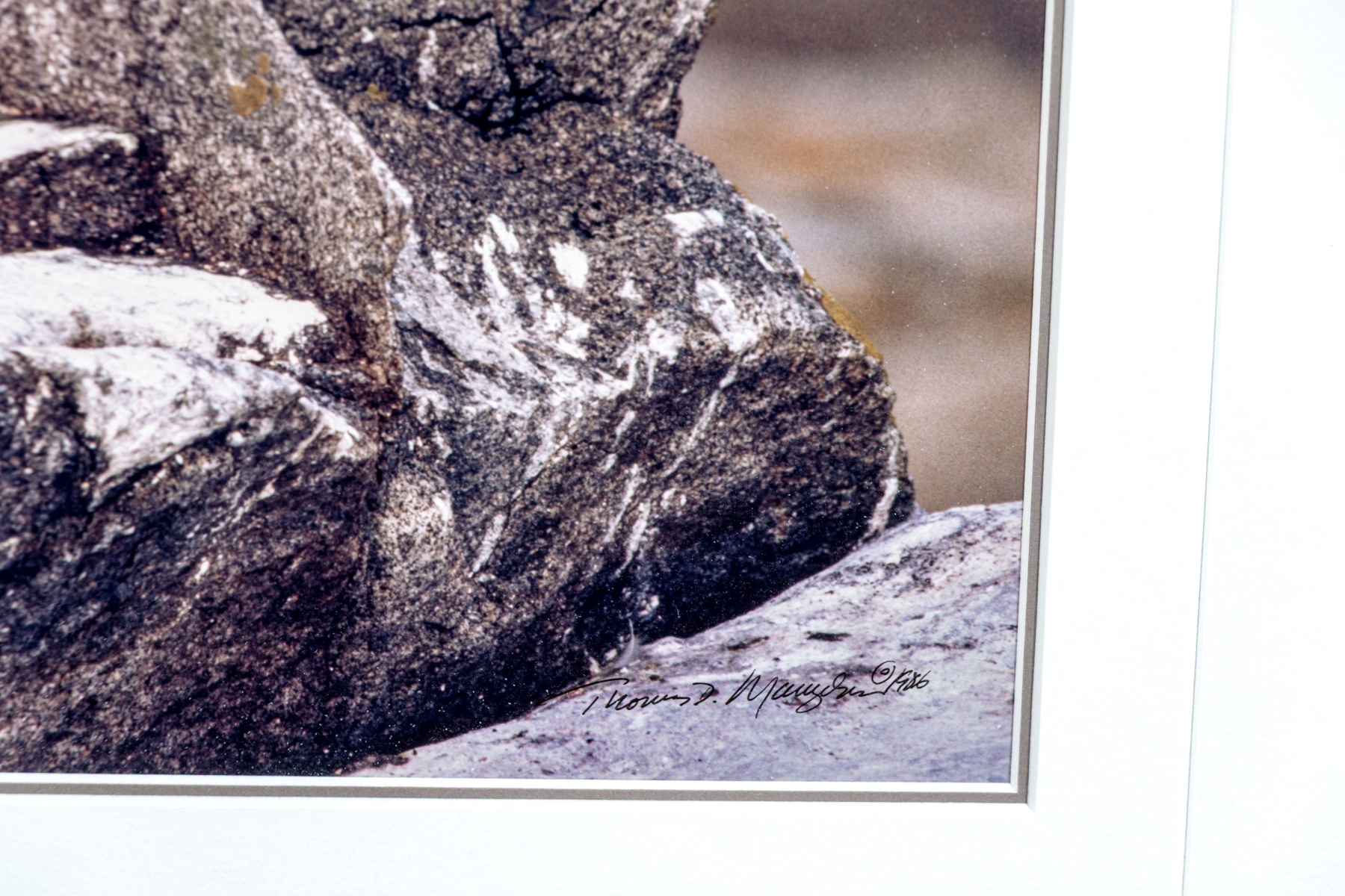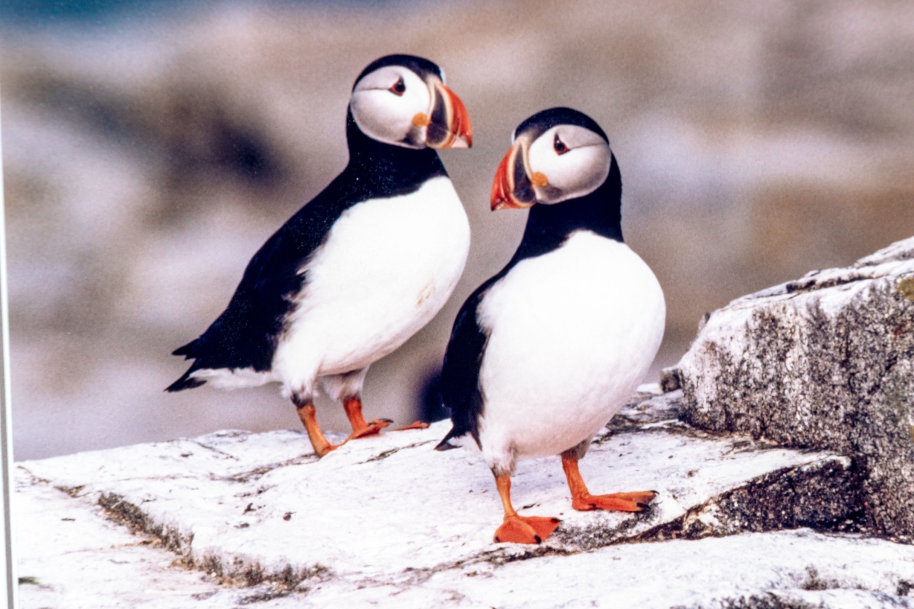 Thomas D. Mangelsen (American, B. 1946) "Puffin Pair" photographic print depicting two puffins in vibrant black, white, and orange tanding on a rocky outcrop against a bokeh background with rocks in warm orange and gray beautifully contrasting with a hint of deep cerulean blue water. Signed and dated 1986 lower right, numbered 61/950 lower left.