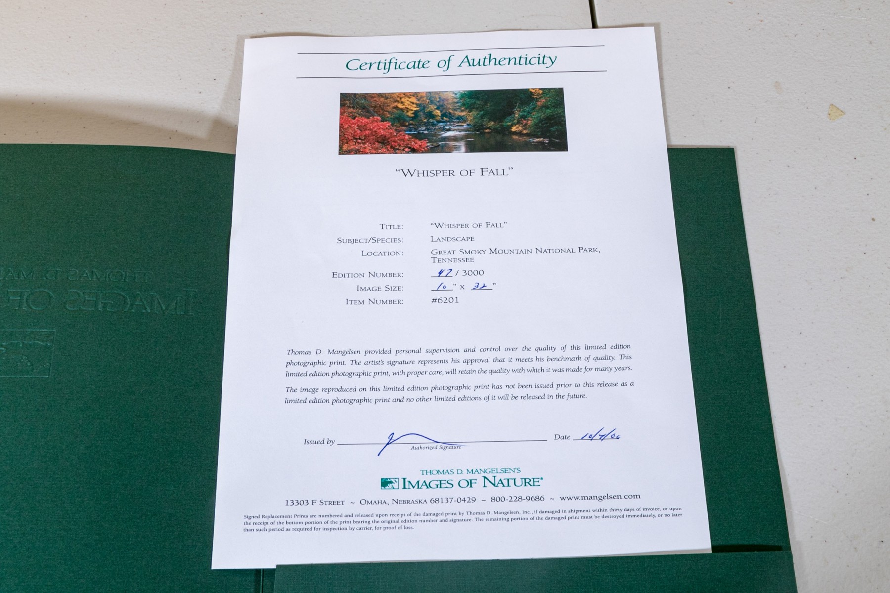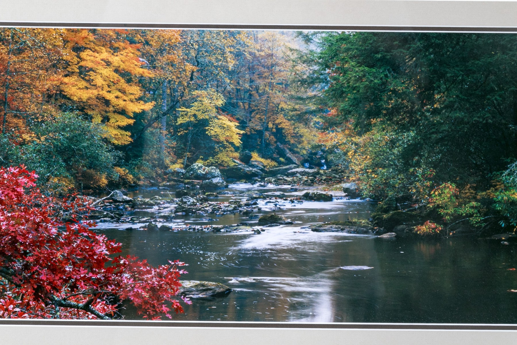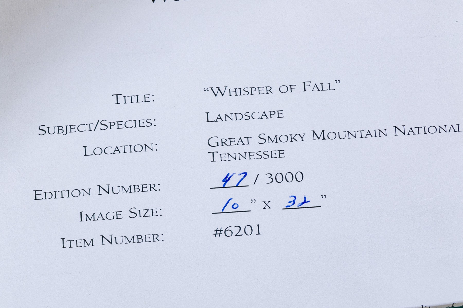 Labels and documentation on back. Titled, “Whisper of Fall” displaying landscape from Great Smokey mountain national park , Tennessee. Edition, 47/3000.