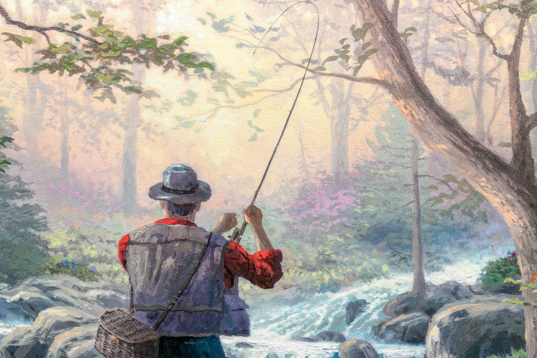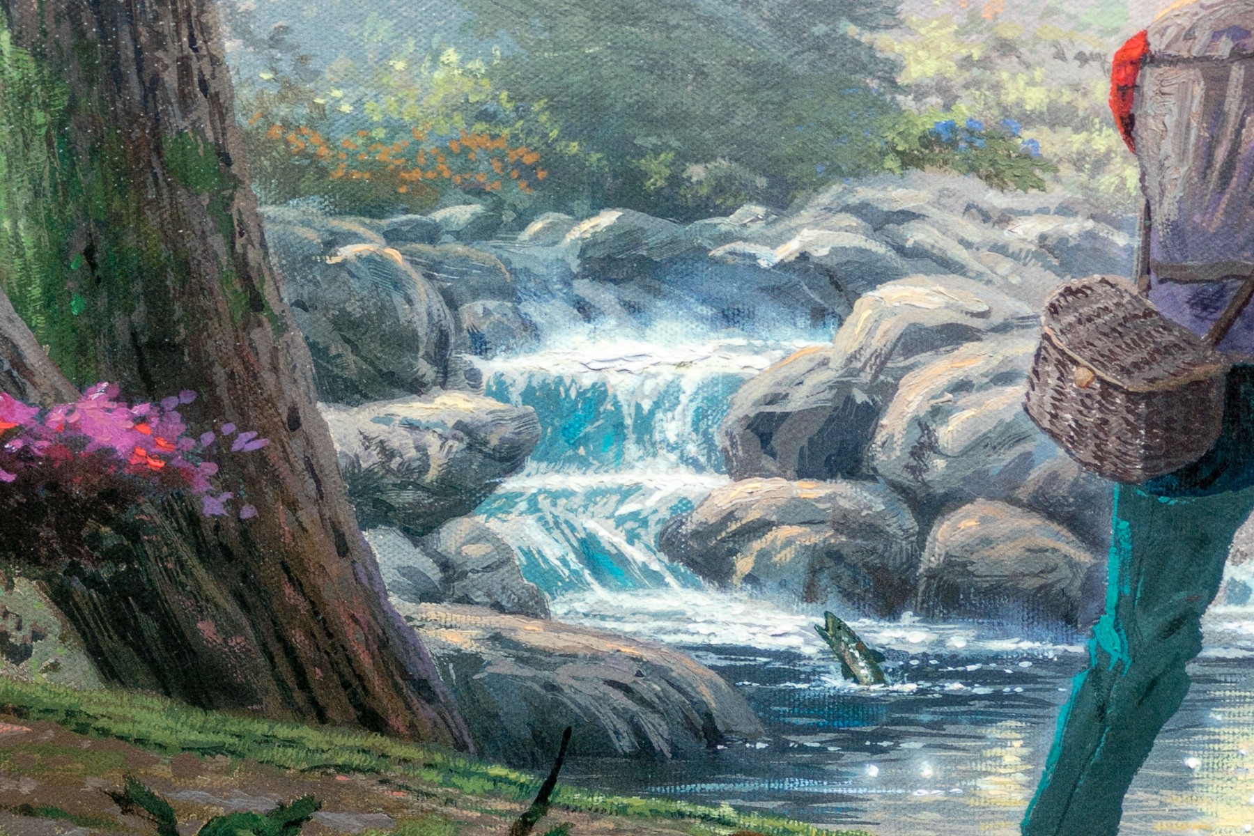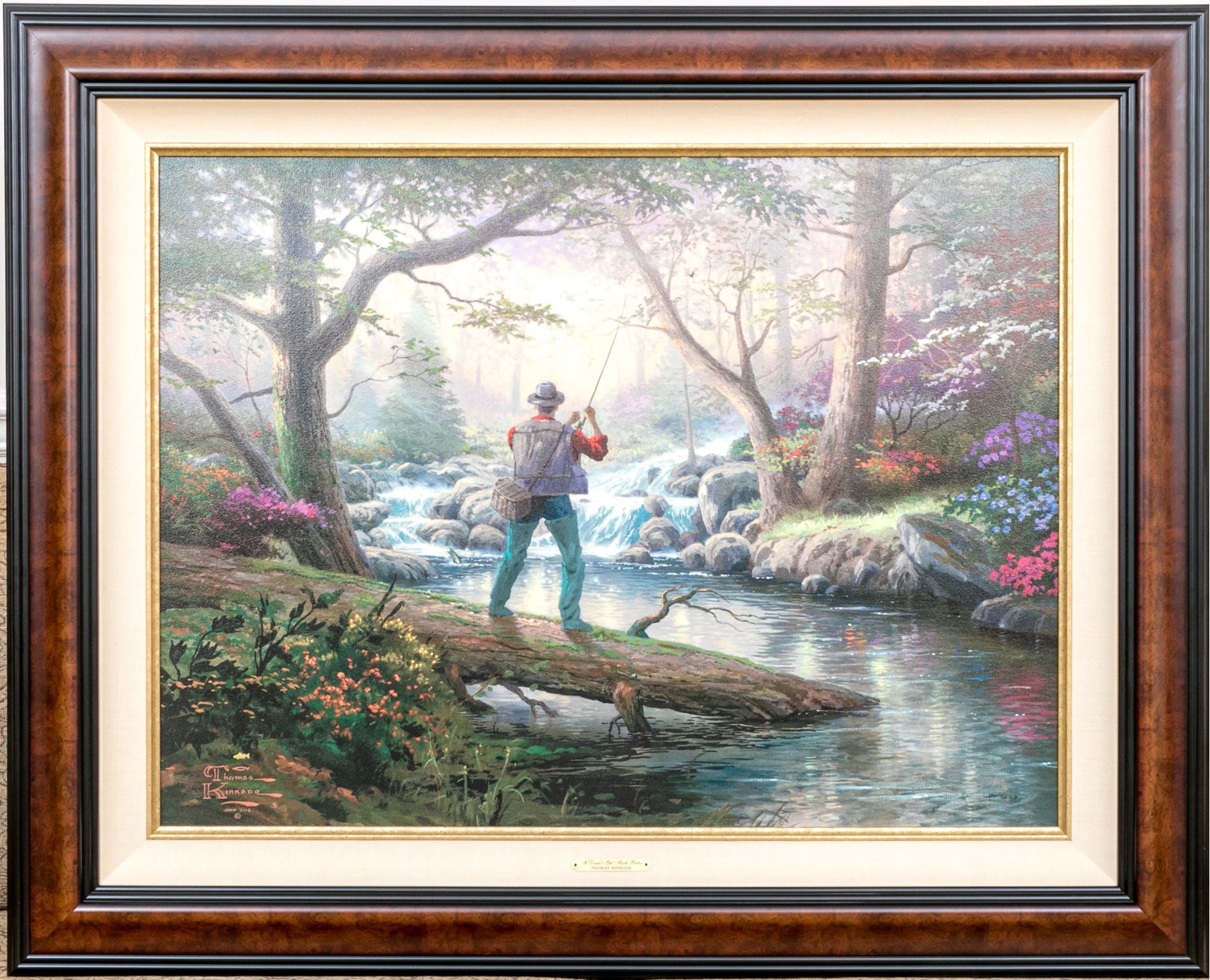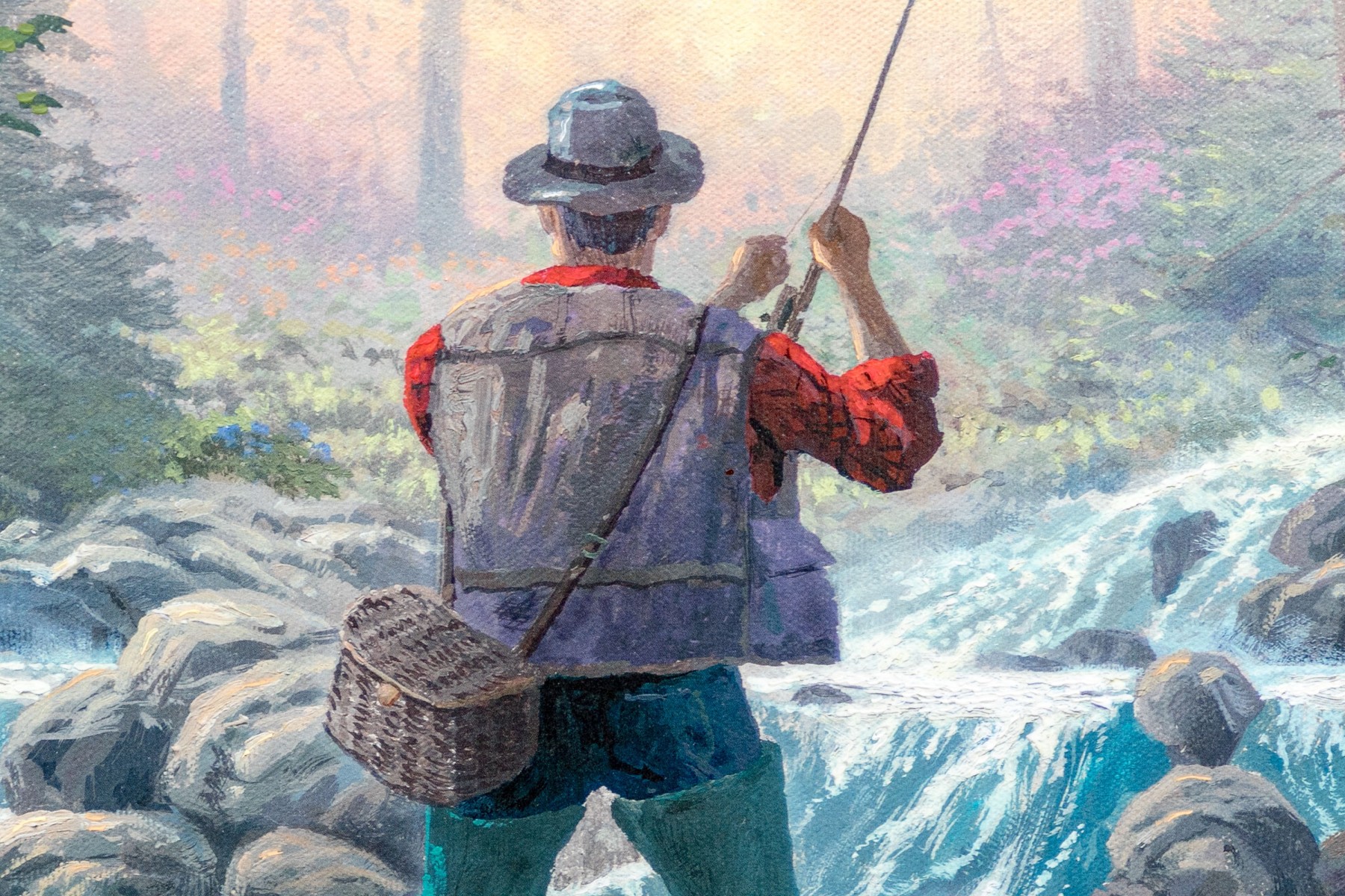 Thomas Kinkade (American [CA], 1958-2012) "It Doesn't Get Much Better" print on canvas depicting a lone fisherman standing on a fallen log over a serene stream overlooking a small rolling cascade. Pastel morning light bathes the scene in a warm glow, illuminating colorful bushes with purple, blue, and pink flowers.