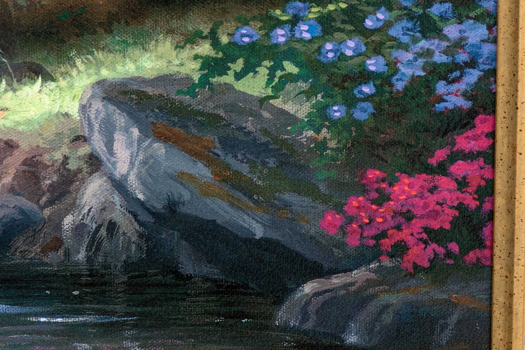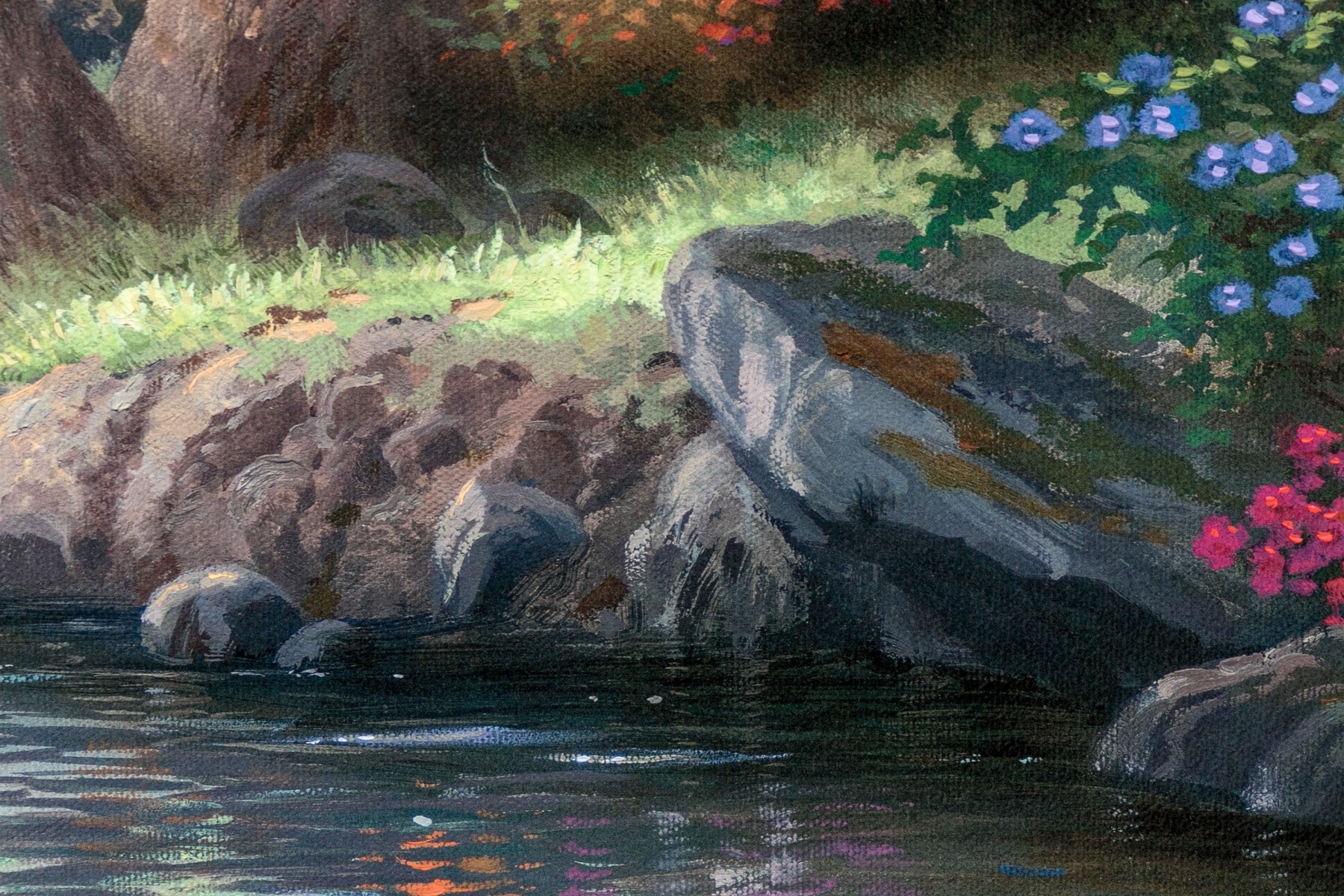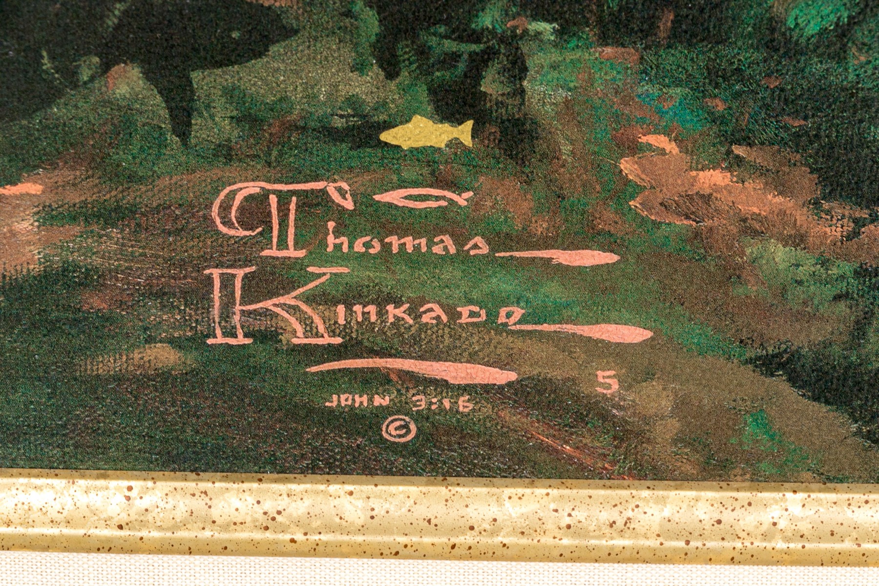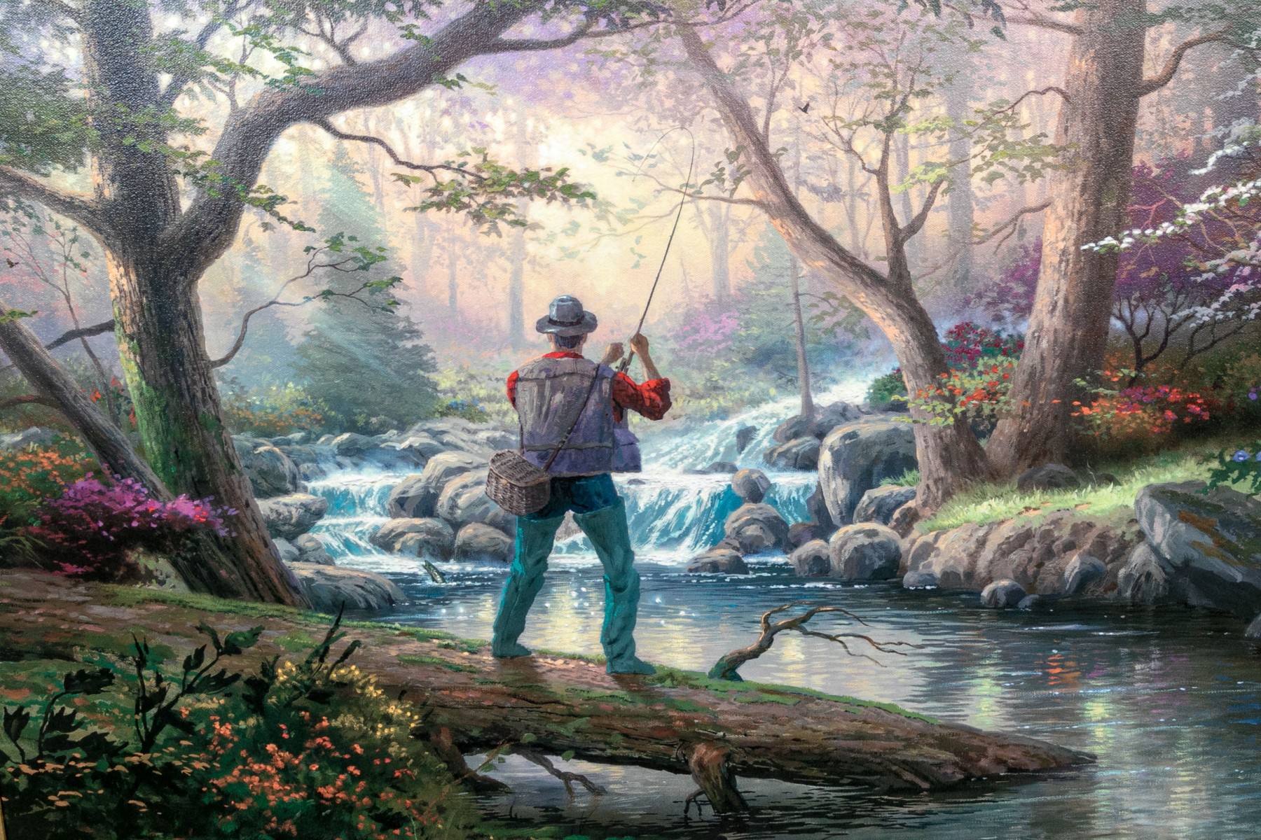 Thomas Kinkade (American [CA], 1958-2012) "It Doesn't Get Much Better" print on canvas depicting a lone fisherman standing on a fallen log over a serene stream overlooking a small rolling cascade. Pastel morning light bathes the scene in a warm glow, illuminating colorful bushes with purple, blue, and pink flowers.