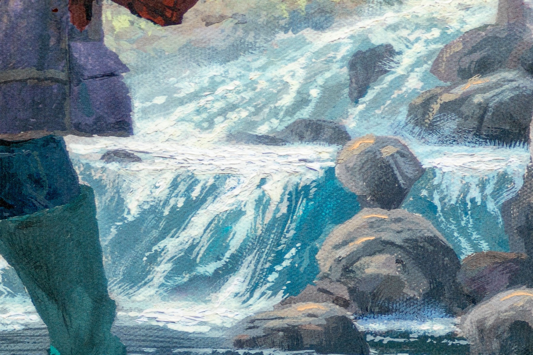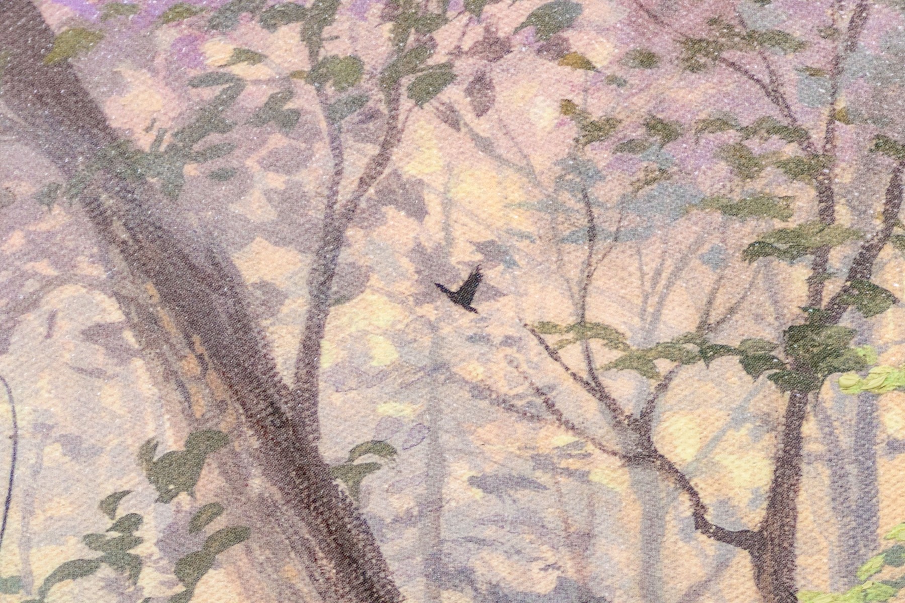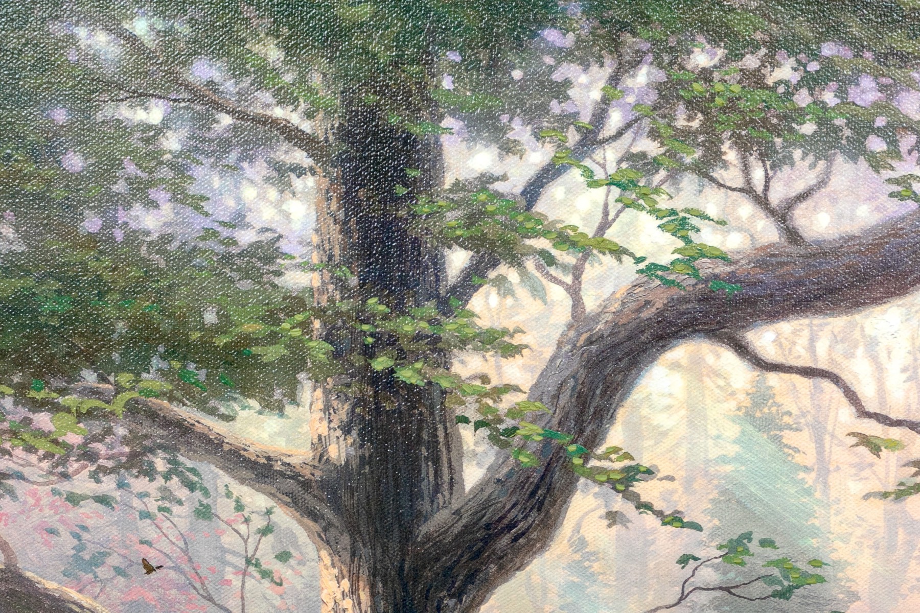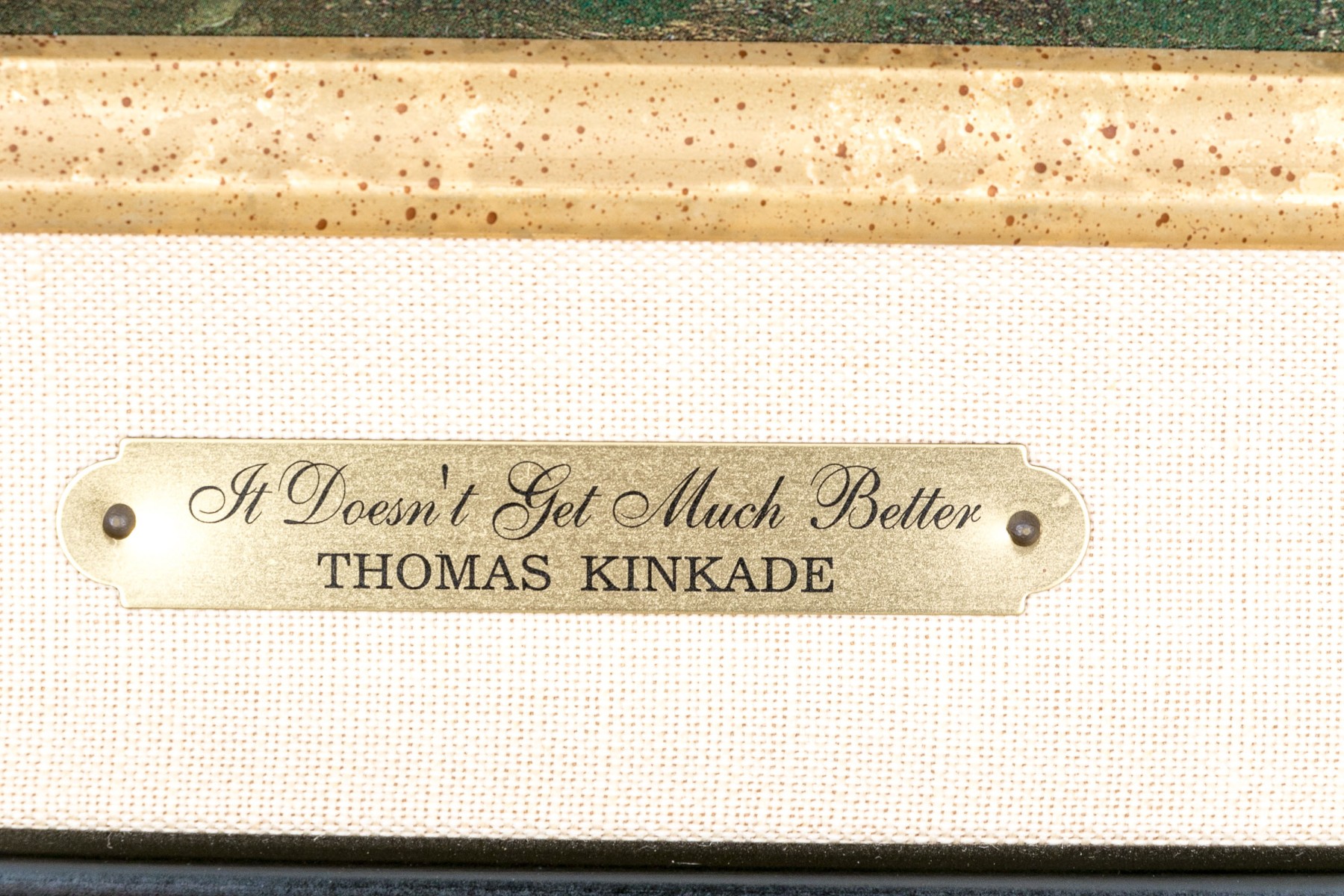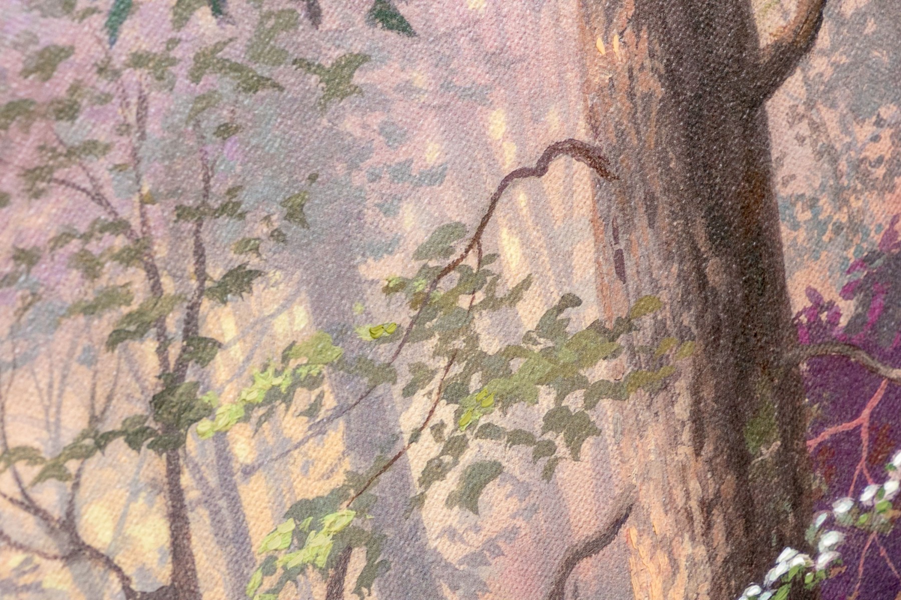 Thomas Kinkade (American [CA], 1958-2012) "It Doesn't Get Much Better" print on canvas depicting a lone fisherman standing on a fallen log over a serene stream overlooking a small rolling cascade. Pastel morning light bathes the scene in a warm glow, illuminating colorful bushes with purple, blue, and pink flowers.
