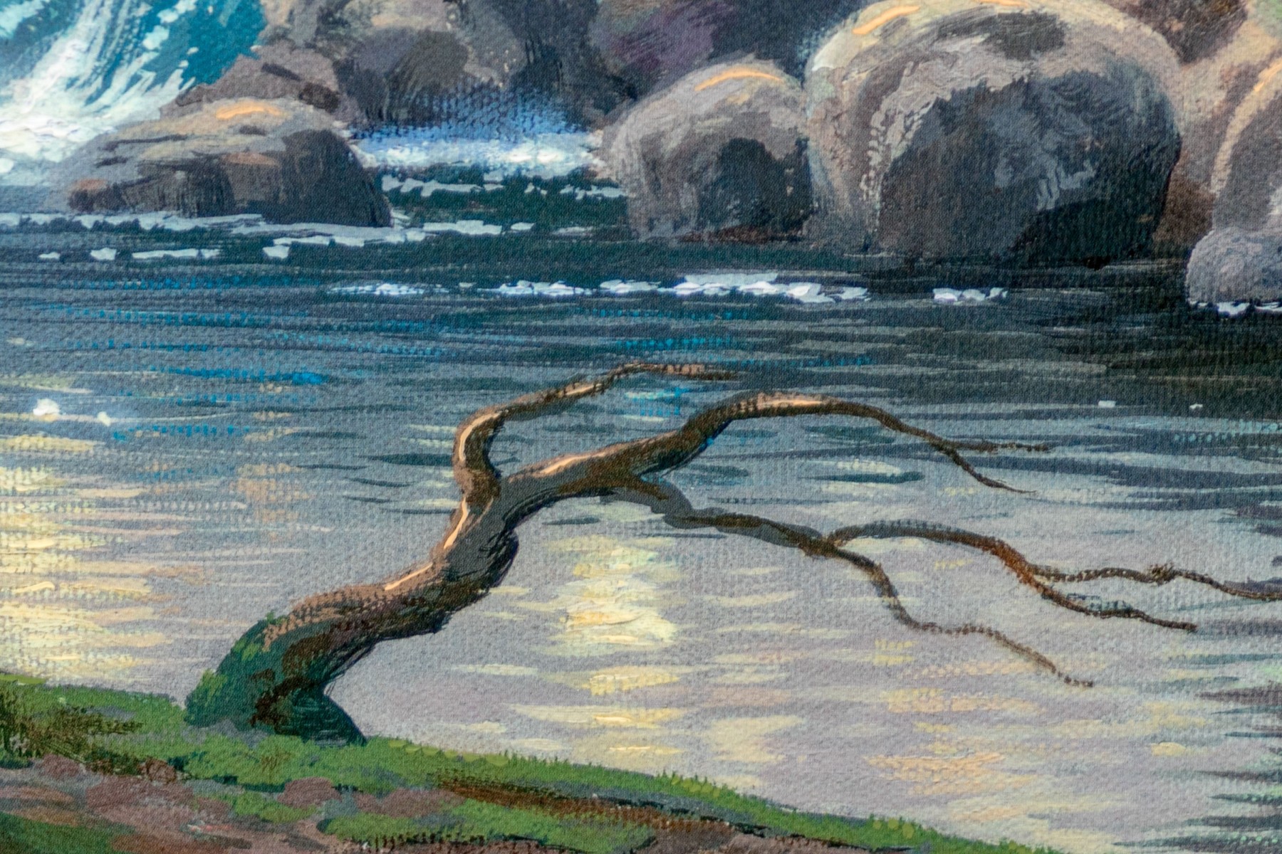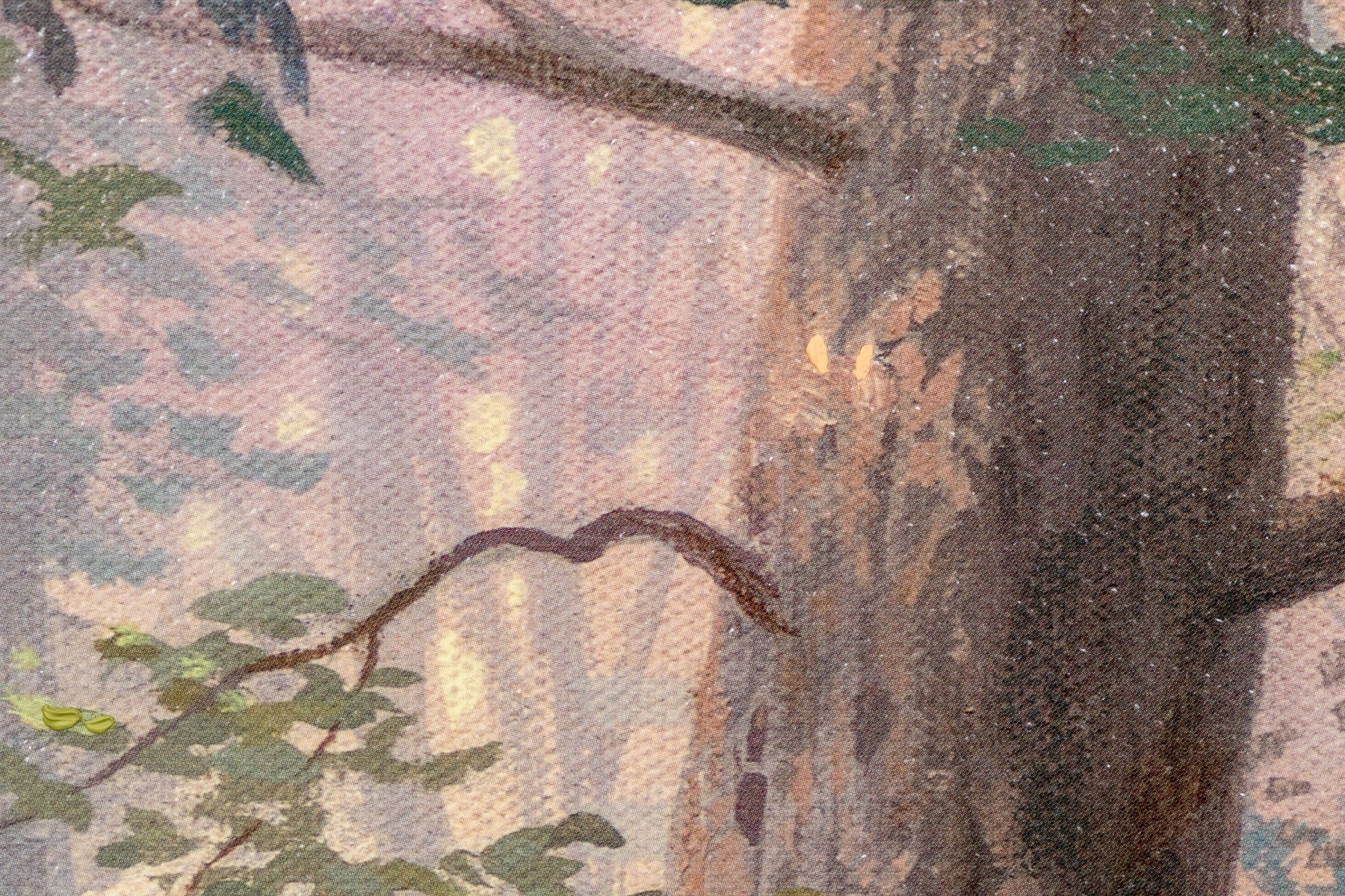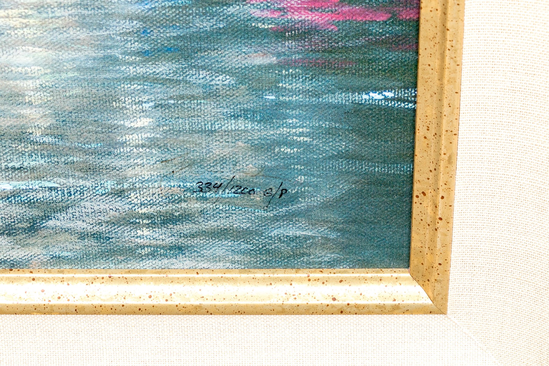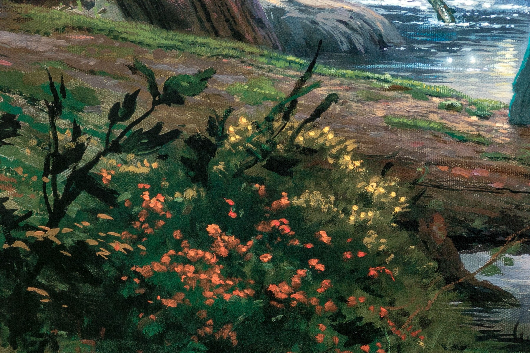 Thomas Kinkade (American [CA], 1958-2012) "It Doesn't Get Much Better" print on canvas depicting a lone fisherman standing on a fallen log over a serene stream overlooking a small rolling cascade. Pastel morning light bathes the scene in a warm glow, illuminating colorful bushes with purple, blue, and pink flowers.