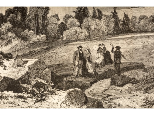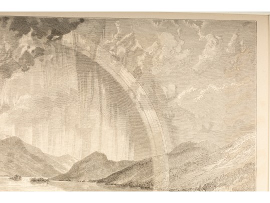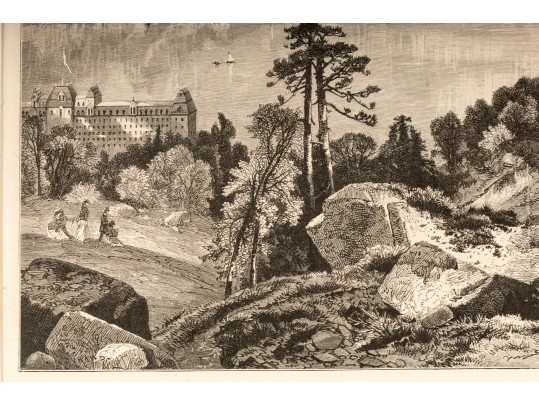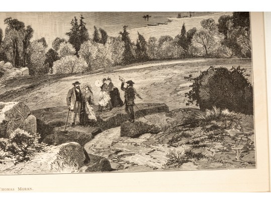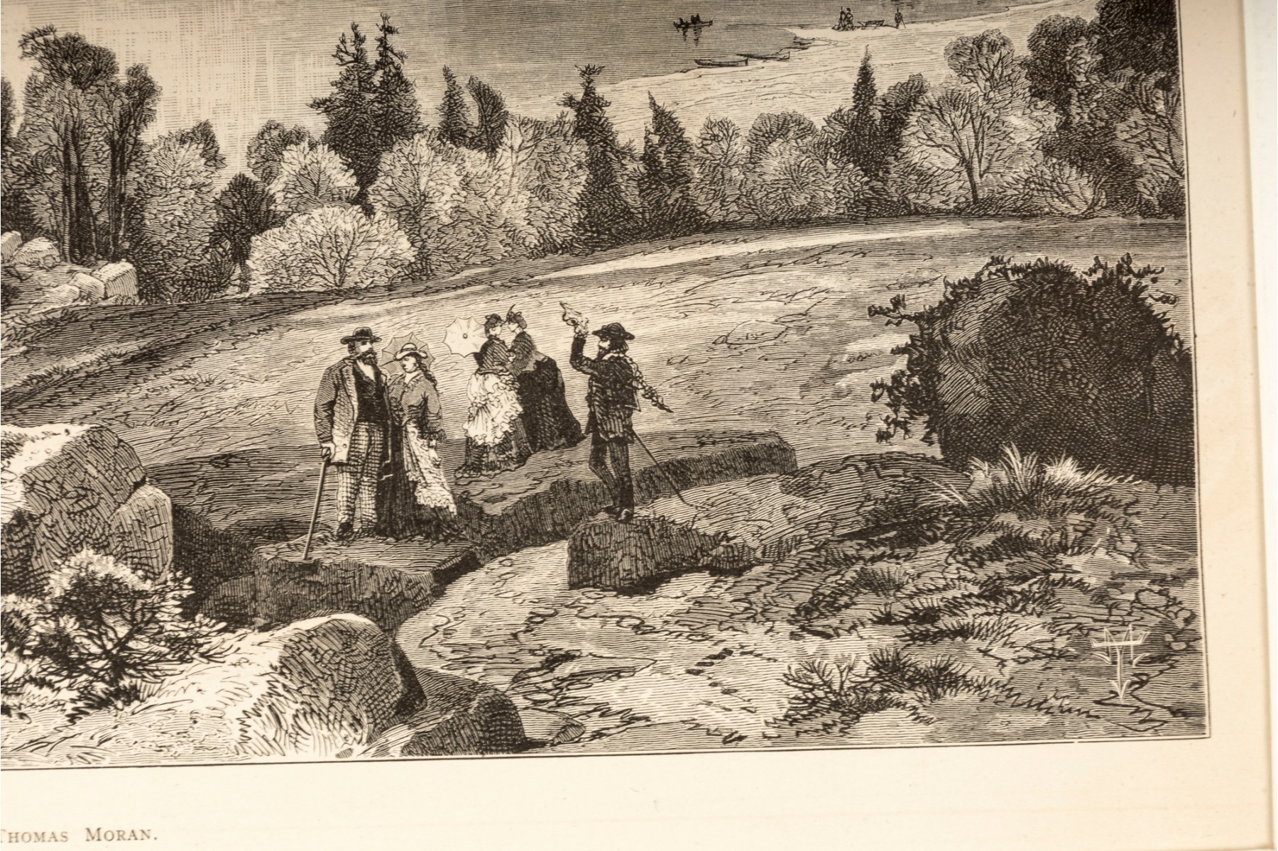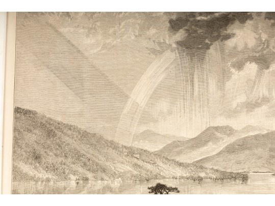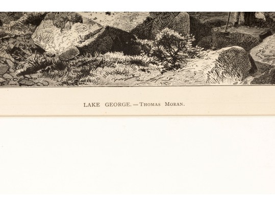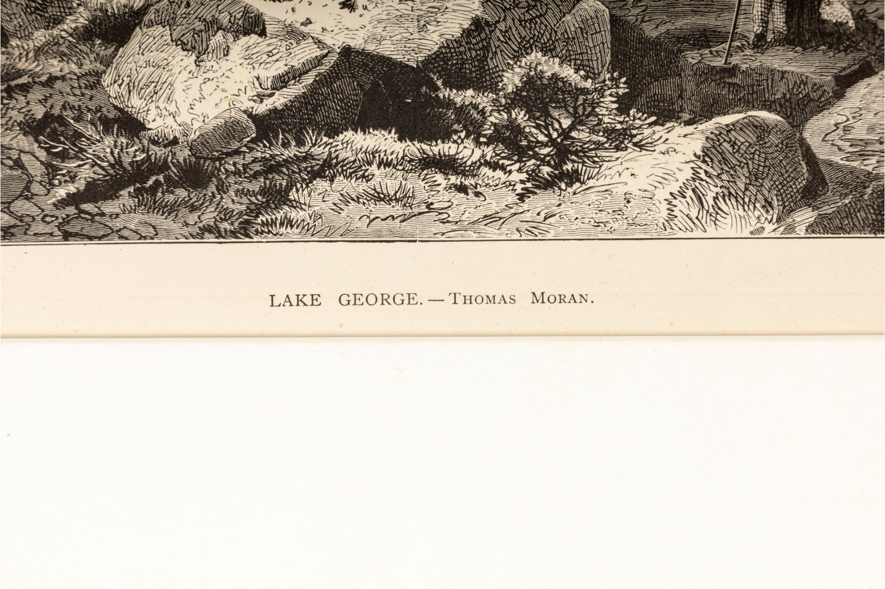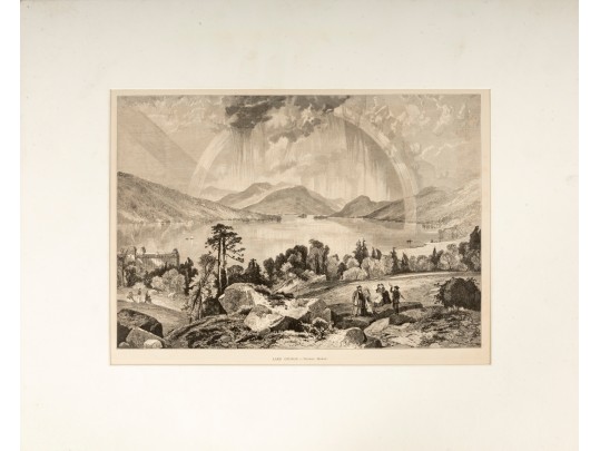Thomas Moran (American, 1837-1926) "Lake George" engraving depicting figures enjoying the landscape of the titled lake. Figures in the foreground and midground gather on gently rolling hills surrounded by lush trees and large rocks, along with a large building overlooking the calm lake. The lake is encircled by the hills, with a large, arching rainbow emerging from dark clouds overhead that adds an almost ethereal quality to the landscape.