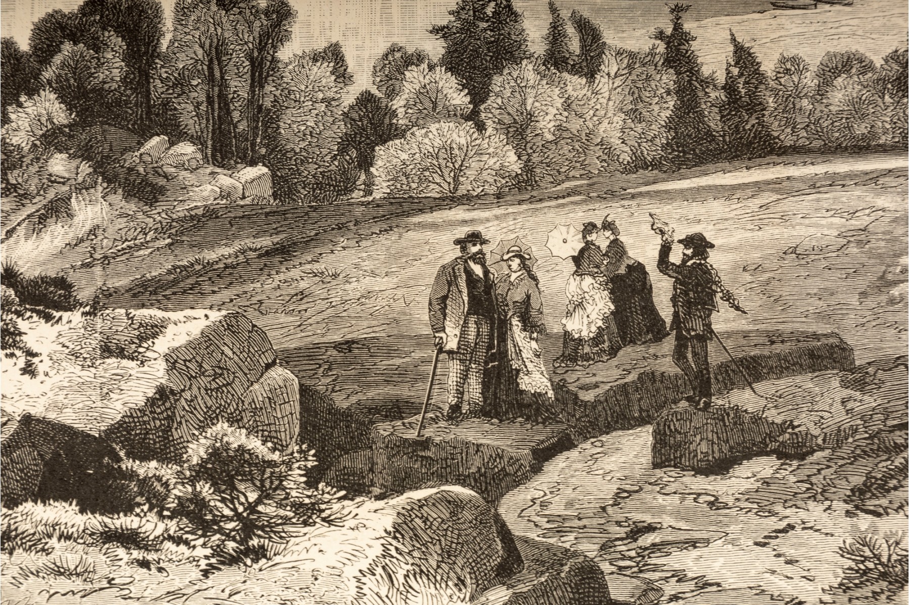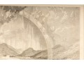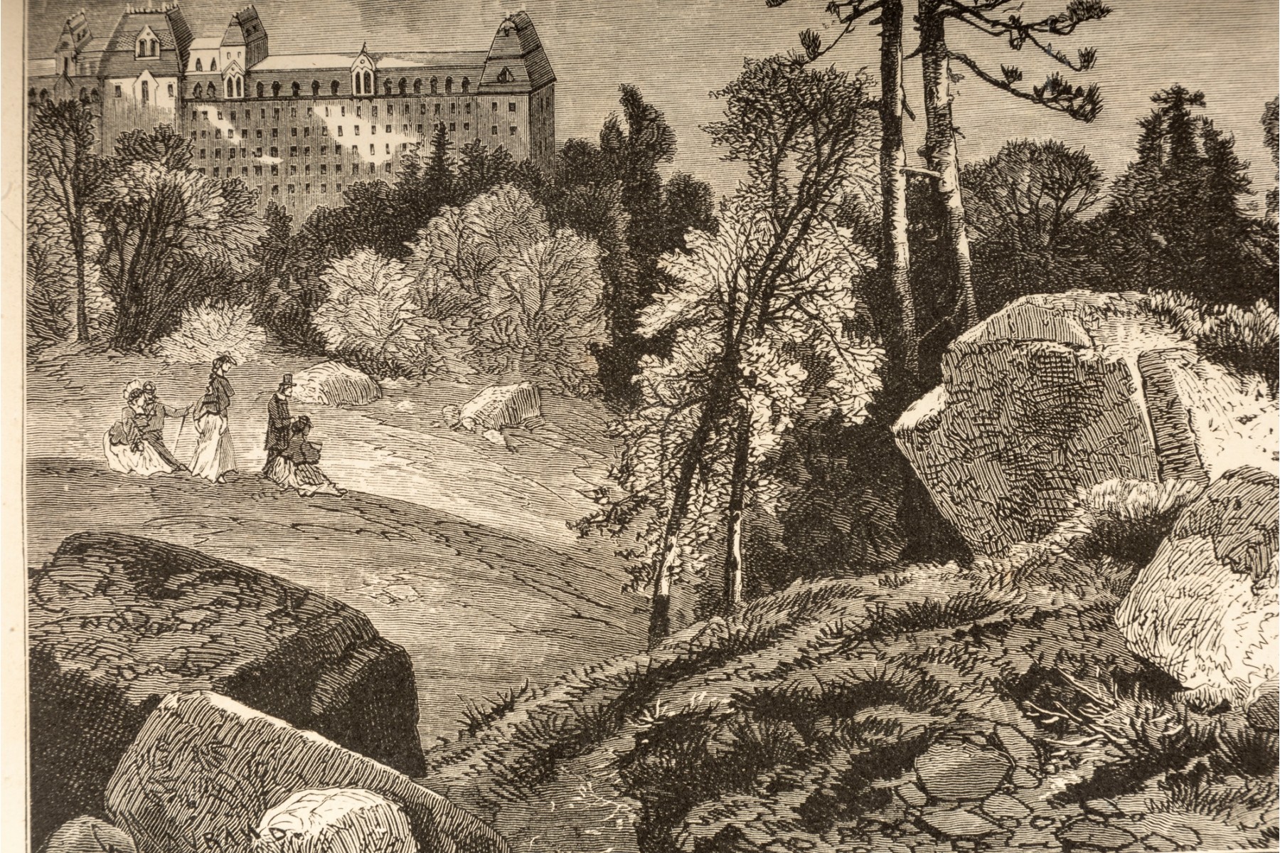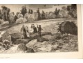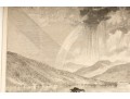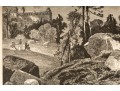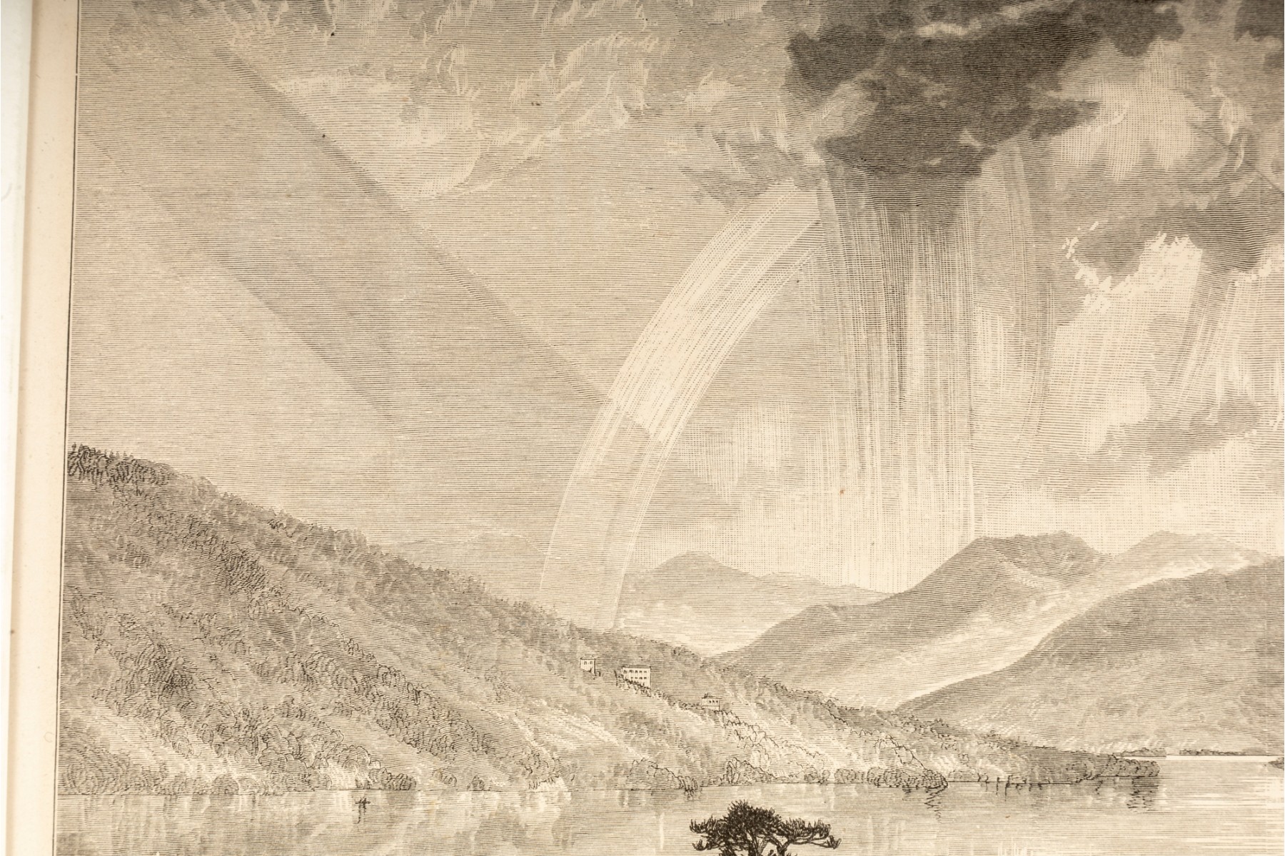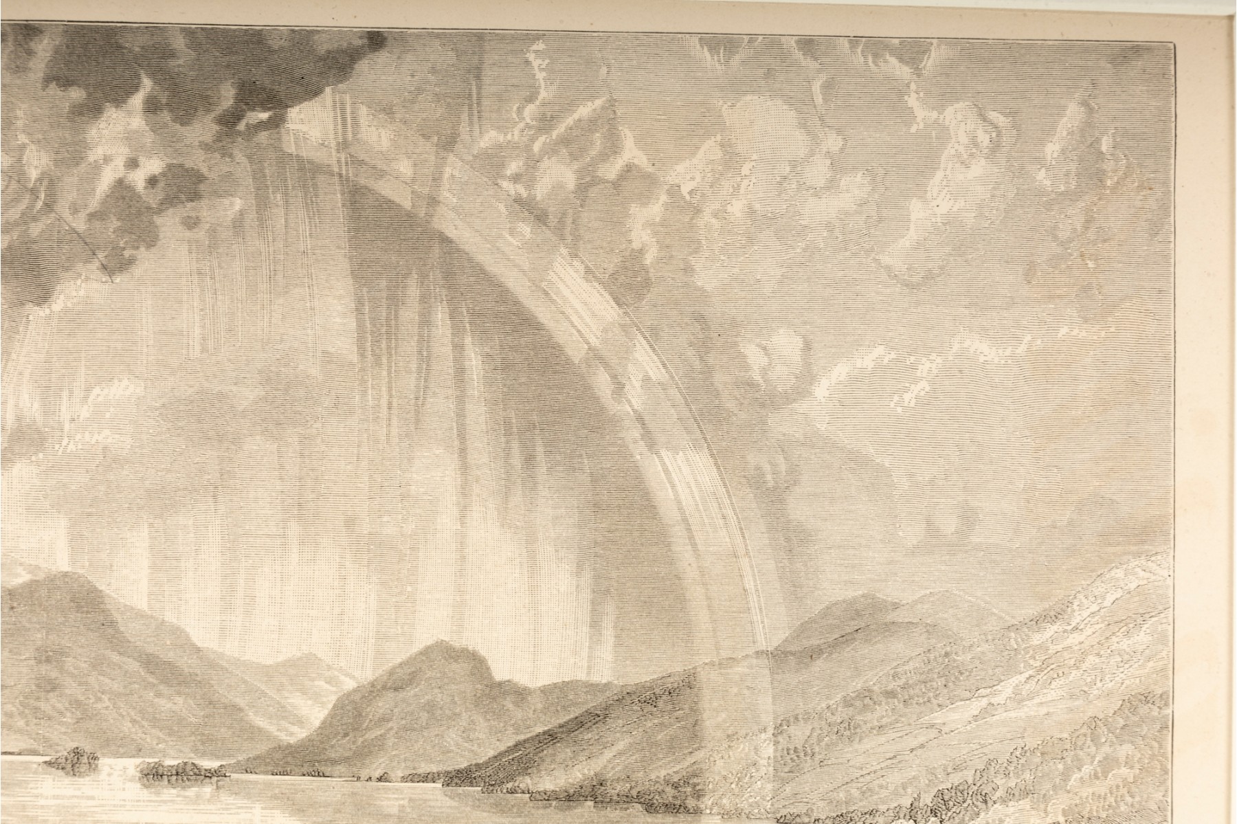 Thomas Moran (American, 1837-1926) "Lake George" engraving depicting figures enjoying the landscape of the titled lake. Figures in the foreground and midground gather on gently rolling hills surrounded by lush trees and large rocks, along with a large building overlooking the calm lake. The lake is encircled by the hills, with a large, arching rainbow emerging from dark clouds overhead that adds an almost ethereal quality to the landscape.