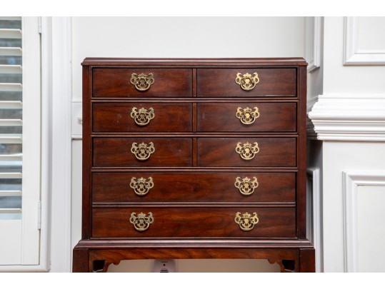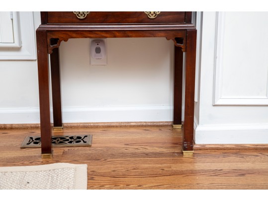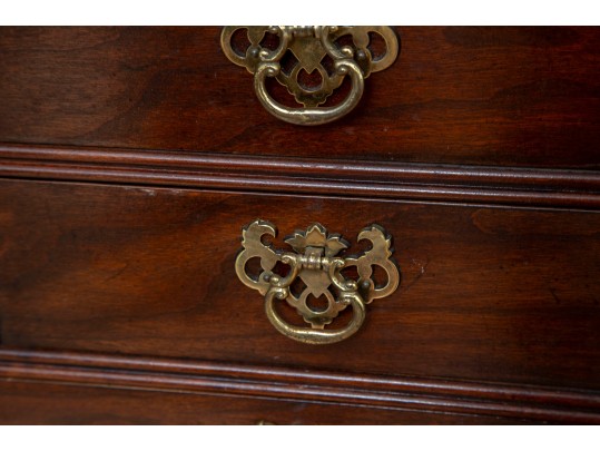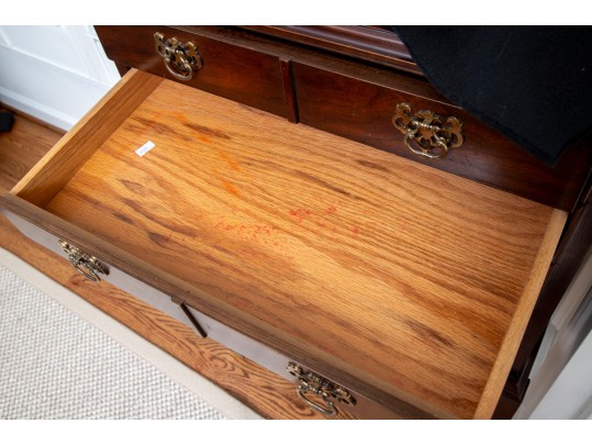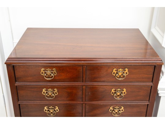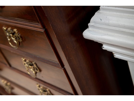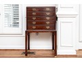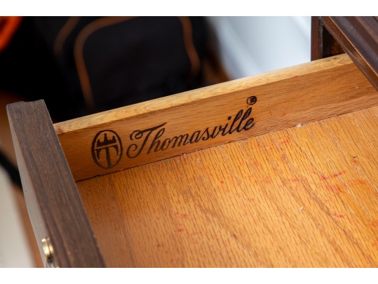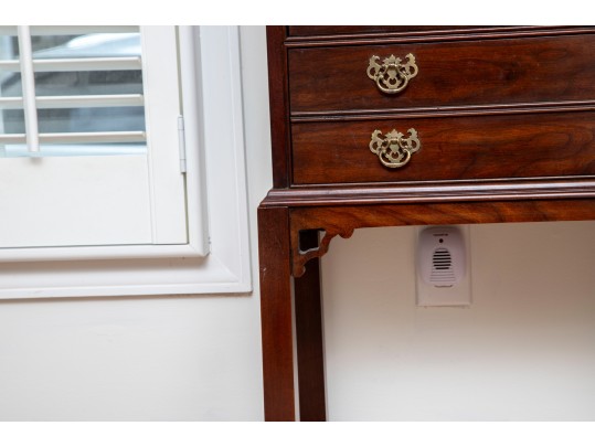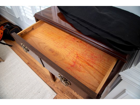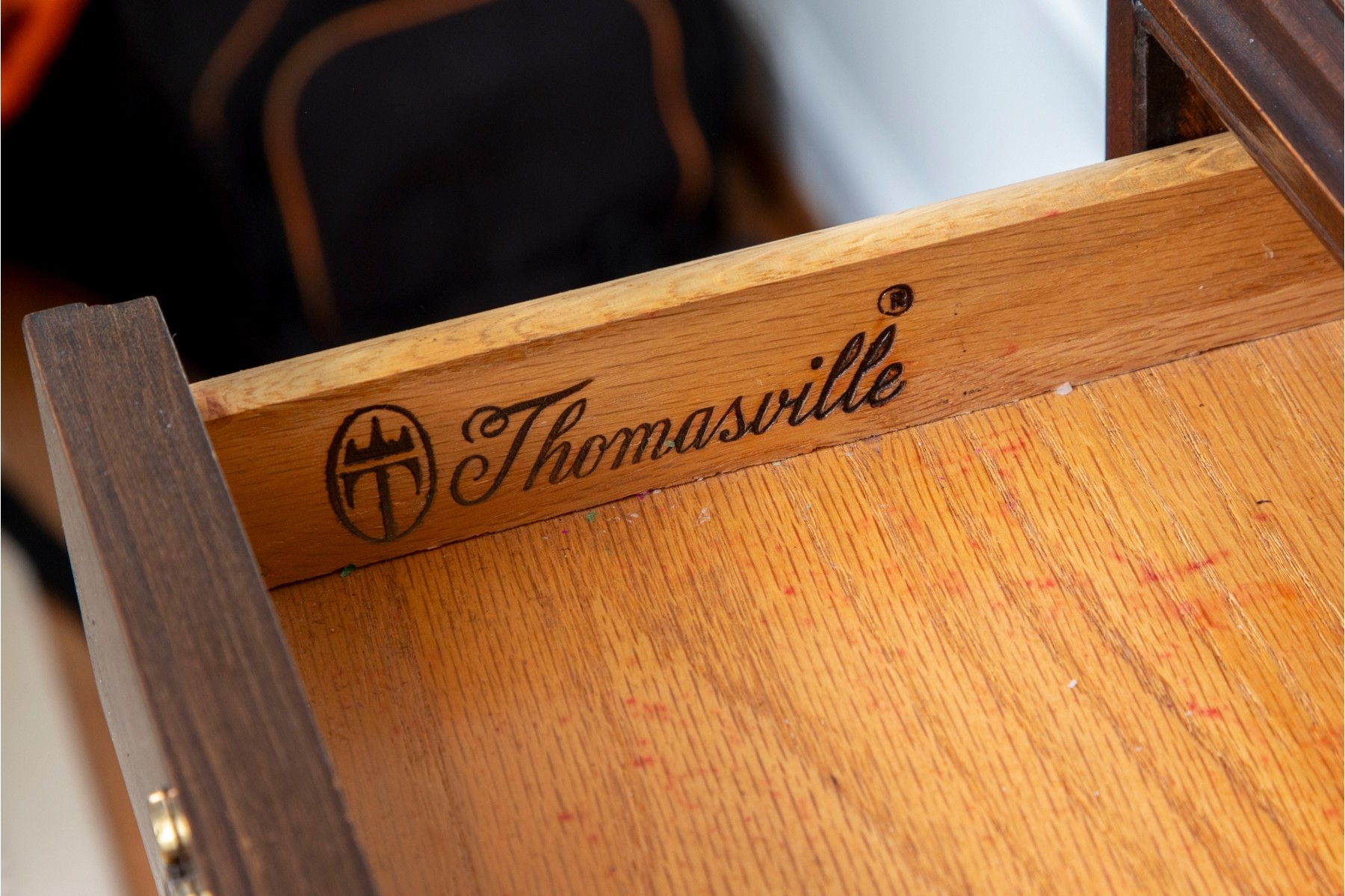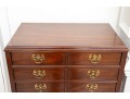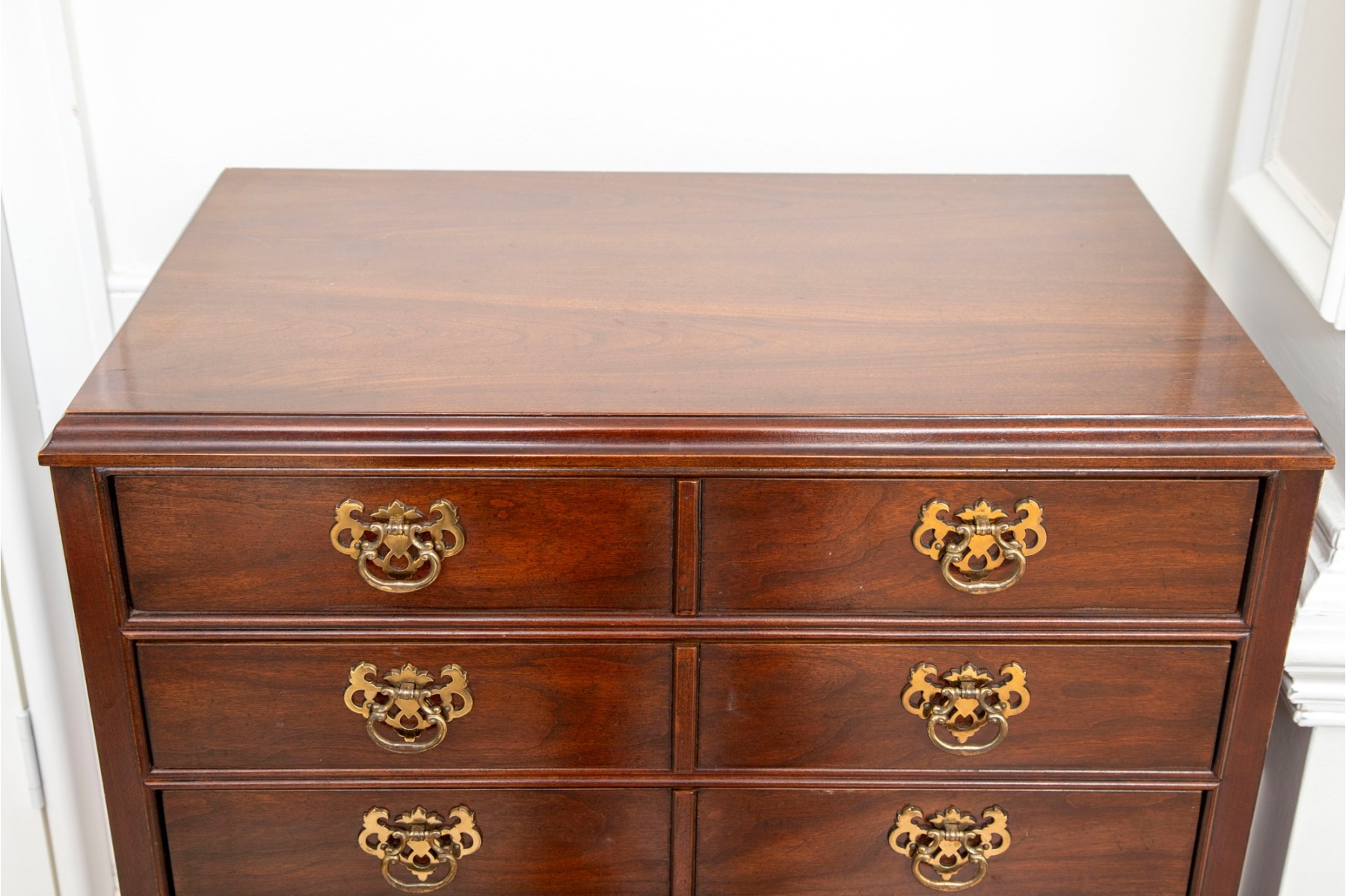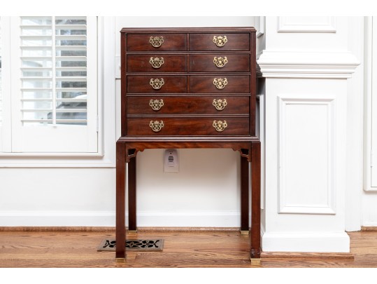 A handsome Colonial Revival silver chest by Thomasville Furniture, crafted with classic elegance and timeless appeal. Features rich wood construction, multiple drawers for organized storage, and traditional brass hardware set over exquisite mahogany veneers. Produced in the mid 20th century.