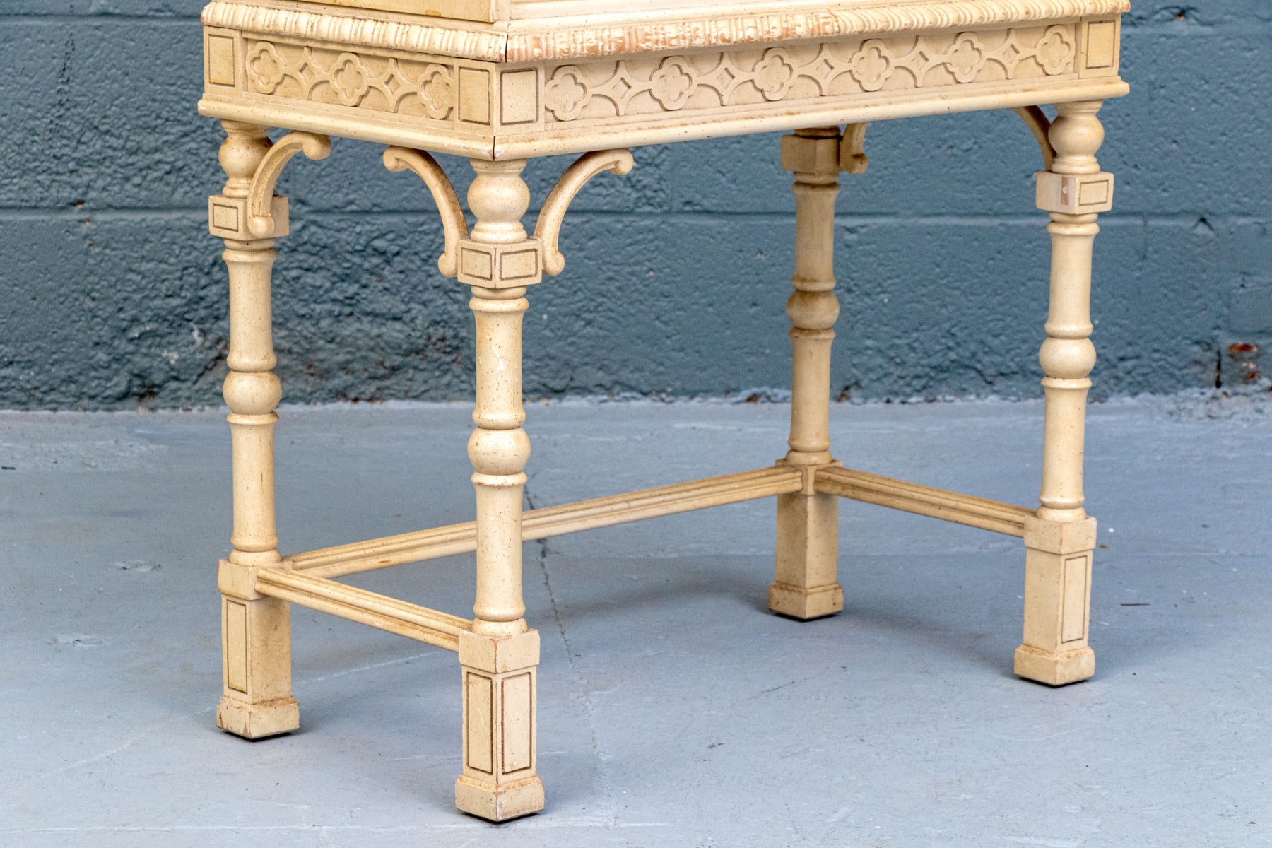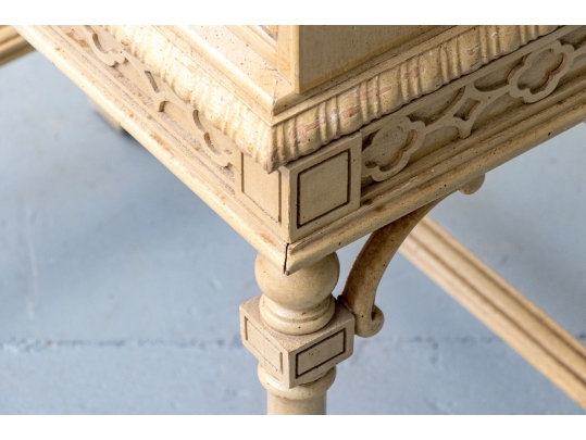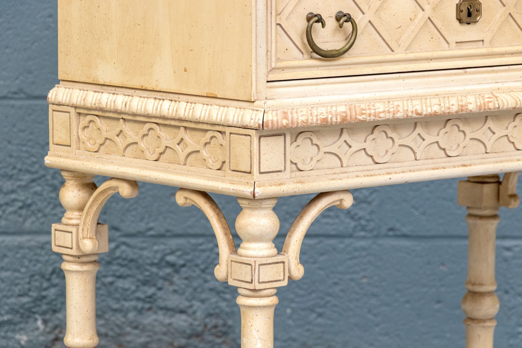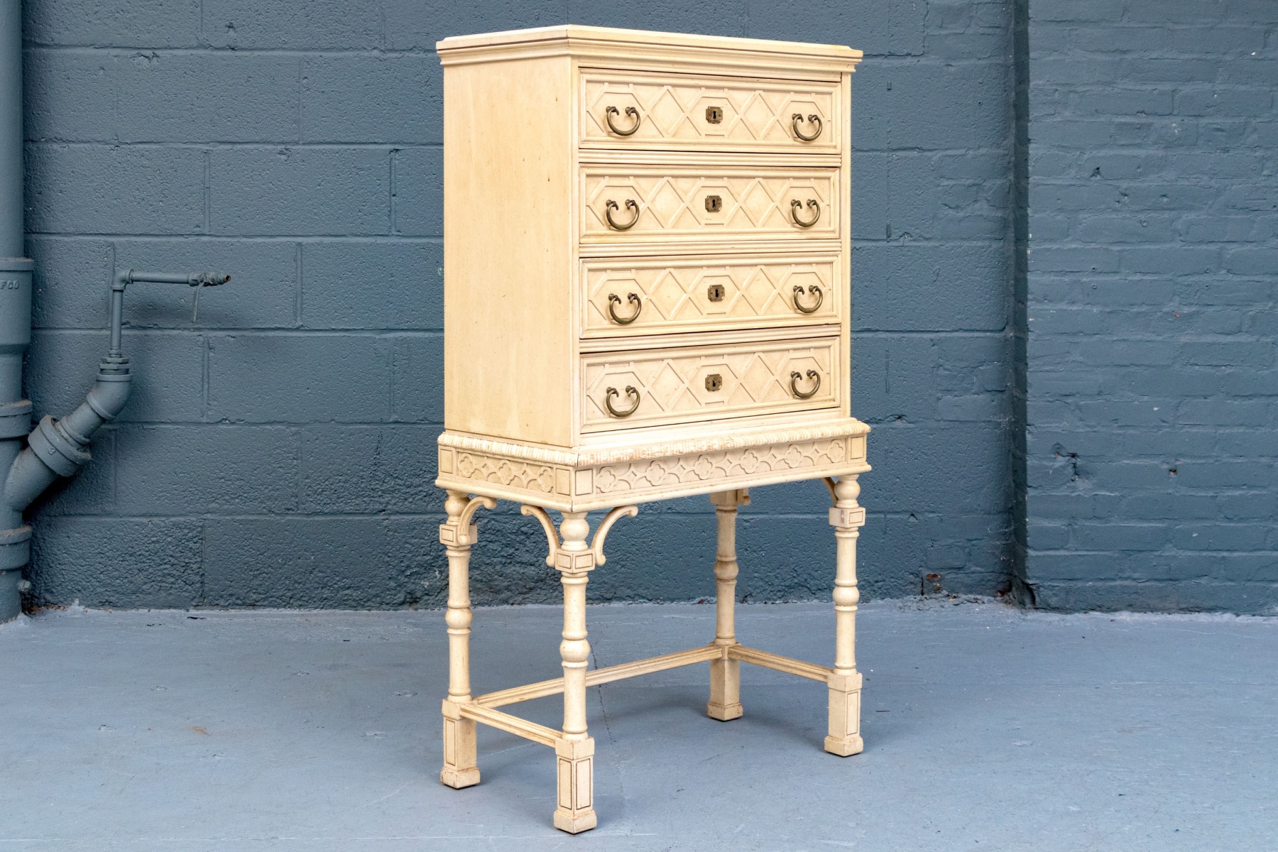 A Thomasville Furniture diminutive tallboy chest from their Allegro Collection with four raised lattice decorated drawers. The chest with metal hardware and escutcheon plates, hardboard back and gadrooned carved trim. Raised on four turned legs with fret work above and conjoined with a three-sided stretcher.