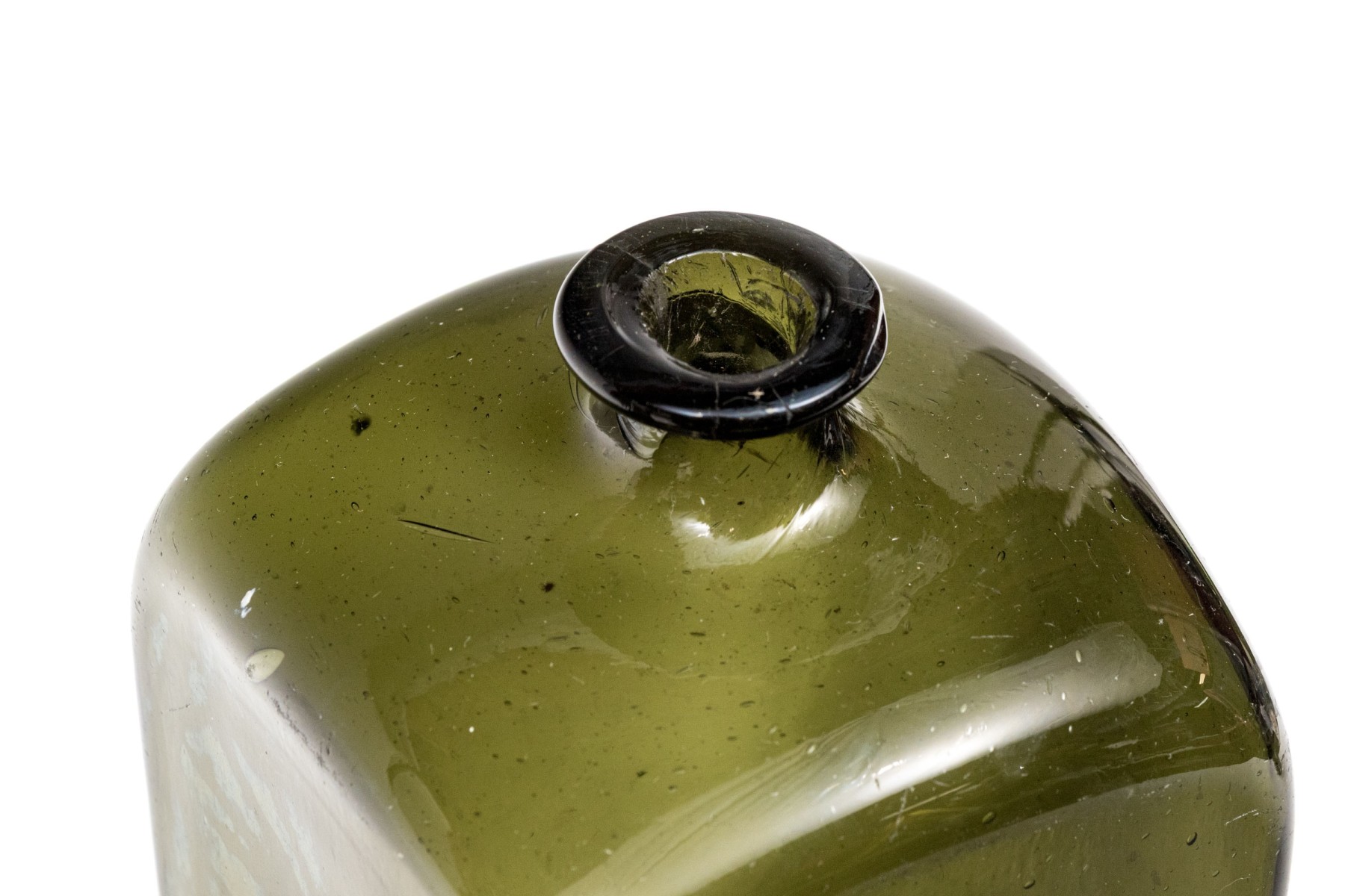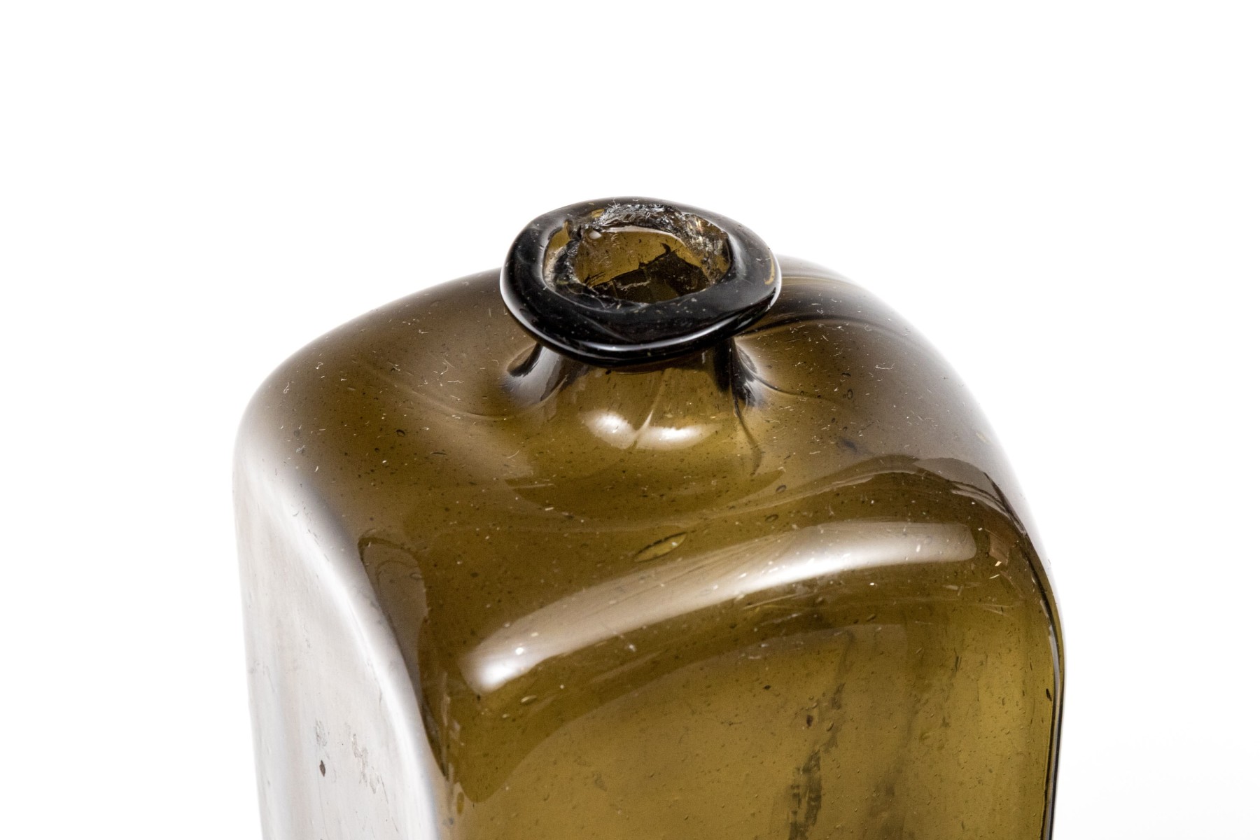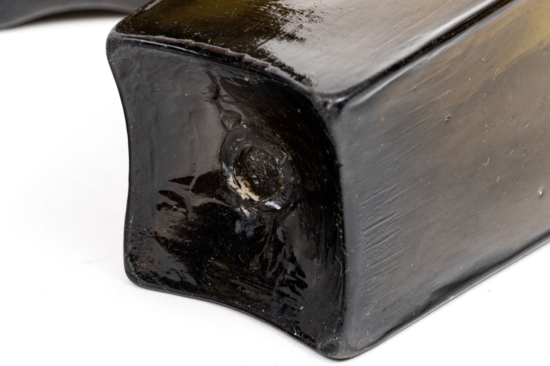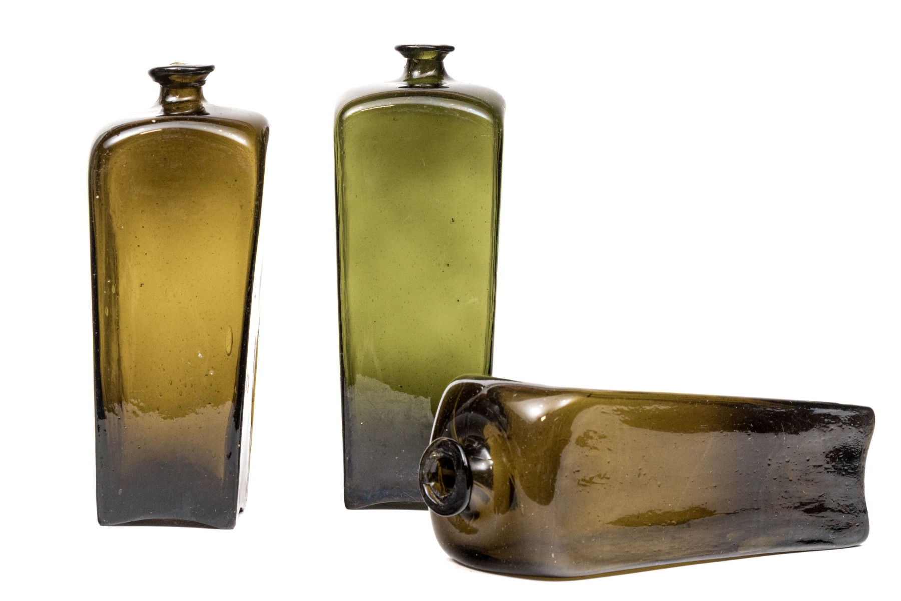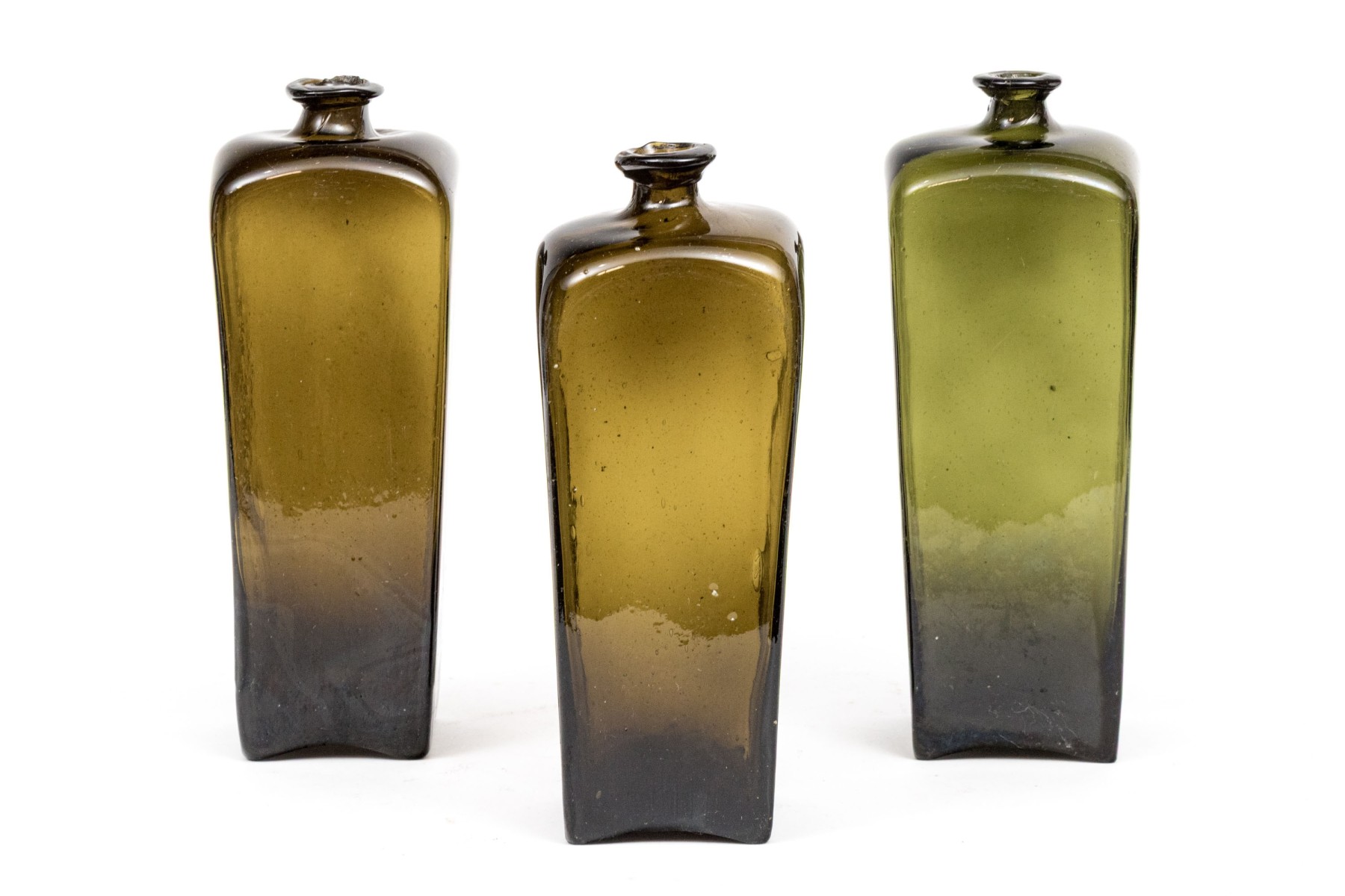 A wonderful trio of antique glass gin bottles with slightly tapered square forms. Each stands on four short feet. Each has a slightly domed top with thin mouth neck with flared mouth rim.
