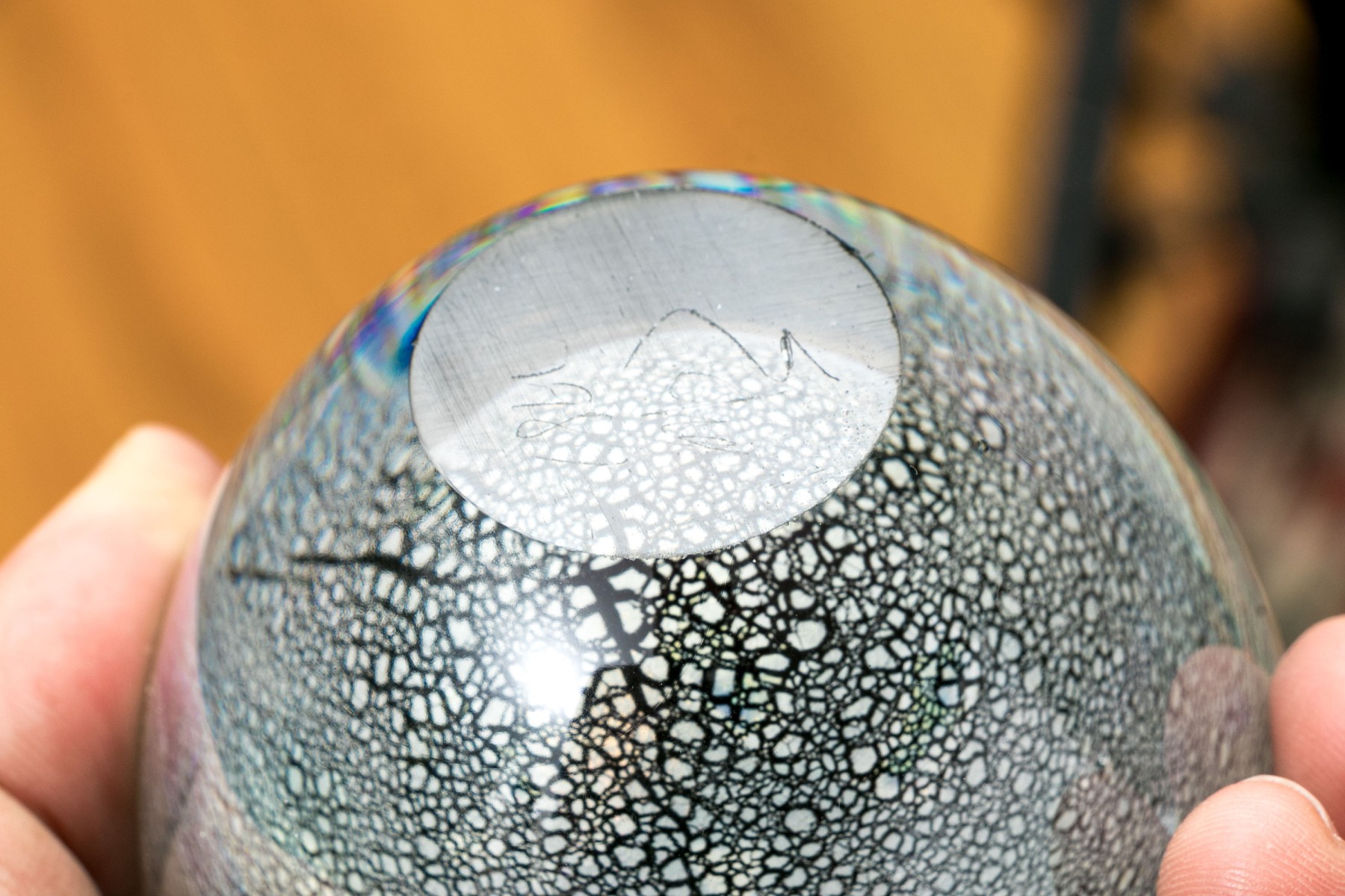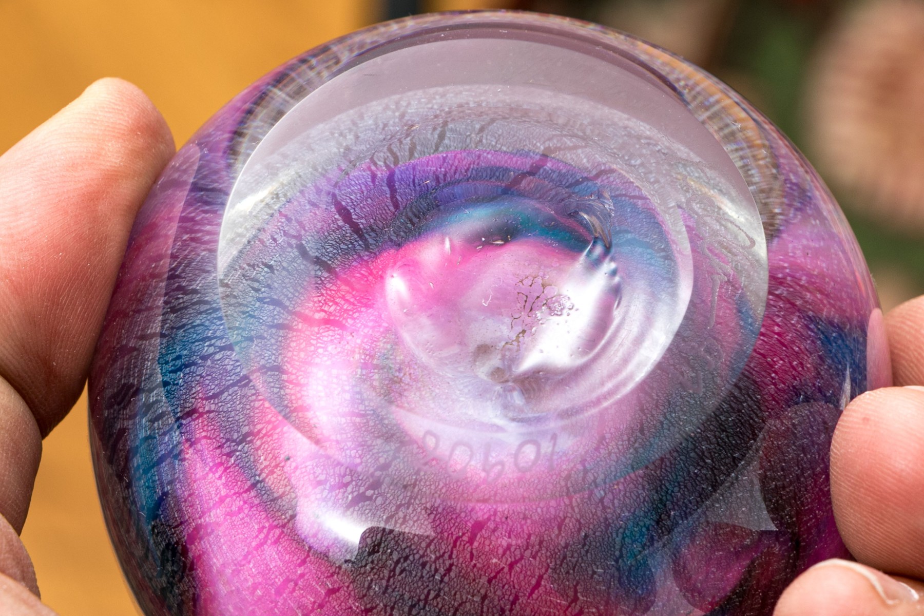 A pink and gray swirled one by Feller dated 87, with a stopper