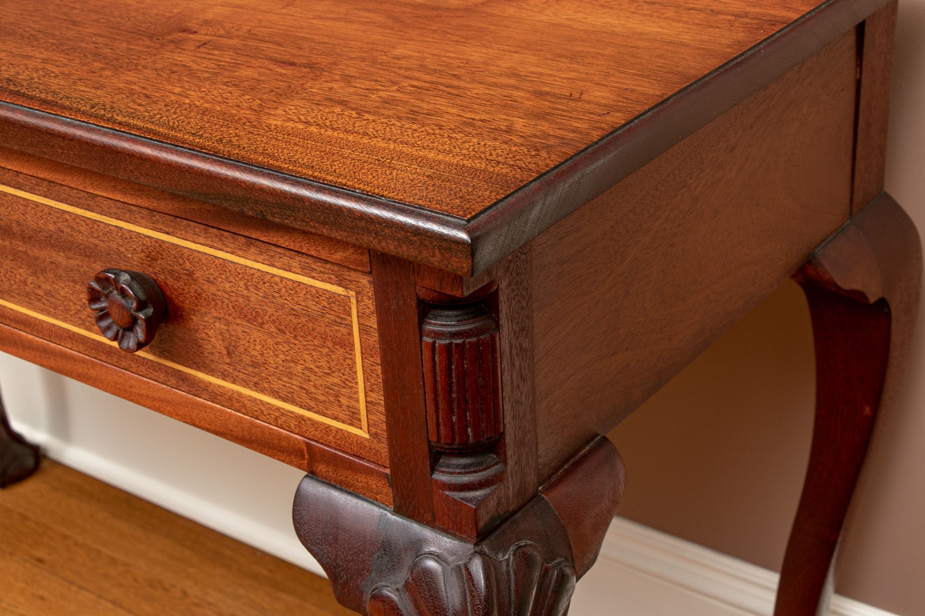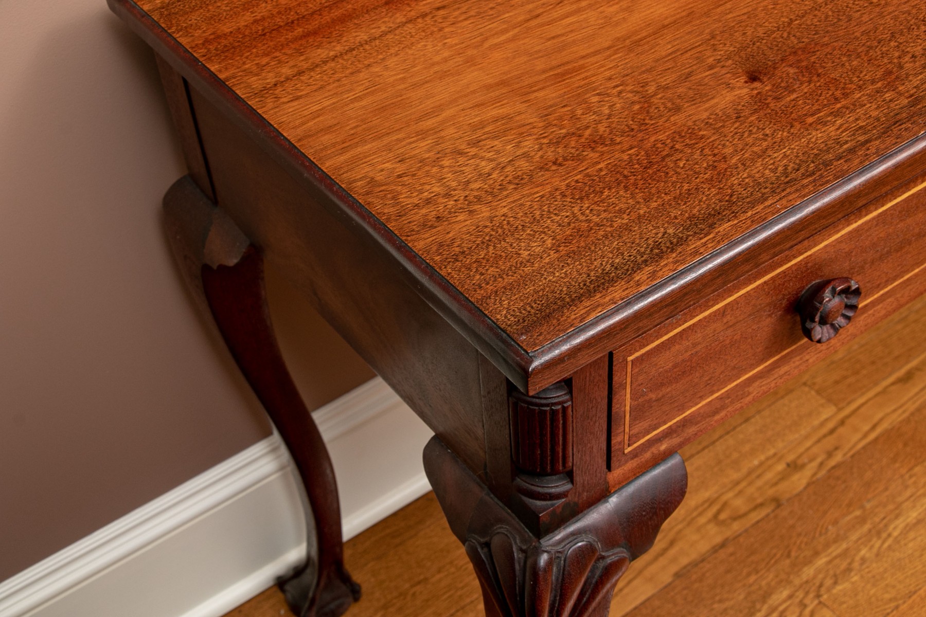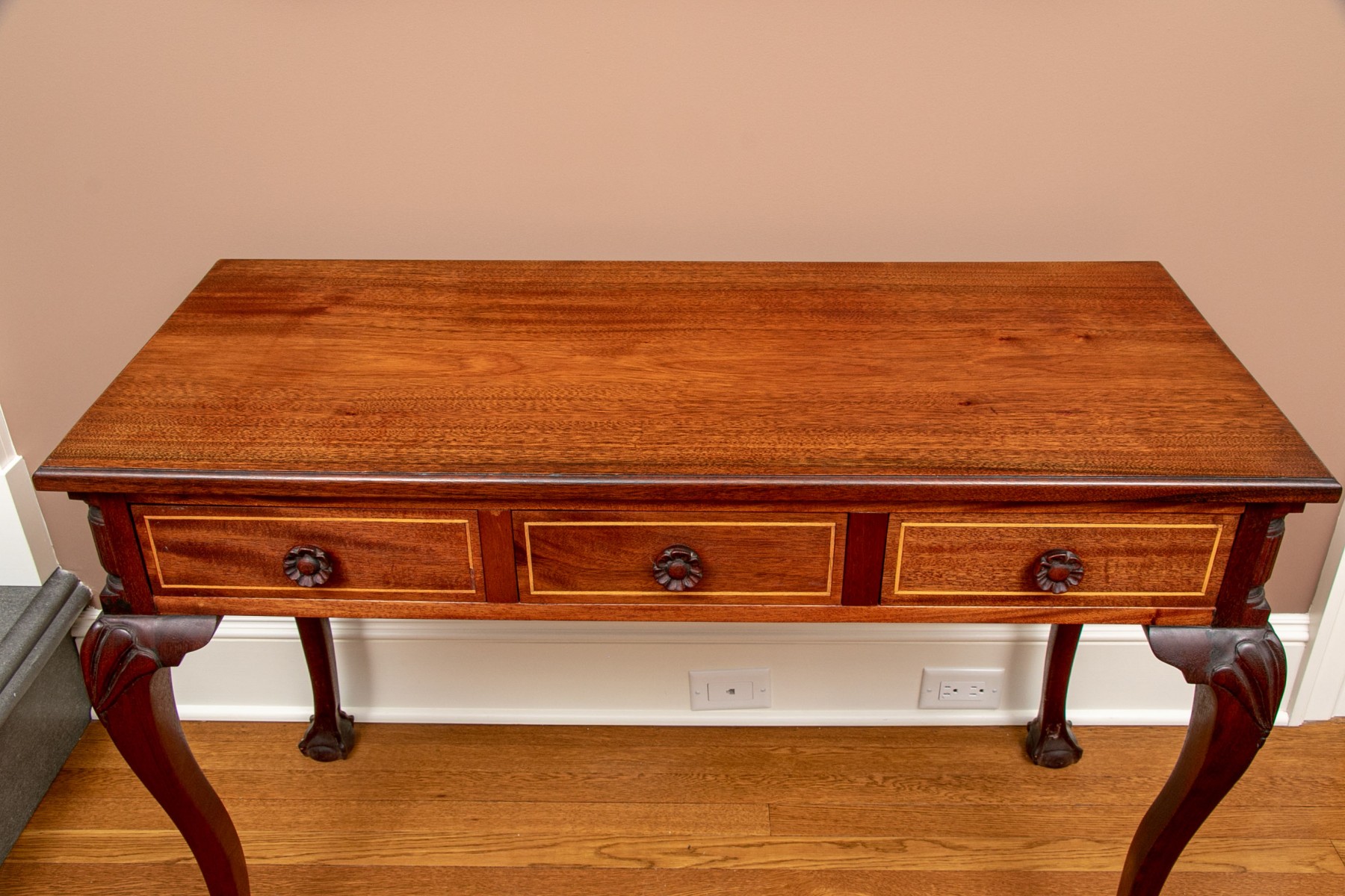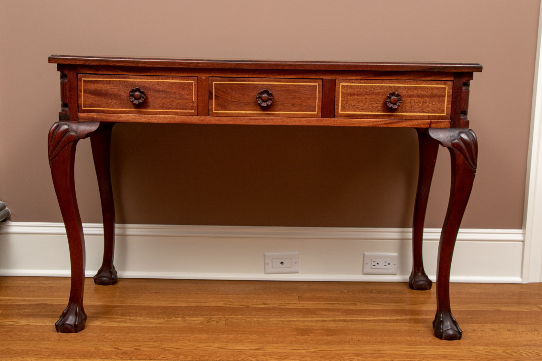 Console table with contrasting woods, three drawers with string inlay, cabriole legs with carved shell motifs, resting on ball and claw feet.