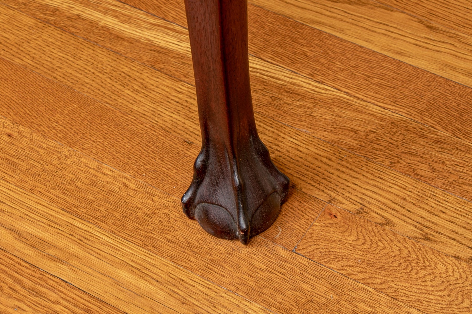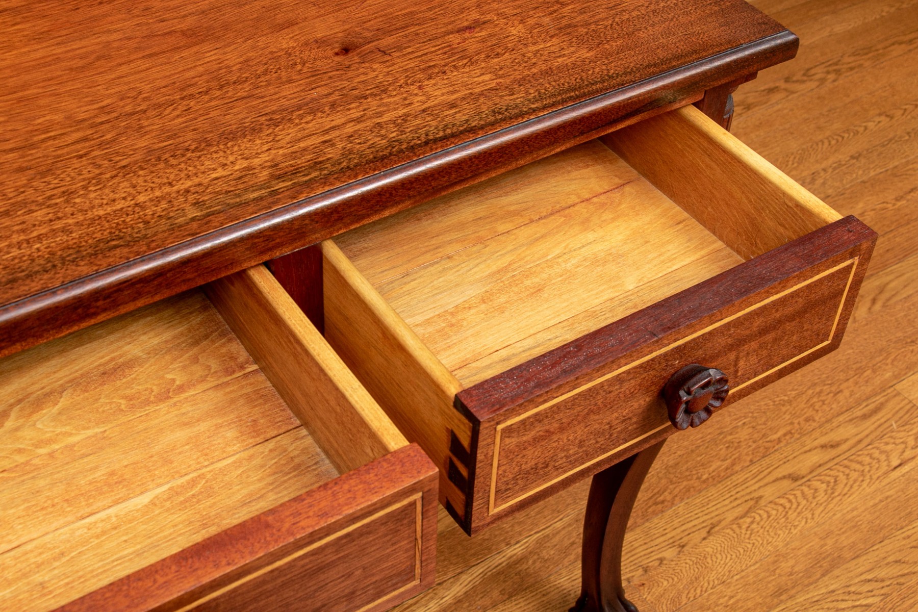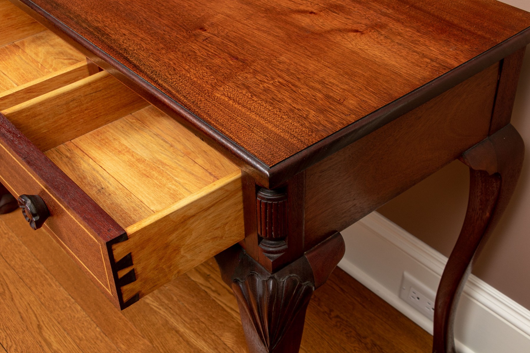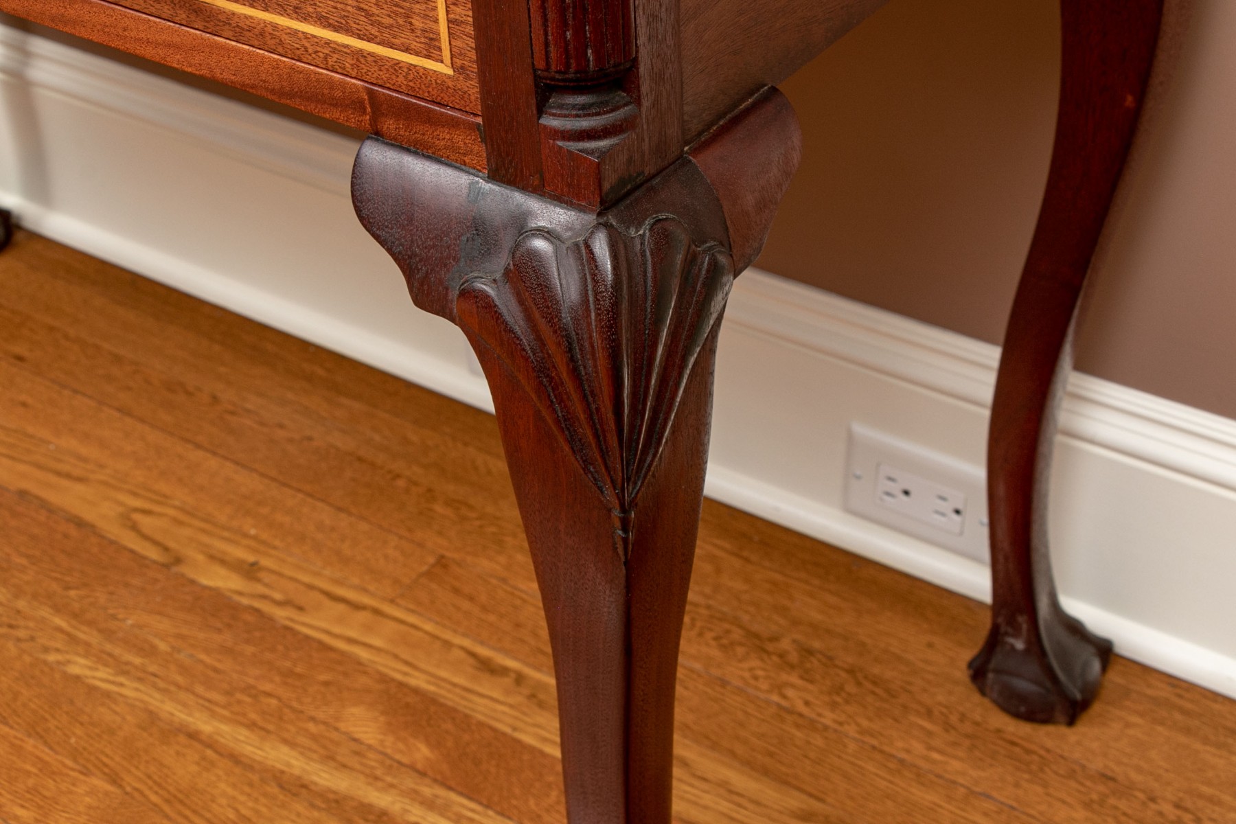 Console table with contrasting woods, three drawers with string inlay, cabriole legs with carved shell motifs, resting on ball and claw feet.