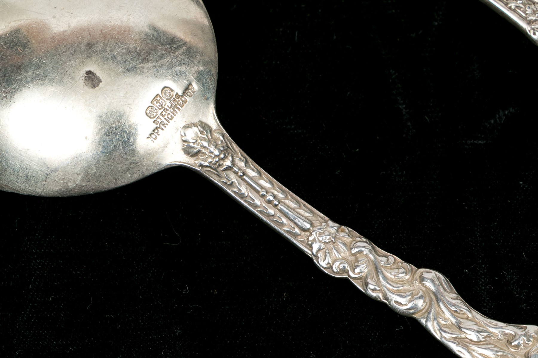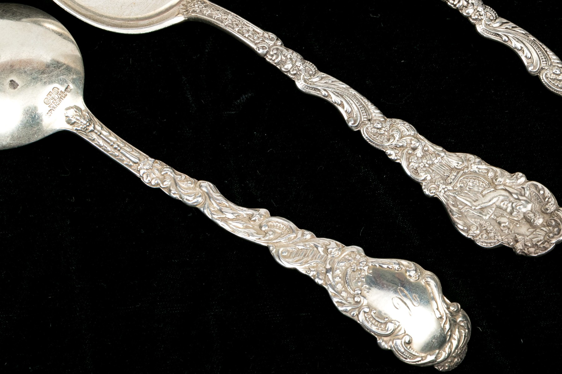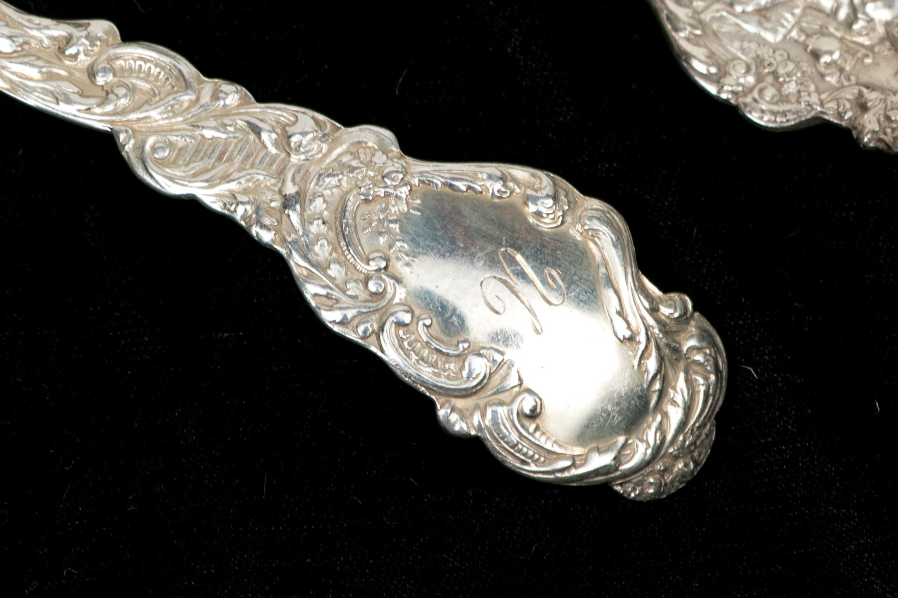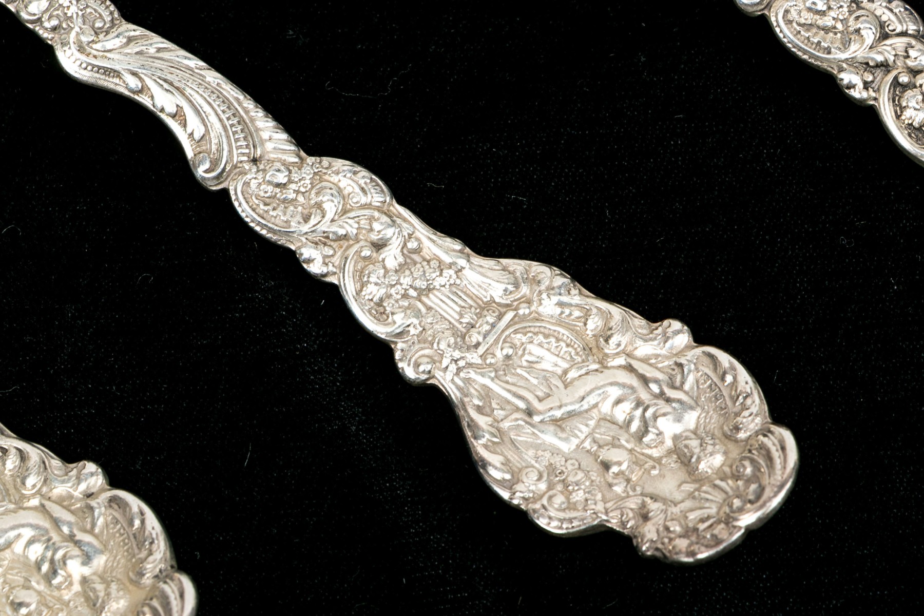 One of the many figural relief designs in the pattern inspired by ancient Greek mythology and introduced in 1895 by Gorham. These spoons feature a female nude seated next to a vase on stand.