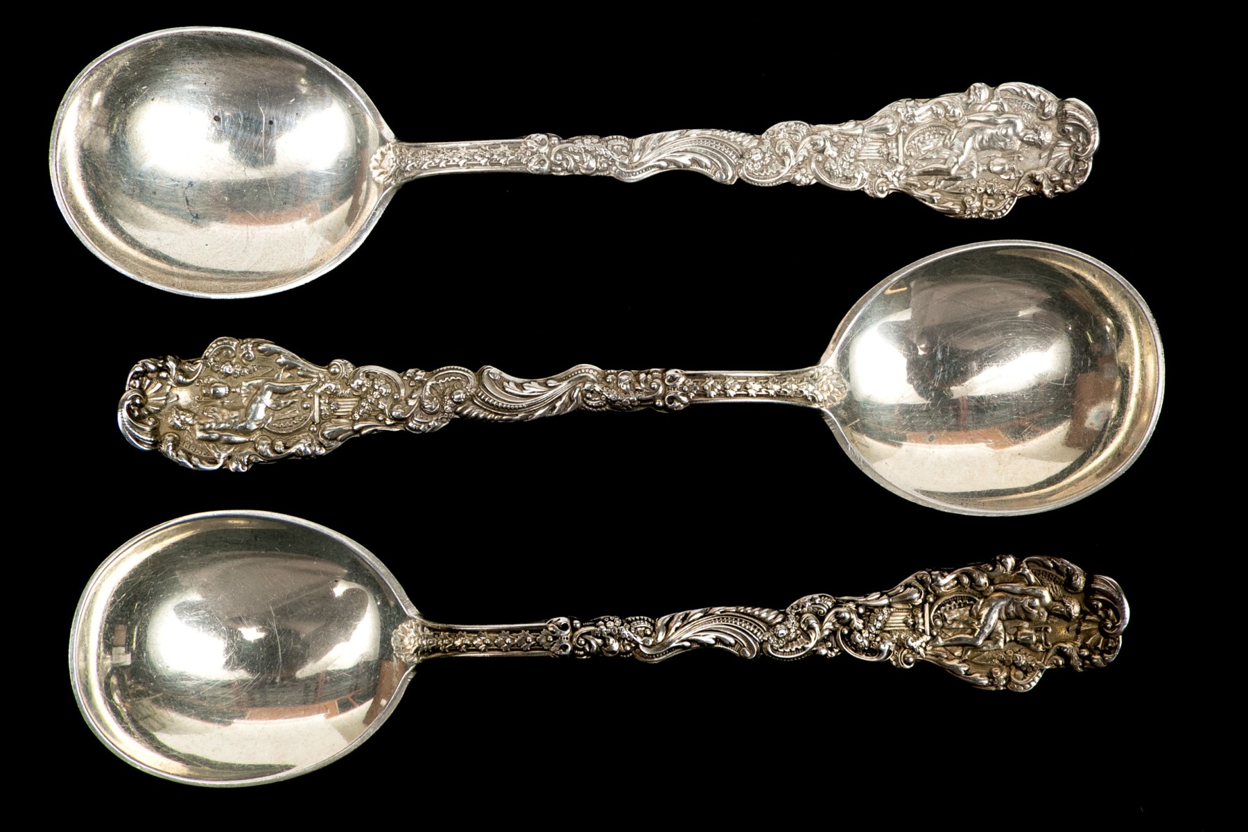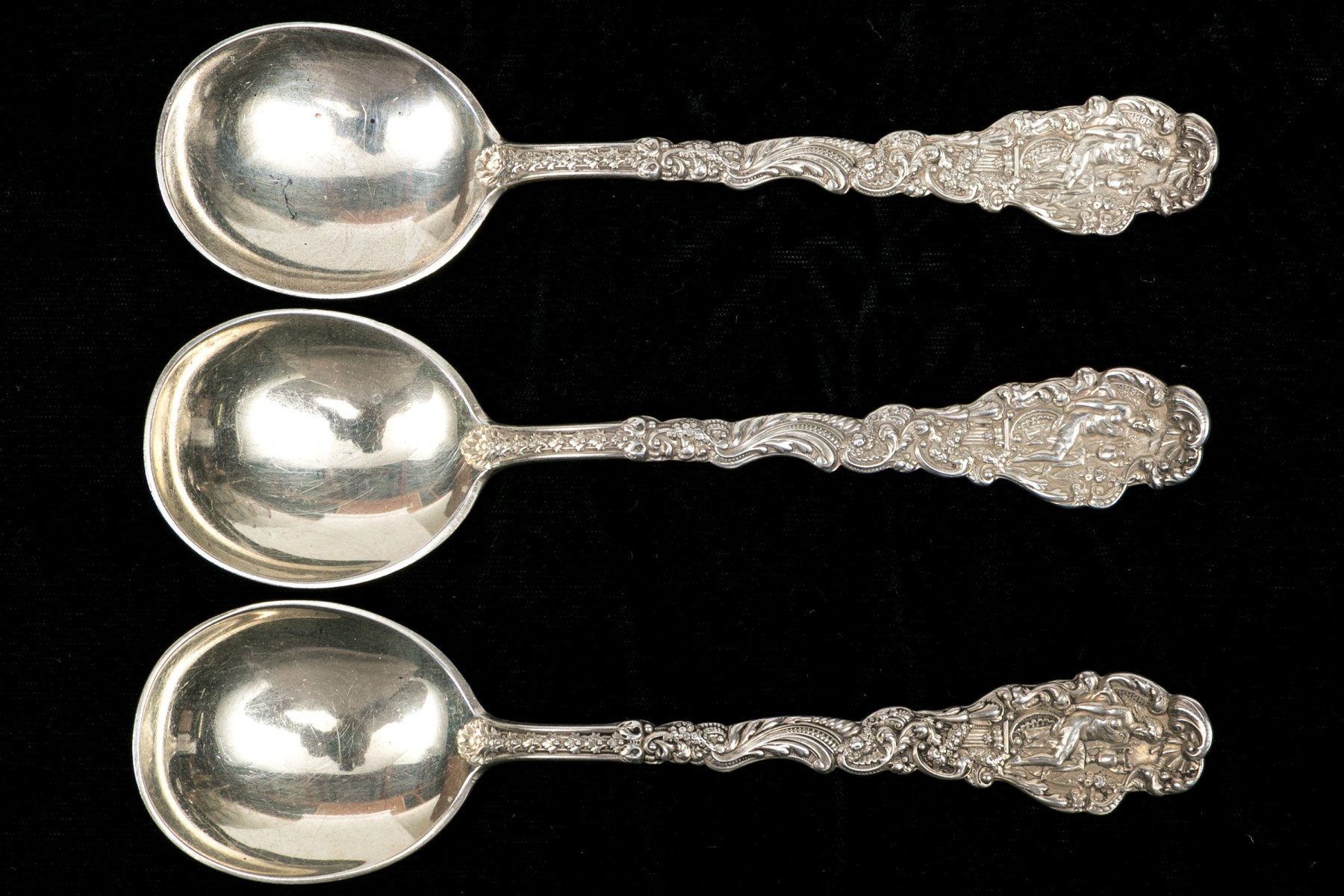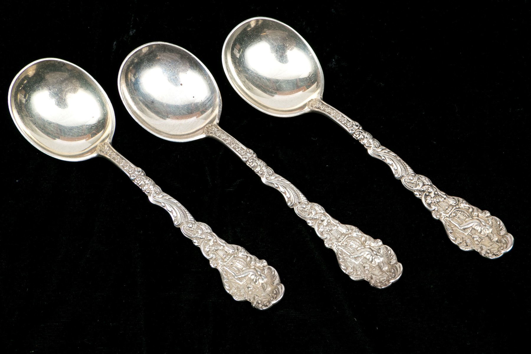 Three Gorham Sterling Silver "Mythologique" Soup Spoons, 6.195 Troy Ozs. #331124. Black Rock Galleries provides high end estate liquidation services through online estate auctions and a 50,000 sq ft designer showroom. estate liquidator, estate sale, online auction, antiques, fine art, liquidation, clean outs, auction, consignment, interior design, fine jewelry, collectibles, appraisals, estate appraisals, estate services, decor, furniture, furniture consignment, antique center, consignment shop. We offer appraisal services and specialize in fine art, jewelry, antiques and decorative arts. Sell with us. Black Rock Galleries is the tri-state's largest estate liquidator serving New England and the greater New York City area. We are the trusted source for expert appraisals, auction services, estate sales, and consignments. Black Rock Galleries is the east coast's largest and most trusted estate liquidator, with locations in Connecticut, greater Boston, MA and Raleigh, NC, Fairfield, Southport, Apex, TX. We are the best source for expert appraisals, auction services, estate sales and consignments. We have served thousands of families and estates with compassion, professionalism and expertise. BRG works with attorneys, executors, realtors and families to bring the greatest return on personal and estate property in the current market. Our unique combination of services make us the easy choice to get the job done in a timely and stress-free manner. We are with you from the initial consultation to the final clean out. Our house-built online auction software platform offers clients a dynamic approach to liquidating their personal property. This venue is most successful in bringing the best return with the least amount of disruption for our clients. See our services page for a complete description of this offering. Three Gorham Sterling Silver "Mythologique" Soup Spoons, 6.195 Troy Ozs. #331124