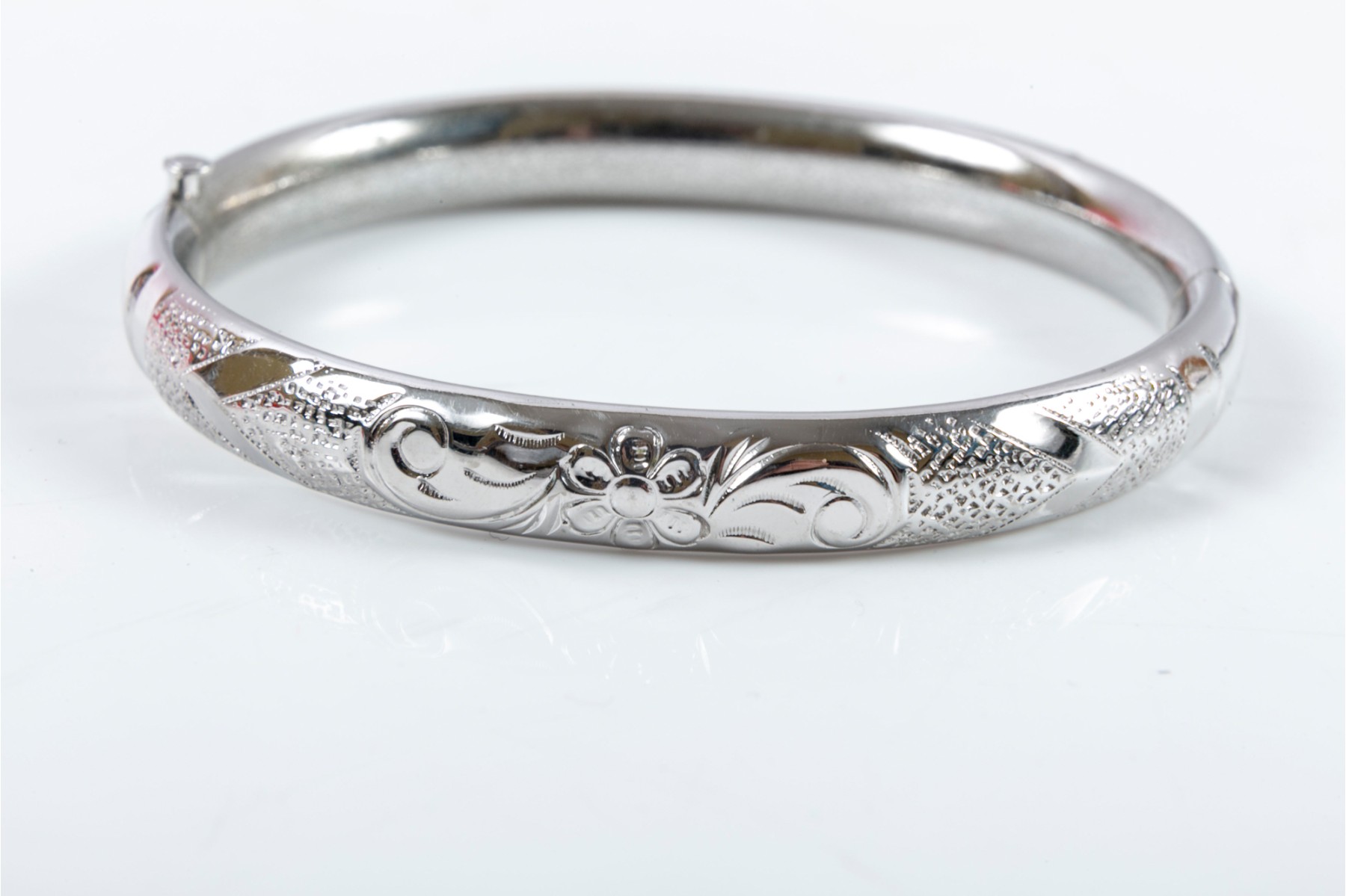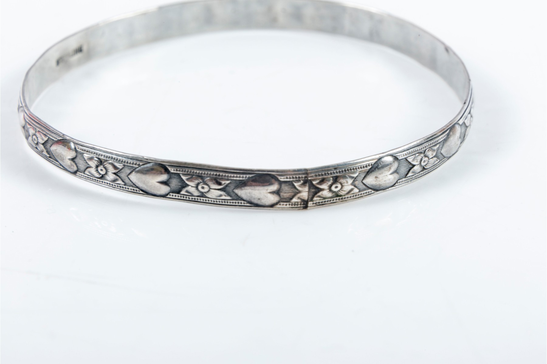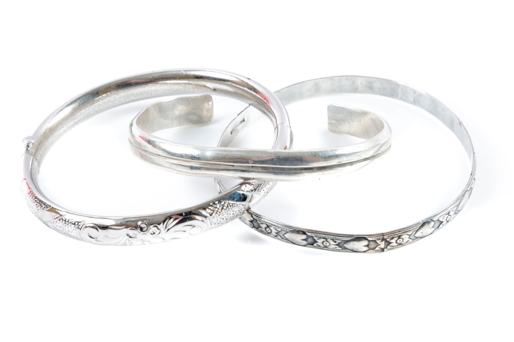 A trio of three unique sterling silver bracelets incized with varied designs — hearts, florals, etc. One bracelet is adjustable in size. Contents do not exceed 2.75" in diameter.