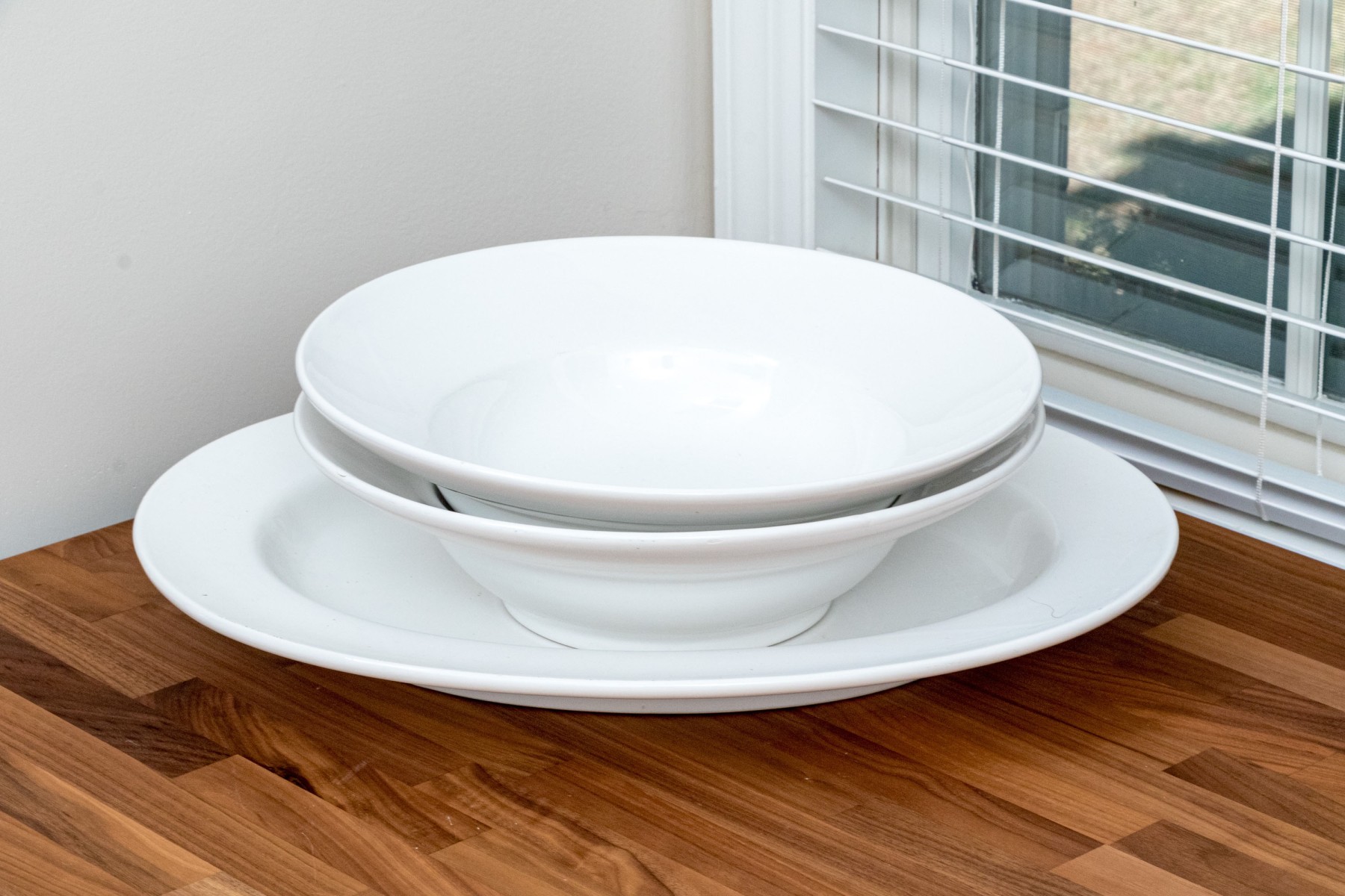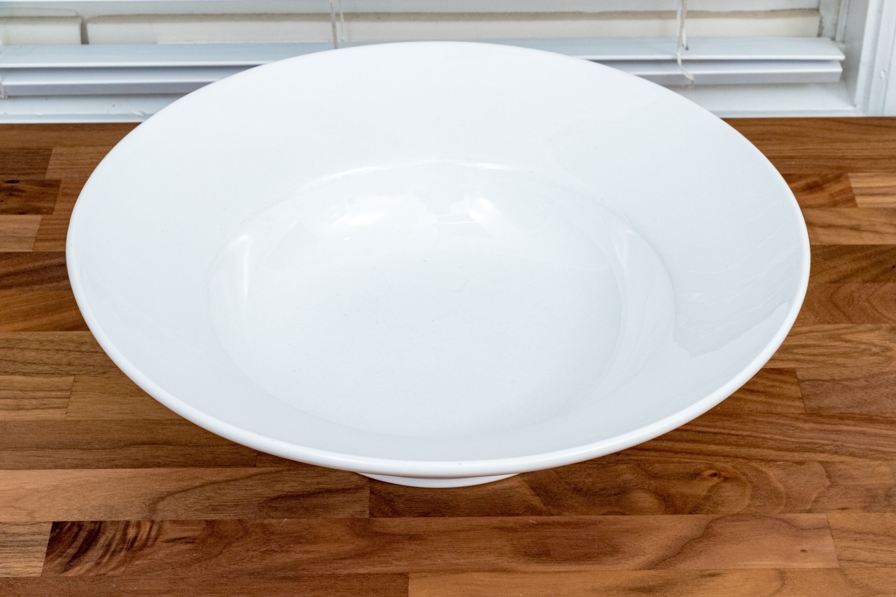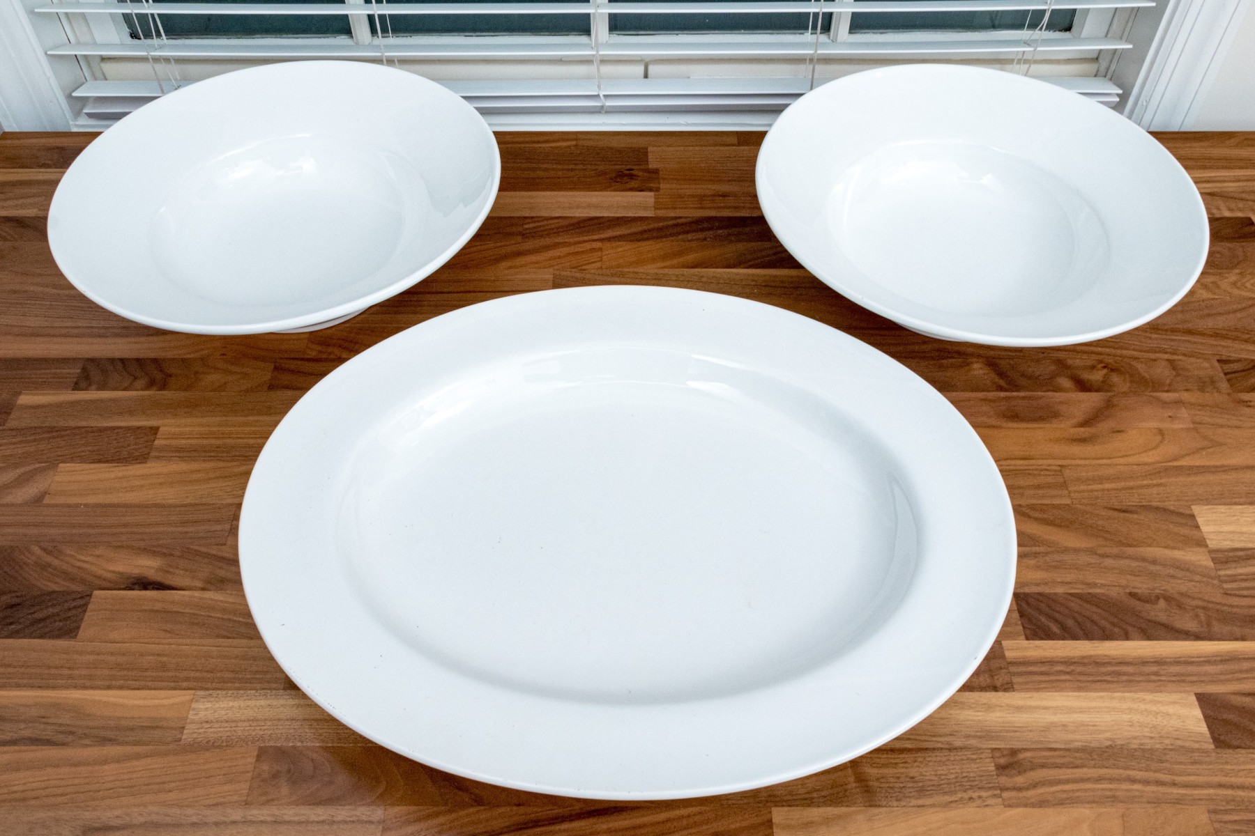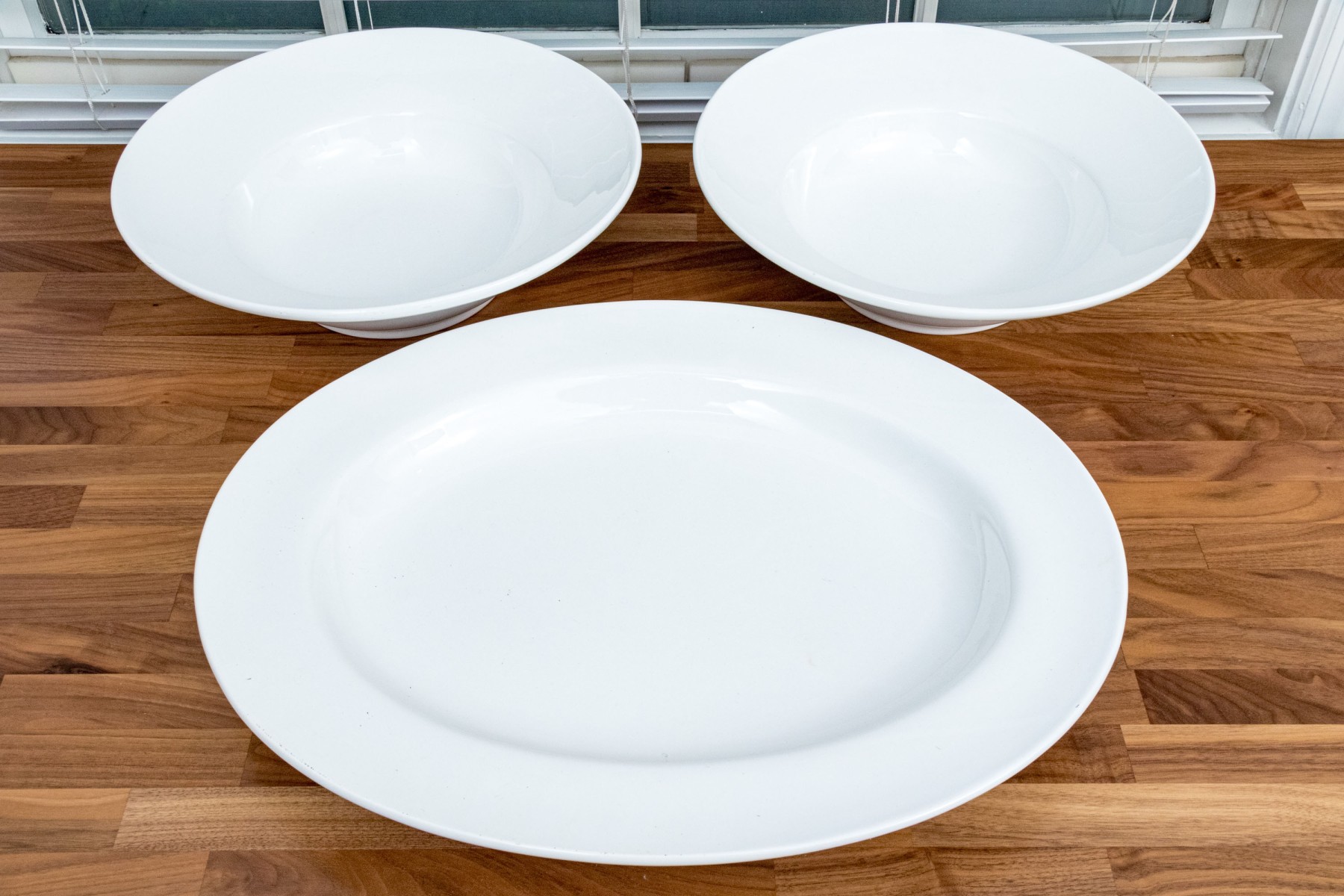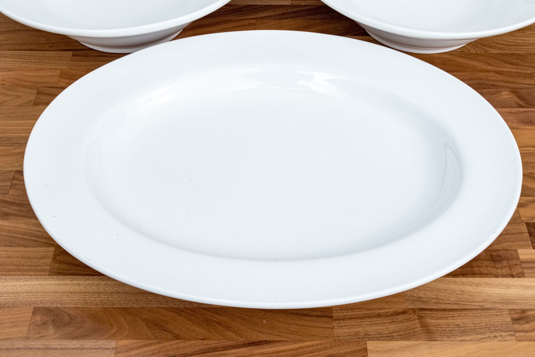 A lovely trio of sleek and minimalist Italian white ceramic serving pieces including of a pair of large circular bowls and an oval serving platter.
