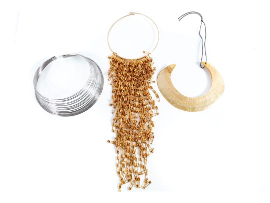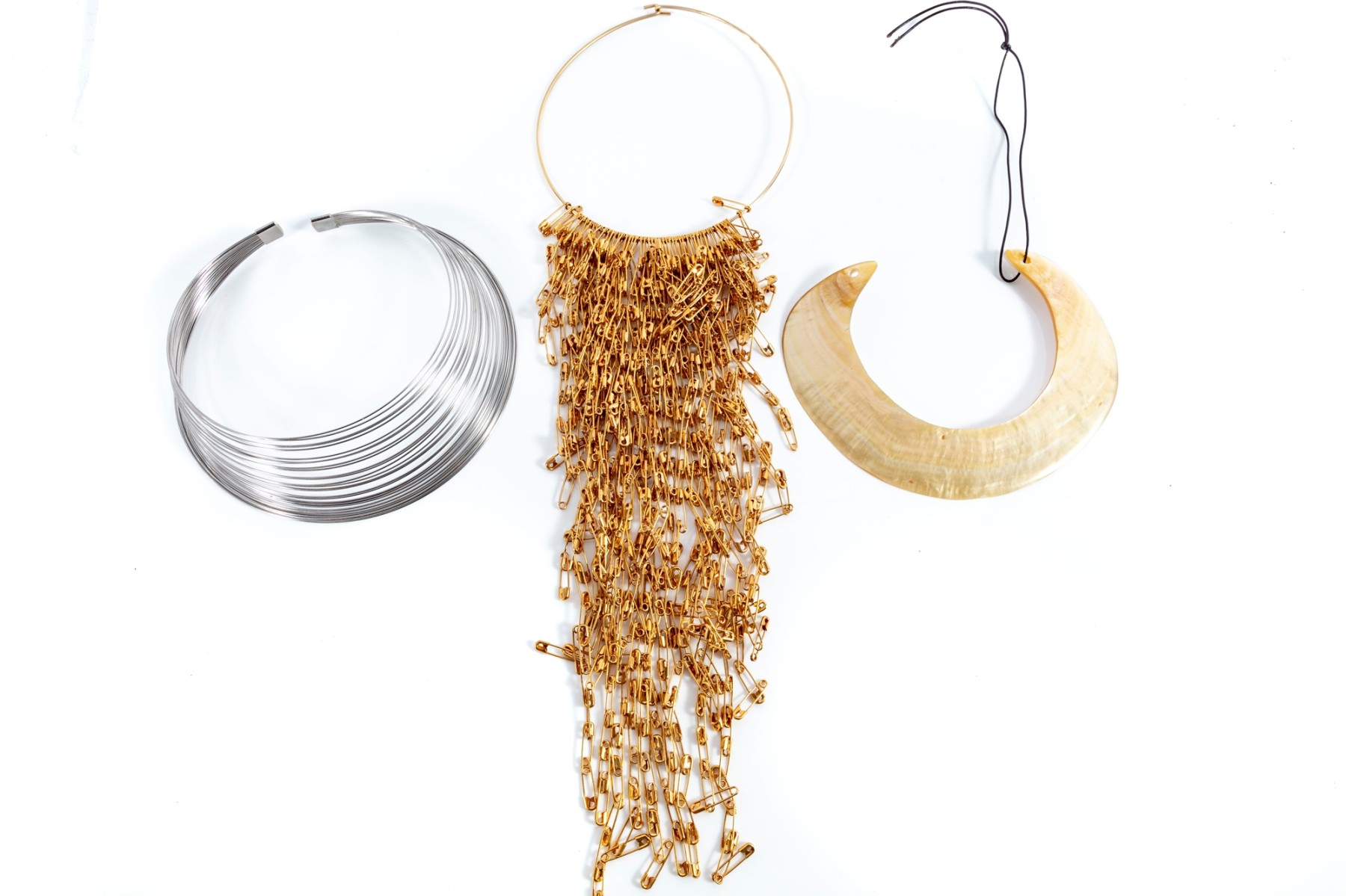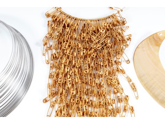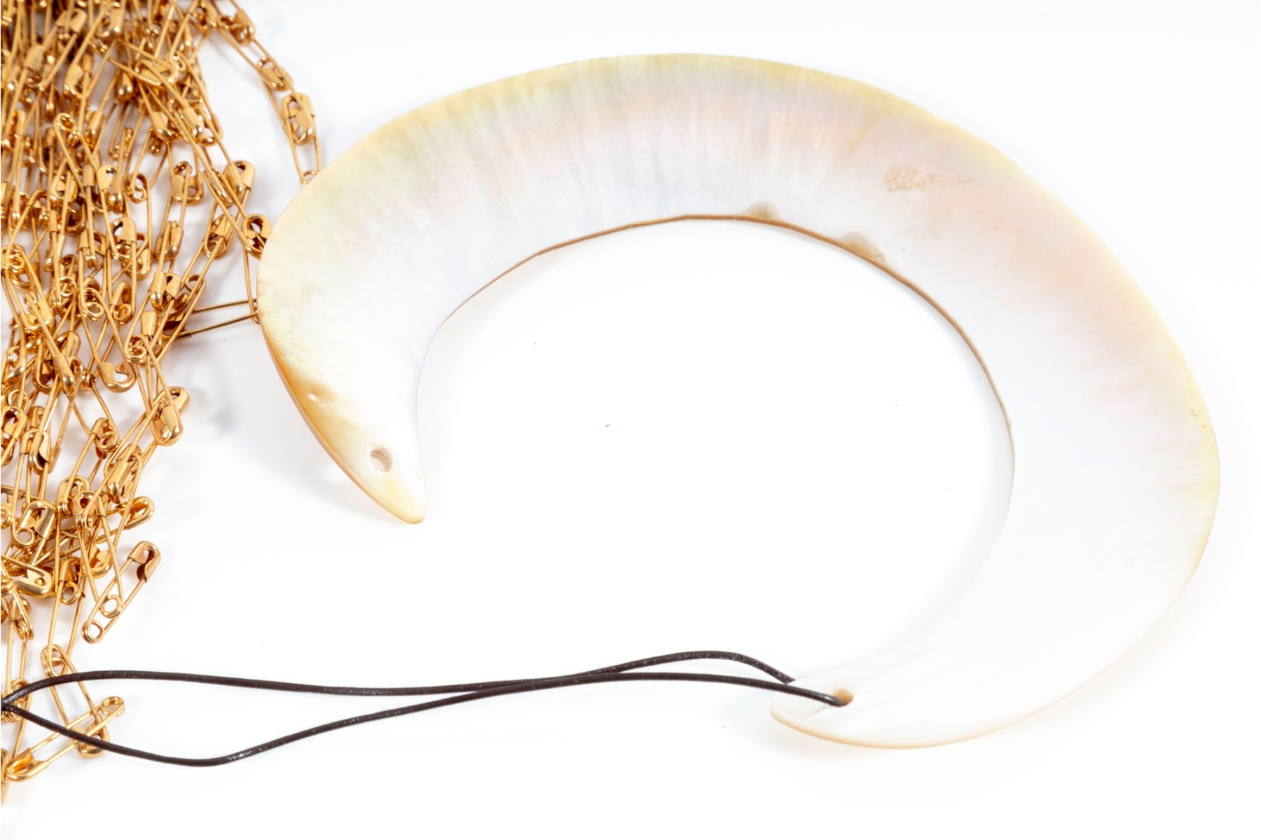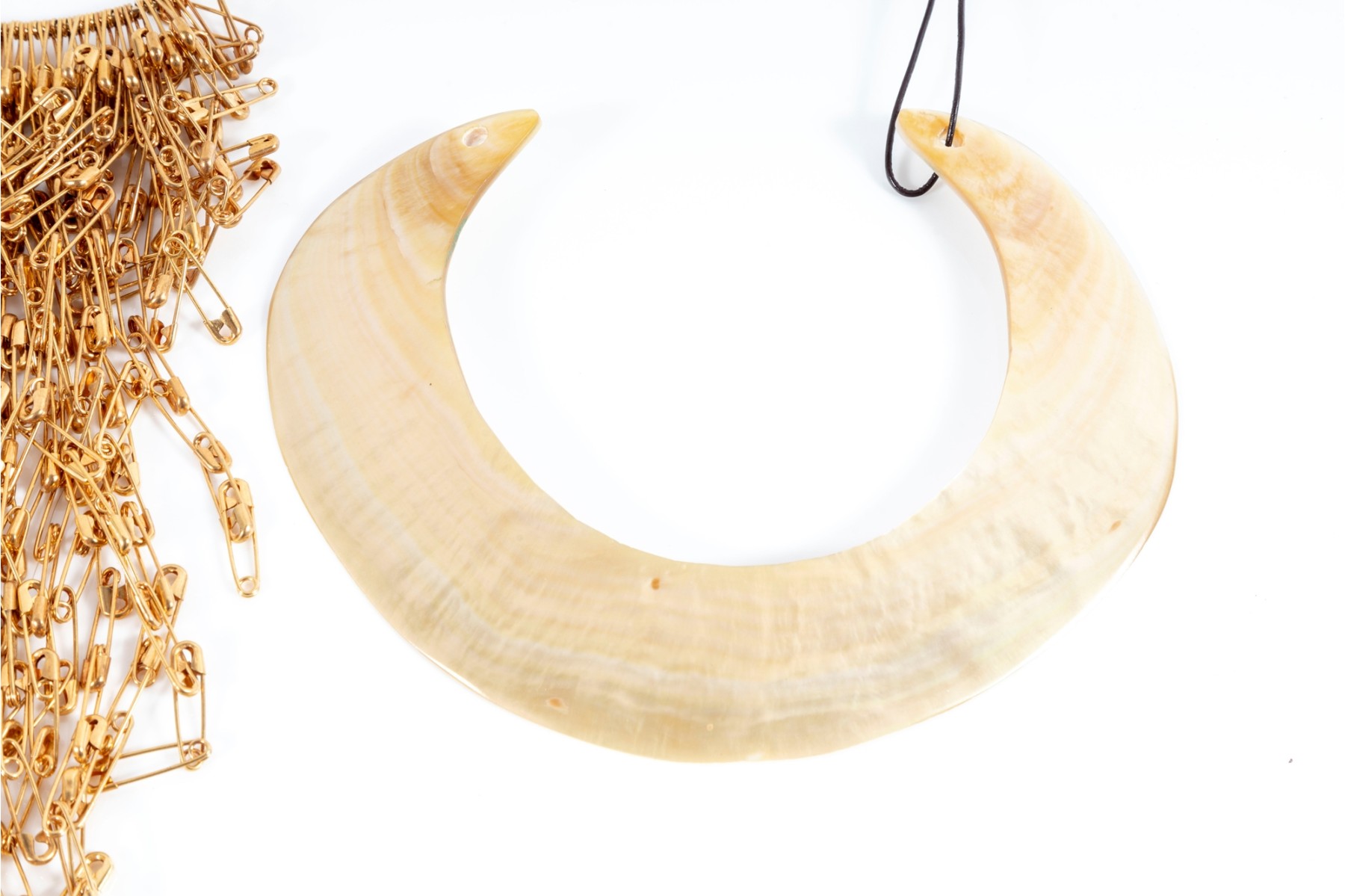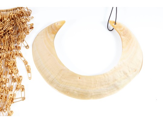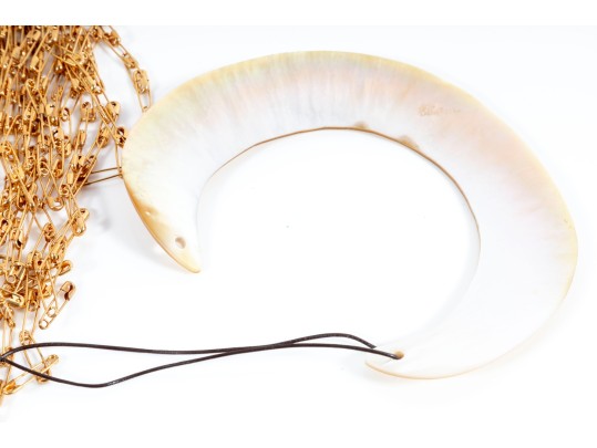 Three distinctive fashion necklaces composed of gold-tone bobby pins, steel wire, and a crescent Kina shell. See photos for details.