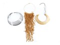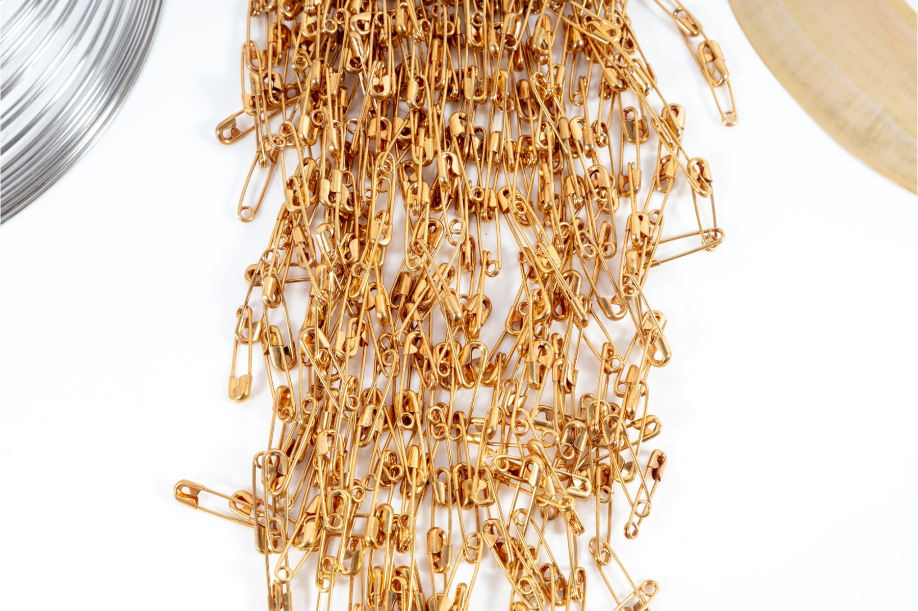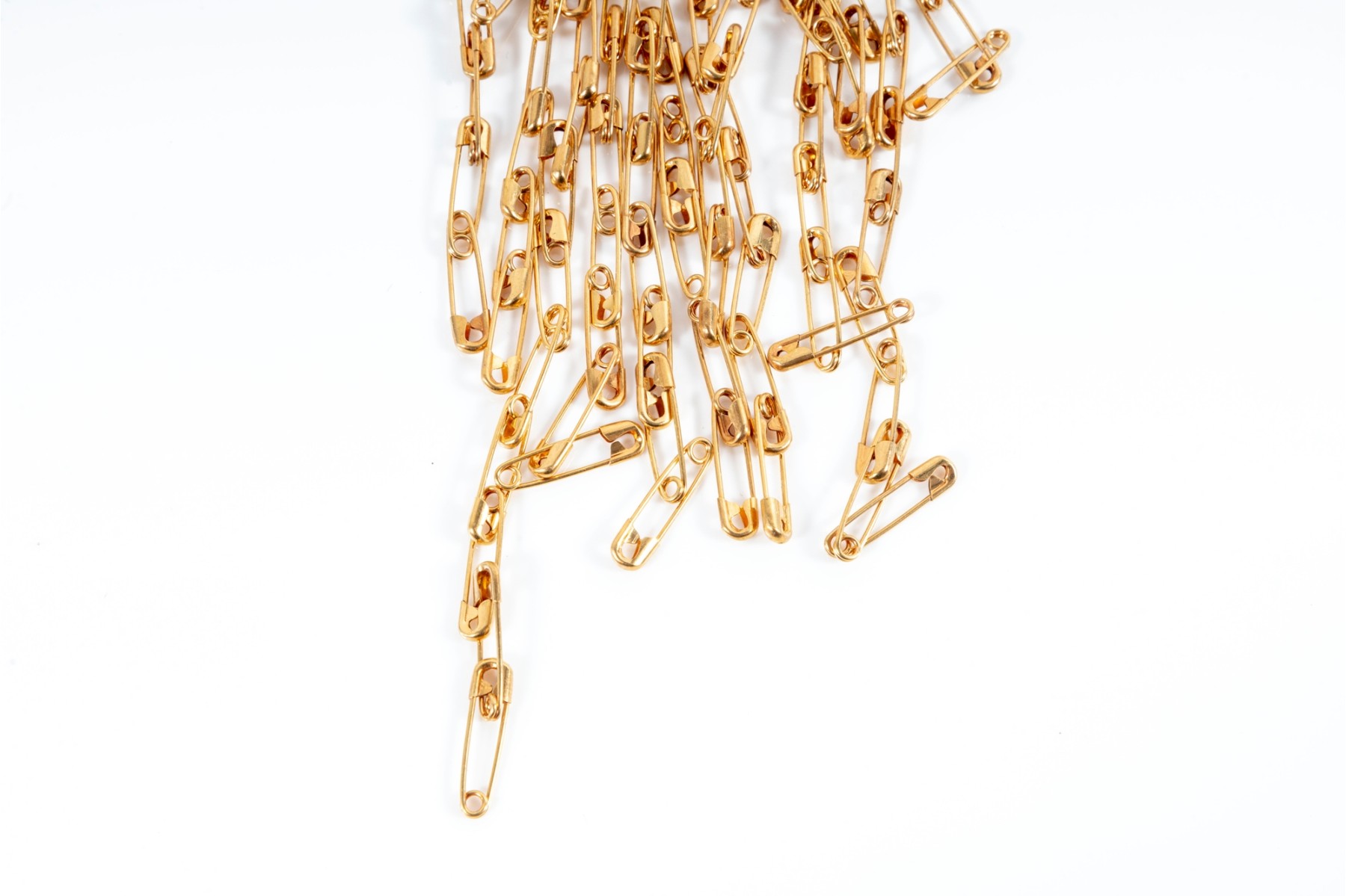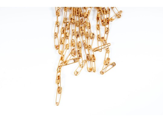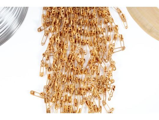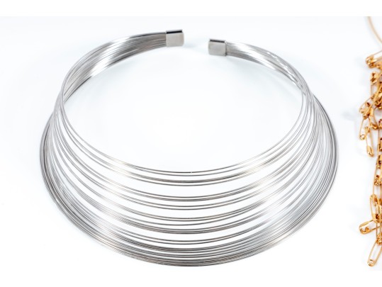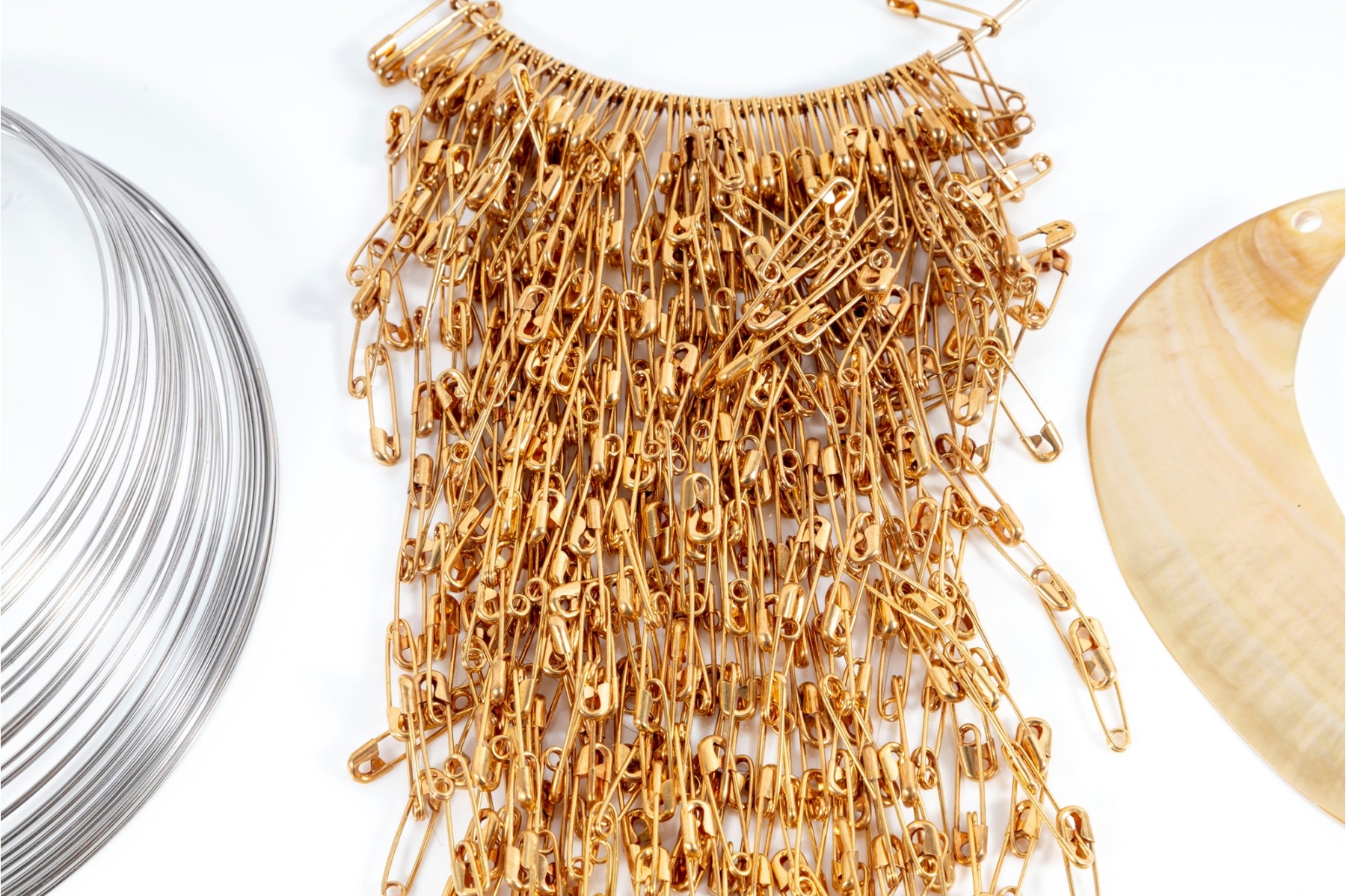 Three distinctive fashion necklaces composed of gold-tone bobby pins, steel wire, and a crescent Kina shell. See photos for details.