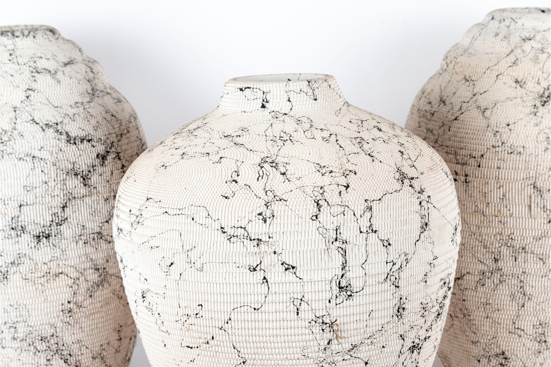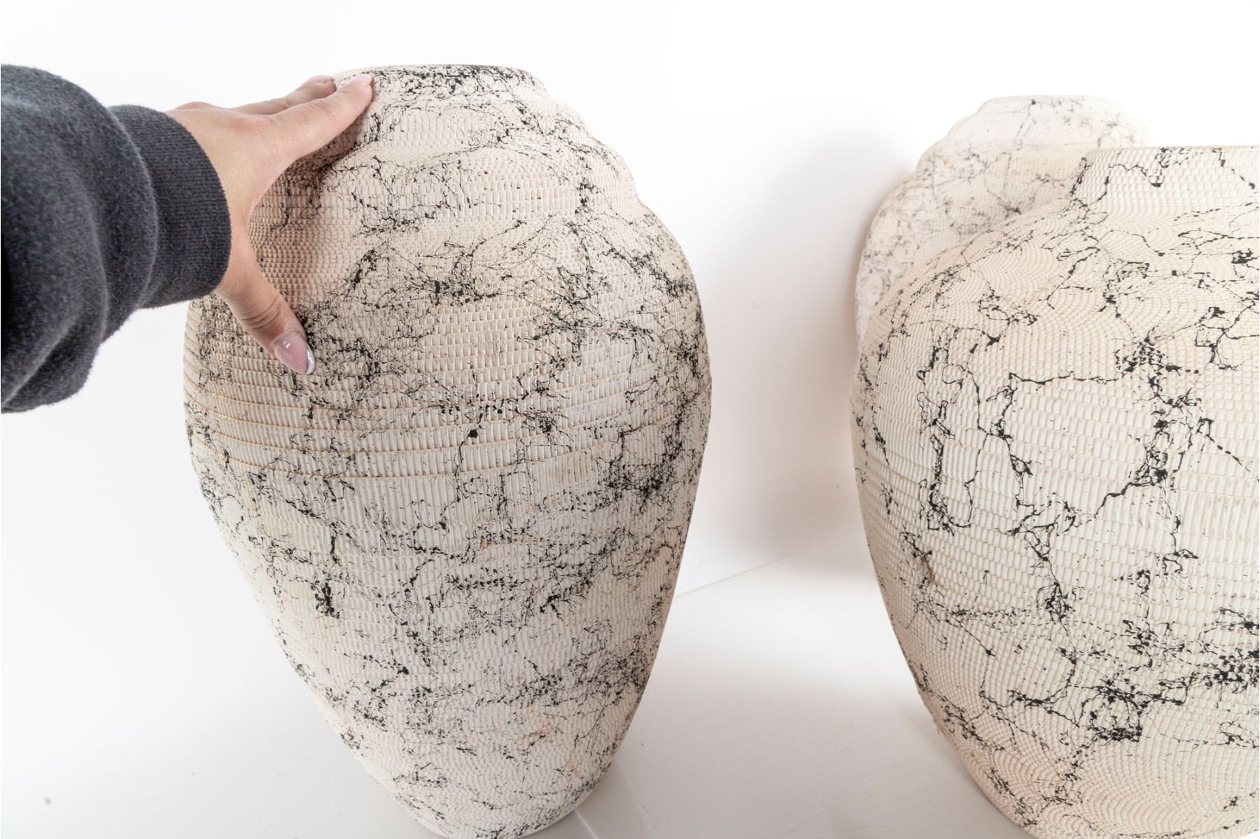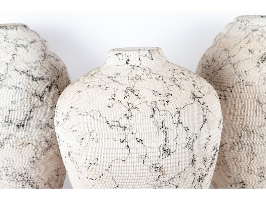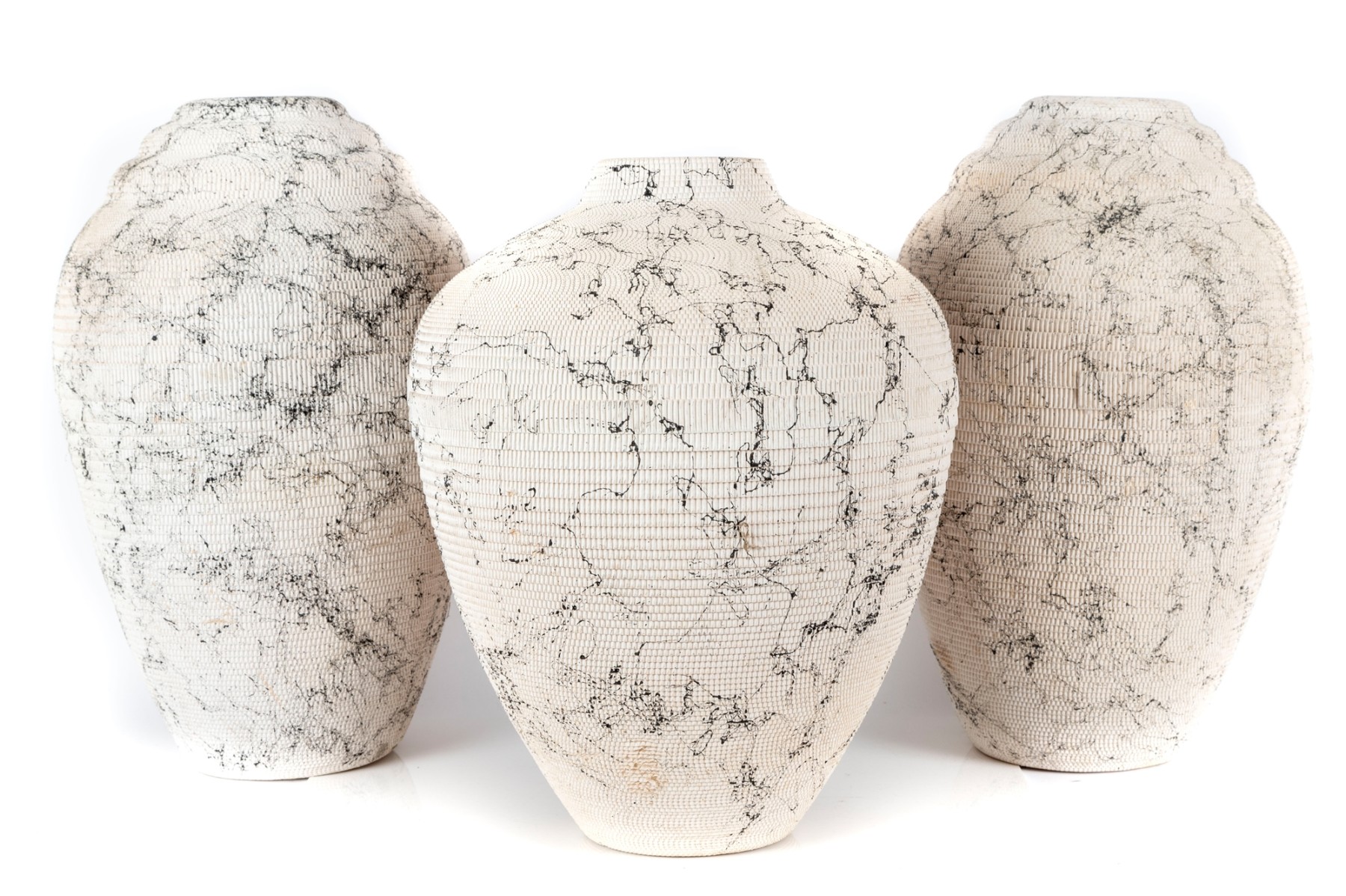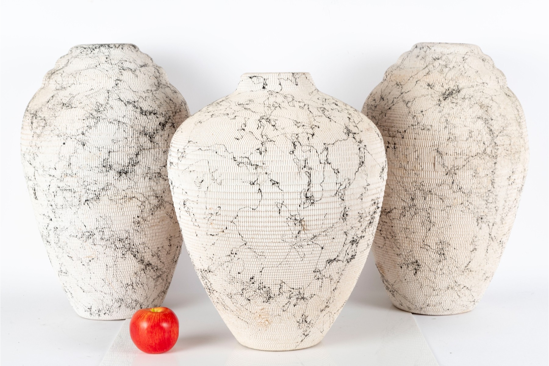 A set of three unusual layered paper/cardboard vases, marbled with sponged pattern and shaped into form. Can be used as traditional planters.