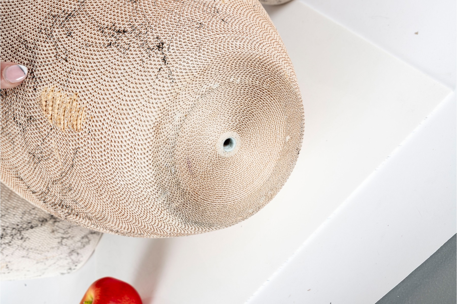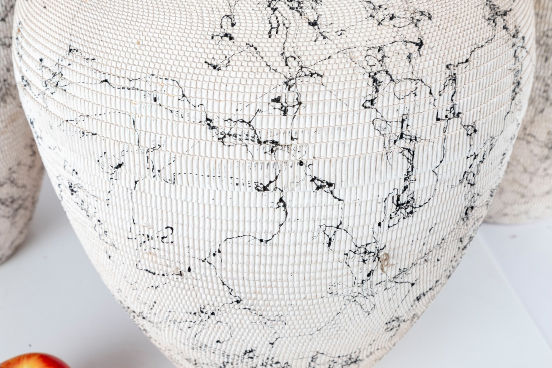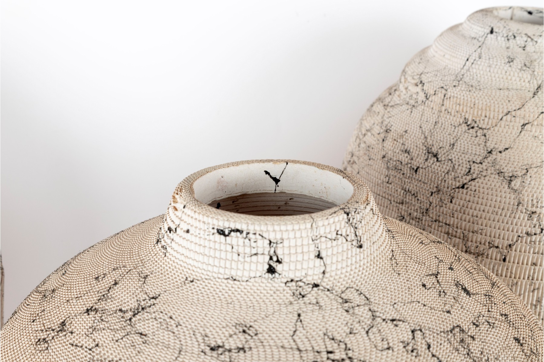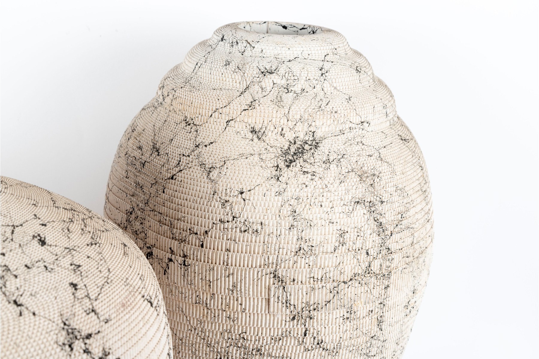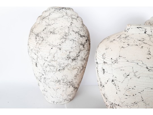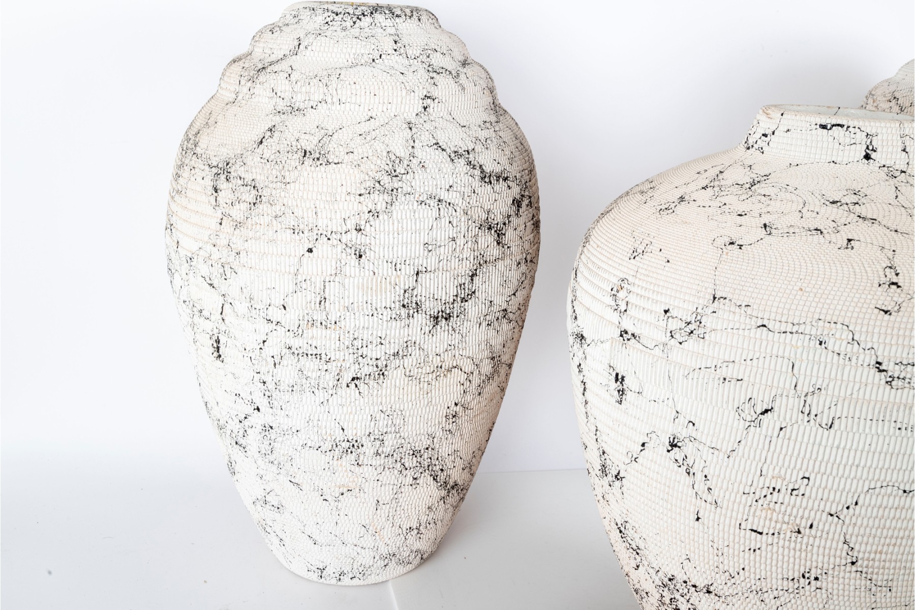A set of three unusual layered paper/cardboard vases, marbled with sponged pattern and shaped into form. Can be used as traditional planters.
