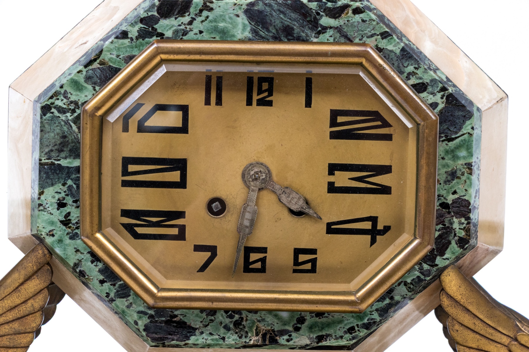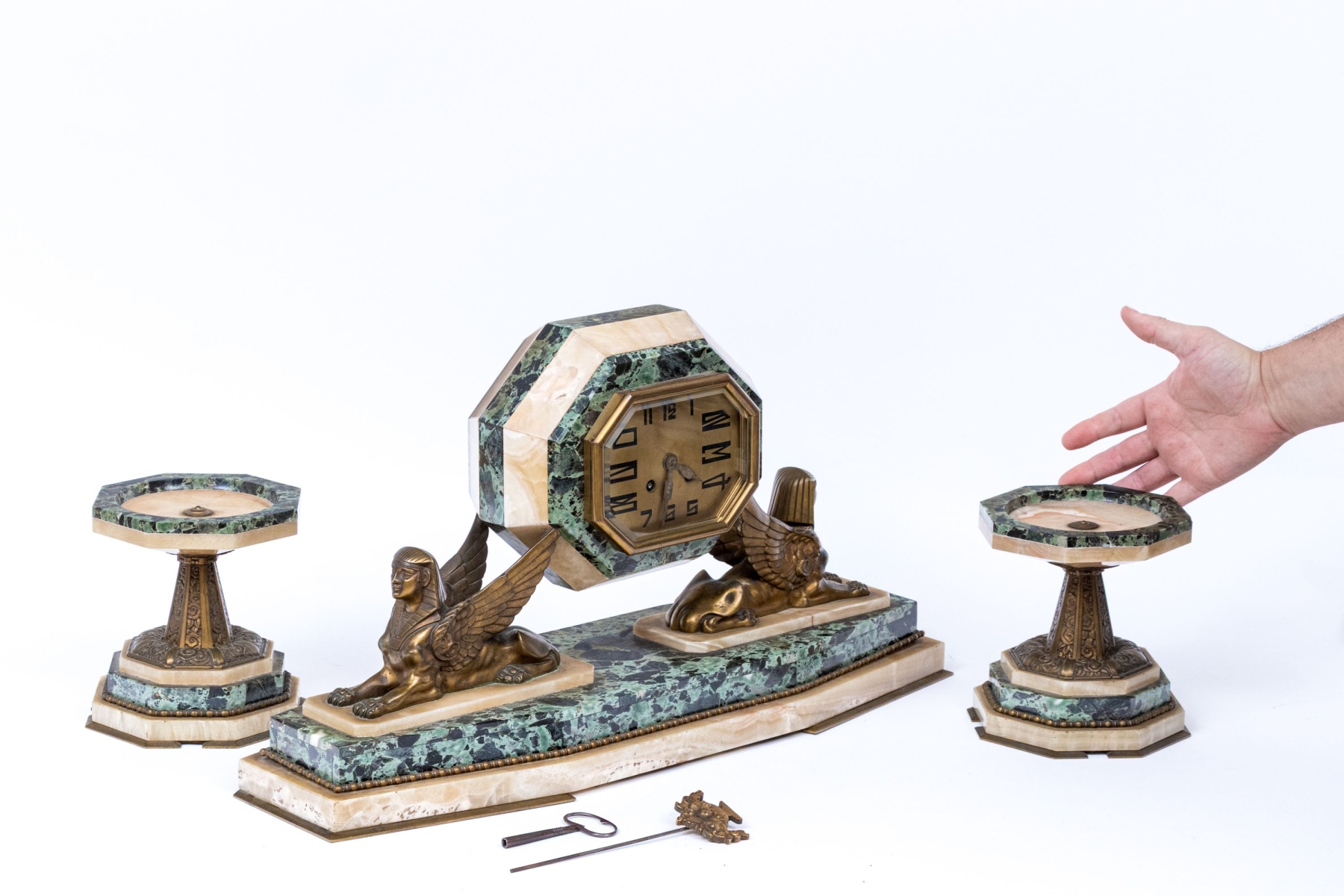 Fabulous bronze and marble clock with rectangular shaped base with pair of winged sphinxes supporting the octagonal clock. Together with a pair of compotes. Comes with key and pendulum. Dimensions: Pair of compotes: 6 3/4" H x 6 3/8" L x 6 3/8" W