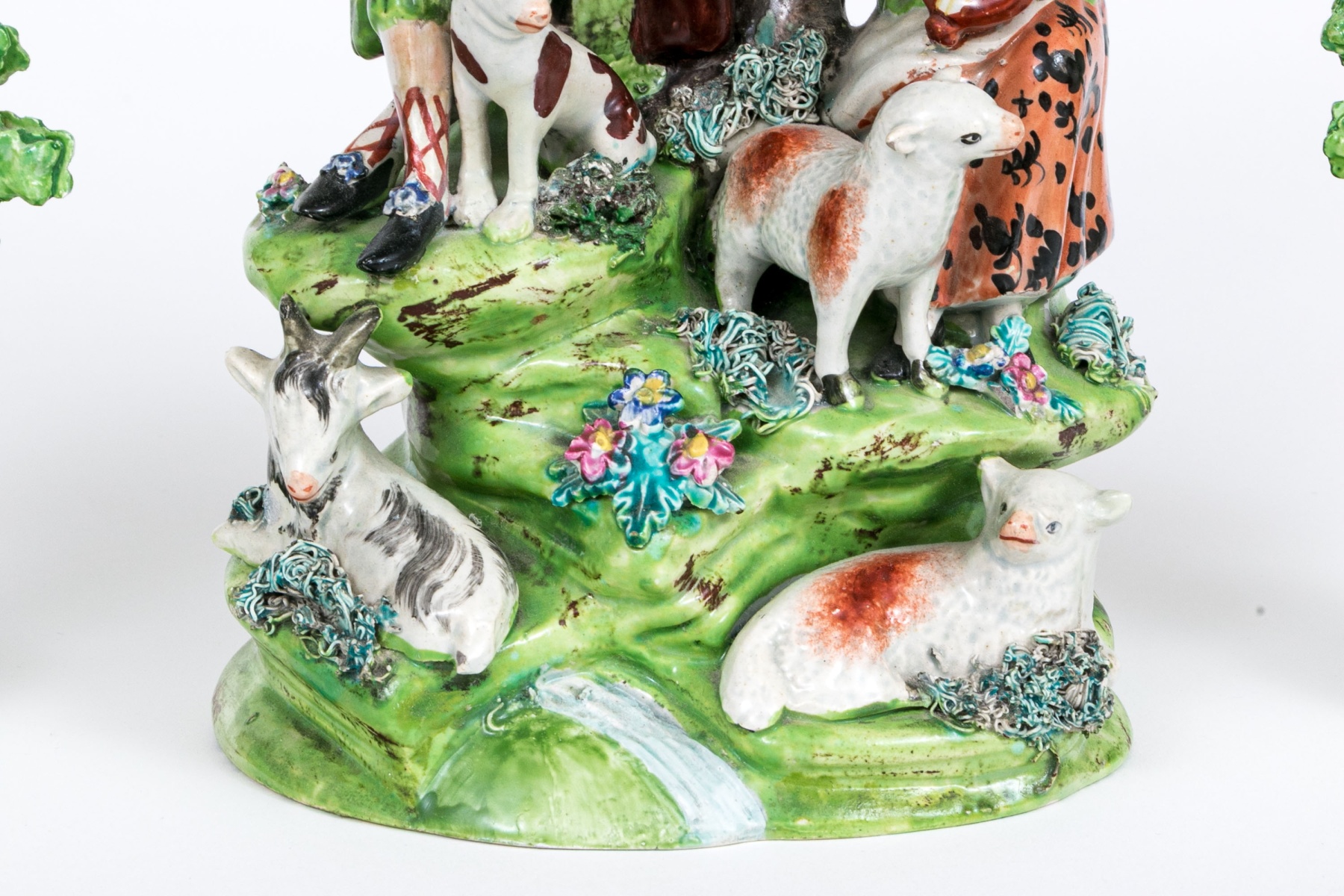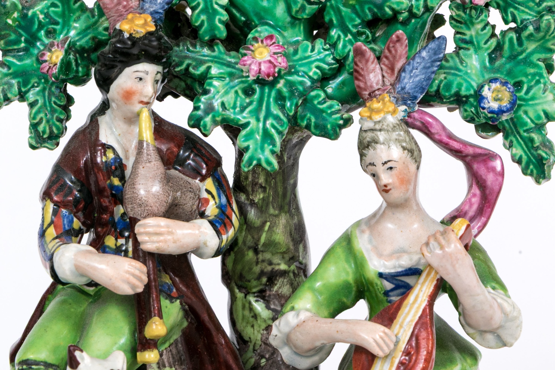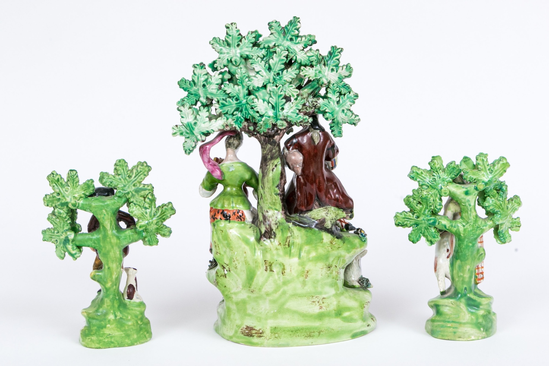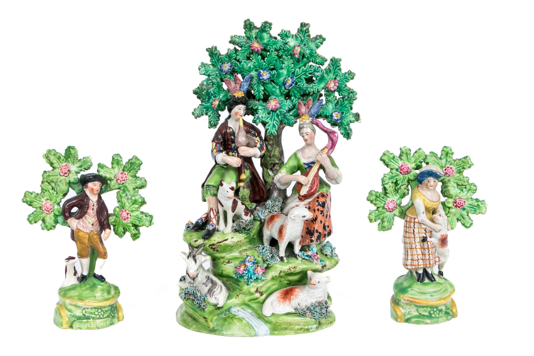 Comprised of a musical larger central sculpture with man and woman playing musical instruments with goats and dogs and a sheep, with tree in background seen flowering. Together with two smaller sculptures one man and one with woman and flowering trees.