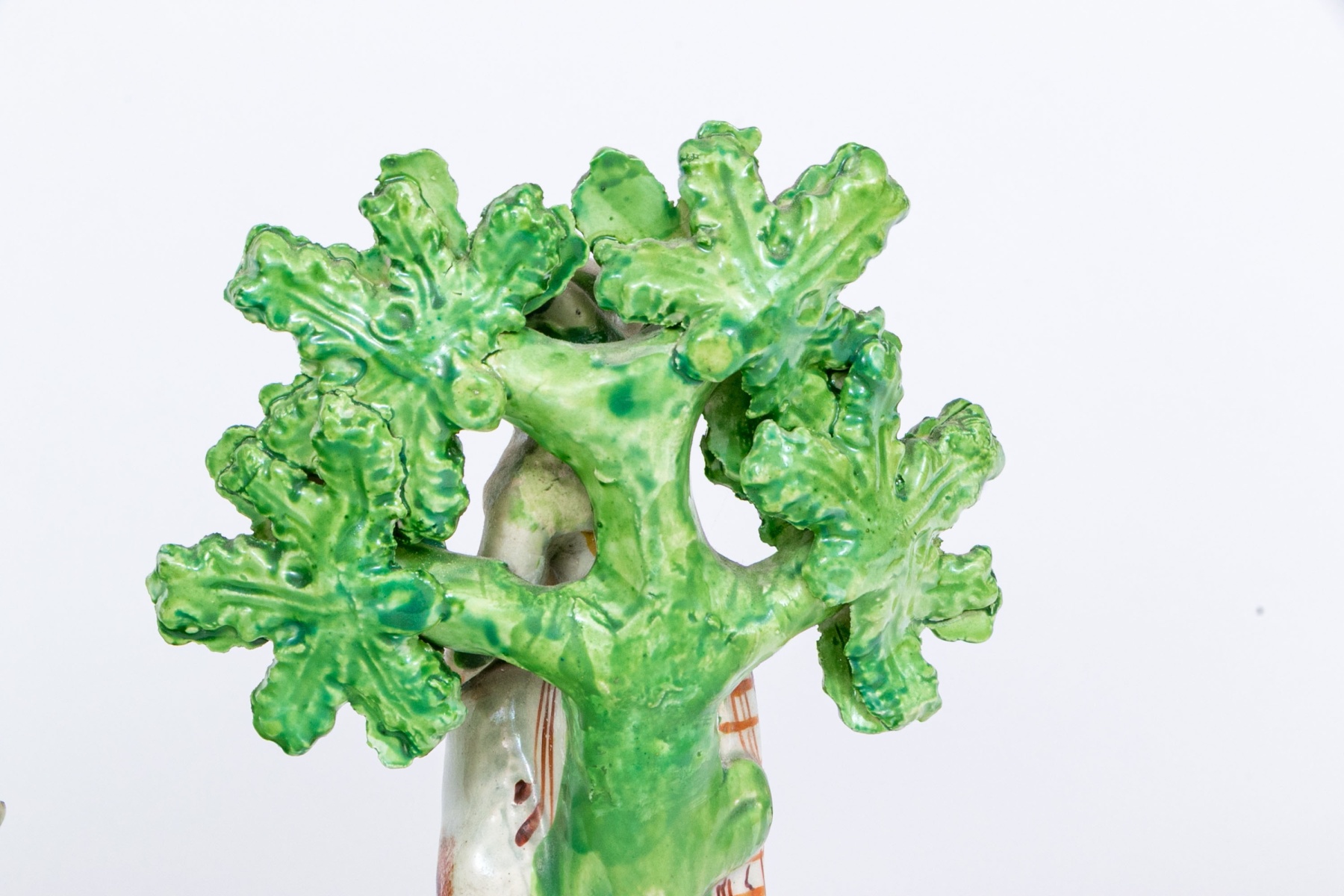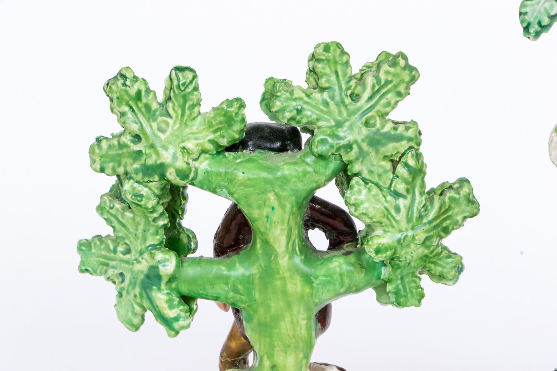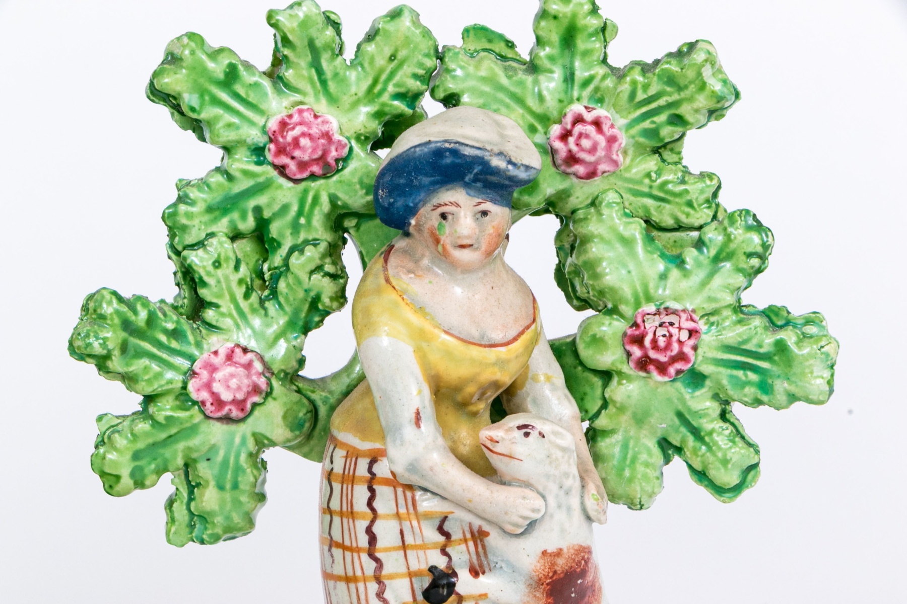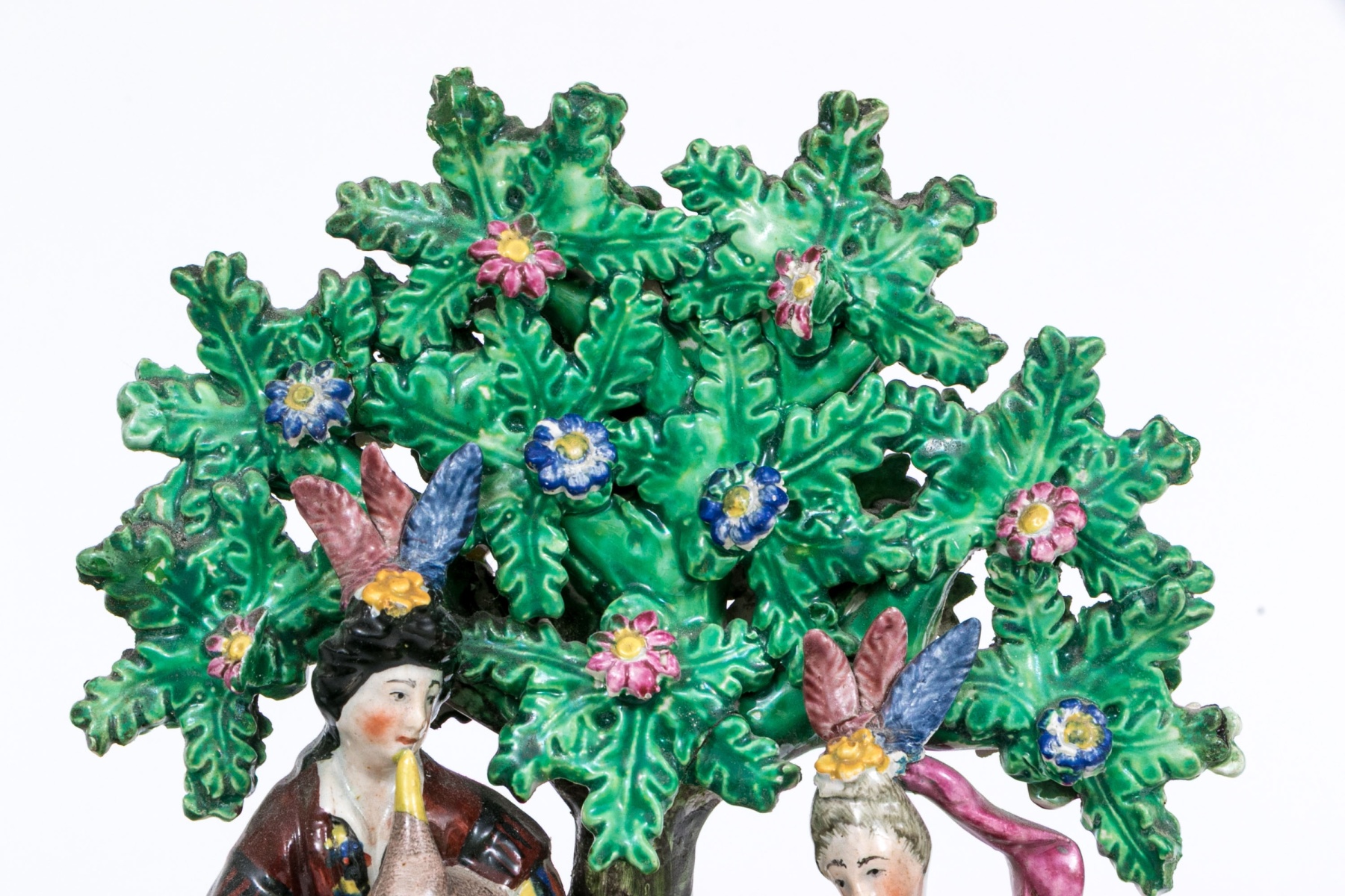 Comprised of a musical larger central sculpture with man and woman playing musical instruments with goats and dogs and a sheep, with tree in background seen flowering. Together with two smaller sculptures one man and one with woman and flowering trees.