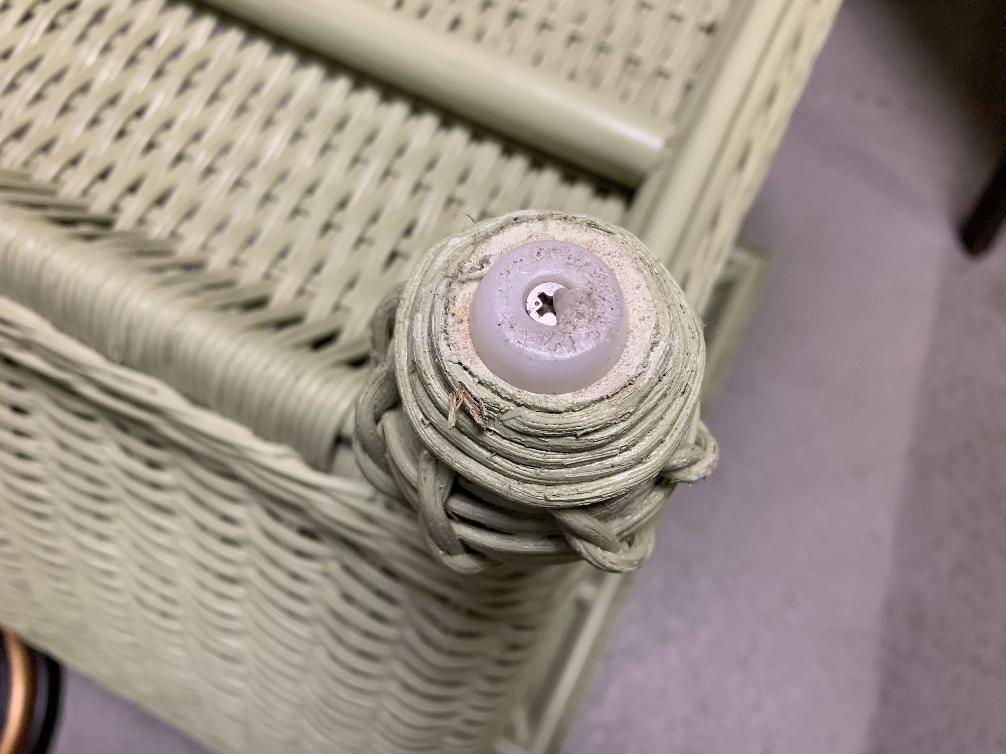 Condition: Please see detail photos. Signs of age and wear include a few small scrapes to the wicker mentioned for accuracy as the presentation is colorful and fresh.