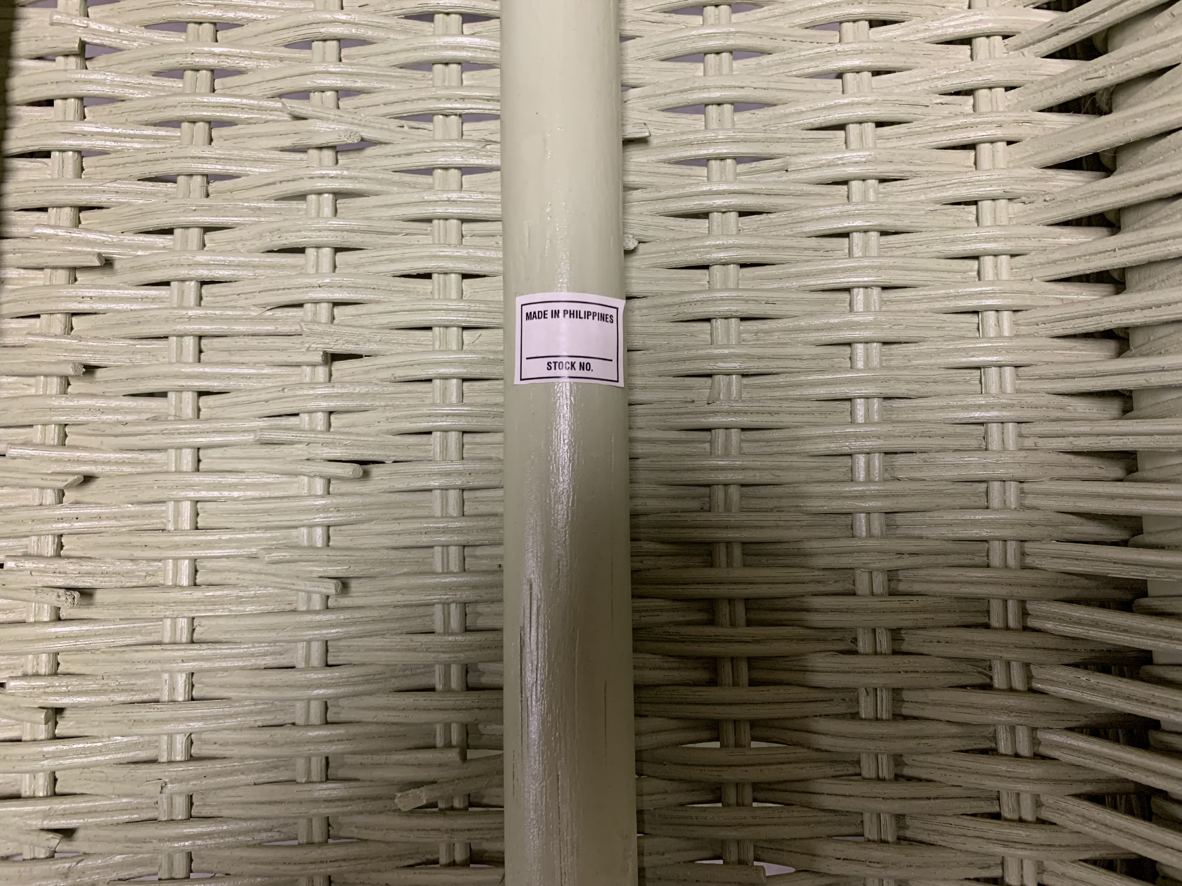 A well made, comfortable and colorful three piece wicker Porch Set consisting of two Armchairs in Sage Green paint with white cotton seats along with a wicker table featuring a flat top, a lower shelf, and two open compartments on the sides that are suitable for holding magazines or other reading materials. Hard plastic gliders underfoot and bearing a sticker Made in Philippines.