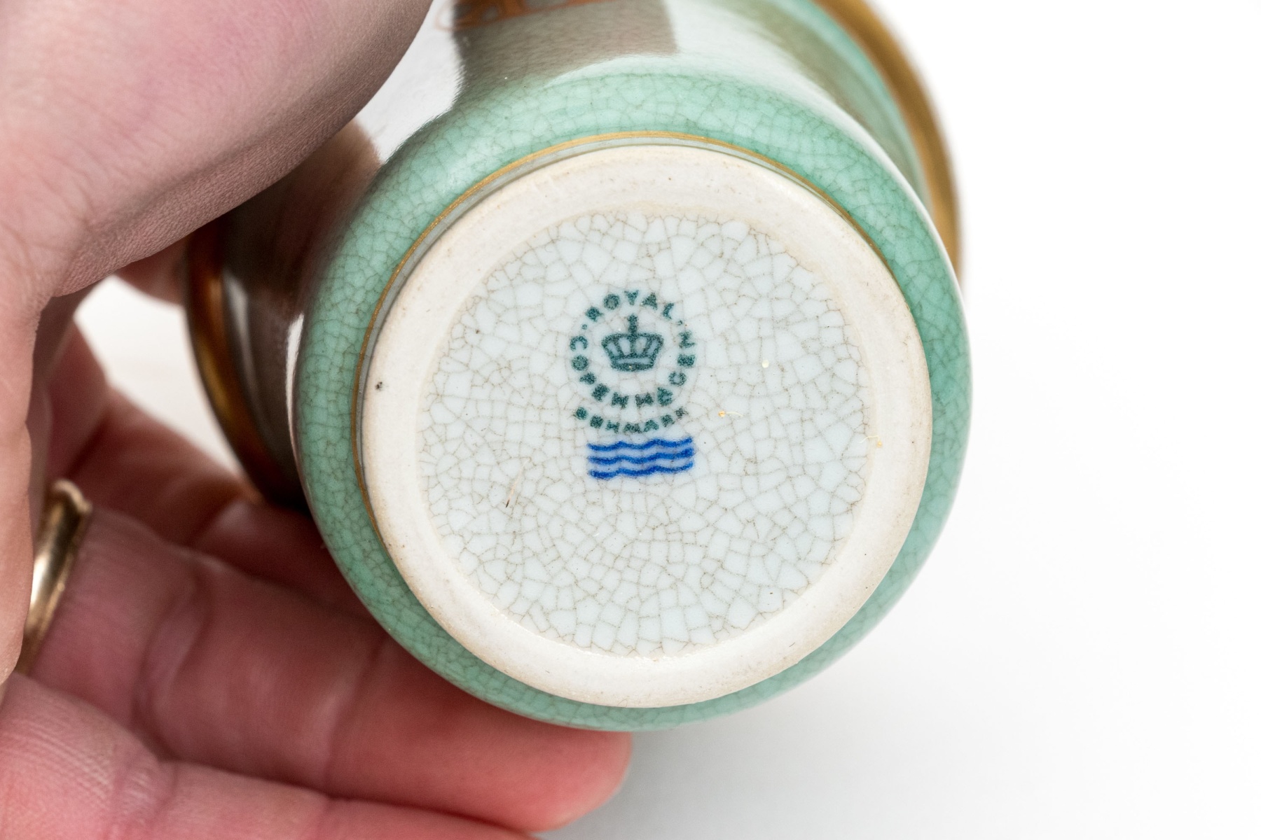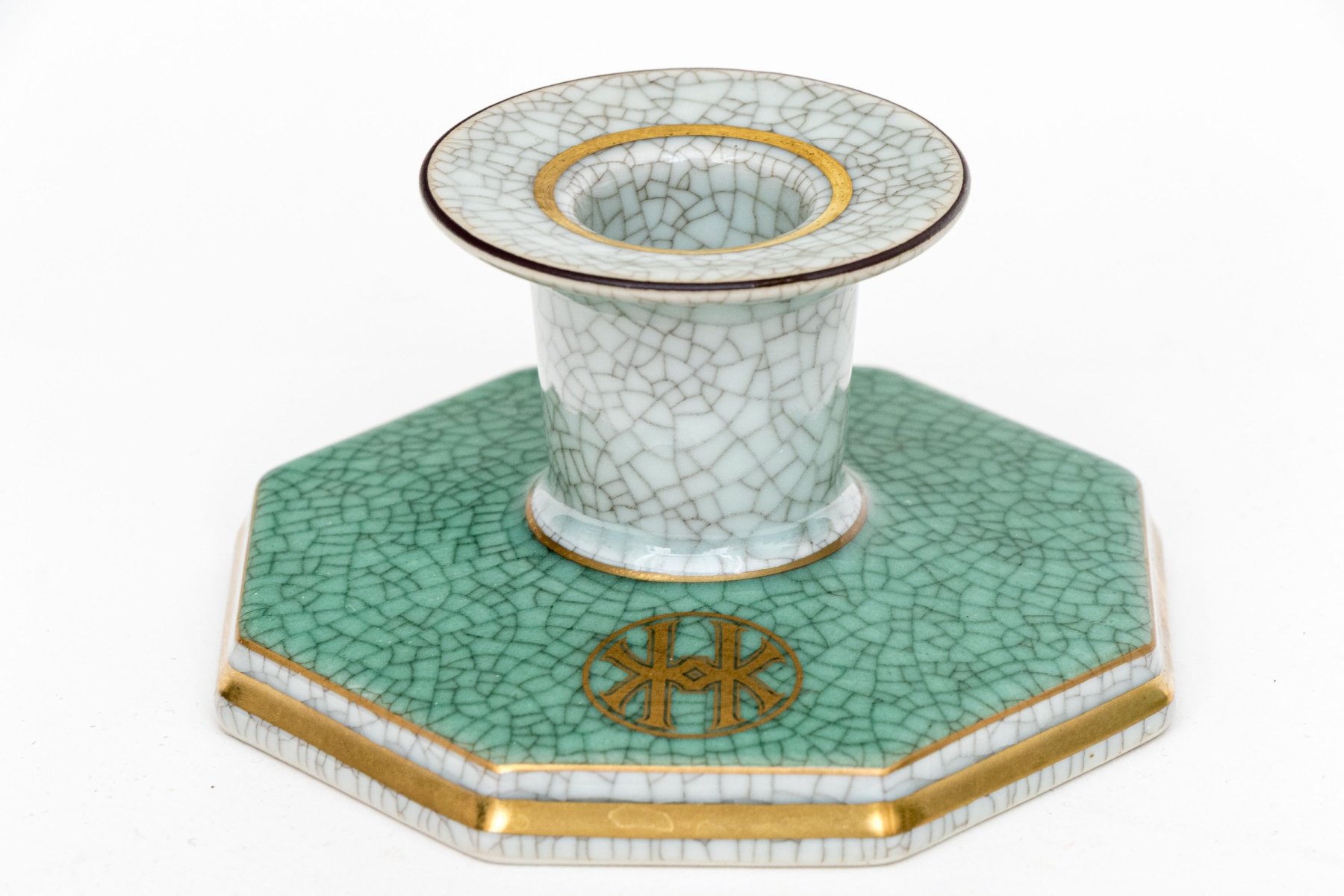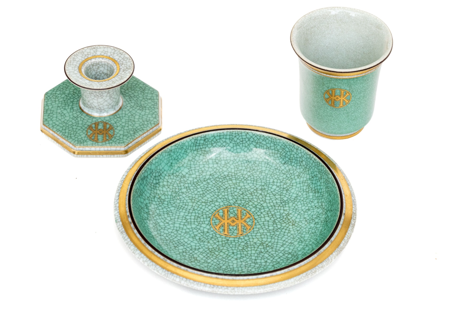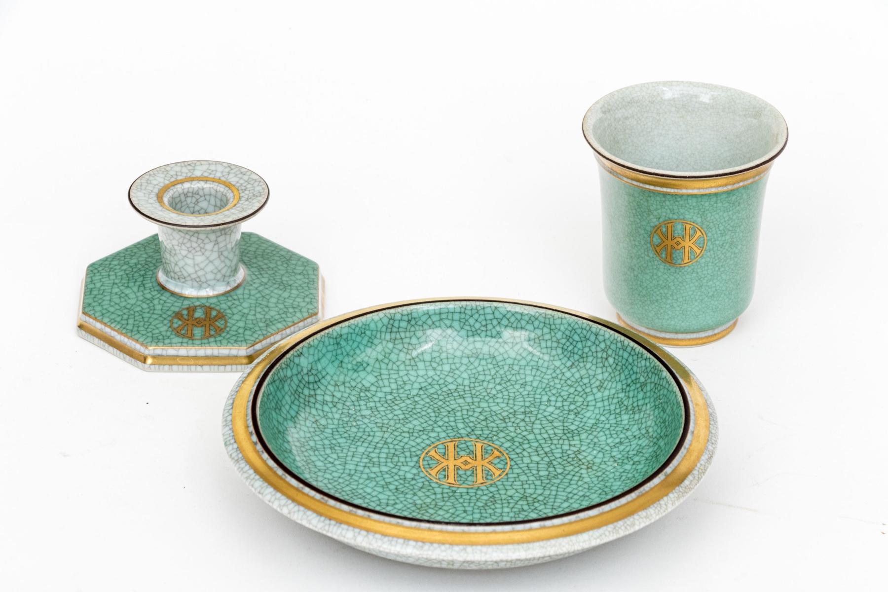 An excellent three piece set of Royal Copenhagen ceramics including a candlestick, tumbler or pencil cup, and a small catchall dish. All in striking white and celadon crackle glaze with gilt and black borders adding excellent contrast. Marked underfoot.