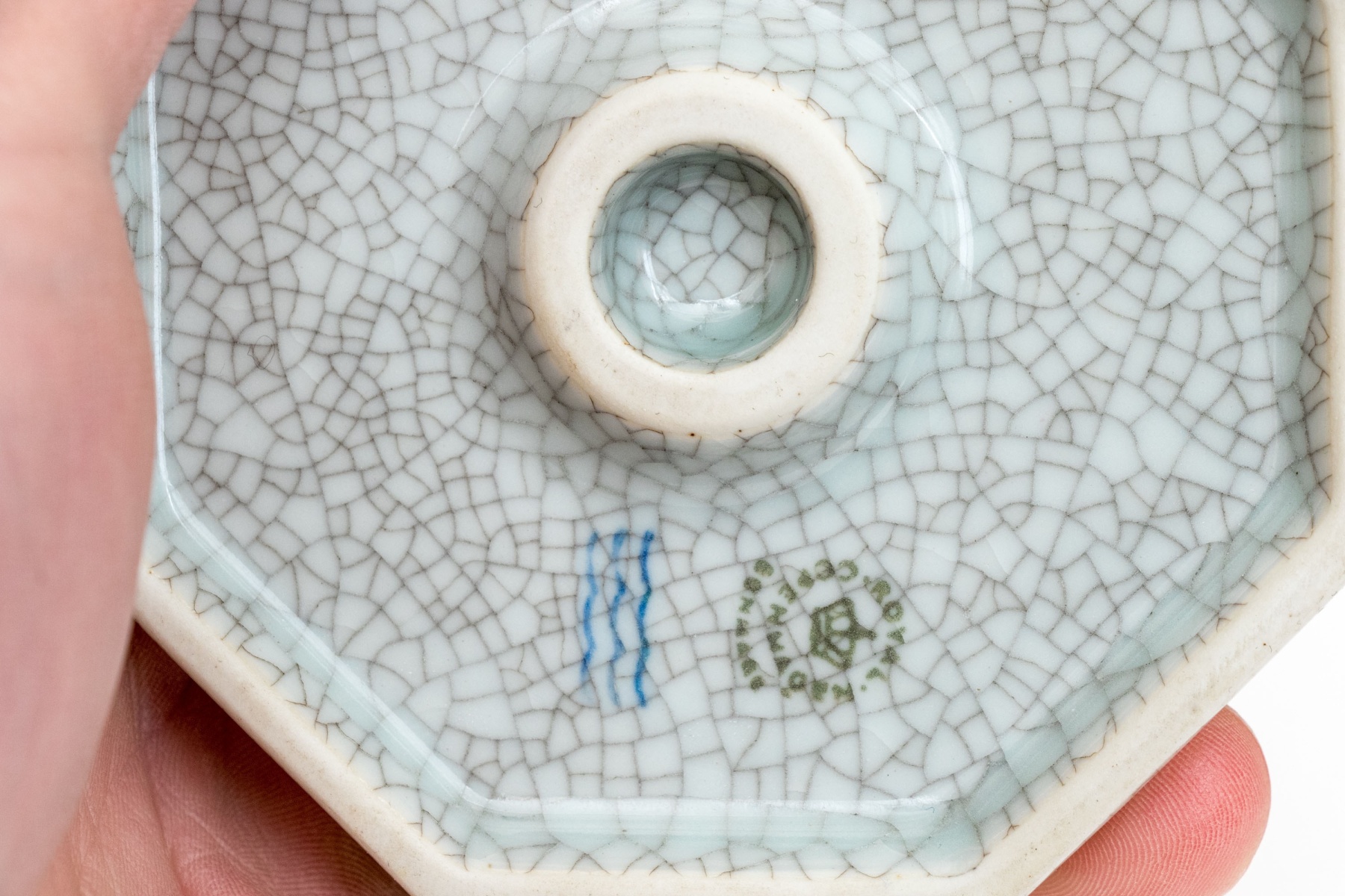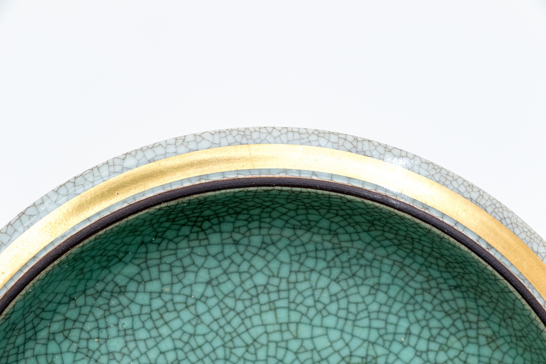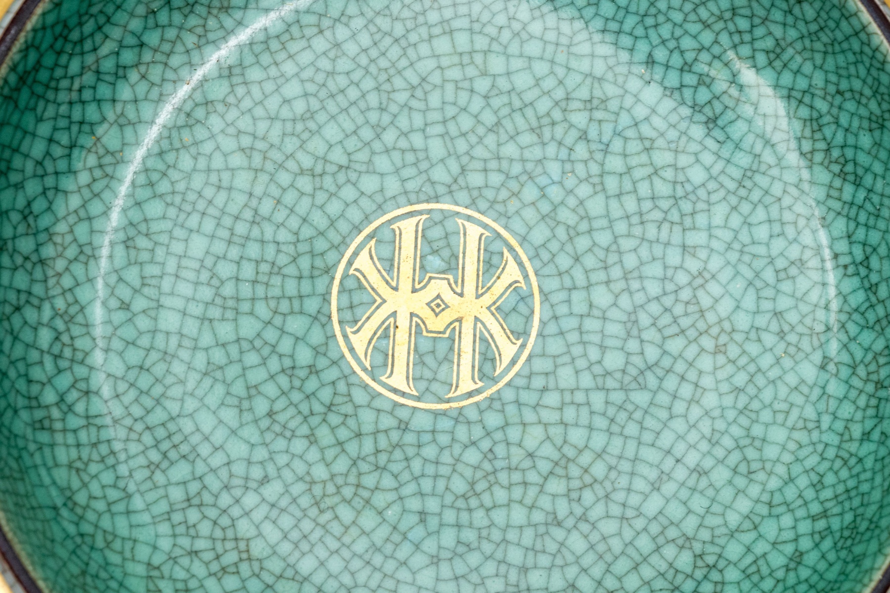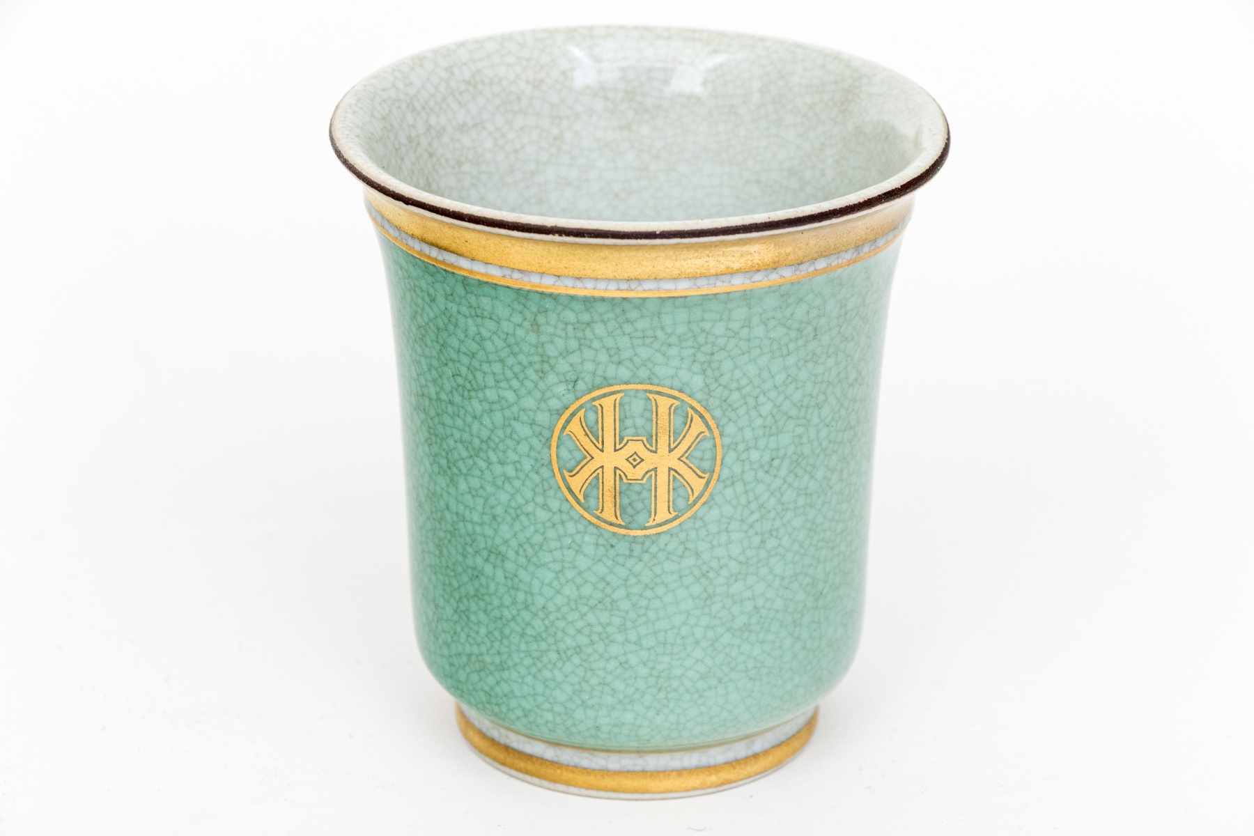 An excellent three piece set of Royal Copenhagen ceramics including a candlestick, tumbler or pencil cup, and a small catchall dish. All in striking white and celadon crackle glaze with gilt and black borders adding excellent contrast. Marked underfoot.