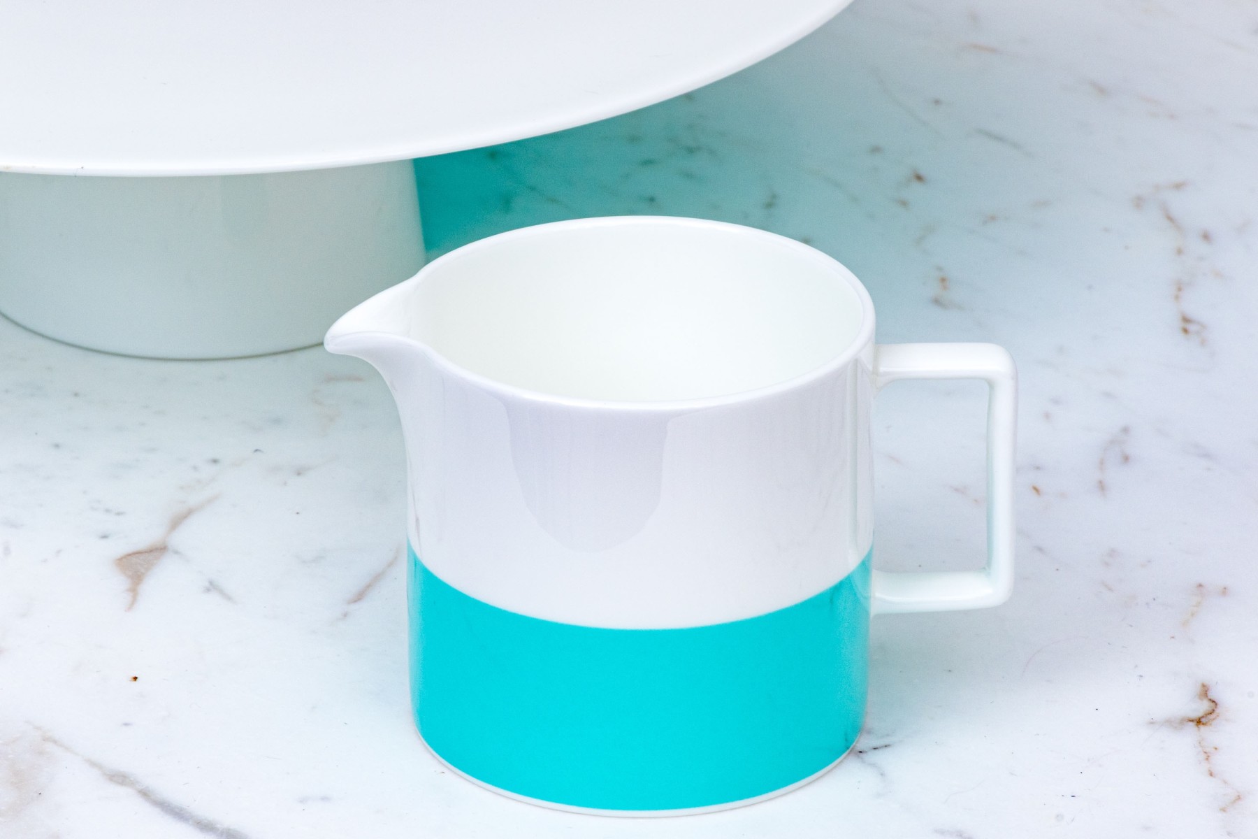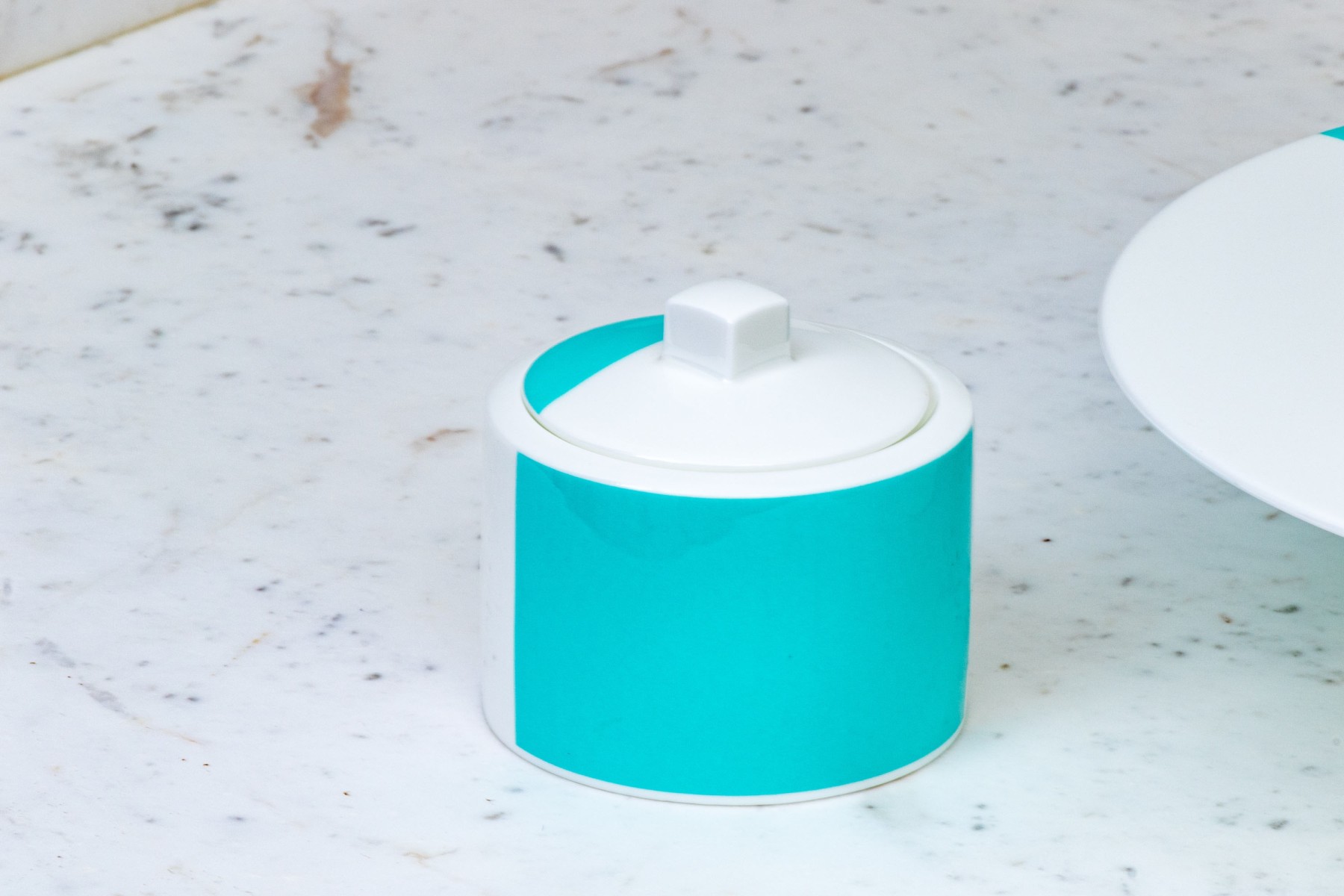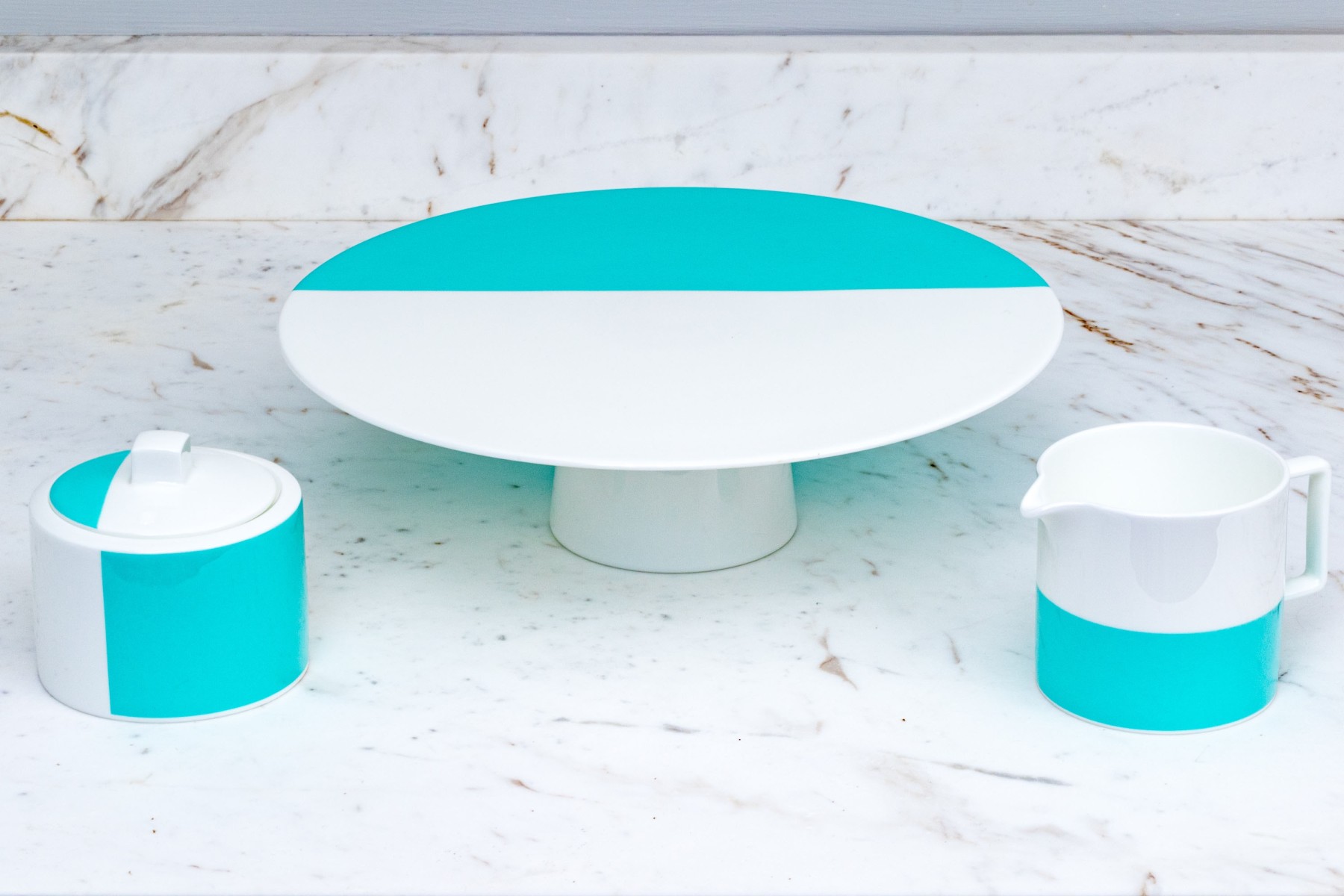 A delightful trio of Tiffany & Co. ceramics including a cake stand, creamer, and lidded sugar bowl. All with eye-catching white and teal bisected designs. Marked underfoot.