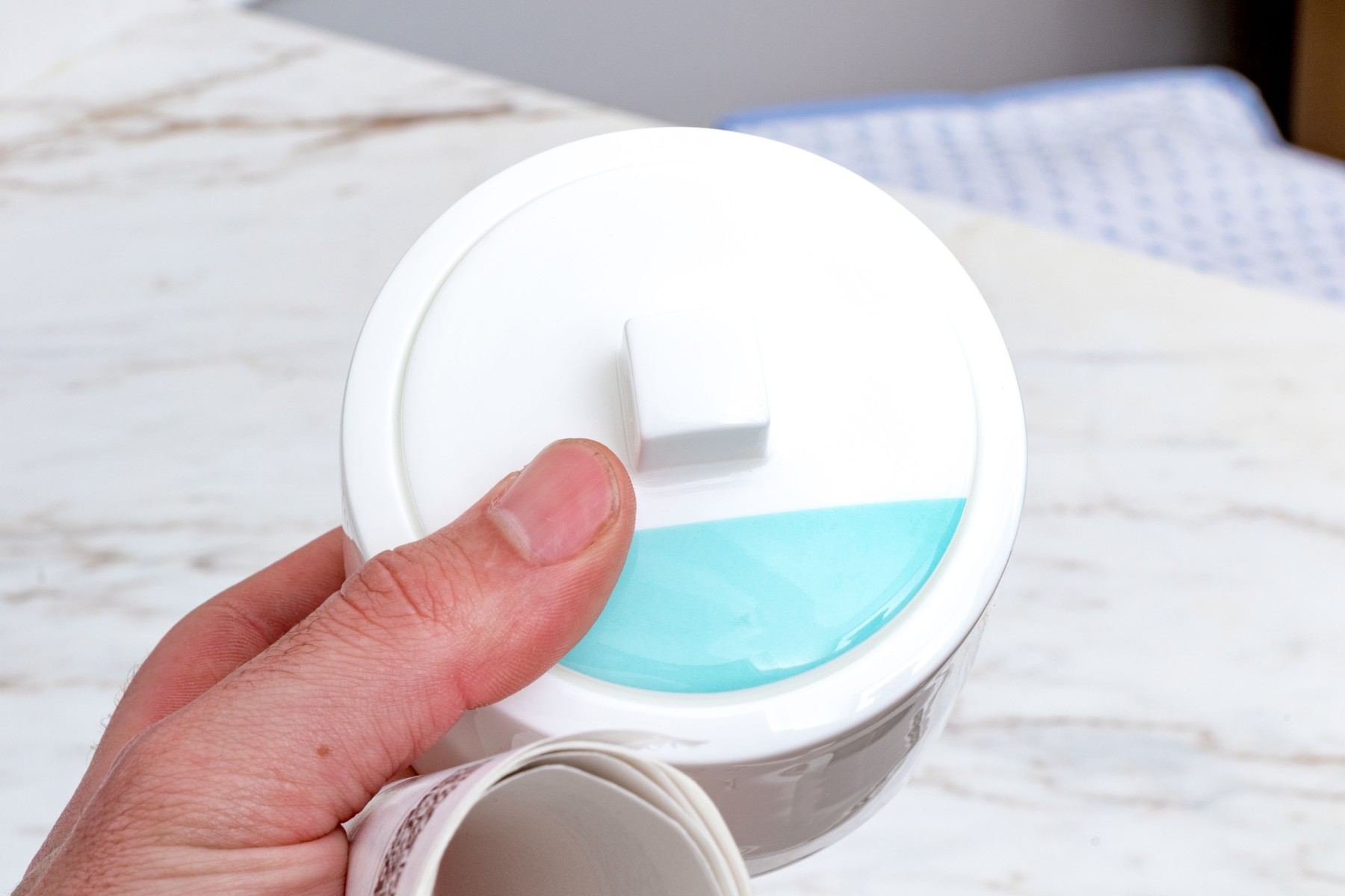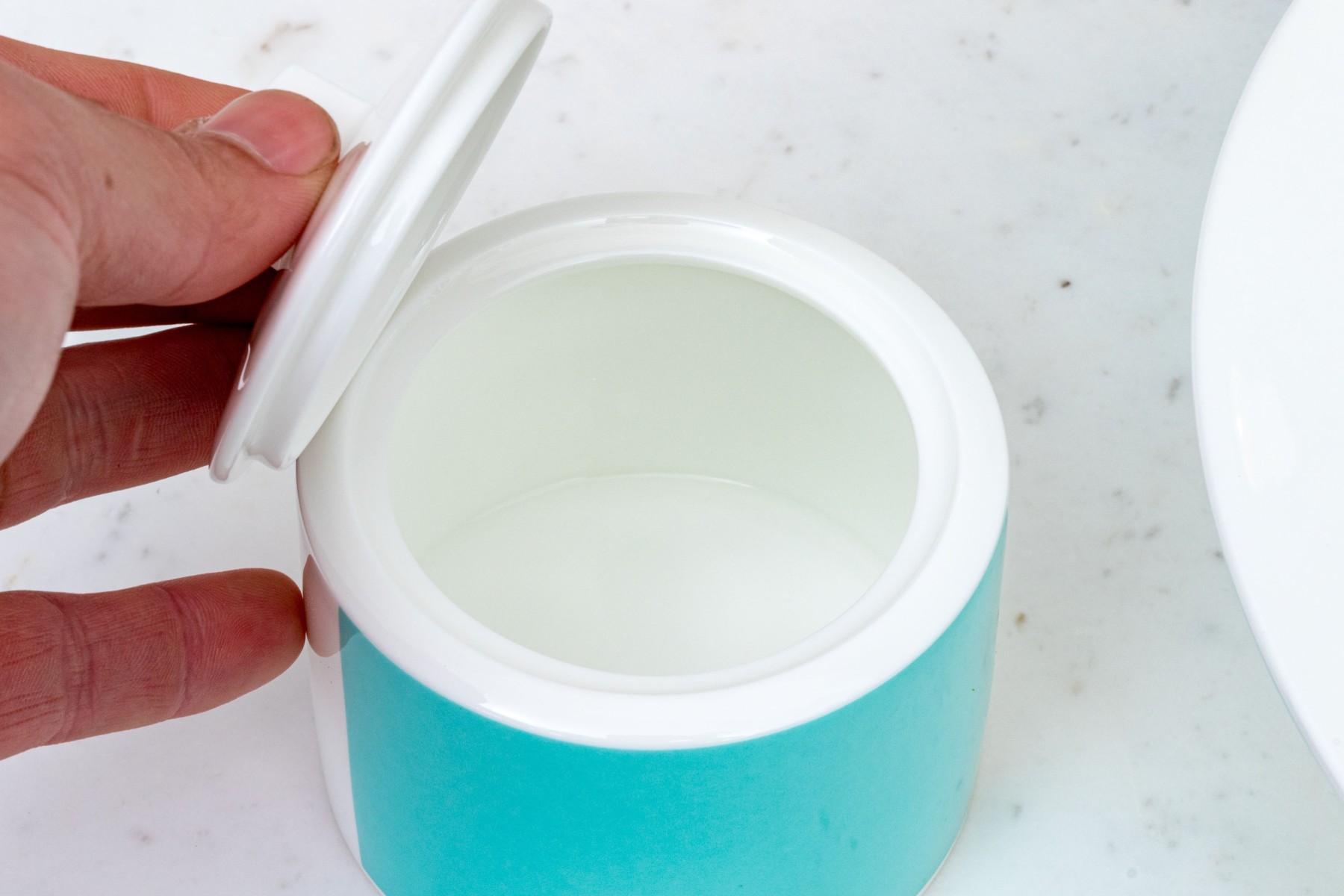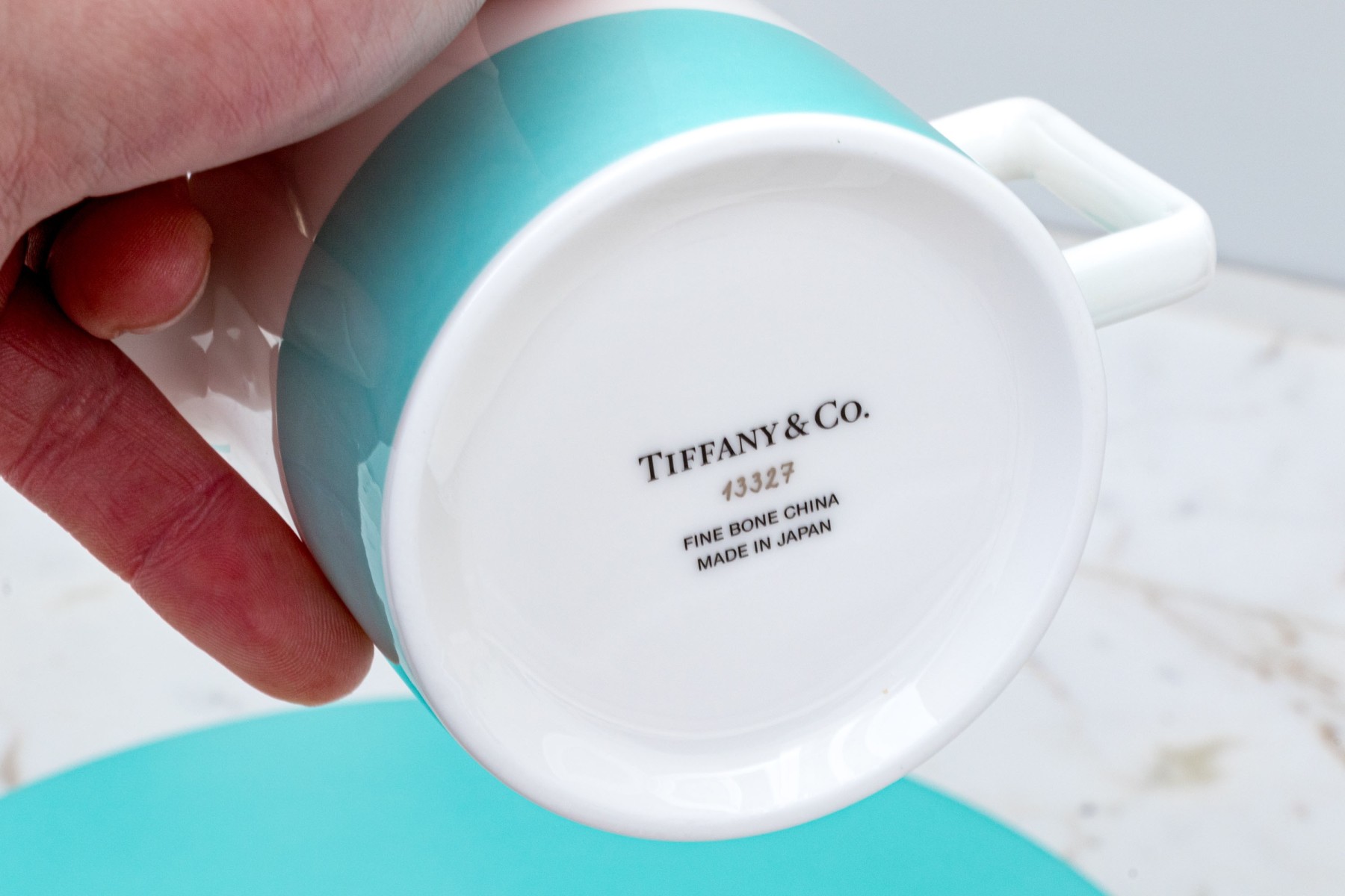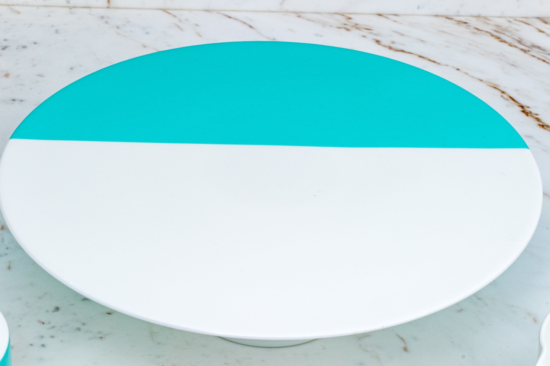 A delightful trio of Tiffany & Co. ceramics including a cake stand, creamer, and lidded sugar bowl. All with eye-catching white and teal bisected designs. Marked underfoot.