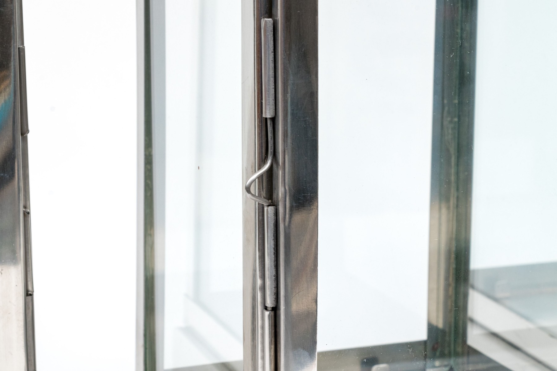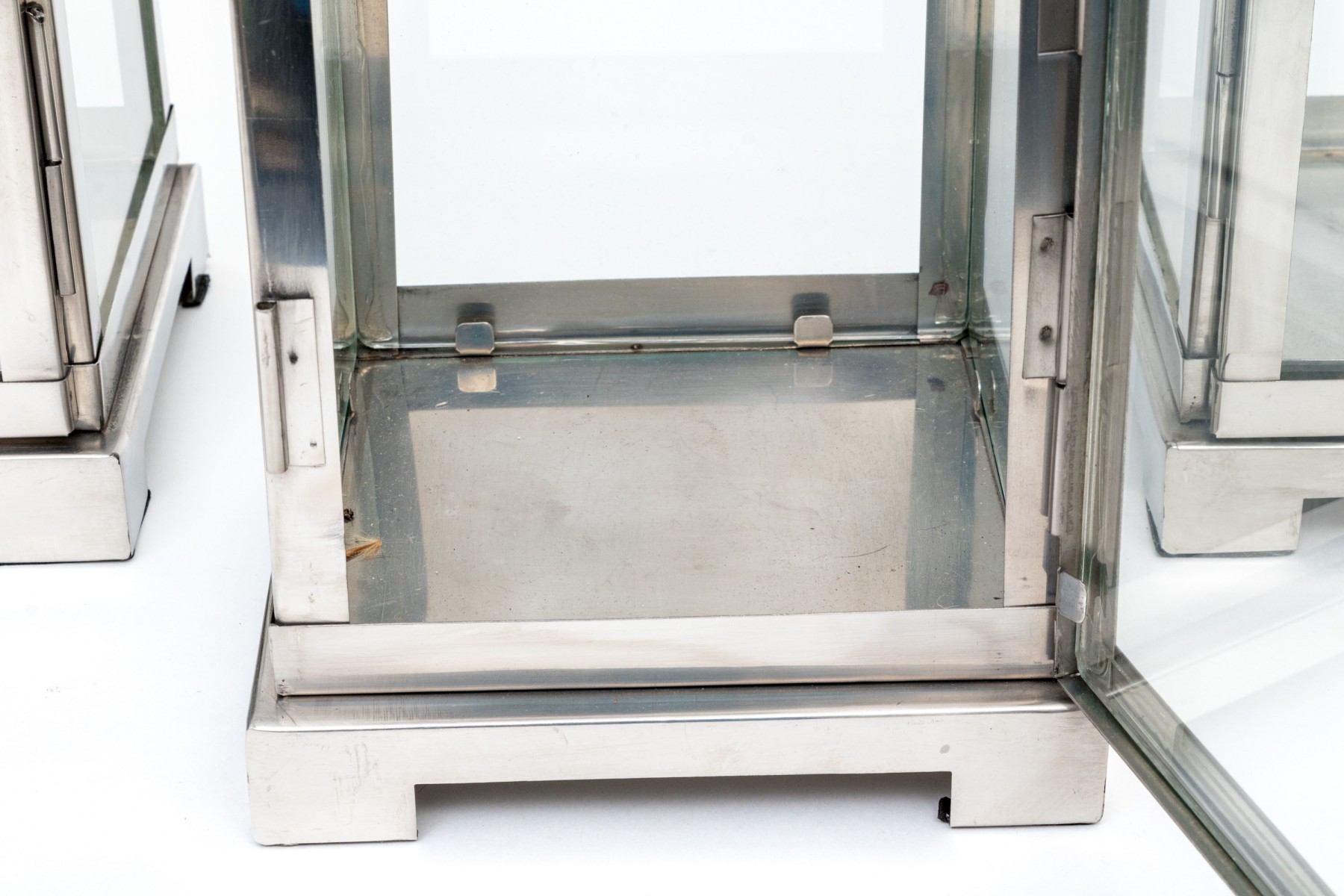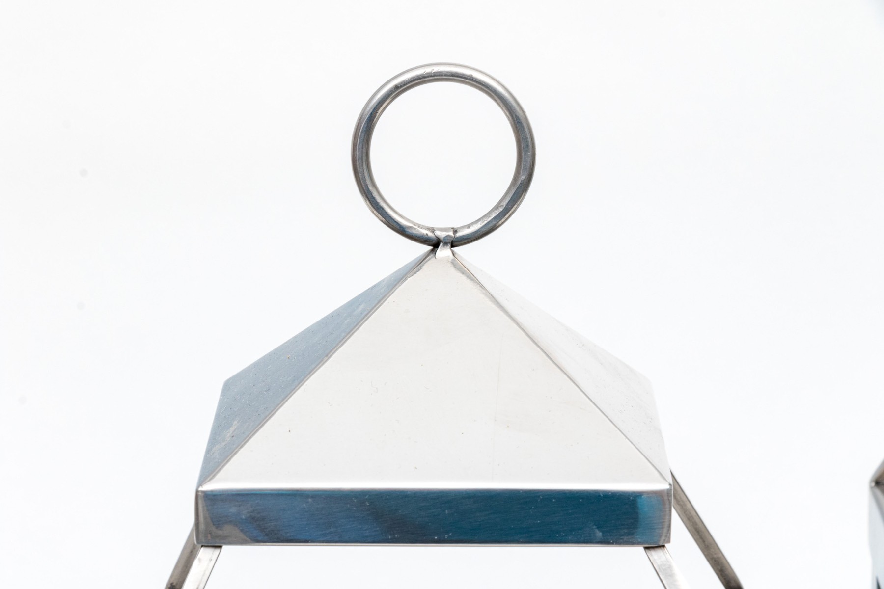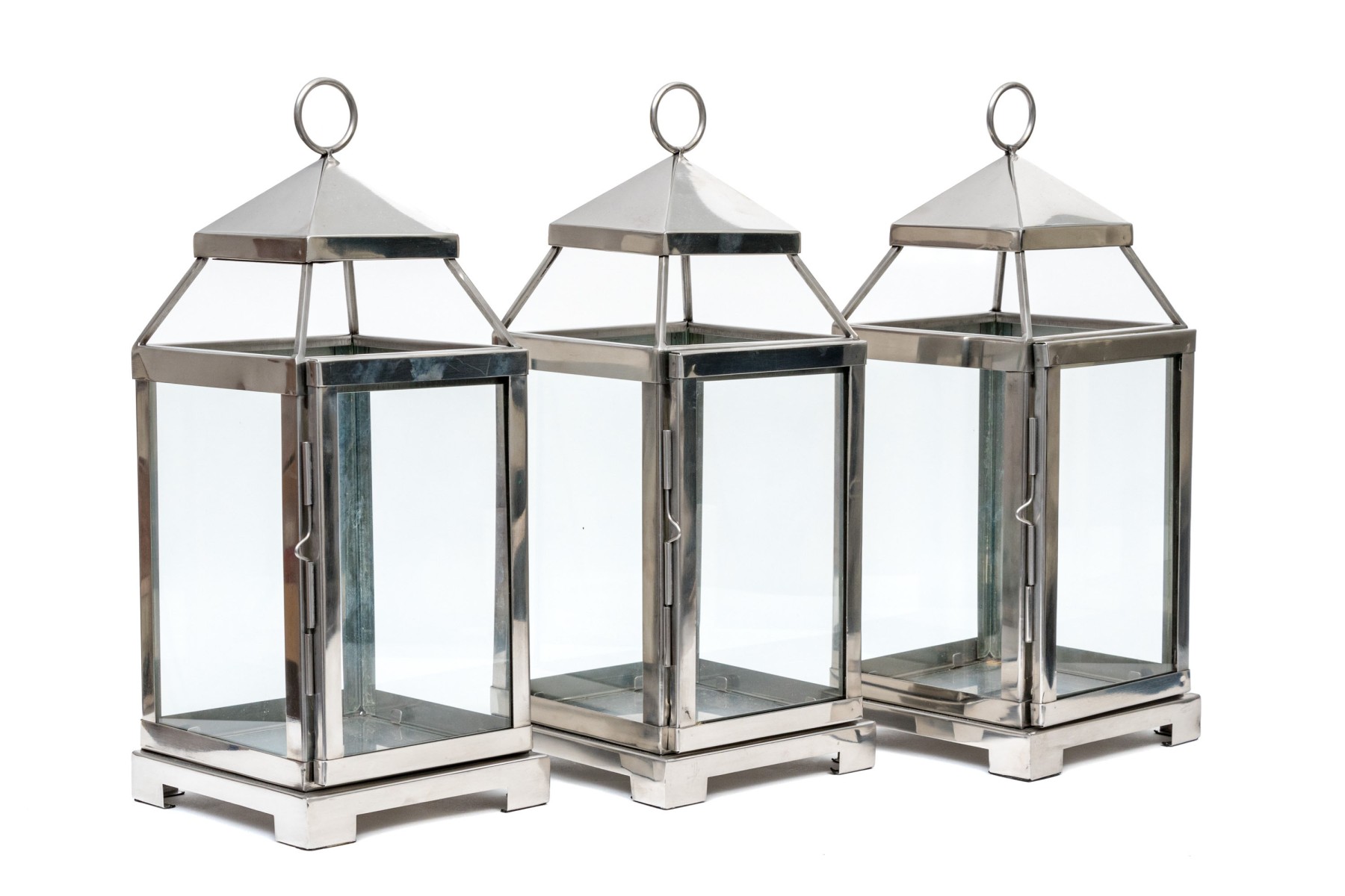 A fabulous trio Pottery Barn "Malta" indoor/outdoor lanterns in polished nickel, sporting ring finials over steepled roofs. The tall bodies consist of glass panes around all sides, opening with a hinged door at the front. The lanterns are supported by simple, stout bracket feet for an elegant finish.