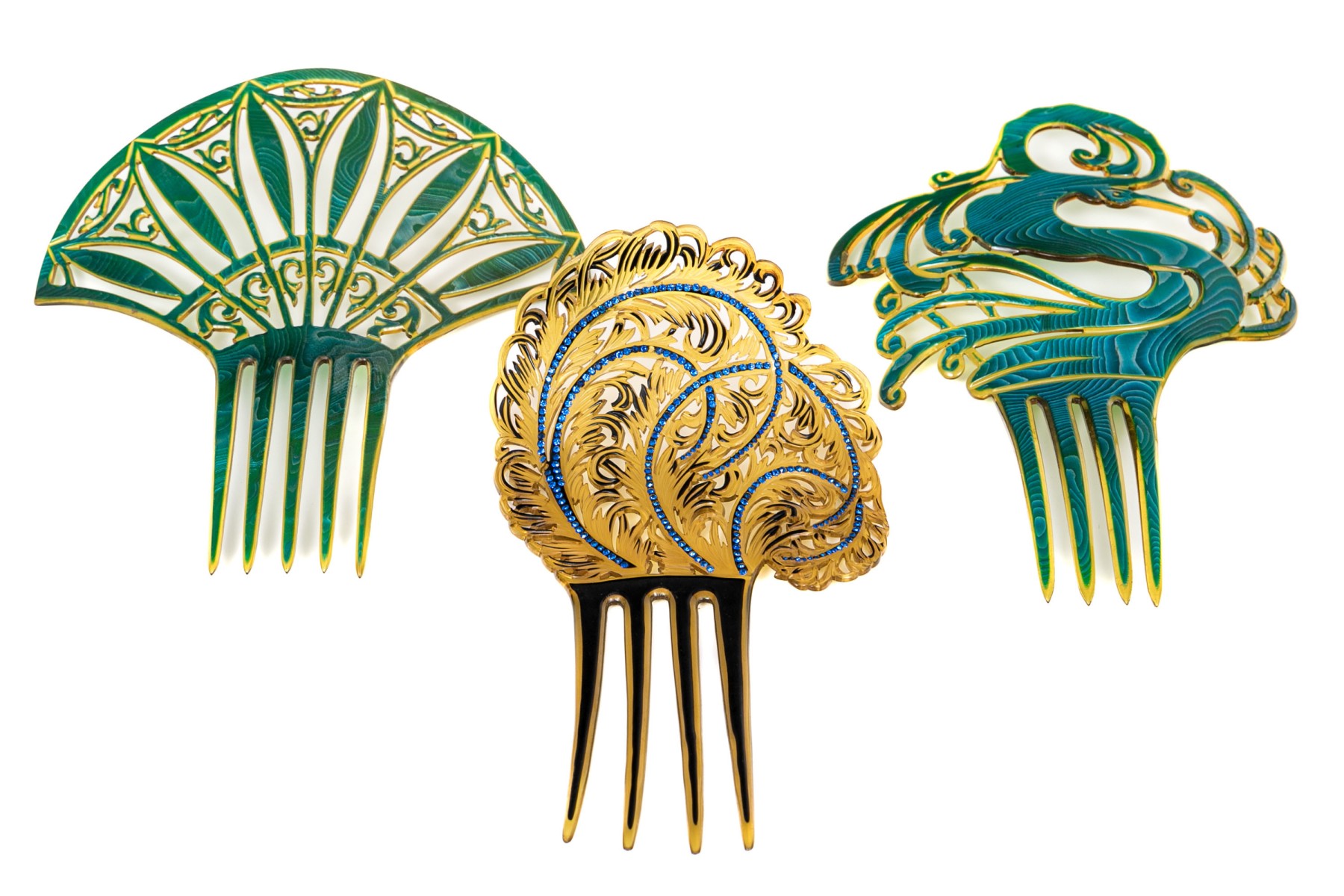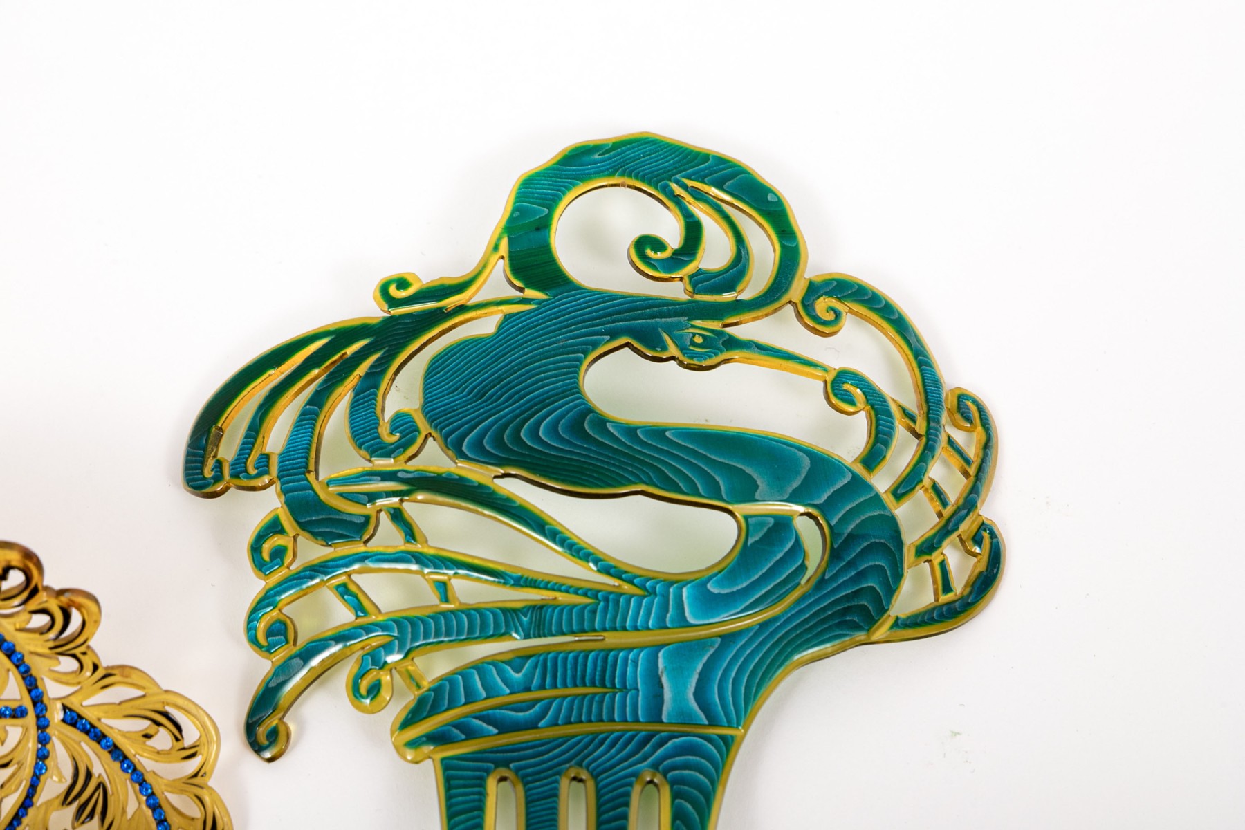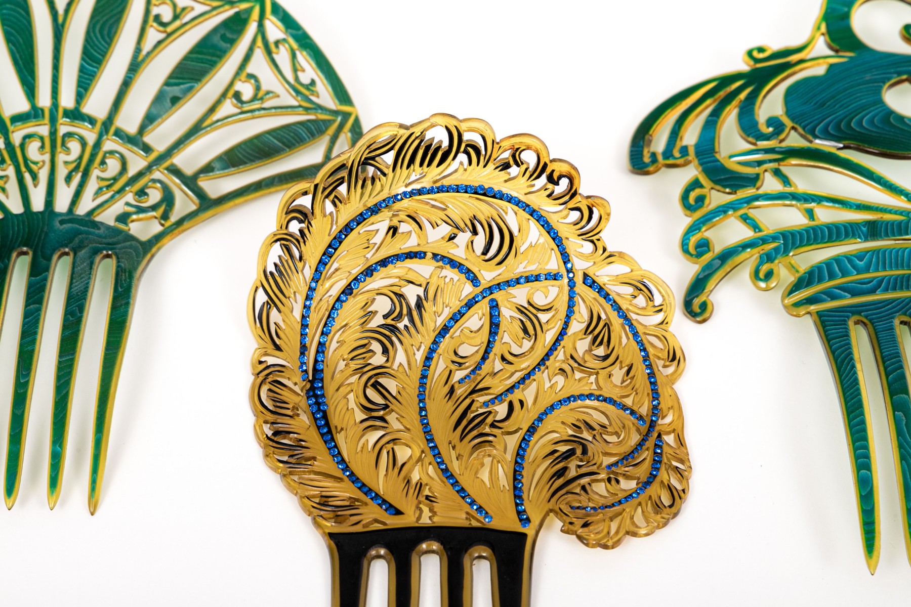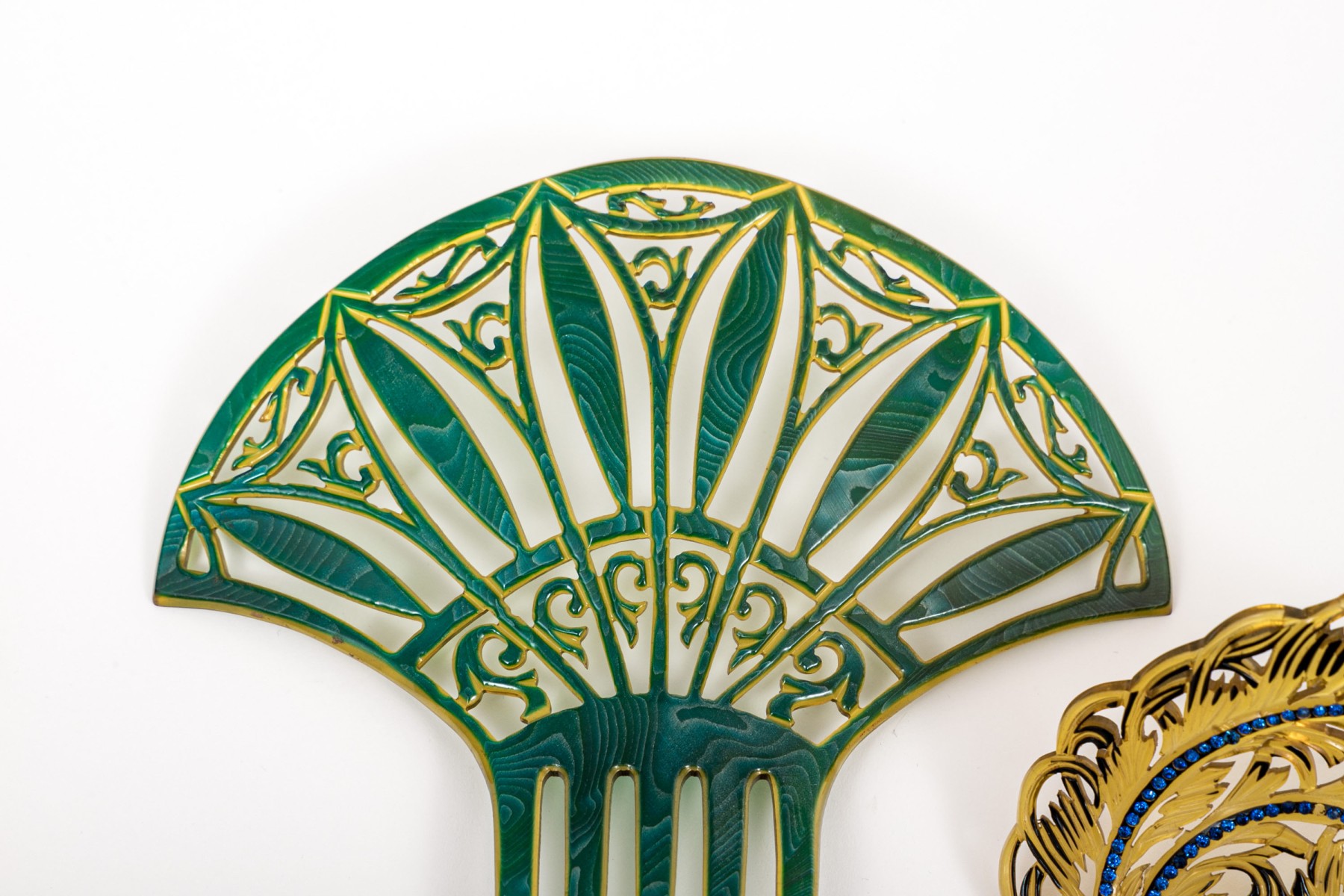 Comprised of celluloid with decorative motifs and vibrant colors including green and ebonized and gilt finished hues.