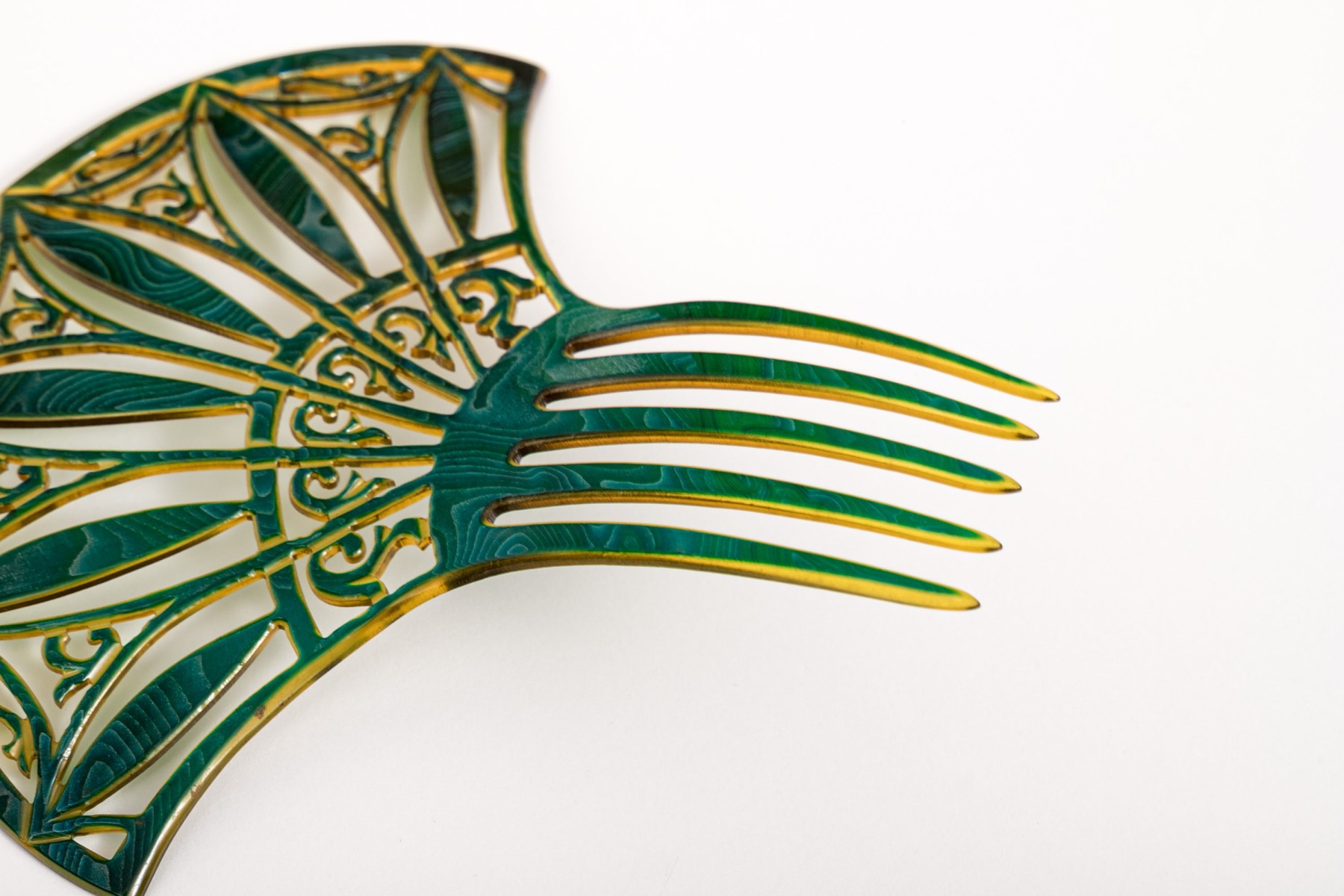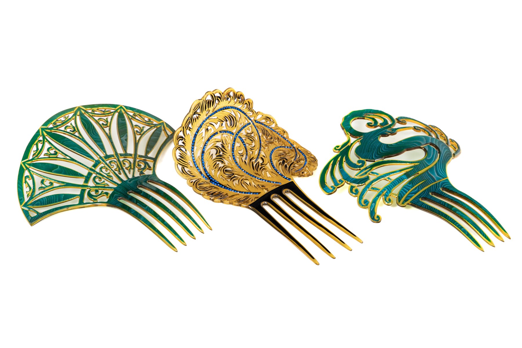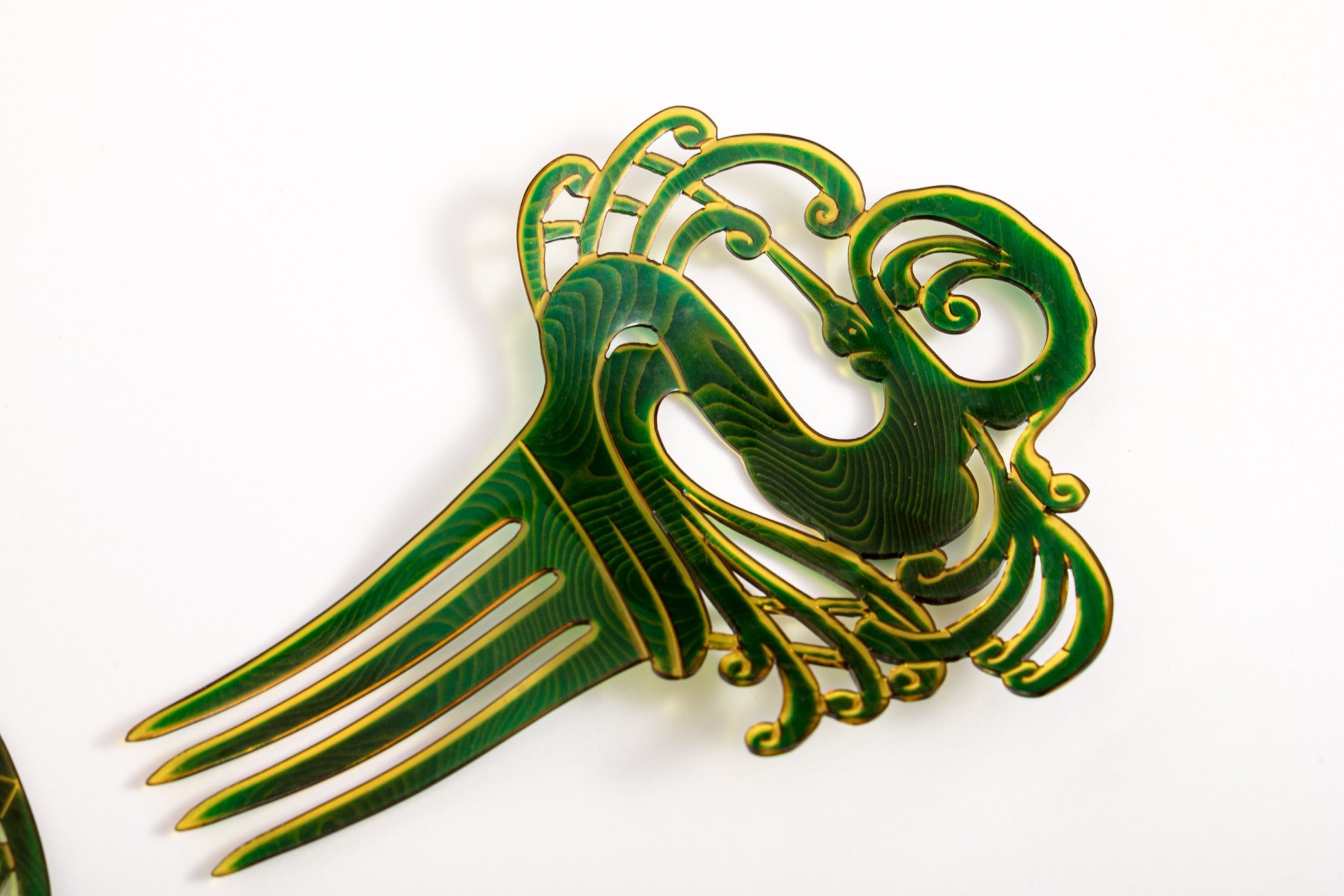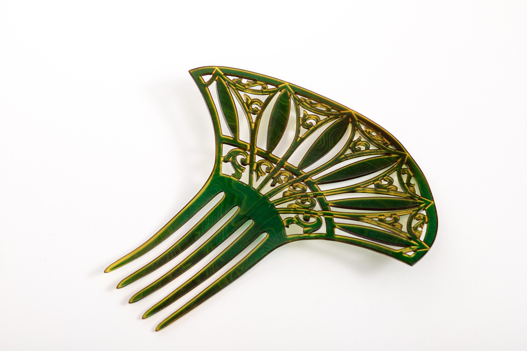 Comprised of celluloid with decorative motifs and vibrant colors including green and ebonized and gilt finished hues.