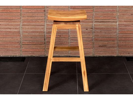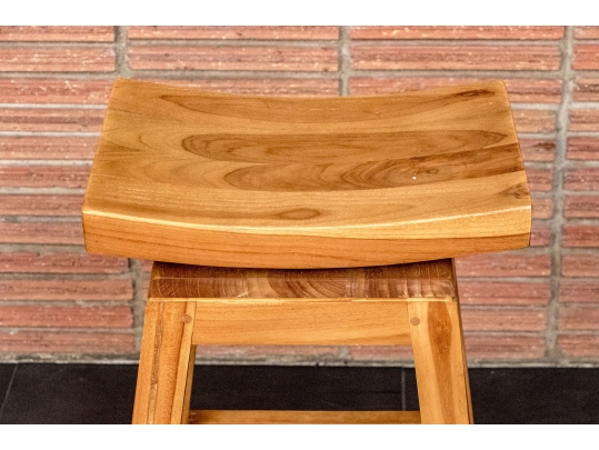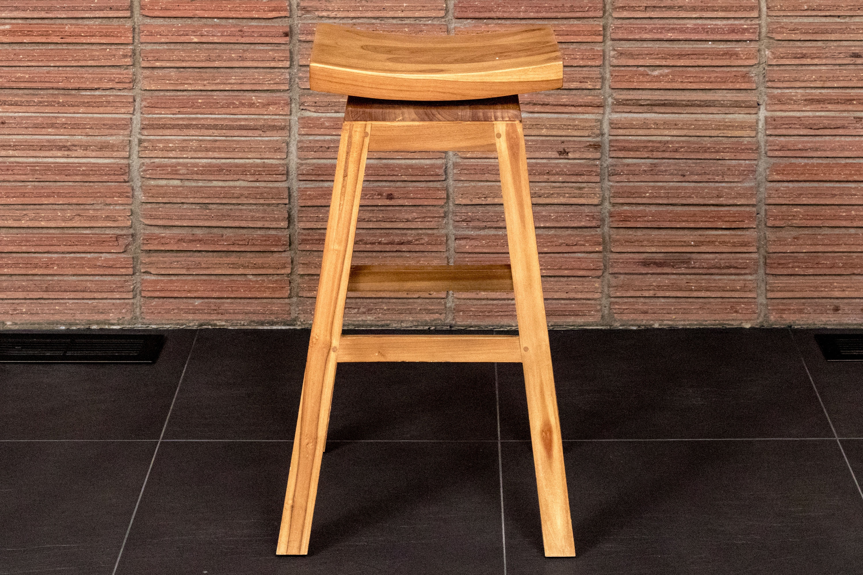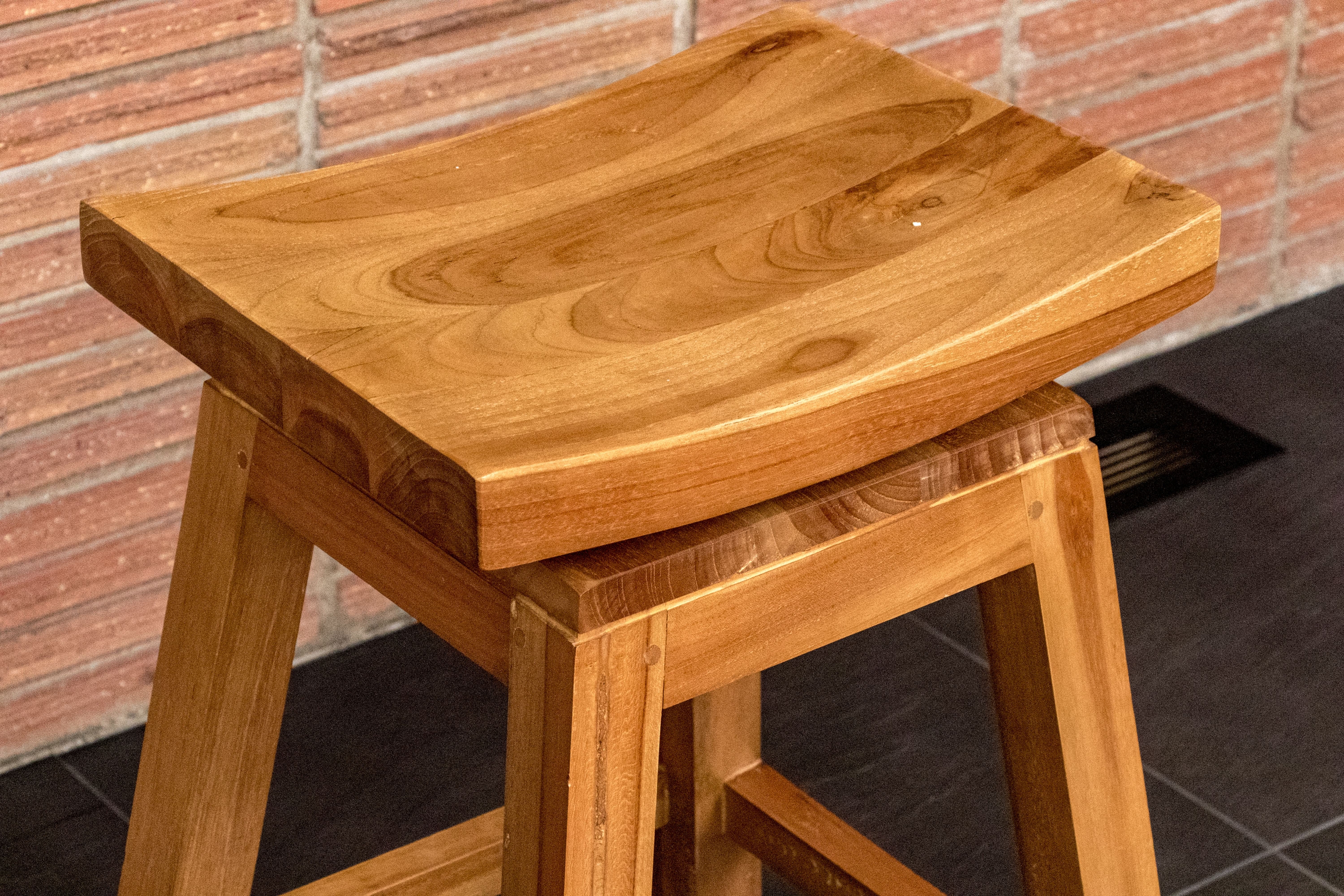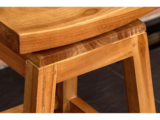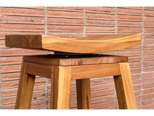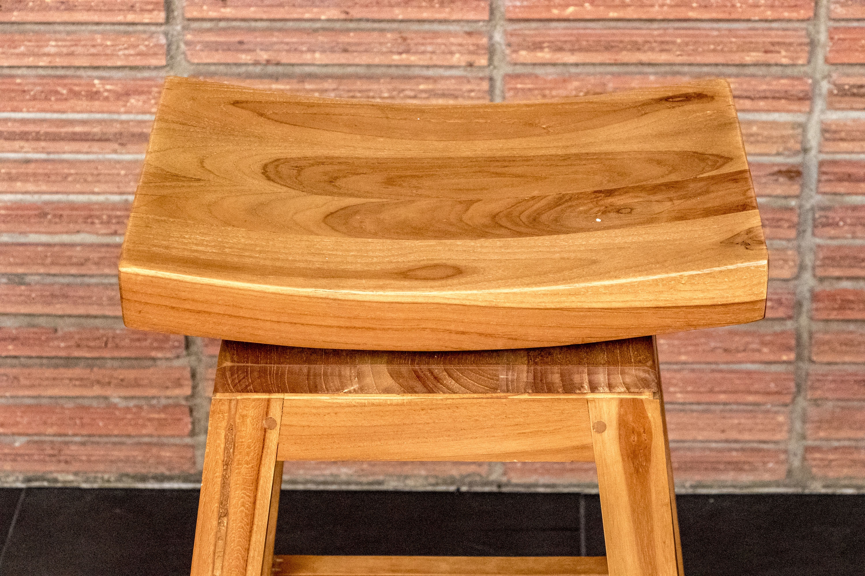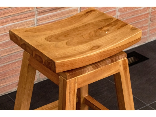 A group of three very solid feeling Teak Bar Stools with comfortable curved seats and simple angled legs with stretchers. Made in Indonesia, the Teak is a warm honey tone and the comfort is notable.